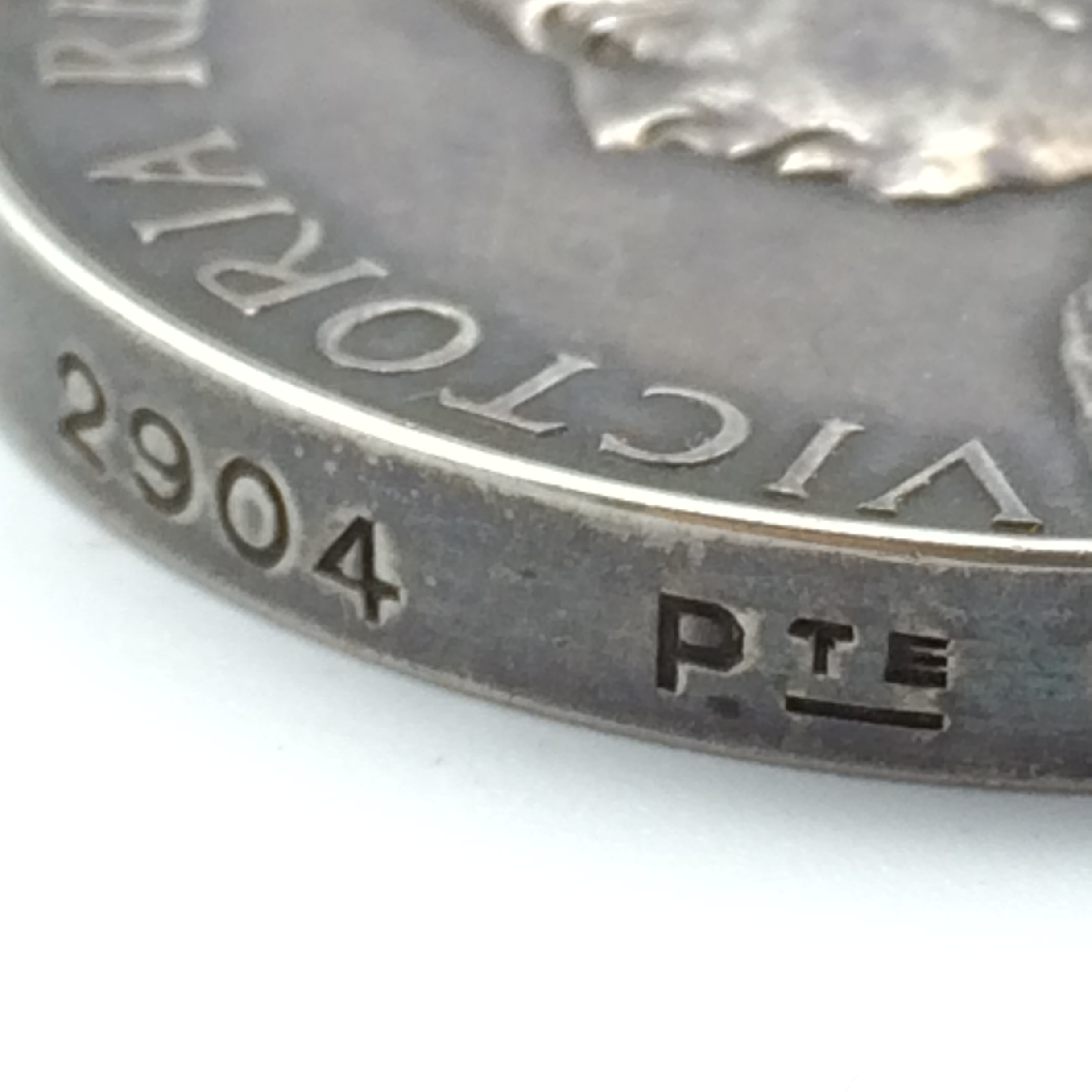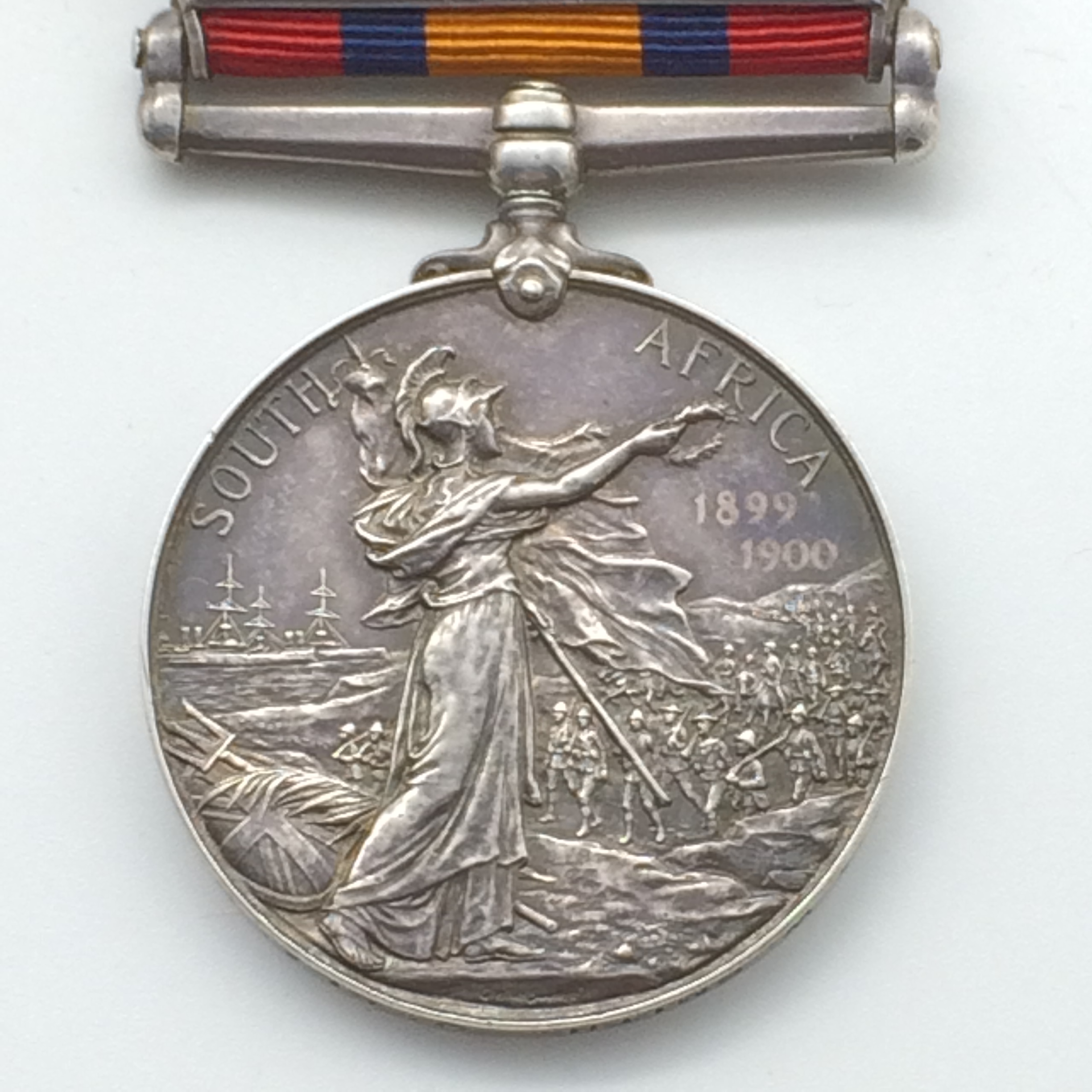 Note: There were two striking’s of this medal, as the Boer war lasted longer than they initially thought. The first issue had the dates ‘1899-1900’ in raised figures and the Britannia’s wreath pointing to the ‘R’ in ‘AFRICA’. After the mistake had been realized, the dates were removed (machined or polished off) from most of the first issue medals, leaving behind remnants of these dates, known as ‘ghost dates.’ The second issue were minted without these dates, and Britannia’s wreath then pointed to the ‘F’ in ‘AFRICA’