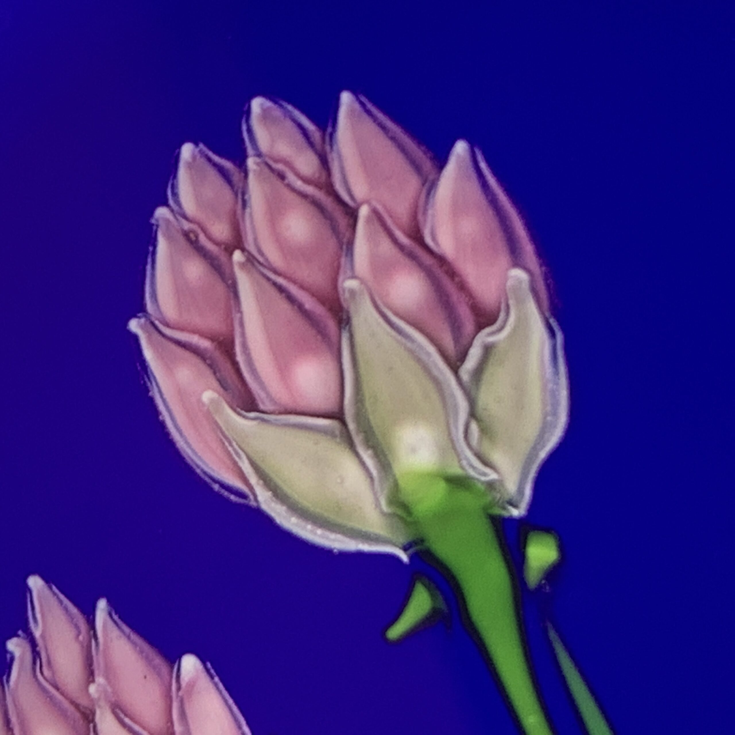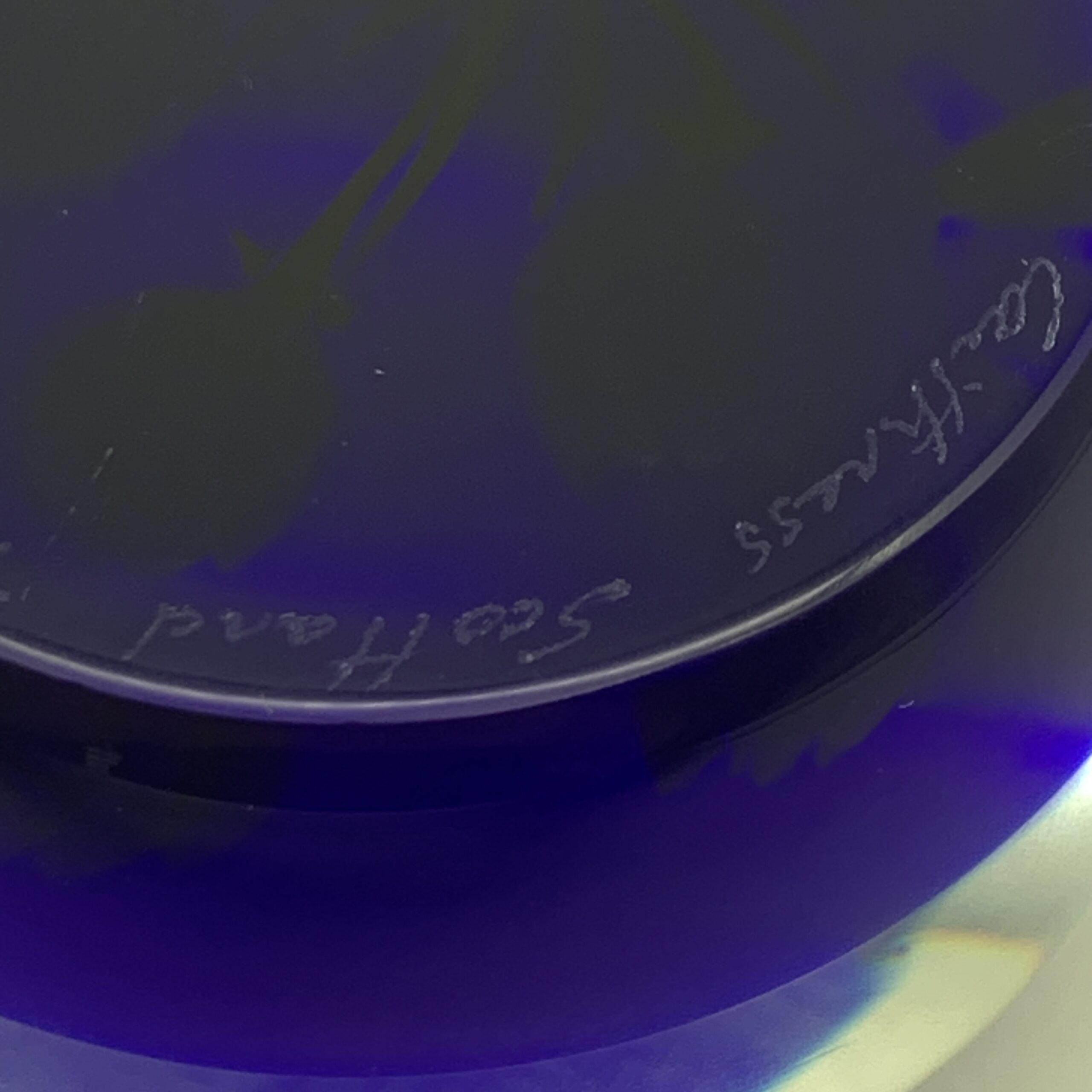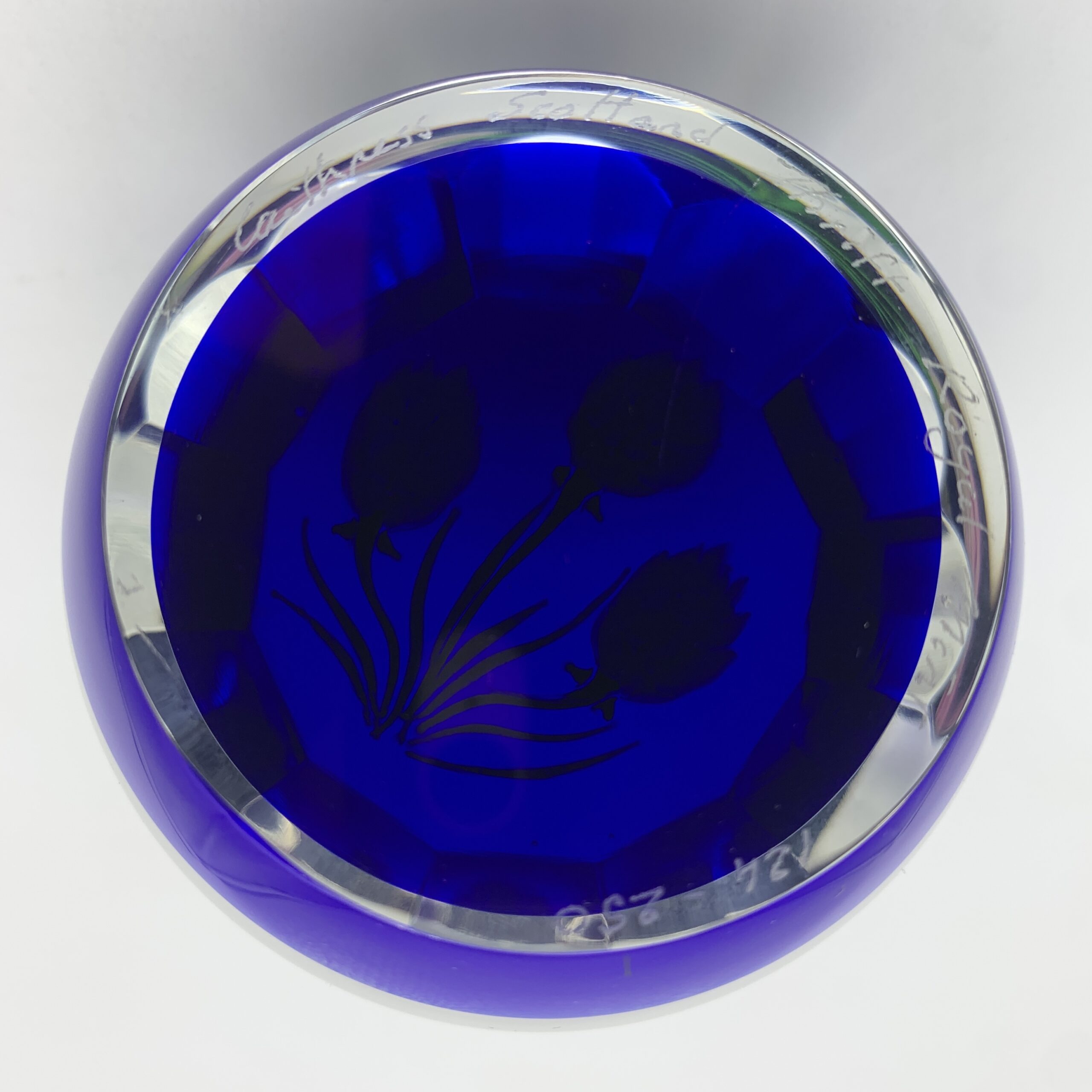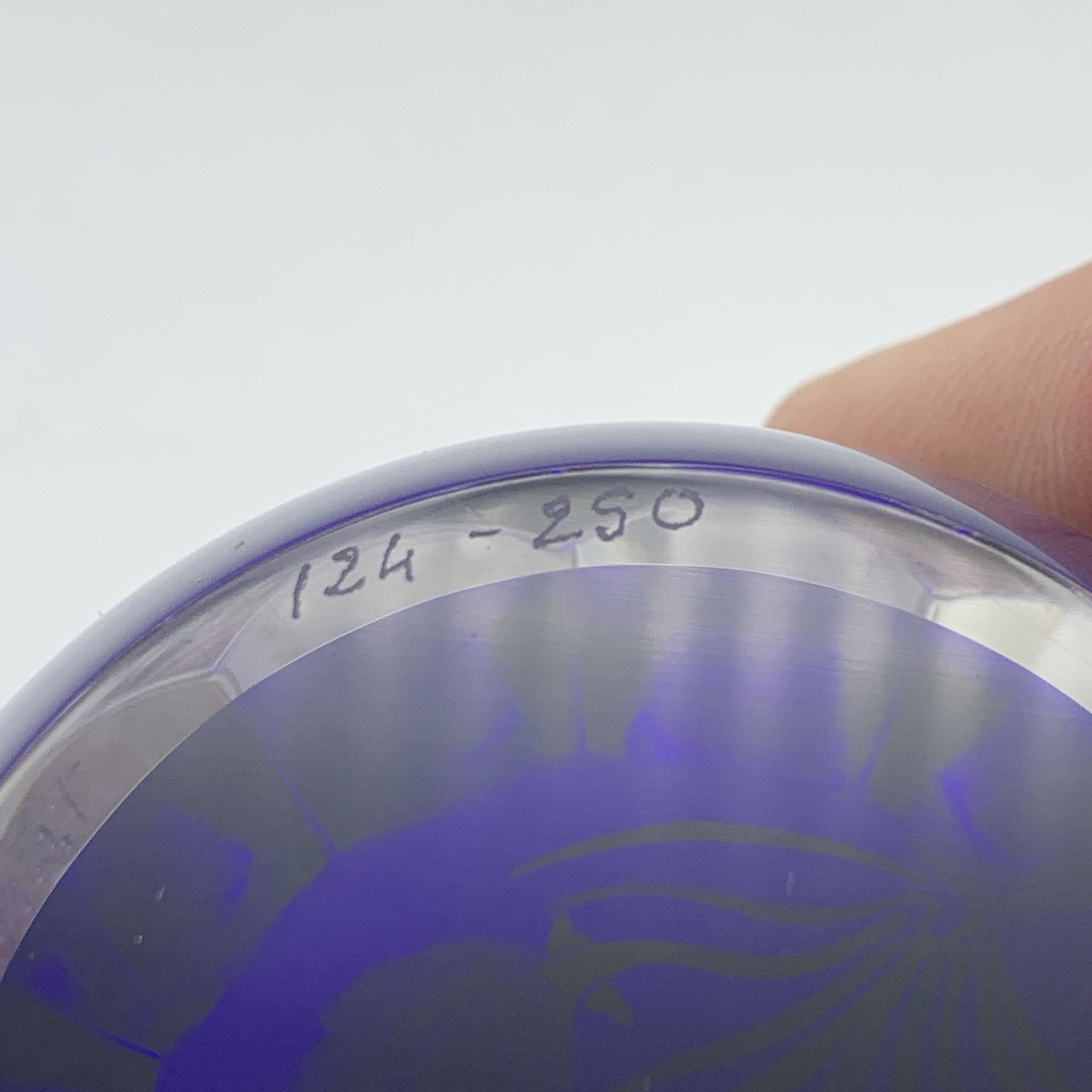 This scarce, beautiful, round ‘Caithness’ glass paperweight with facets is titled ‘Thrift’ and was made for the ‘Royal Mint’ in a limited edition of only 250, this one being number ‘124’. It was made in Scotland by the well-known ‘Caithness Glass’ factory and features three pink protea flowers with green stems against a deep blue ground base. This attractive paperweight is in excellent condition and is engraved on the base ‘Caithness – Scotland – Thrift – Royal Mint – 124/250’. It stands 4,5cm high, with a diameter of 7cm and weighs 349g.