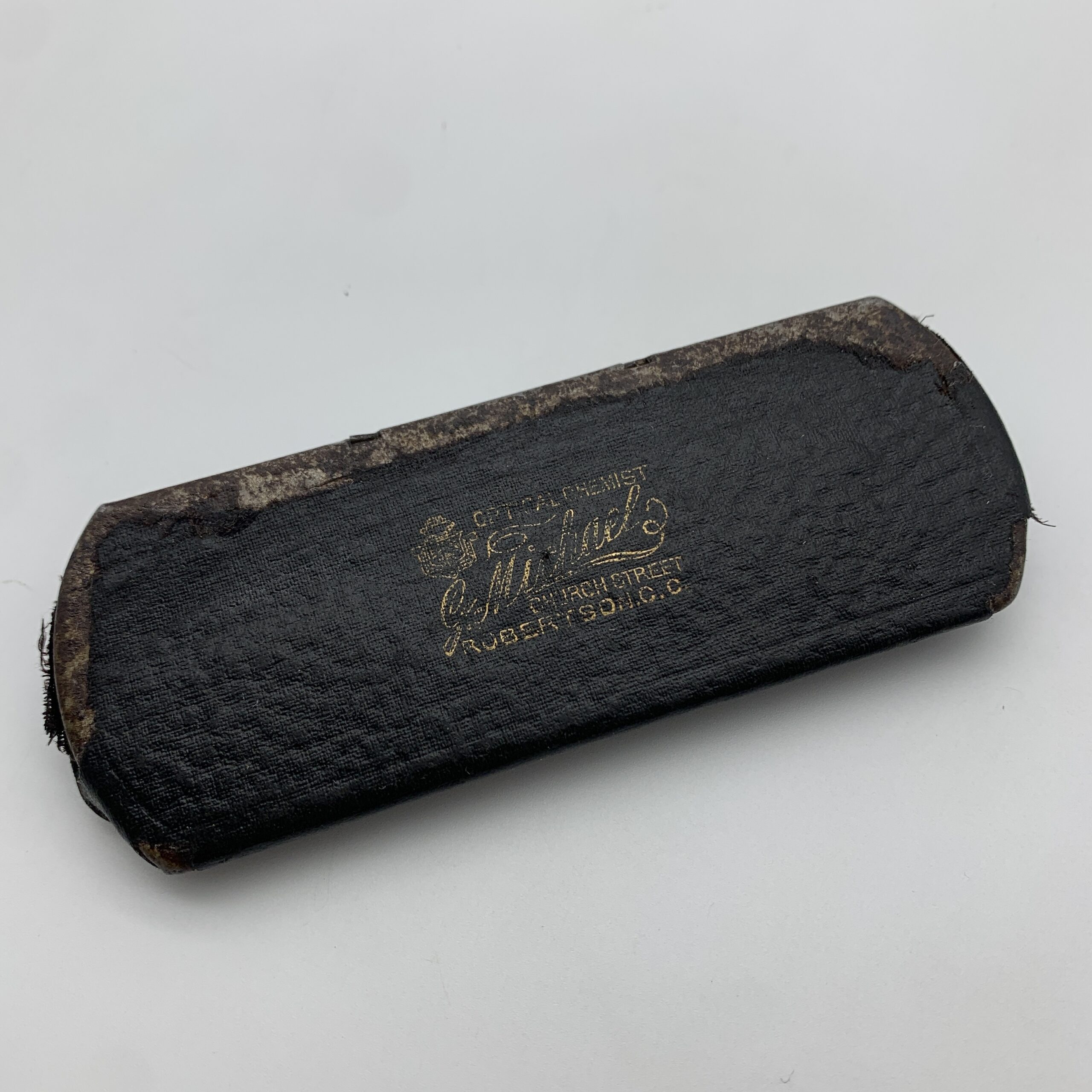This wonderful pair of rare, sterling silver, folding, framed spectacles with oval lenses, feature hinged arms that fold-out and downward behind the ears, to stop the glasses falling off whilst reading or writing. I’ve done a fair amount of research on these since listing them and I’m now of the opinion that they were possibly made in the Cape in the late 1700’s. This type or style of frames were used between 1780-1830 and are stamped on the inside of each arm with a single British hallmark of a ‘Lion Passant’, officially known as the British ‘Standard Mark’ for sterling silver (.925 purity) and the word ‘PEBBLES’ next to it. Normally an English made piece of silver would have other hallmarks with it (date letter & town mark). I’ve come across a few Cape silversmiths who also used this lion stamp, two of which are very similar, Daniel Collinet and John Townsend. I’ve also come across a very similar pair of spectacles made by a Cape silversmith. These scarce eyeglasses are in excellent condition and come with their, possibly original case, which has a gilt stamped name underneath that reads ‘OPTICAL CHEMIST, G. Michaels, CHURCH STREET, ROBERTSON’.