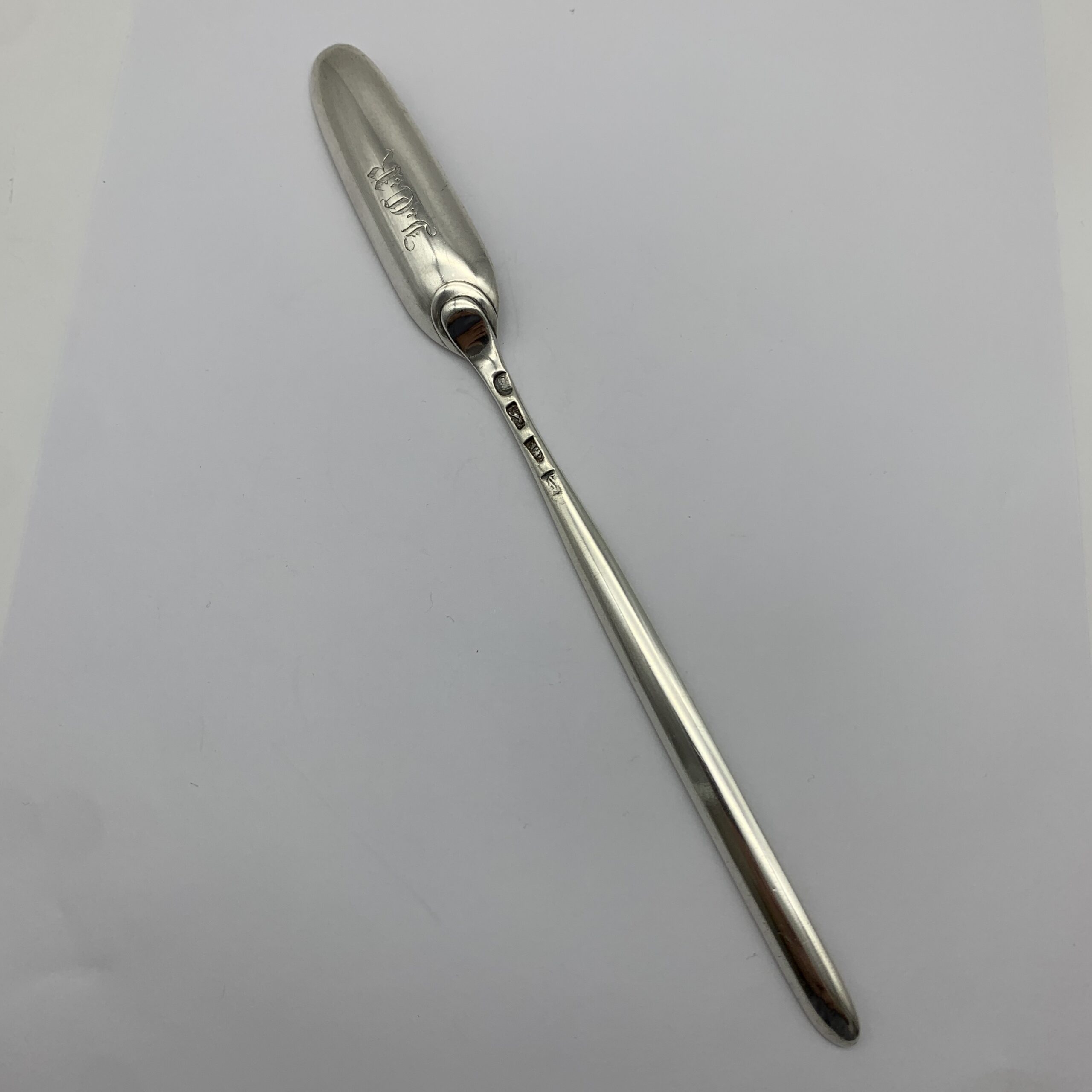 This scarce, fine quality, solid silver Georgian double ended ‘Marrow Scoop’ is in superb condition with clear hallmarks and was made in London, England in 1761 by silversmiths ‘William Turner’ (WJ). The marrow scoop measures 23cm in length, 2cm at its widest, weighs 57,3g and is engraved with a monogram under the large scoop.