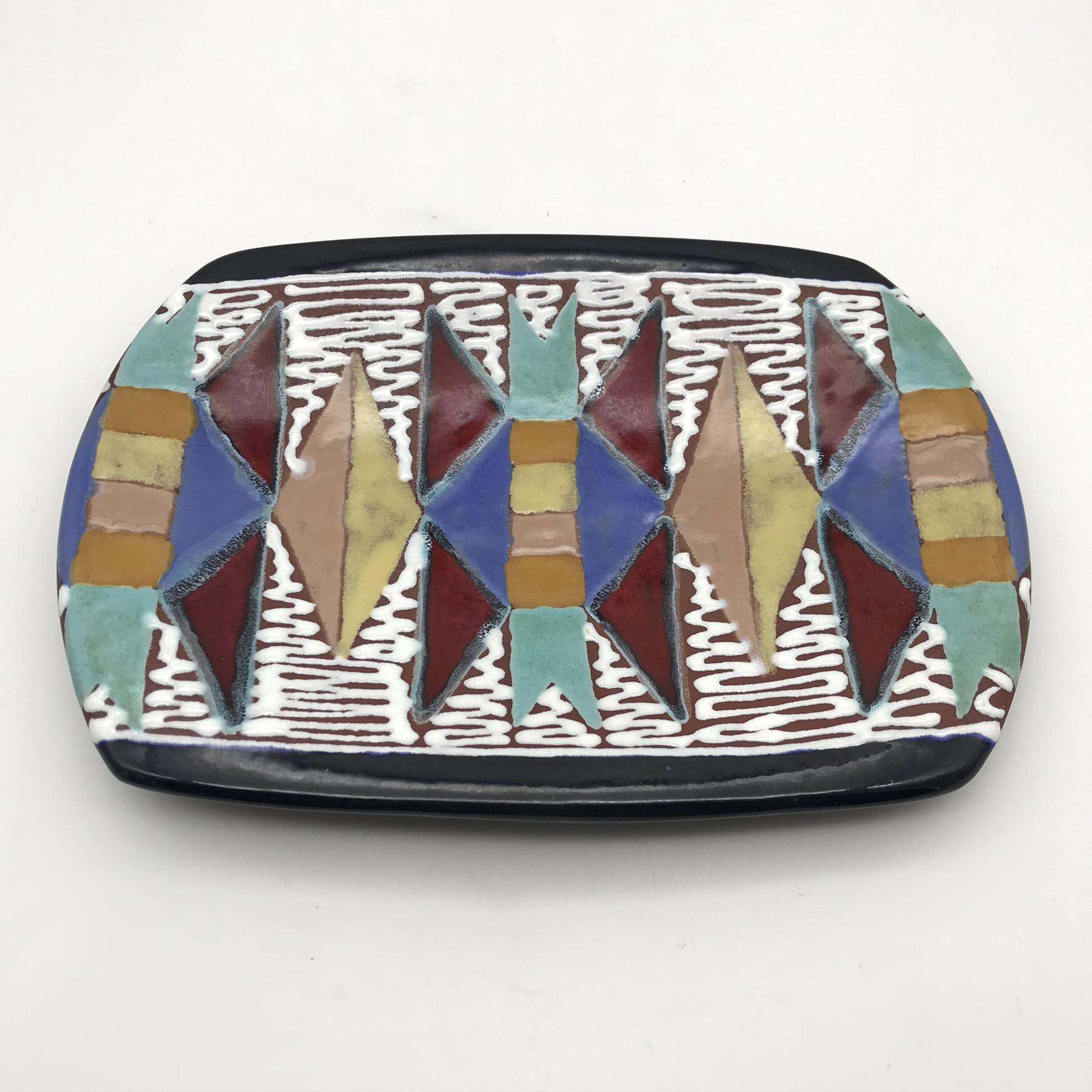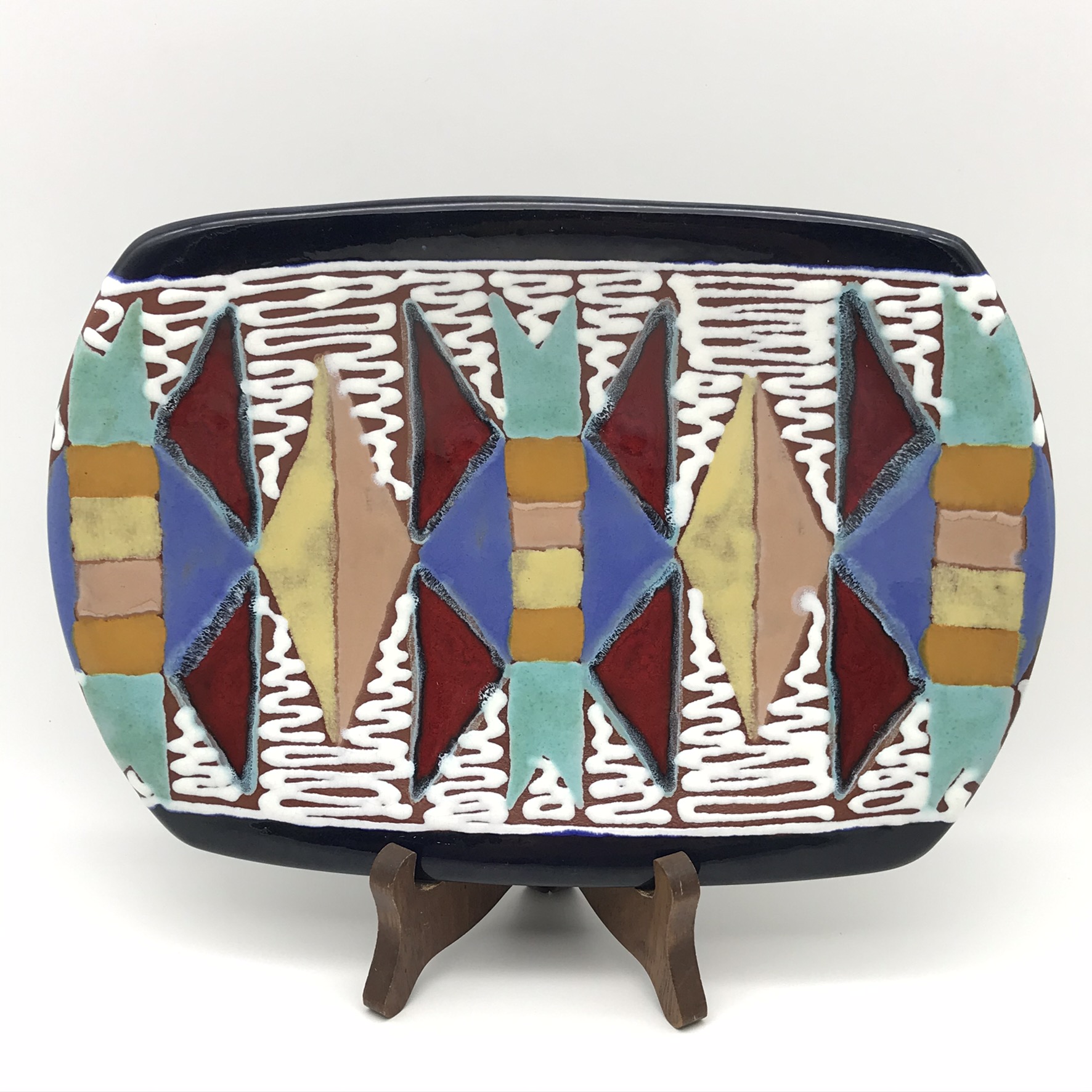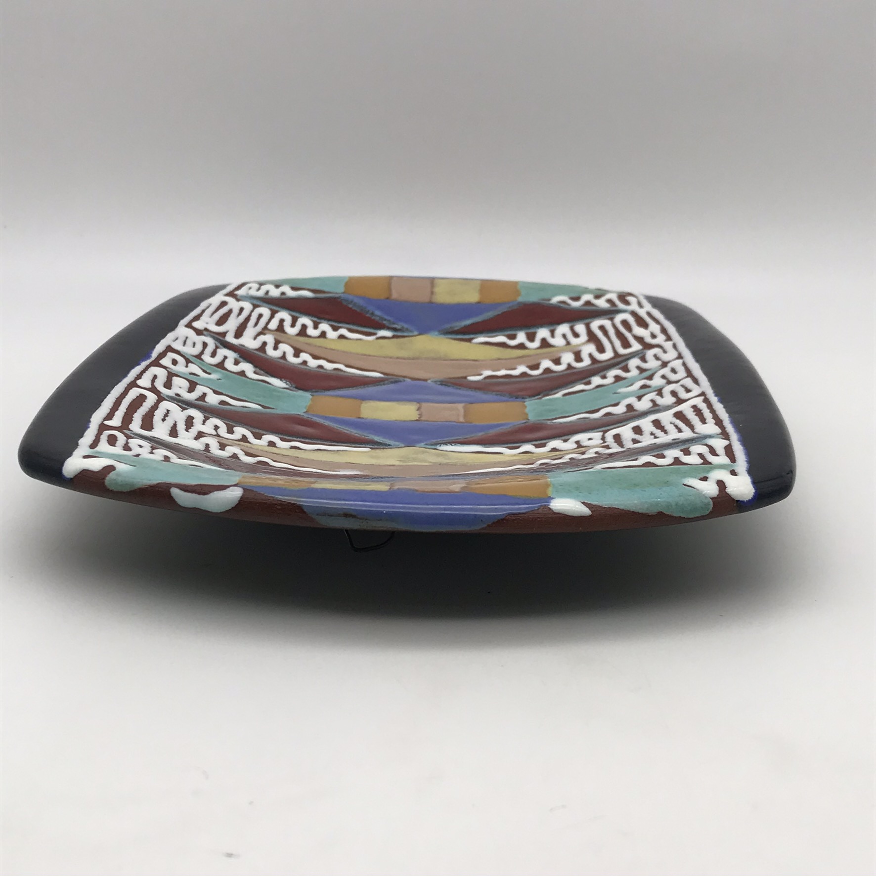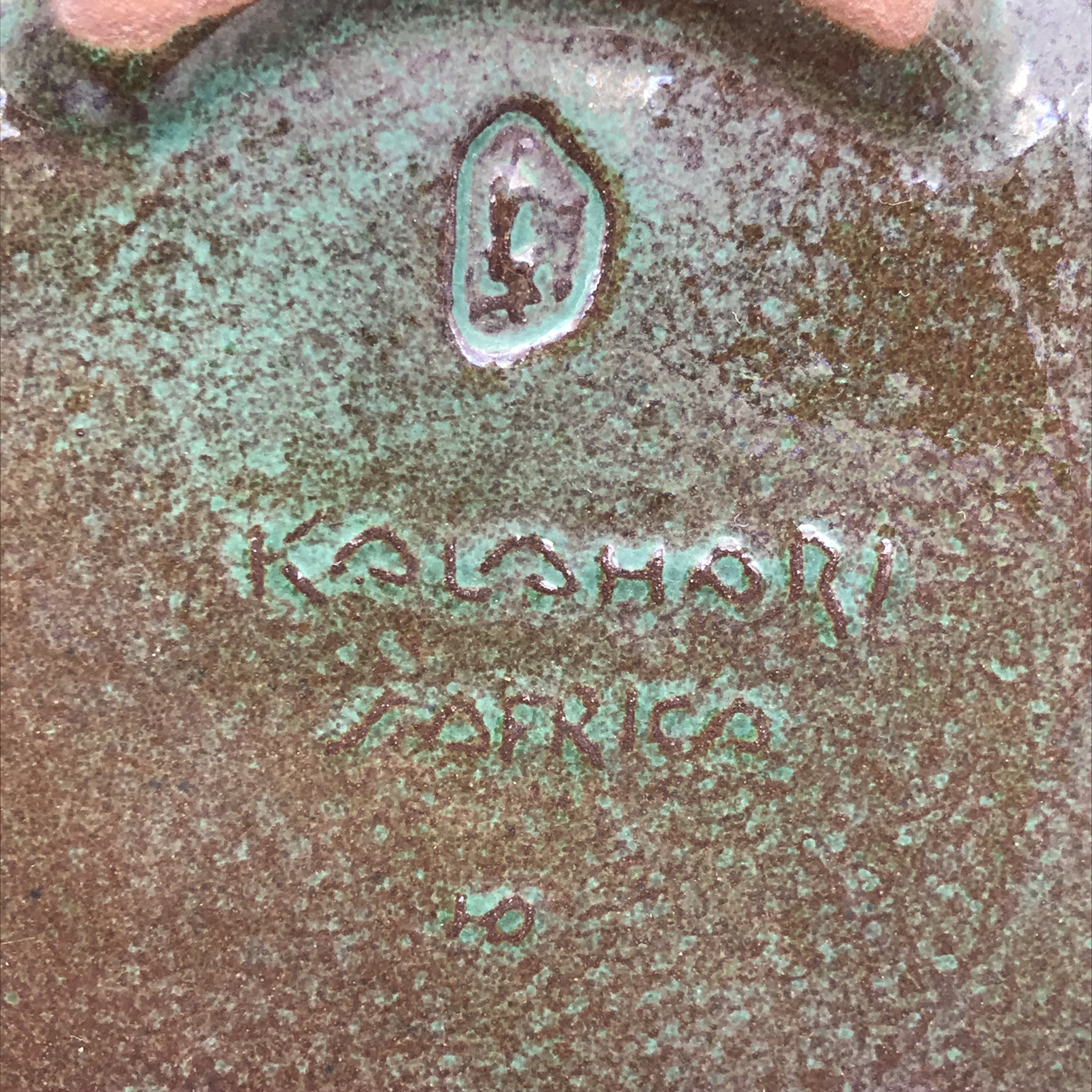 This wonderful, scarce, South African pottery dish or wall hanging was made by the very collectable ‘Kalahari’ Studio potteries in Cape Town, probably around the 1950/60’s. It is rectangular in shape with rounded sides, a shallow depth and is decorated with brightly coloured hand-painted enamels. The dish is stamped on the back with their small logo, and the words ‘KALAHARI S AFRICA  10’ in relief. It is in excellent condition and could also be hung on a wall, as it has a custom drilled hole on the back. It measures 25,6cm x 18cm, and weighs 515g.