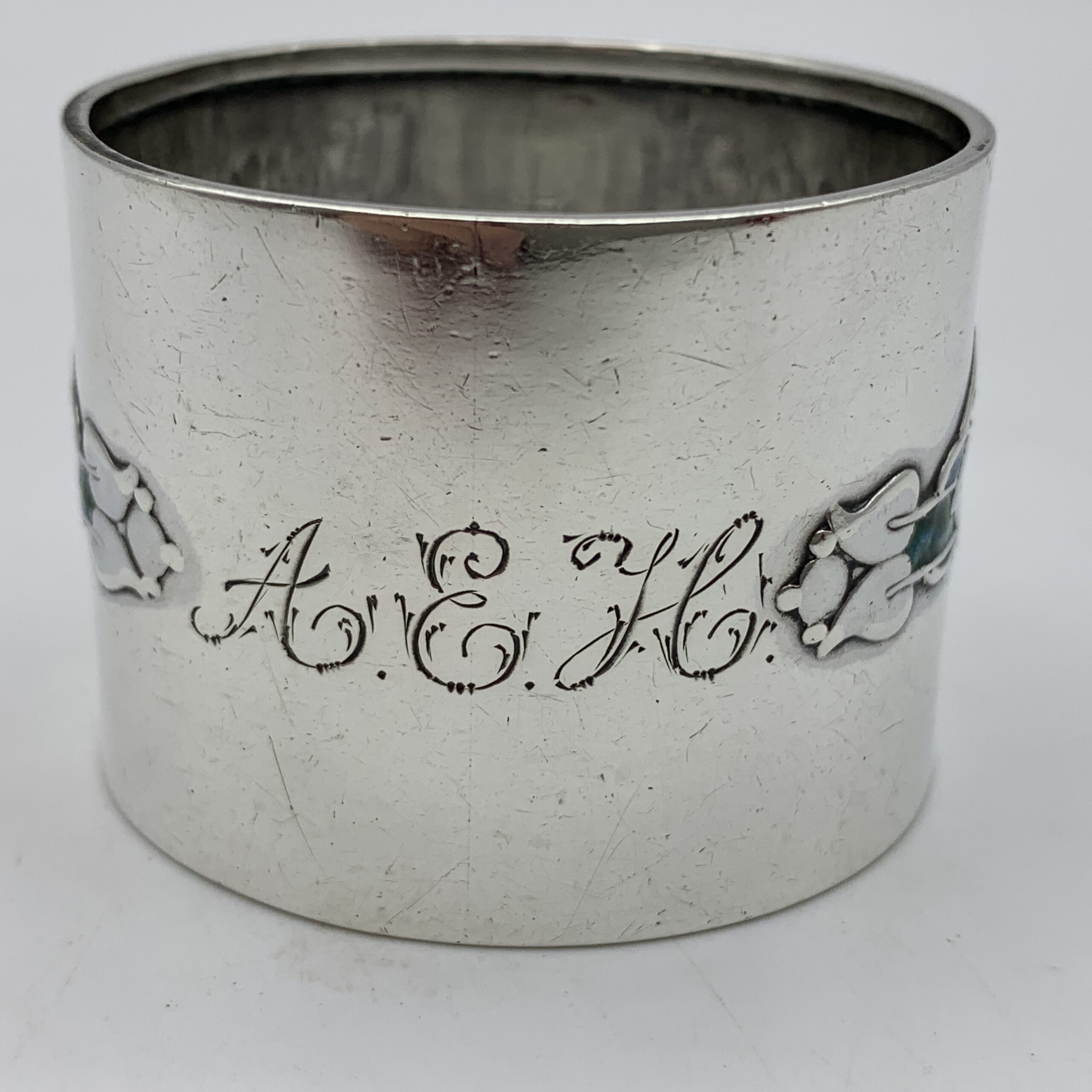 This fabulous, rare, antique solid silver and enamelled Arts & Crafts ‘CYMRIC’ napkin ring was designed by ‘Archibald Knox’ (1864-1933) for the ‘CYMRIC’ range at ‘Liberty & Co.’. It is decorated in relief with two beautiful art nouveau panels featuring water lilies enhanced with blue and green enamels. Other than some minor enamel loss, this wonderful napkin ring is in great condition and is stamped on the side with the following hallmarks ‘L&Co’, ‘CYMRIC’, a model number ‘5305’ and the British hallmarks for ‘Birmingham 1904’, plus a personal engraving with the letters ‘A.E.H.’ The napkin ring measures 3,8cm with a diameter of 5cm and weighs 36,5g.