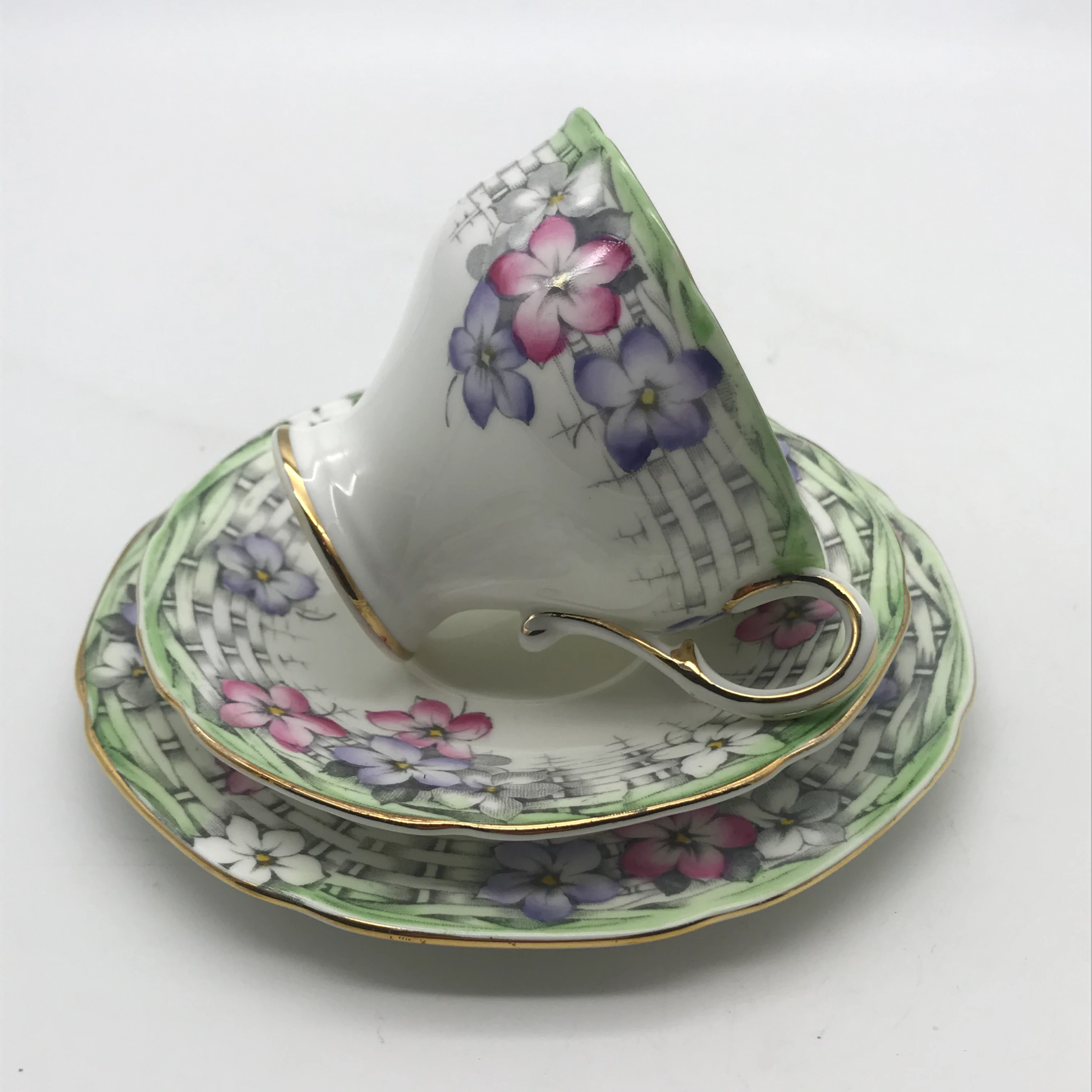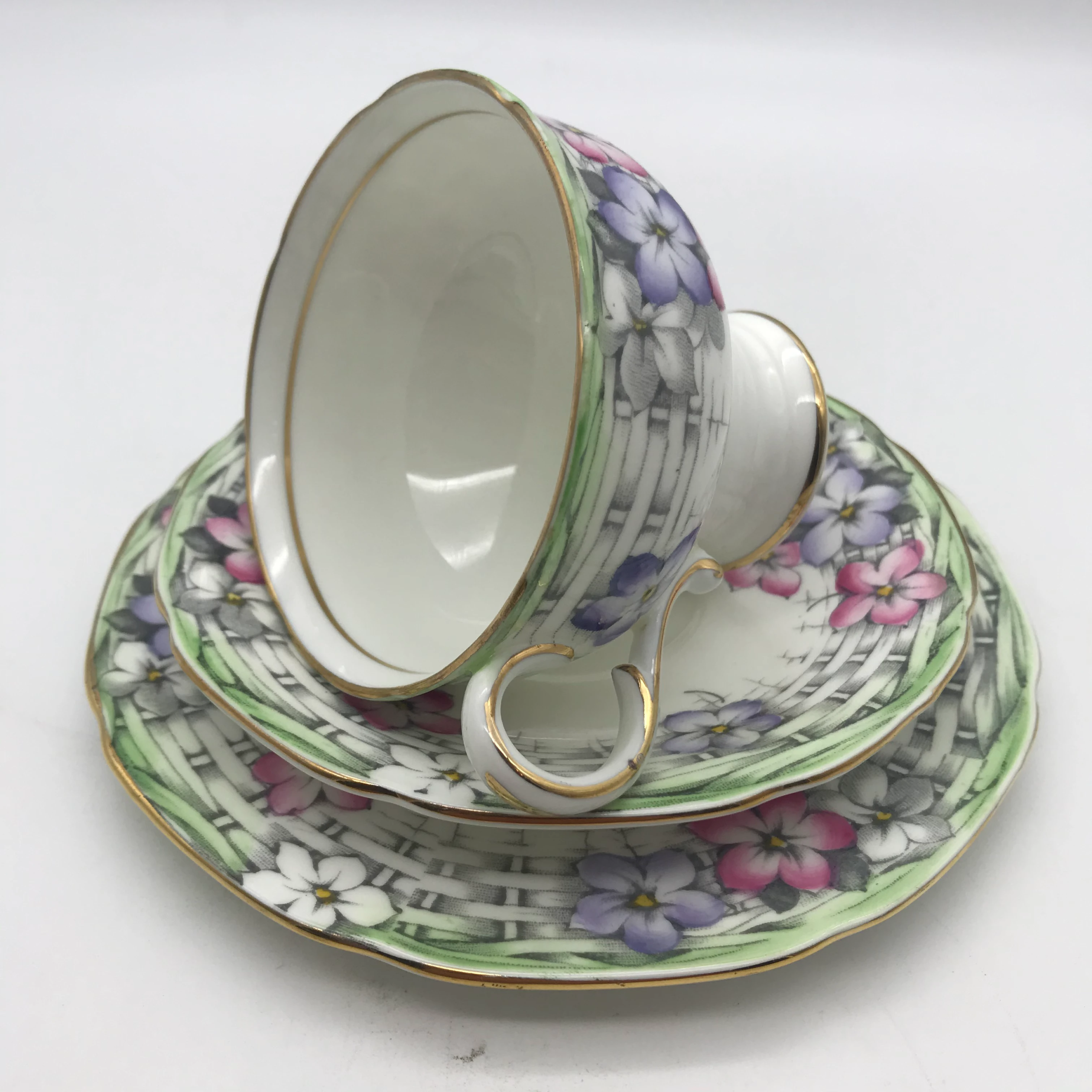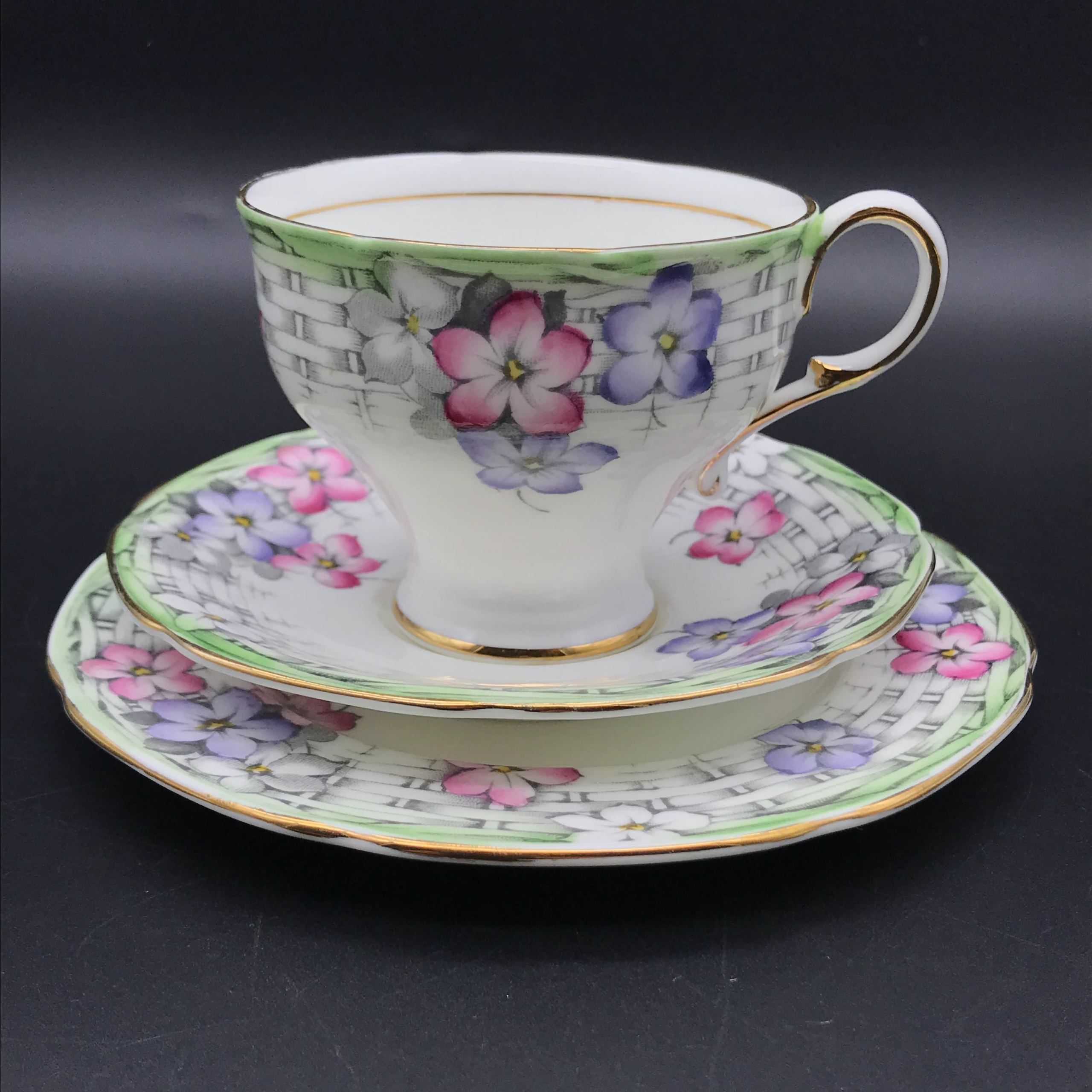 This wonderful 1930’s Paragon trio is in excellent condition and is decorated with a very attractive basket weave and floral design in a rare pattern that I couldn’t find or trace. There are purple, pink and white flowers amongst a grey basket weave, with a pale green edge and a gold trim on the rim of each piece.