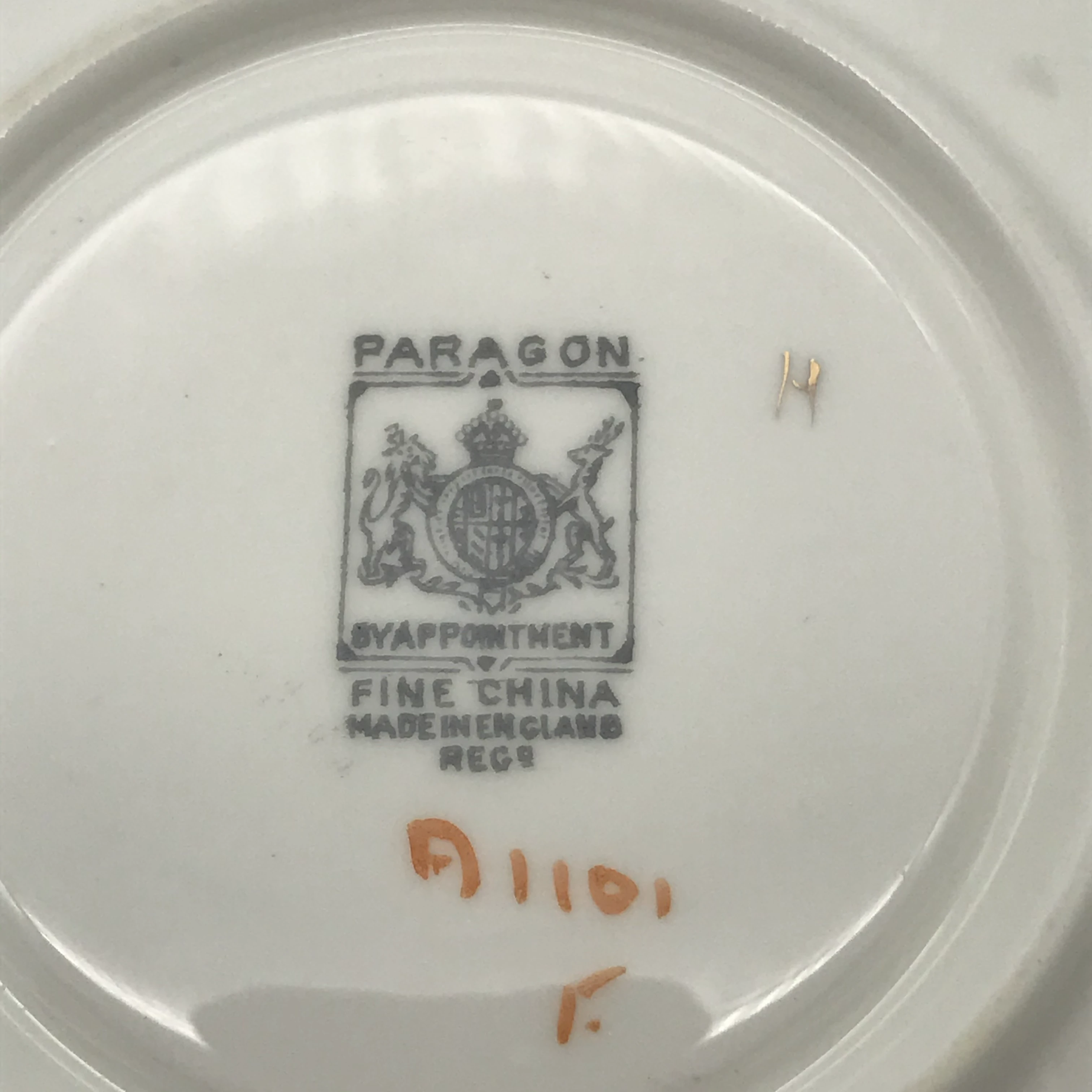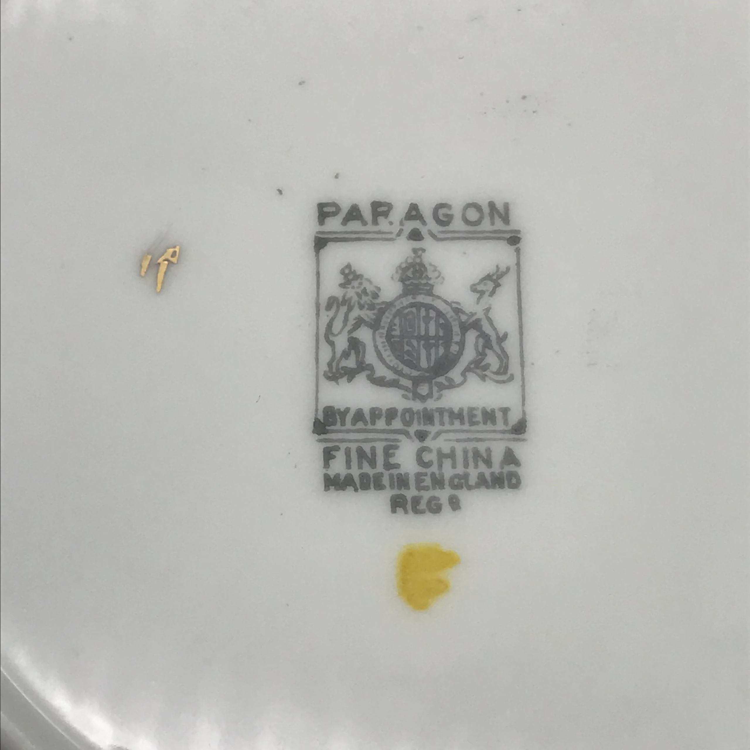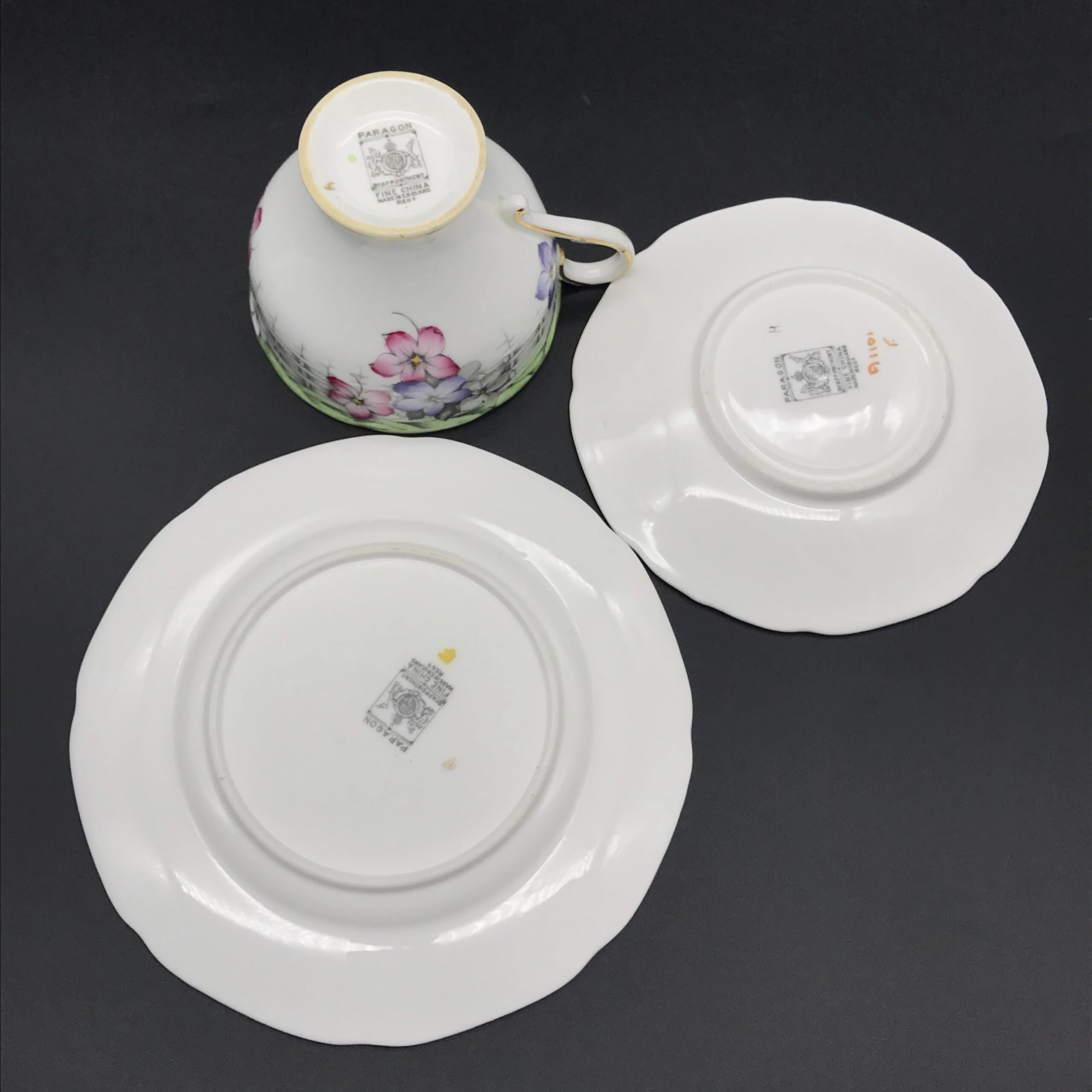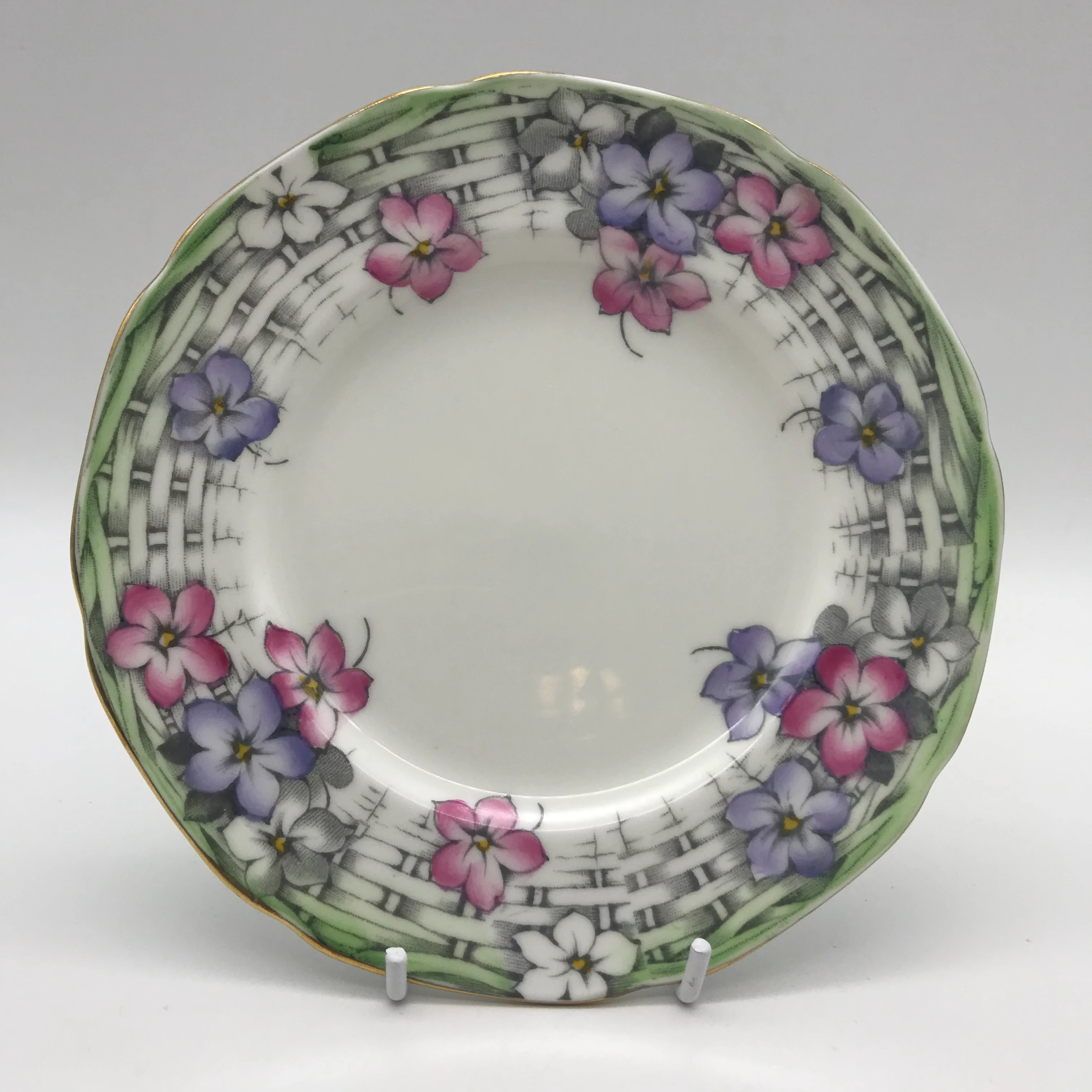 This wonderful 1930’s Paragon trio is in excellent condition and is decorated with a very attractive basket weave and floral design in a rare pattern that I couldn’t find or trace. There are purple, pink and white flowers amongst a grey basket weave, with a pale green edge and a gold trim on the rim of each piece.