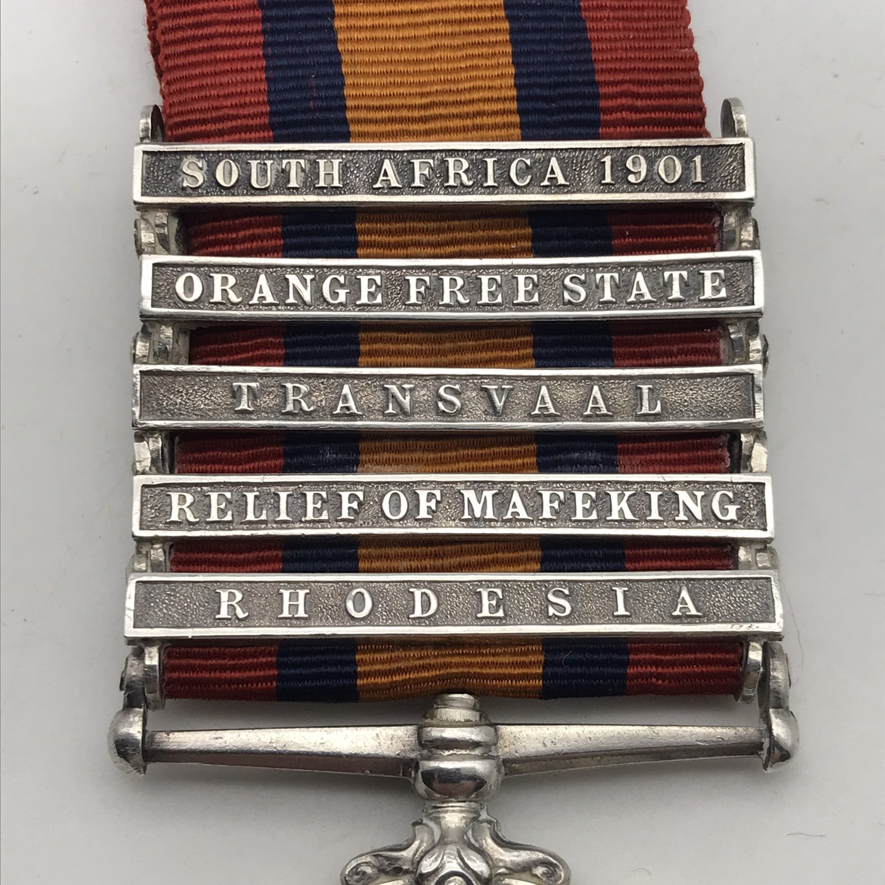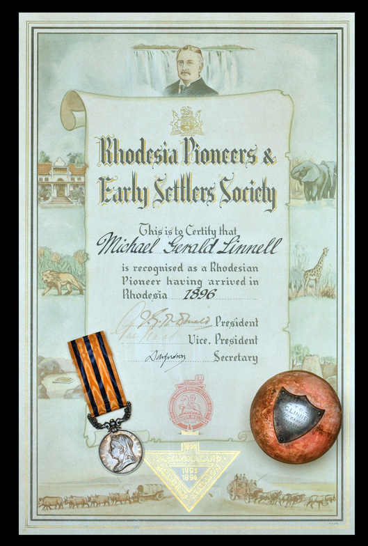 This scarce, impressive, original, full size ‘Queen South Africa Medal’ with five clasps (Rhodesia, Relief of Mafeking, Transvaal, Orange Free State and South Africa 1901), was issued to one of the early Rhodesian pioneers, ‘Corporal Michael Gerald Linnell’ who served with the ‘Southern Rhodesia Volunteers’ at the ‘Relief of Mafeking’. The rim of the medal is impressed ‘696 CORPL: M.G. LINNELL, S. RHOD: VOLS:’. The medal is in excellent condition and comes complete with its original ribbon and a copy of his ‘Pioneer Certificate’ that I came across on the net. This impressive medal could do with further research, as I feel I’ve only scratched the surface.