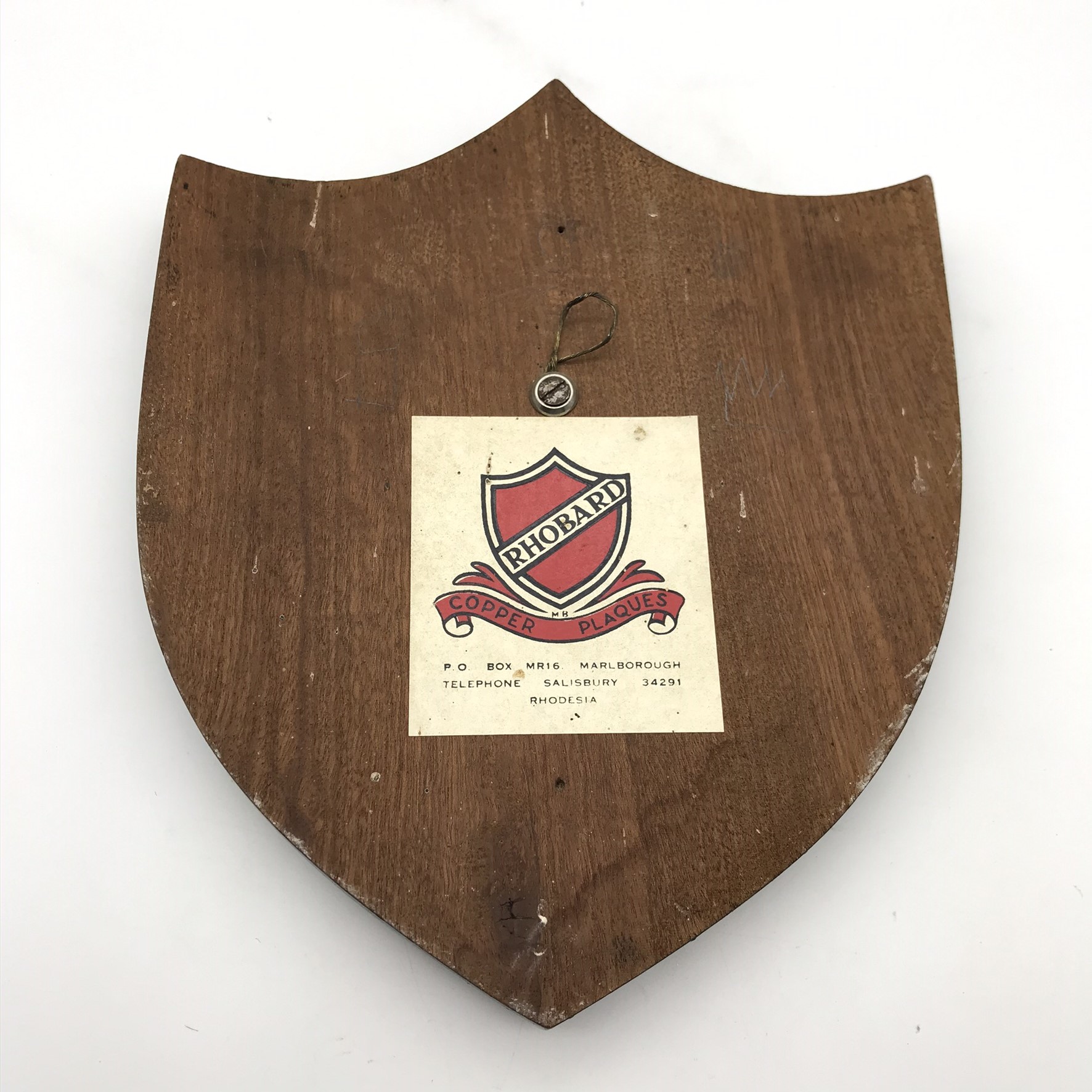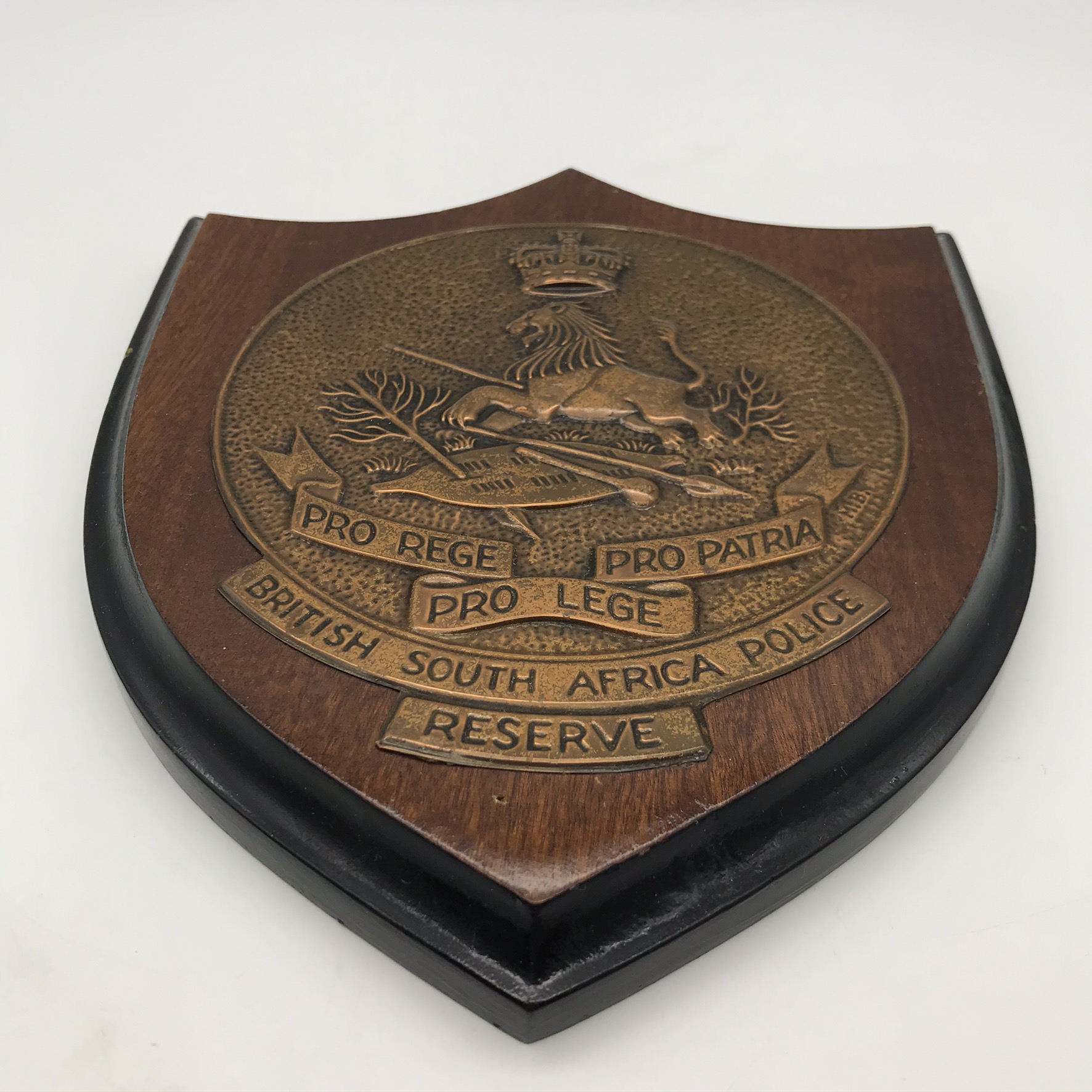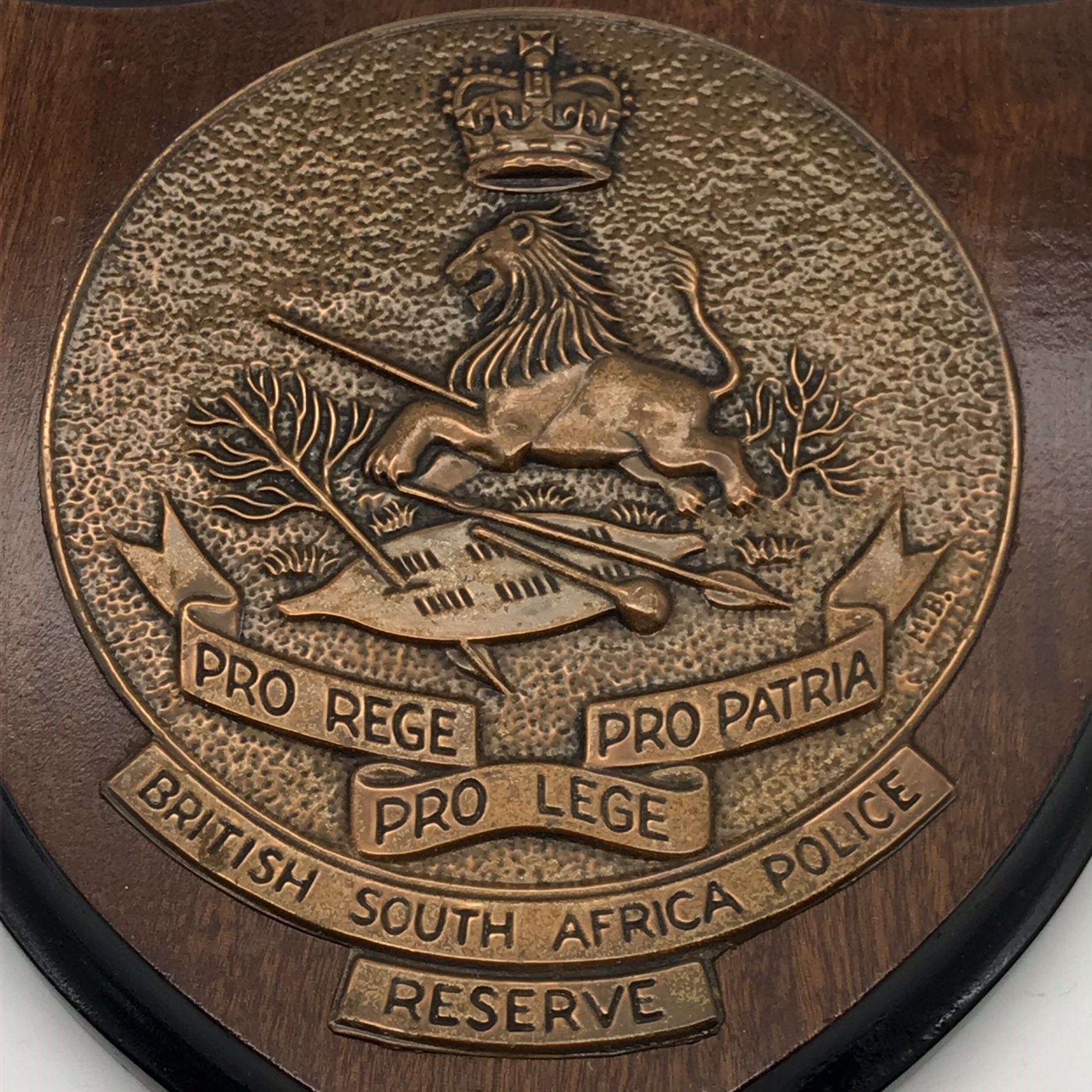 This scarce, original, pre ‘UDI’ (1965), Rhodesian ‘British South Africa Police Reserve’ (with crown), copper and wooden plaque is in excellent condition, and in all my years of trading, I’ve never seen another one like it. It has its original label on the back ‘RHOBARD, COPPER PLAQUES’ ‘MARLBOROUGH, SALISBURY, RHODESIA’ and it measures 21,5cm x 18cm x 2cm.