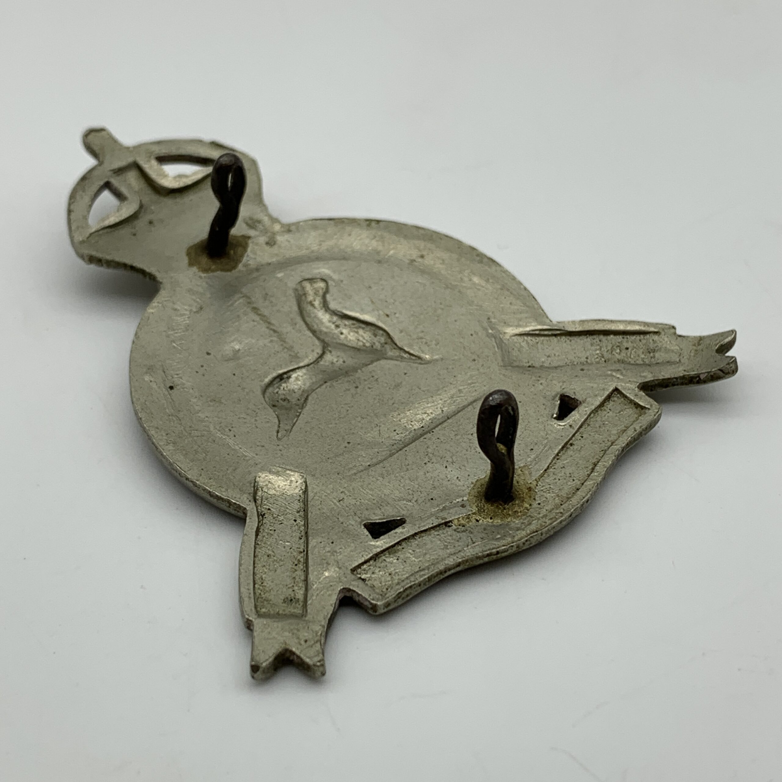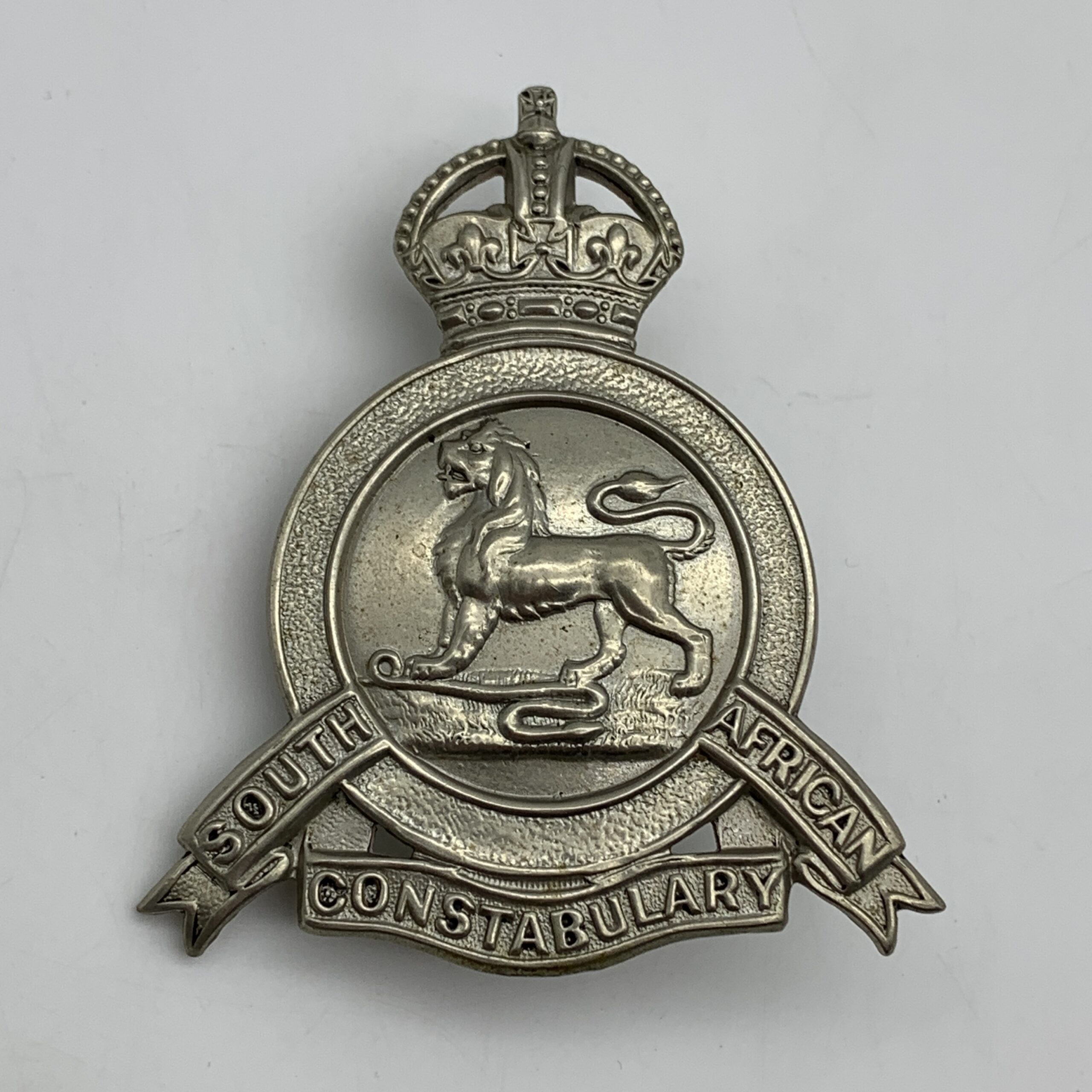 This scarce, original, white metal slouch hat badge (solid centre version) was worn by the ‘South African Constabulary’ between 1902 and 1908. The badge is in excellent condition with both lugs intact and measures 66mm x 56mm.