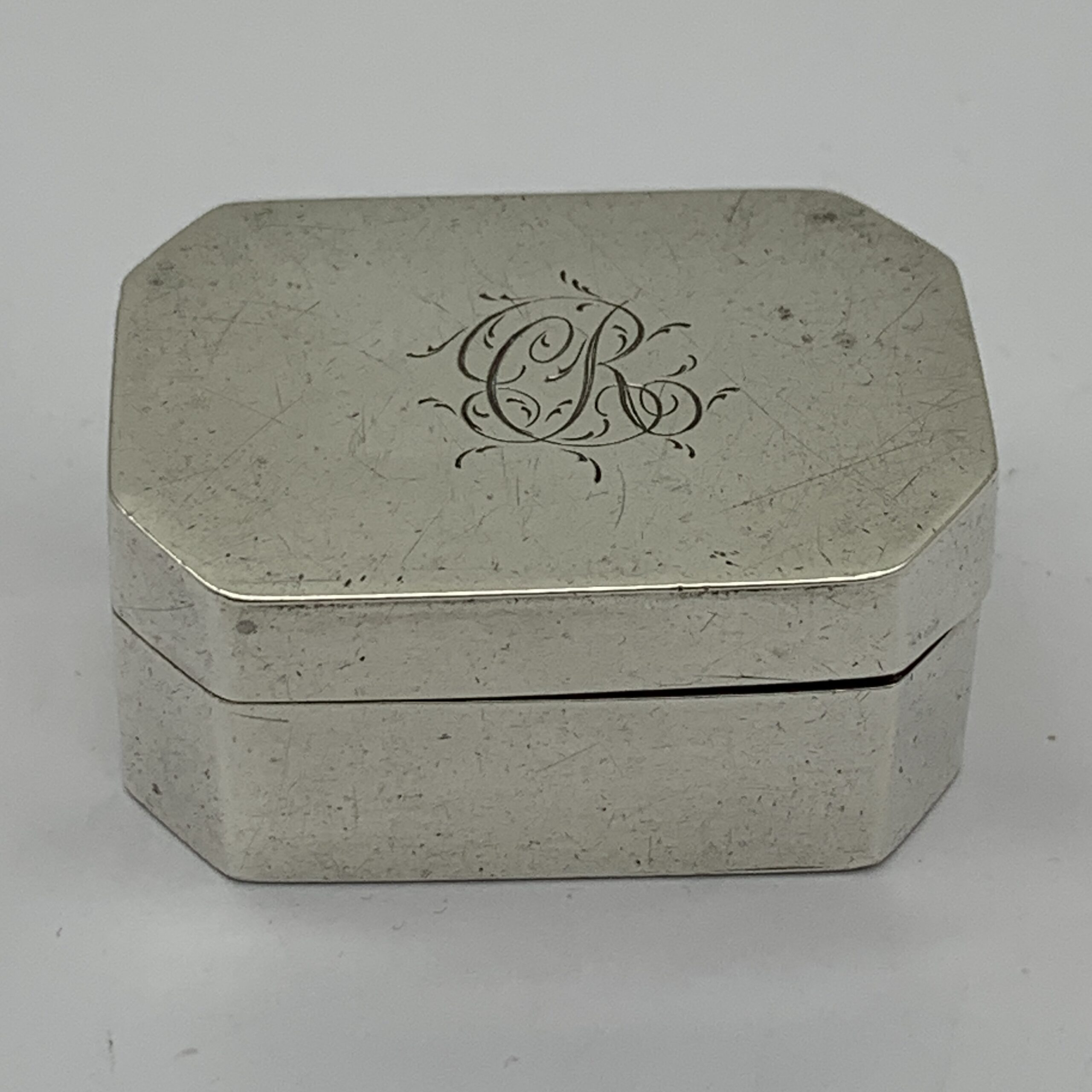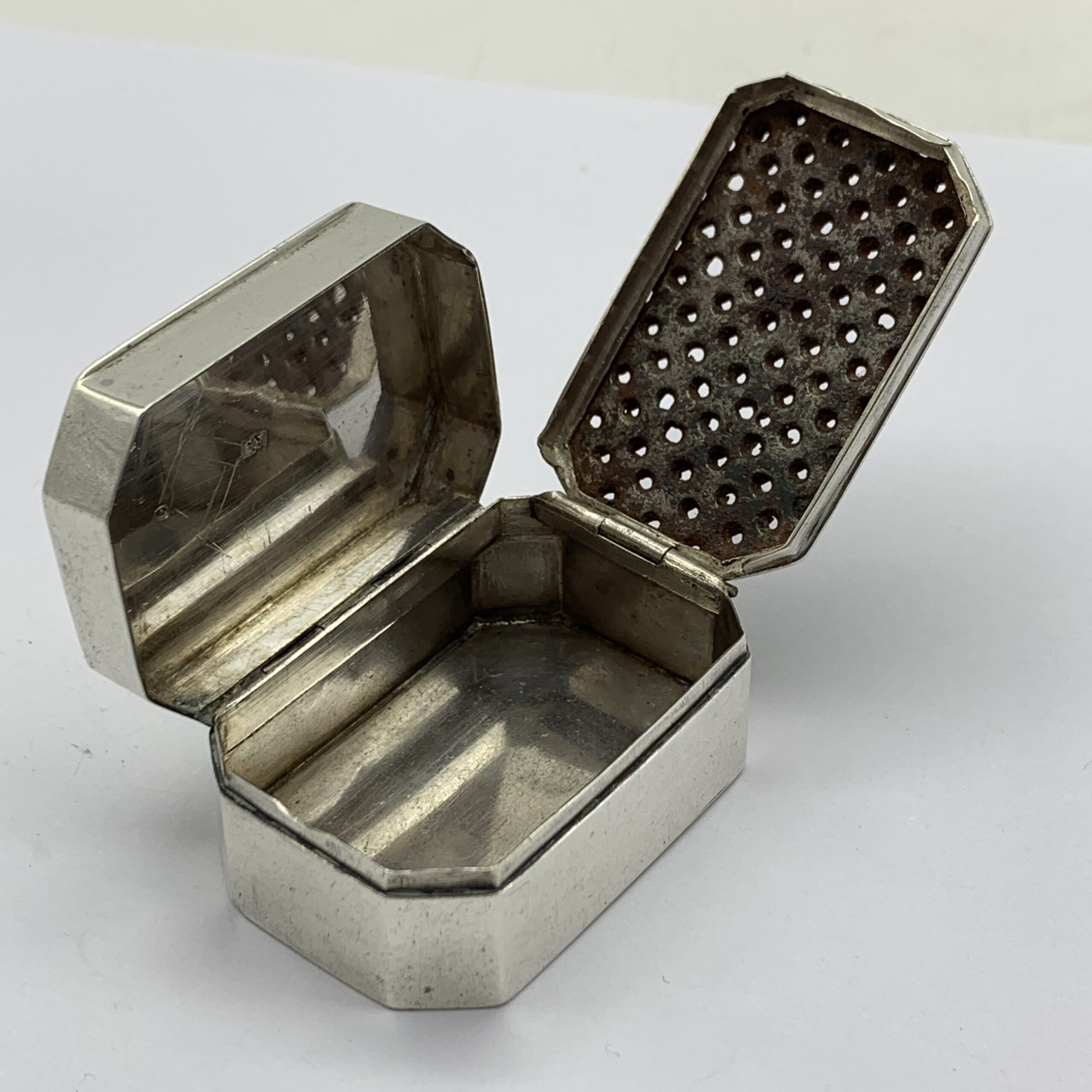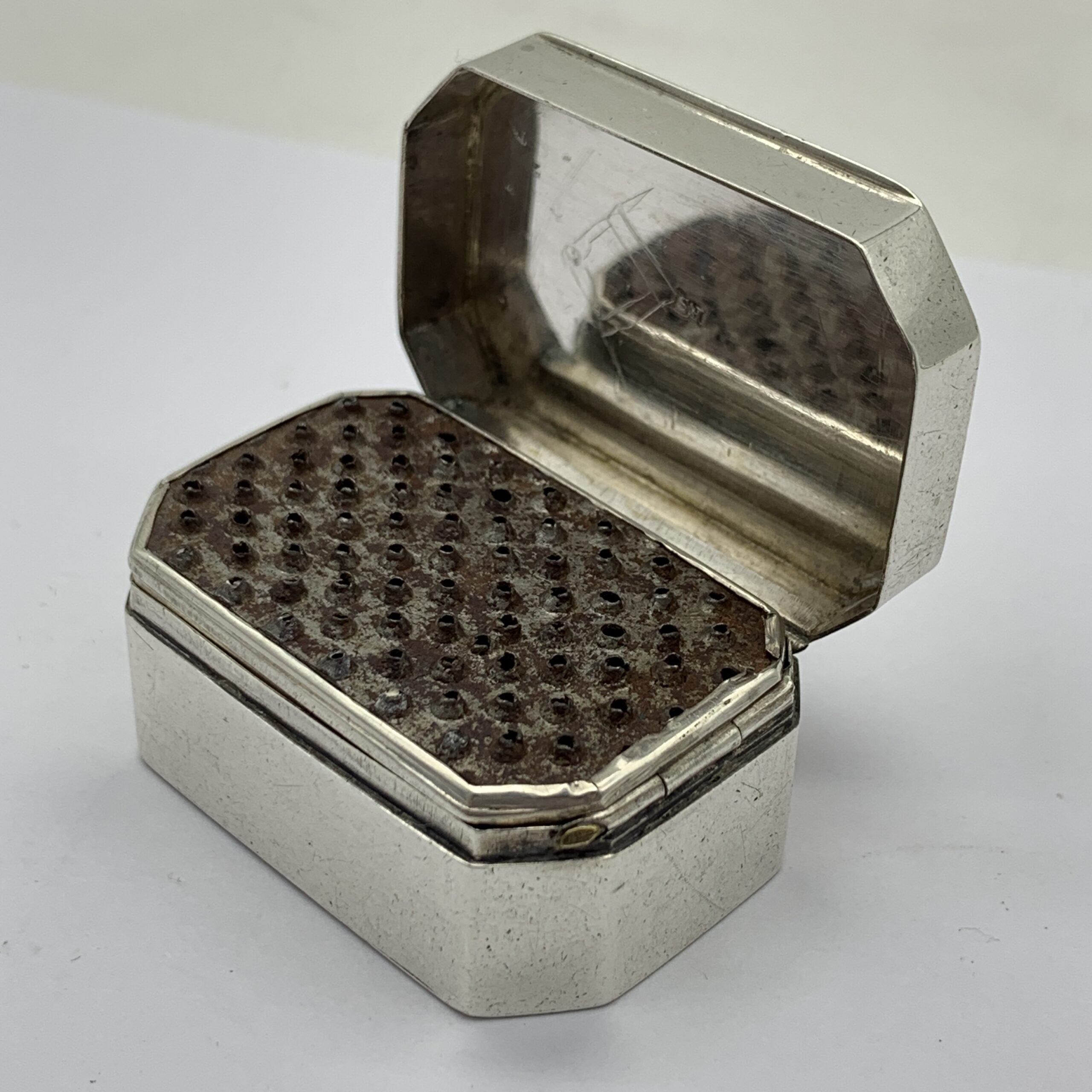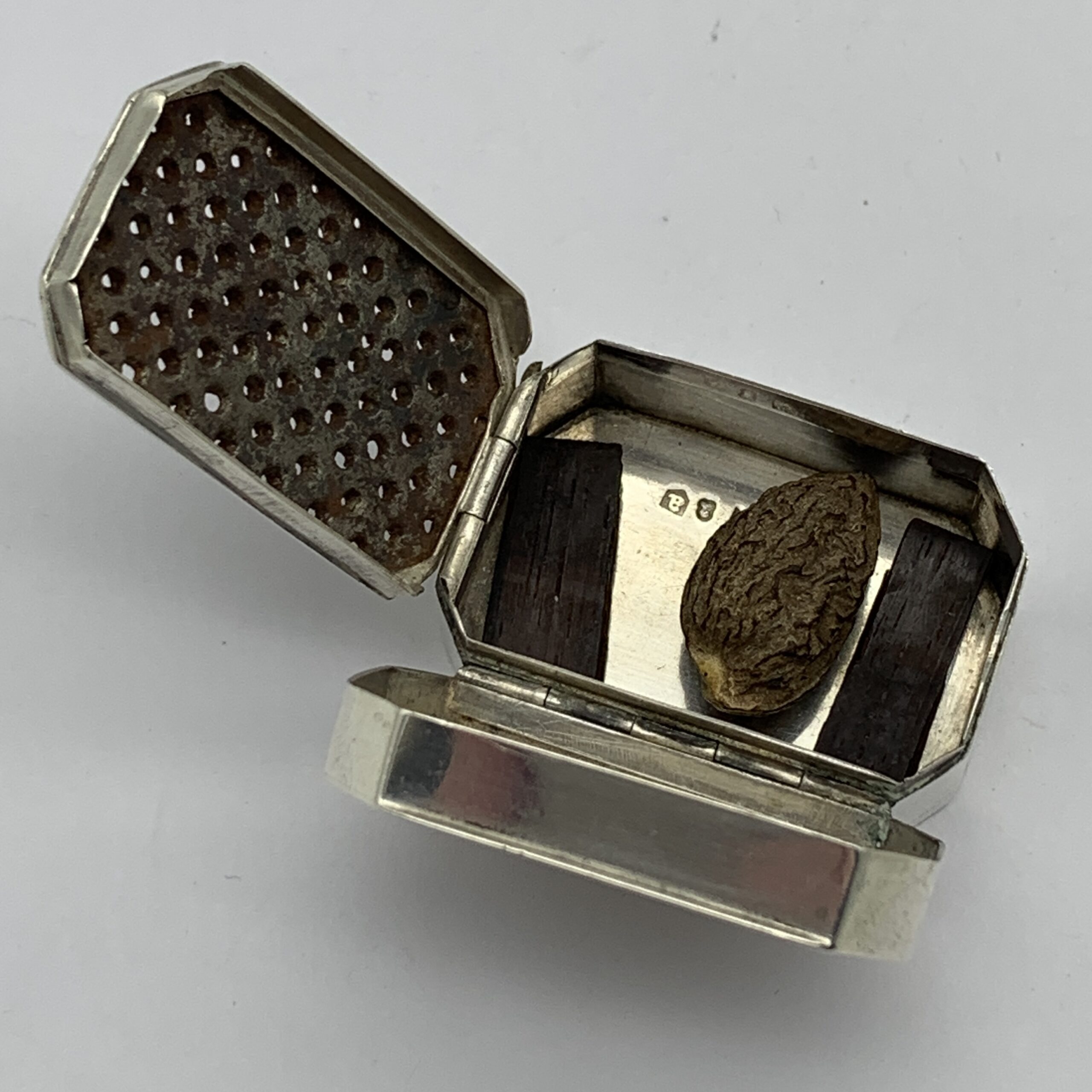 This superb, very rare, 18th century, English hallmarked travelling silver nutmeg grater (with contents), was made in Birmingham in 1798 by silversmiths ‘Ford & Slater’ (F.S), a very scarce maker whose items seldom come on the market. The small rectangular shaped silver box with canted corners, has an internal, silver framed and hinged steel grating grid with storage space underneath for the nutmeg seeds. It is plain with no decoration except for an engraved ‘CR’ monogram on the lid and other than a minor dent on the back, it’s in great condition with nice clear hallmarks, good hinges on snug fitting lids and comes complete with aged contents, a nutmeg seed along with two dark brown items, possibly very early pieces of vanilla sticks. This wonderful nutmeg grater is not only a rare piece of Georgian silver but was also made by a rare silversmith 226 years ago. It measures 42mm x 30mm x 20mm and weighs 32g.