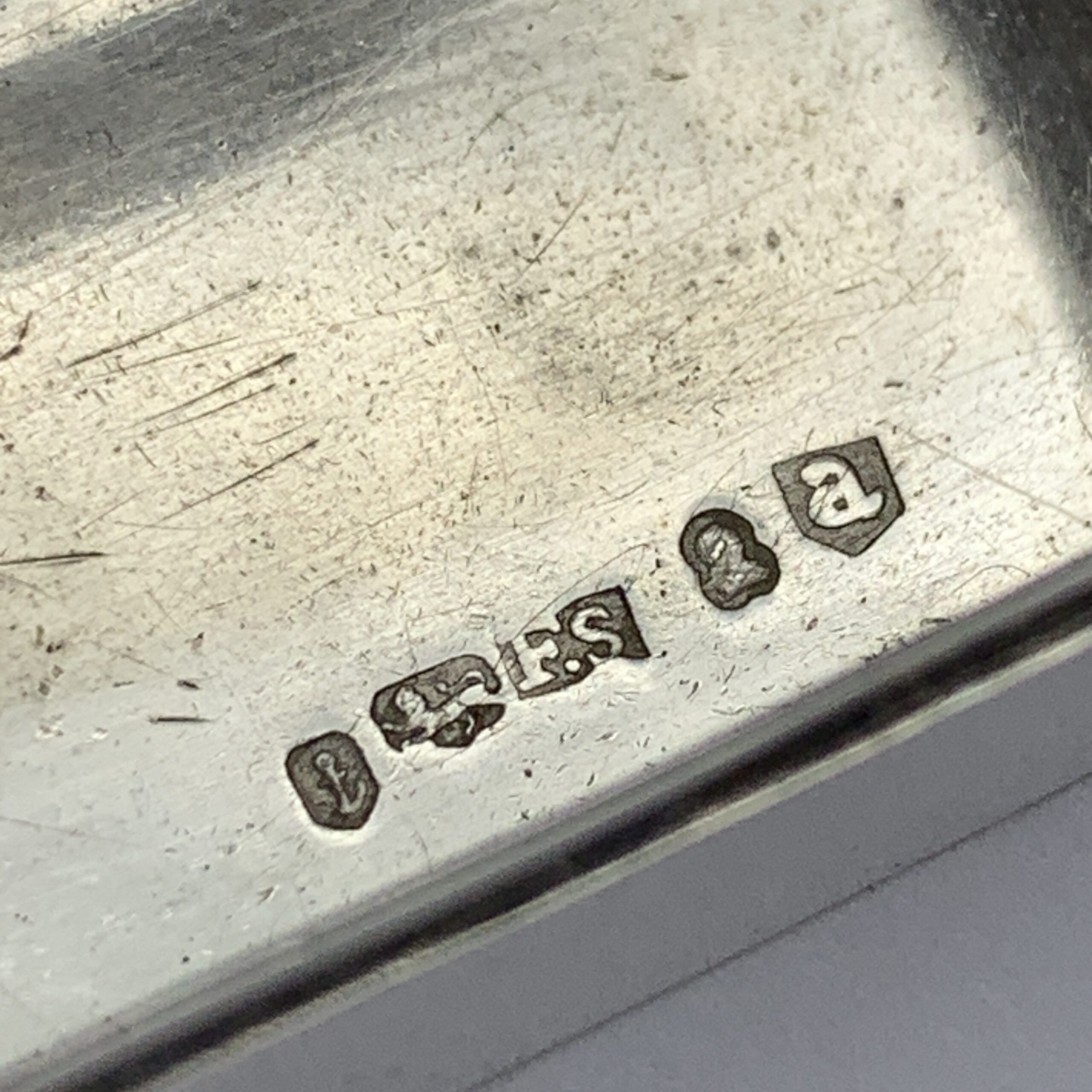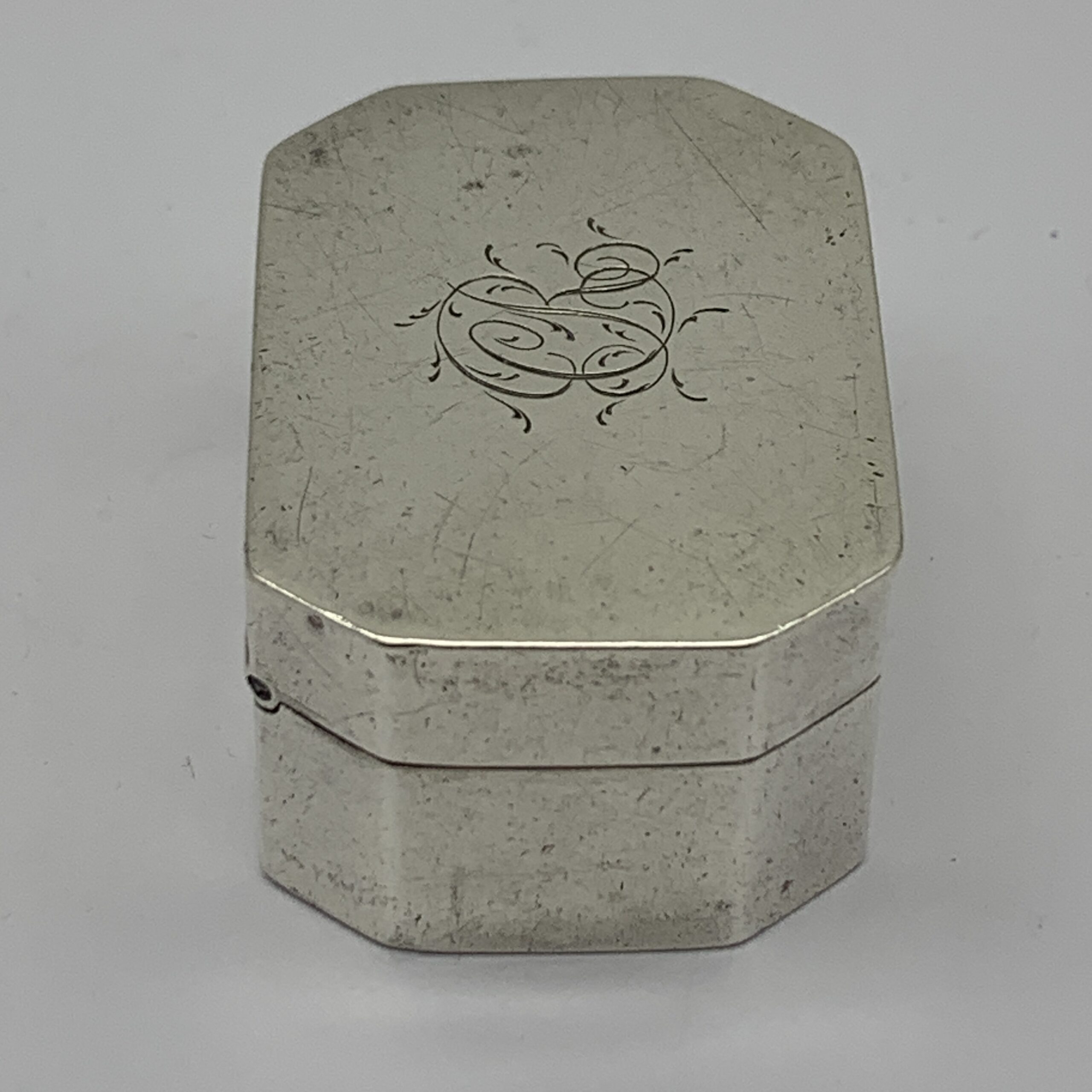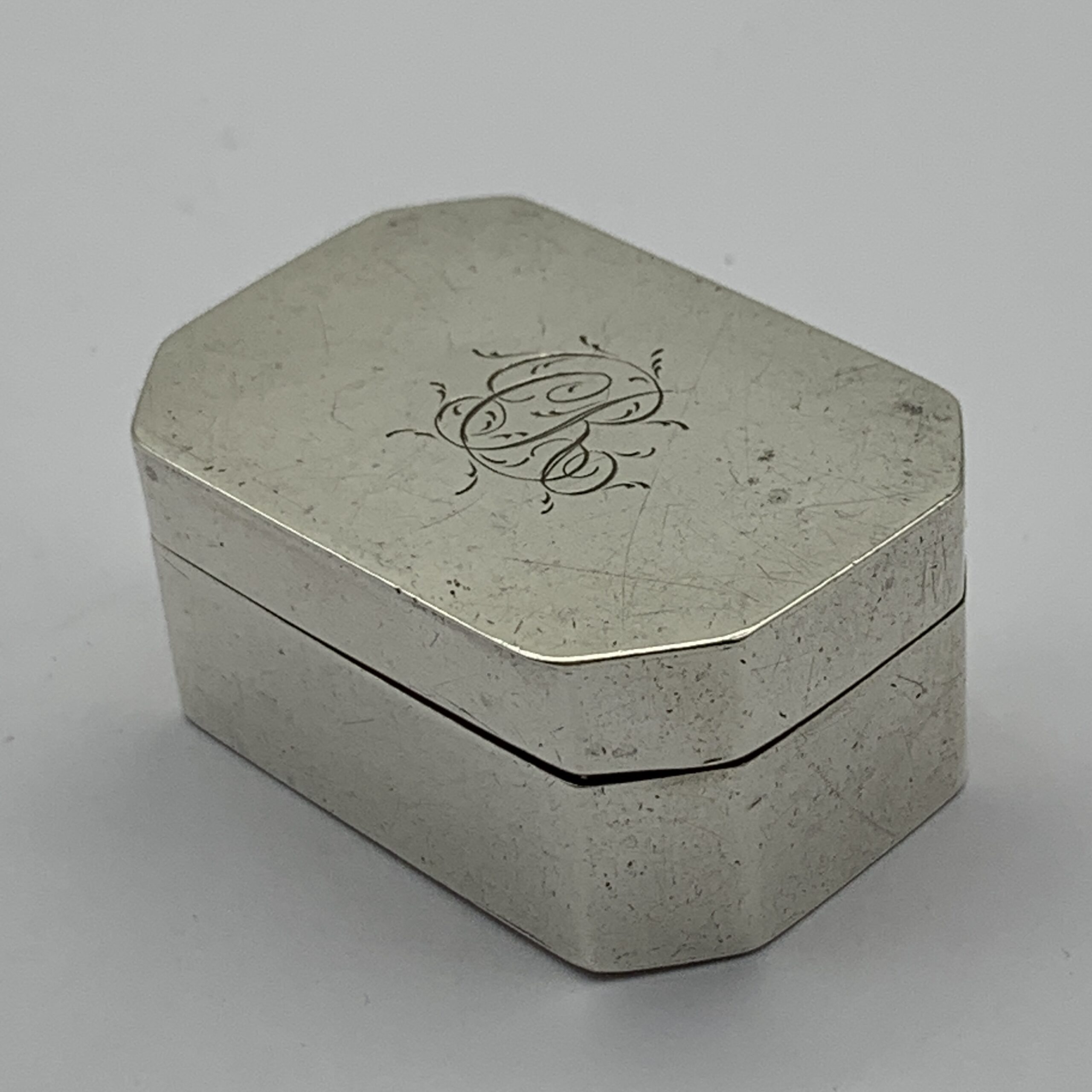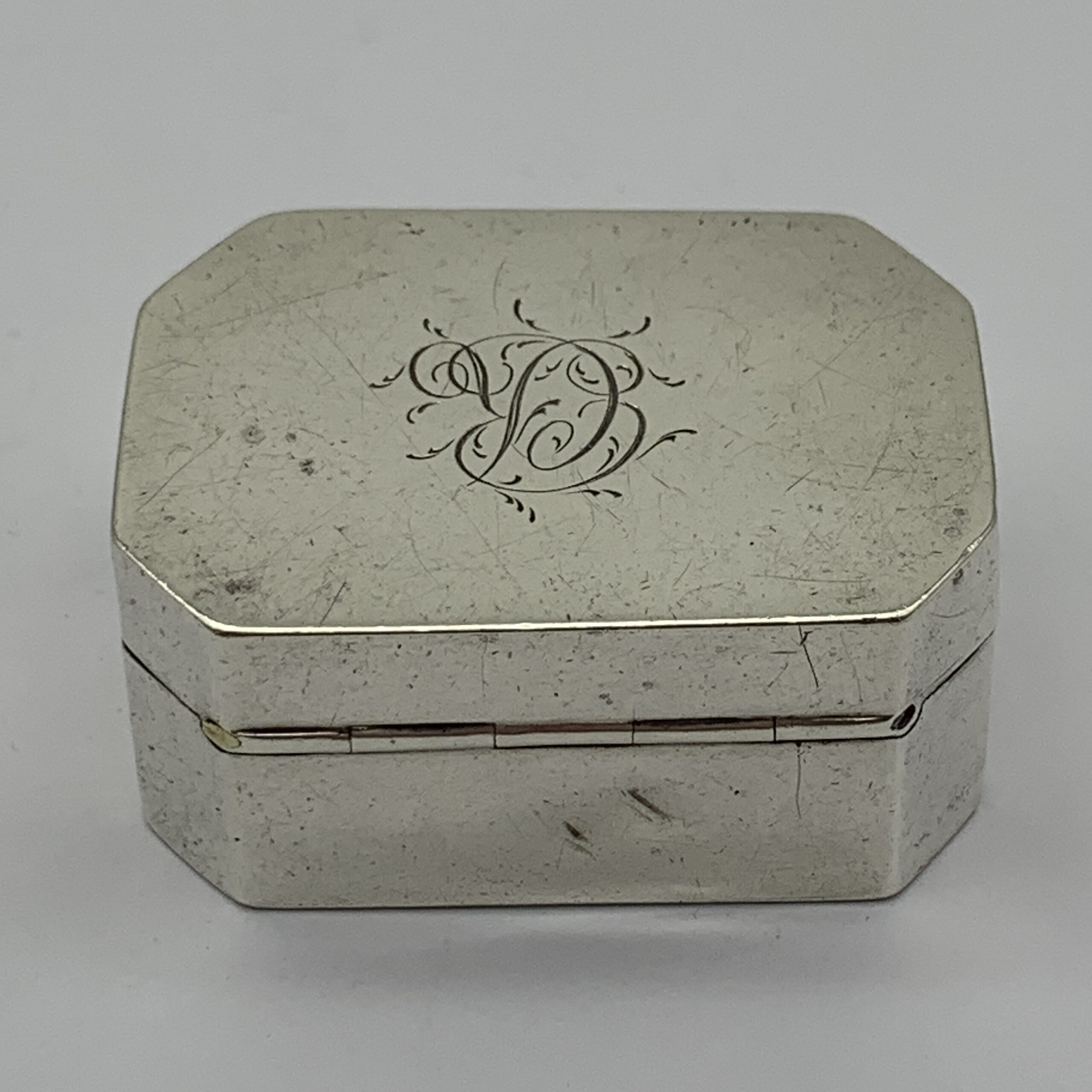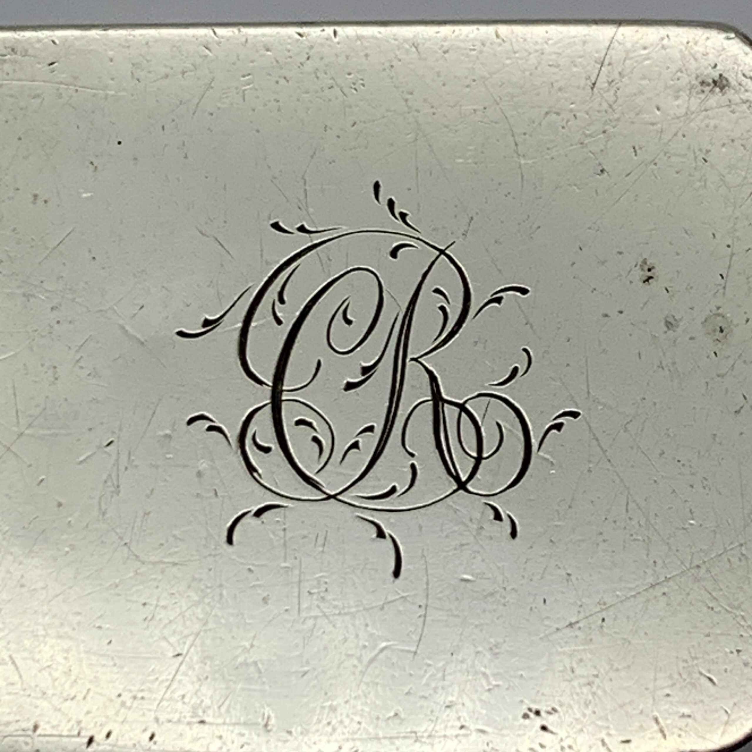 This superb, very rare, 18th century, English hallmarked travelling silver nutmeg grater (with contents), was made in Birmingham in 1798 by silversmiths ‘Ford & Slater’ (F.S), a very scarce maker whose items seldom come on the market. The small rectangular shaped silver box with canted corners, has an internal, silver framed and hinged steel grating grid with storage space underneath for the nutmeg seeds. It is plain with no decoration except for an engraved ‘CR’ monogram on the lid and other than a minor dent on the back, it’s in great condition with nice clear hallmarks, good hinges on snug fitting lids and comes complete with aged contents, a nutmeg seed along with two dark brown items, possibly very early pieces of vanilla sticks. This wonderful nutmeg grater is not only a rare piece of Georgian silver but was also made by a rare silversmith 226 years ago. It measures 42mm x 30mm x 20mm and weighs 32g.