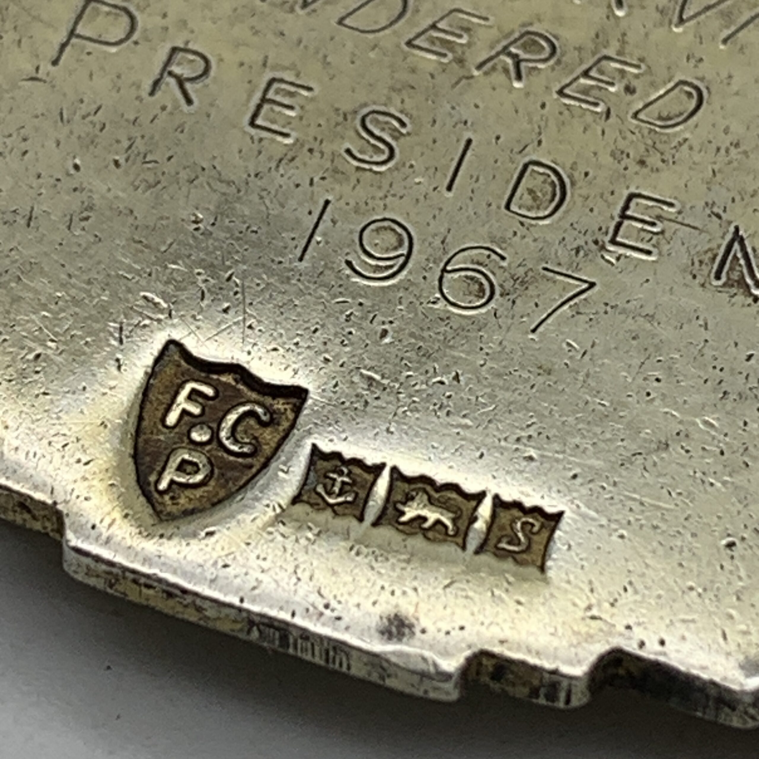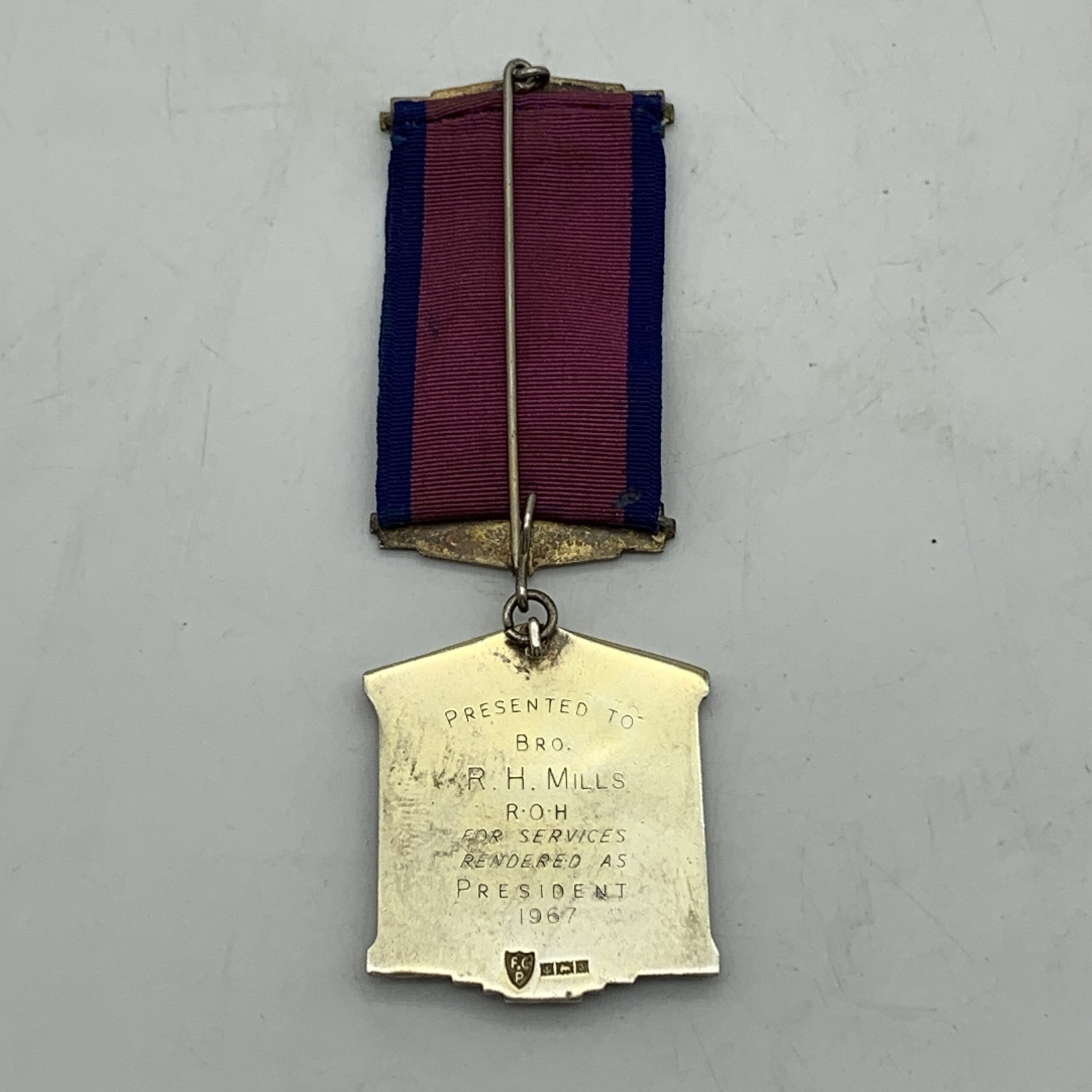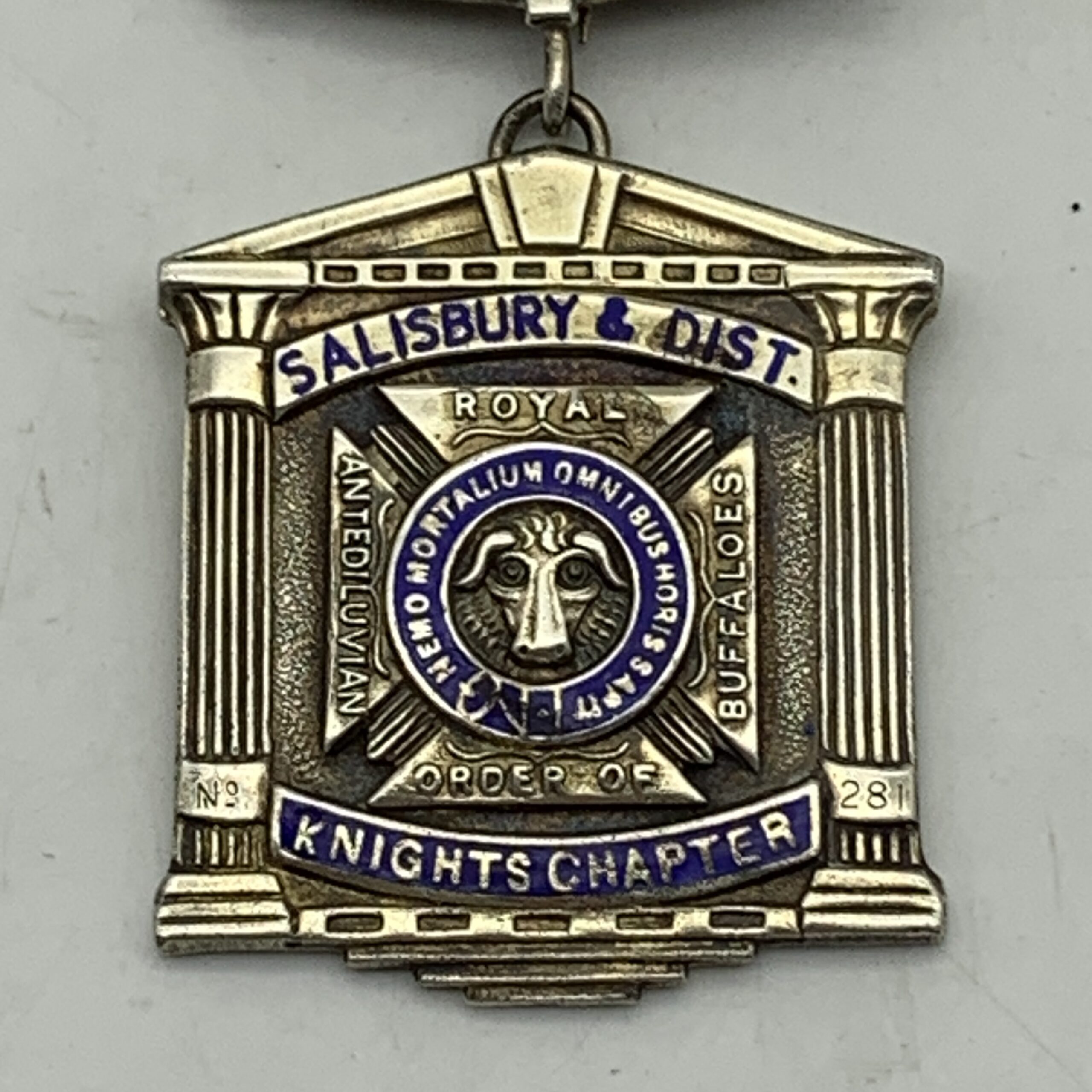 This fine quality, heavy, sterling silver and enamel ‘Royal Antediluvian Order of Buffalos’ (RAOB) ‘Knights Chapter – 1967 - President’ medal or Jewel, is from the ‘SALISBURY & DISTRICT’ Branch in Rhodesia. It is engraved ‘PRESENTED TO BRO R.H. MILLS’ ‘R.O.H. FOR SERVICES RENDERED AS PRESIDENT 1967’ on the back and is English hallmarked for Birmingham 1967, with the maker’s mark (F. CP) for ‘F. C. Parry Ltd’. This scarce medal is in excellent condition, complete with its original ribbon and measures 4cm x 11cm including the ribbon, and weighs 43,7g.
