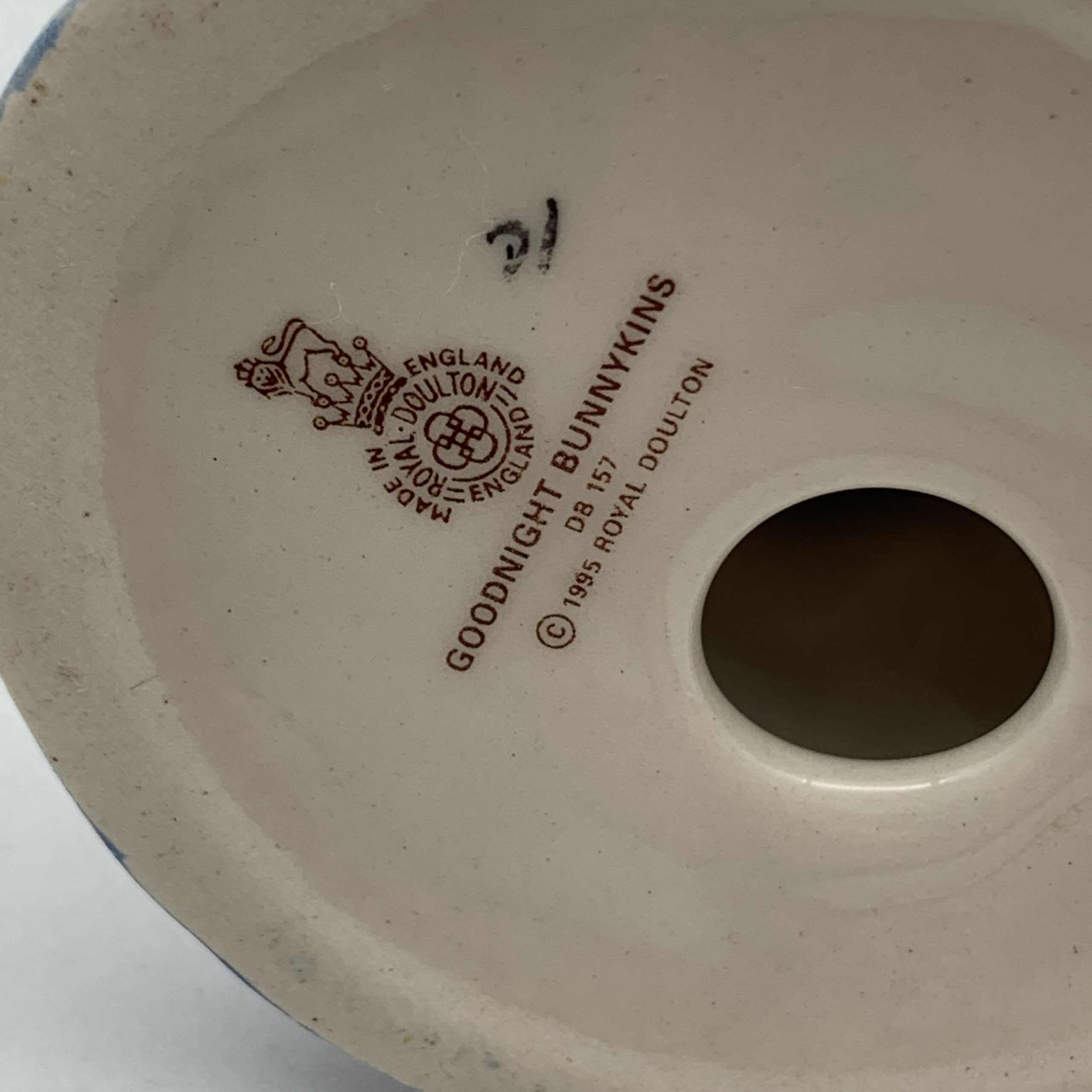 This cute, hand painted Royal Doulton china figure, titled ‘Goodnight’ (DB 157), from the ‘Bunnykins Nursery Rhymes’ collection, was designed by ‘Graham Tongue’ and produced for a short period, from 1995 to 1999. This discontinued figure is in excellent condition and stands 7,5cm.