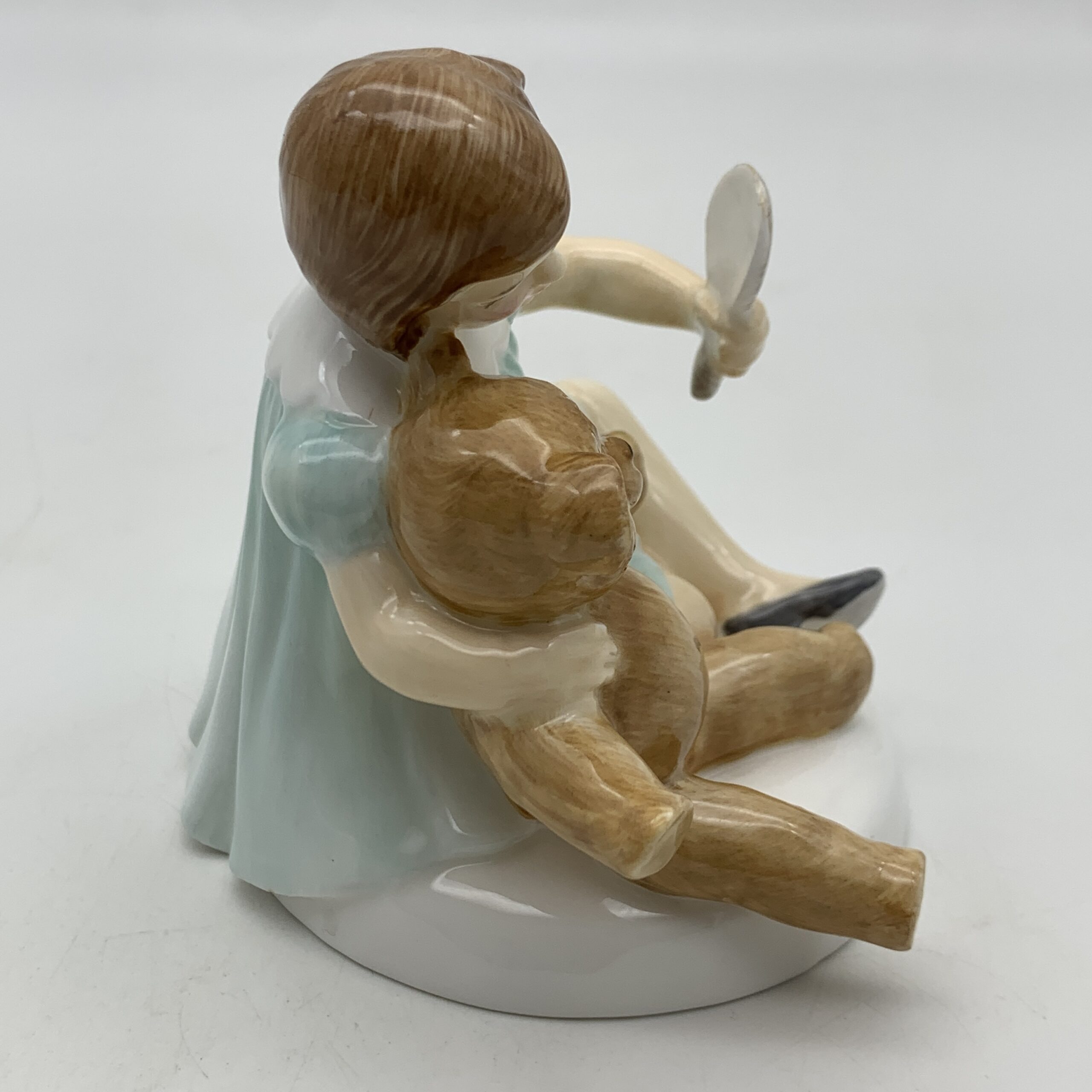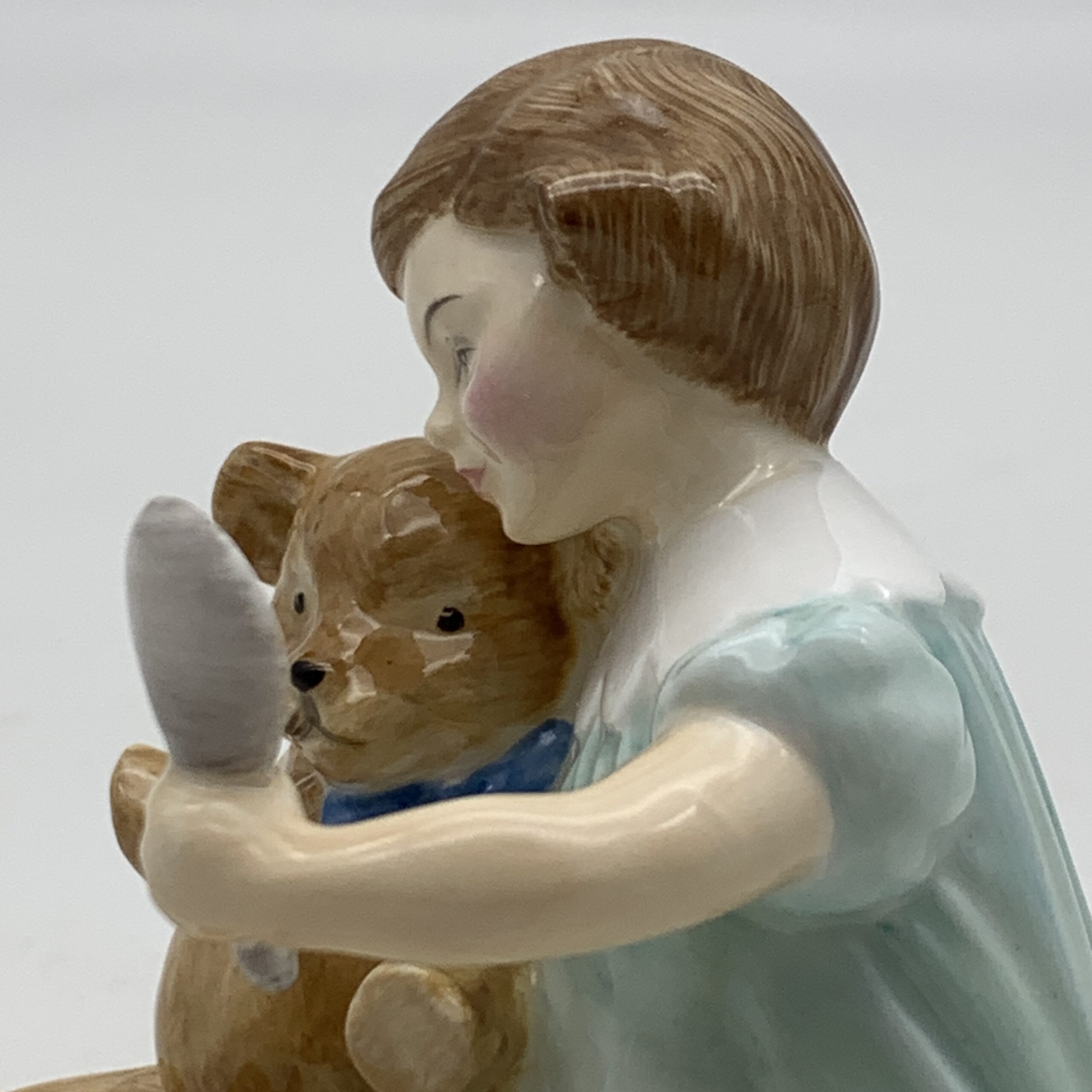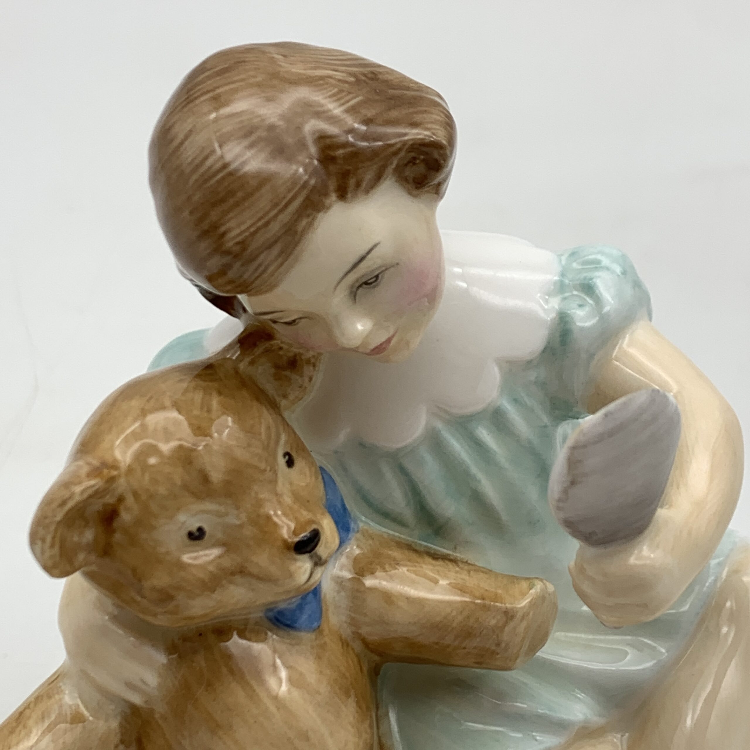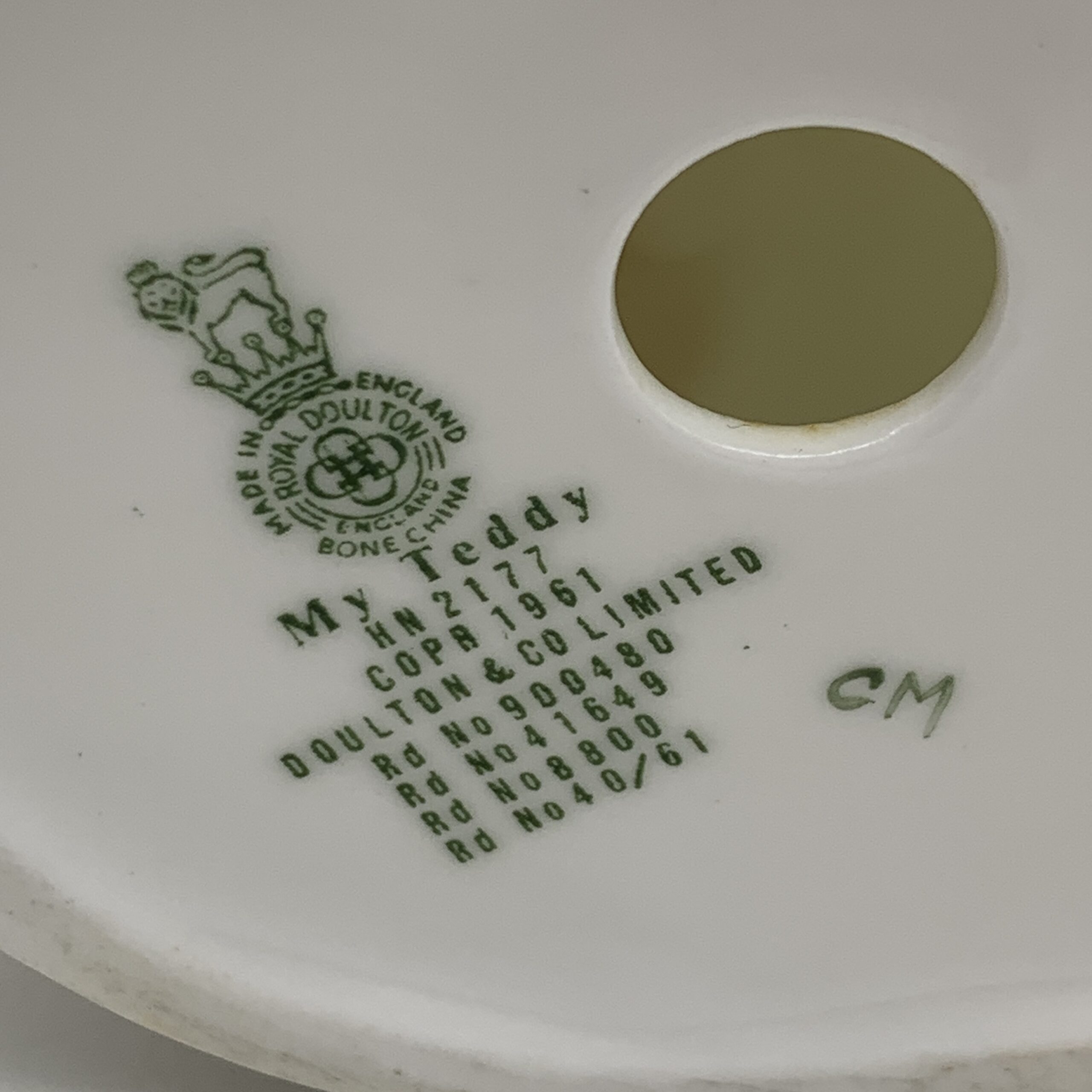 This scarce, adorable, hand painted Royal Doulton porcelain figurine, titled ‘My Teddy’ (HN2177) features a young girl, seated with her one arm around a large teddy bear, and holding a hand mirror with the other. She was designed by ‘Peggy Davies’ and produced for a short period, between 1962 and 1967. This lovely figurine is in excellent condition and carries the ‘Royal Doulton’ backstamp on the base. She stands 8,5cm high and measures 9cm at her widest.