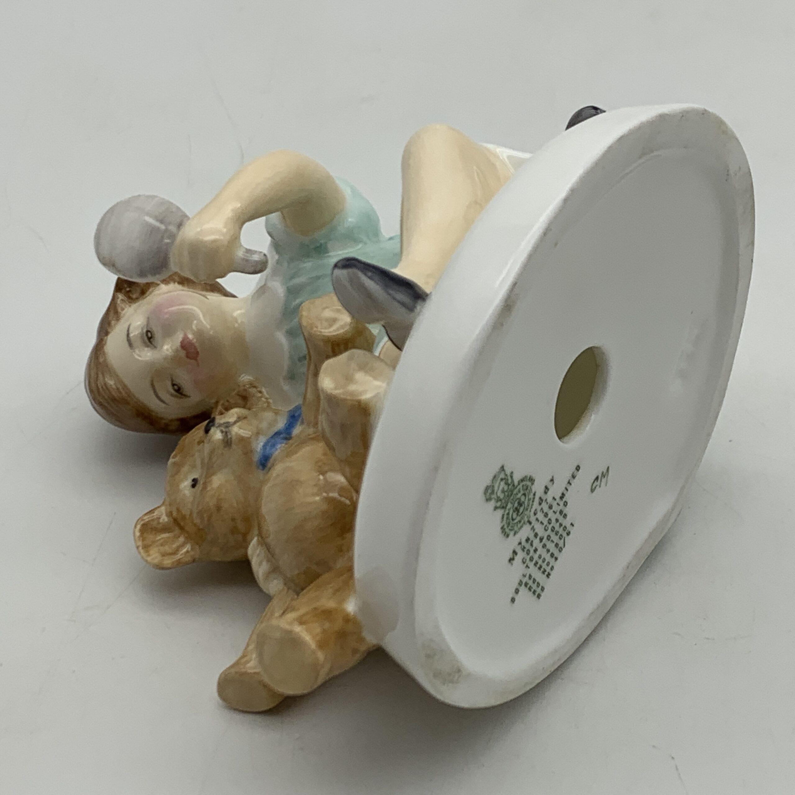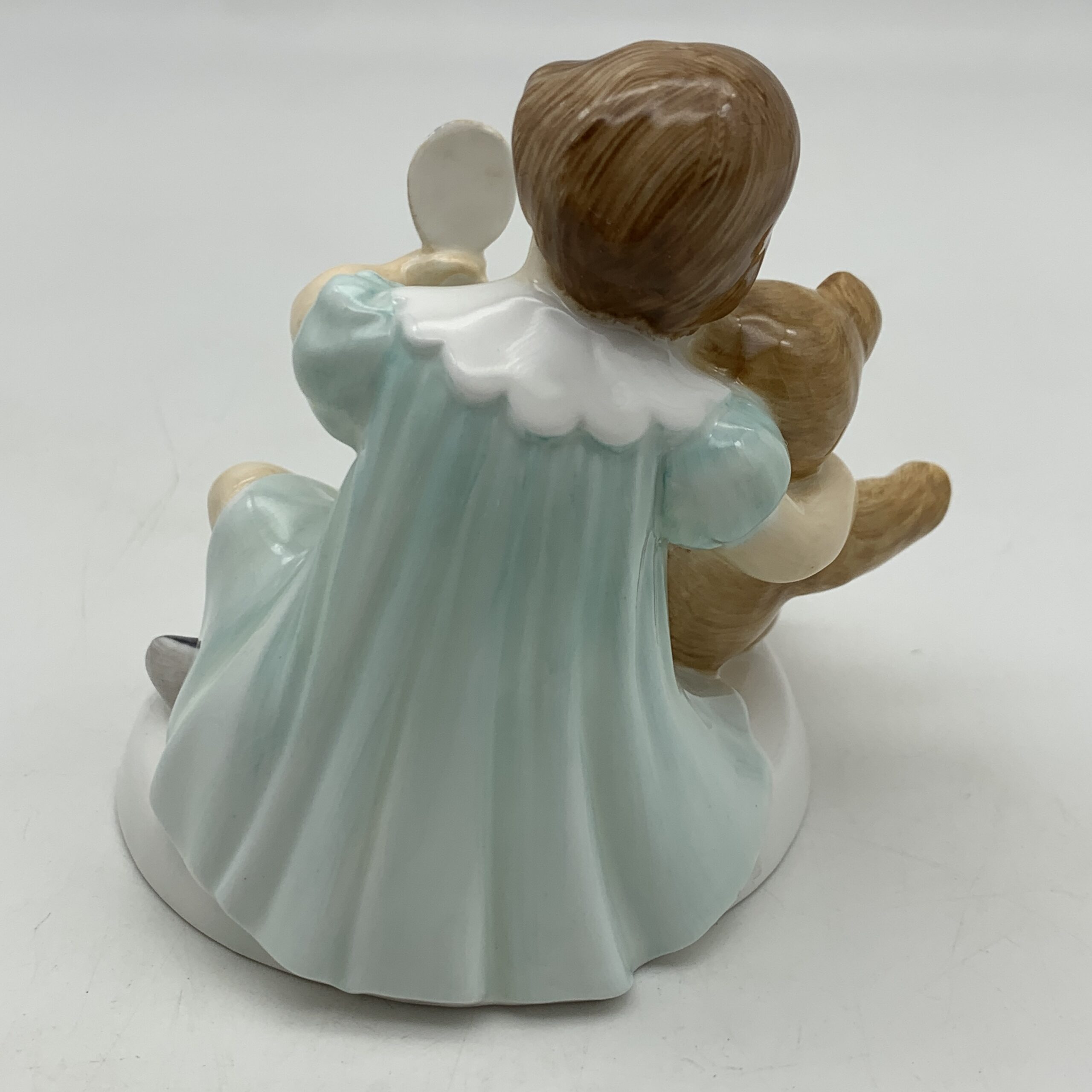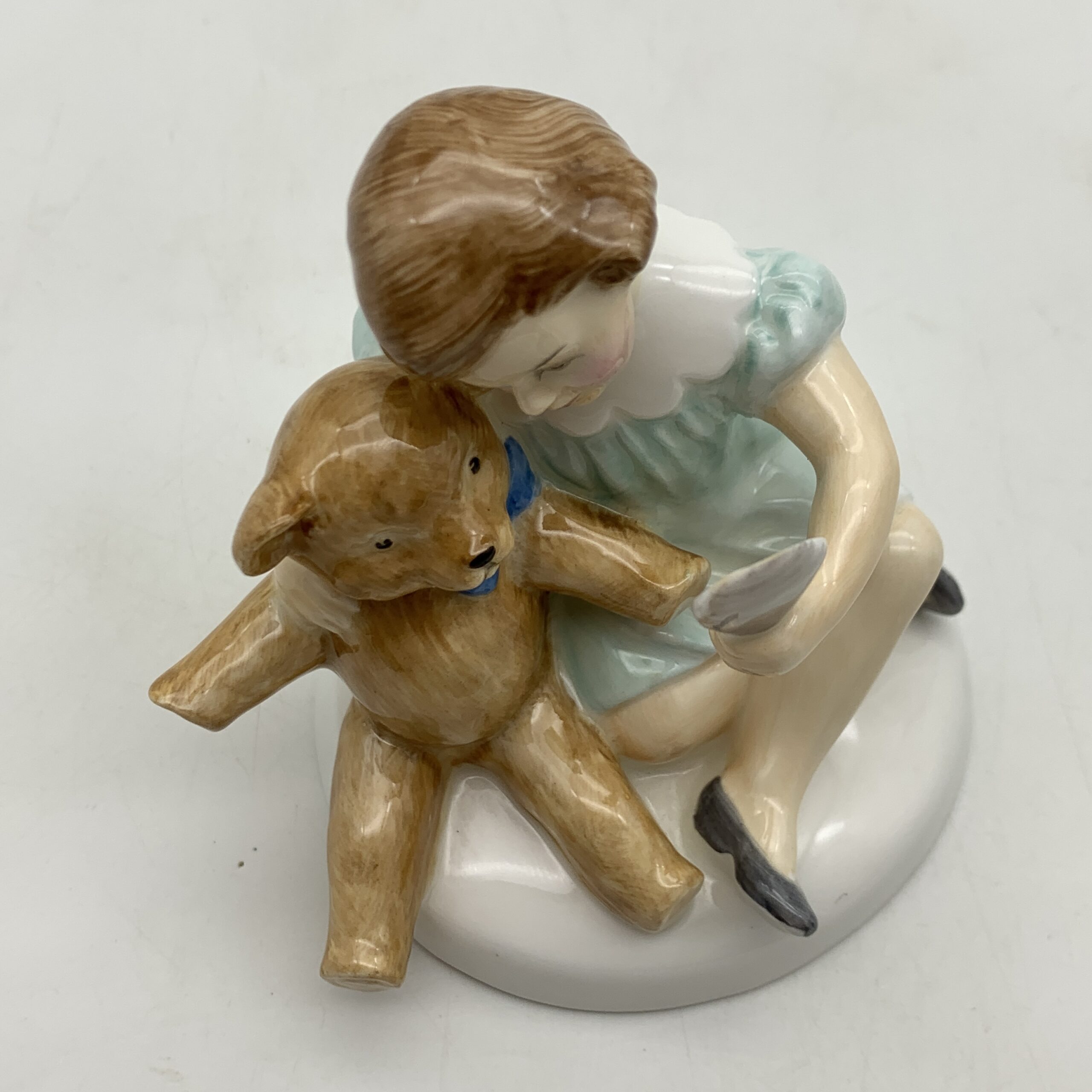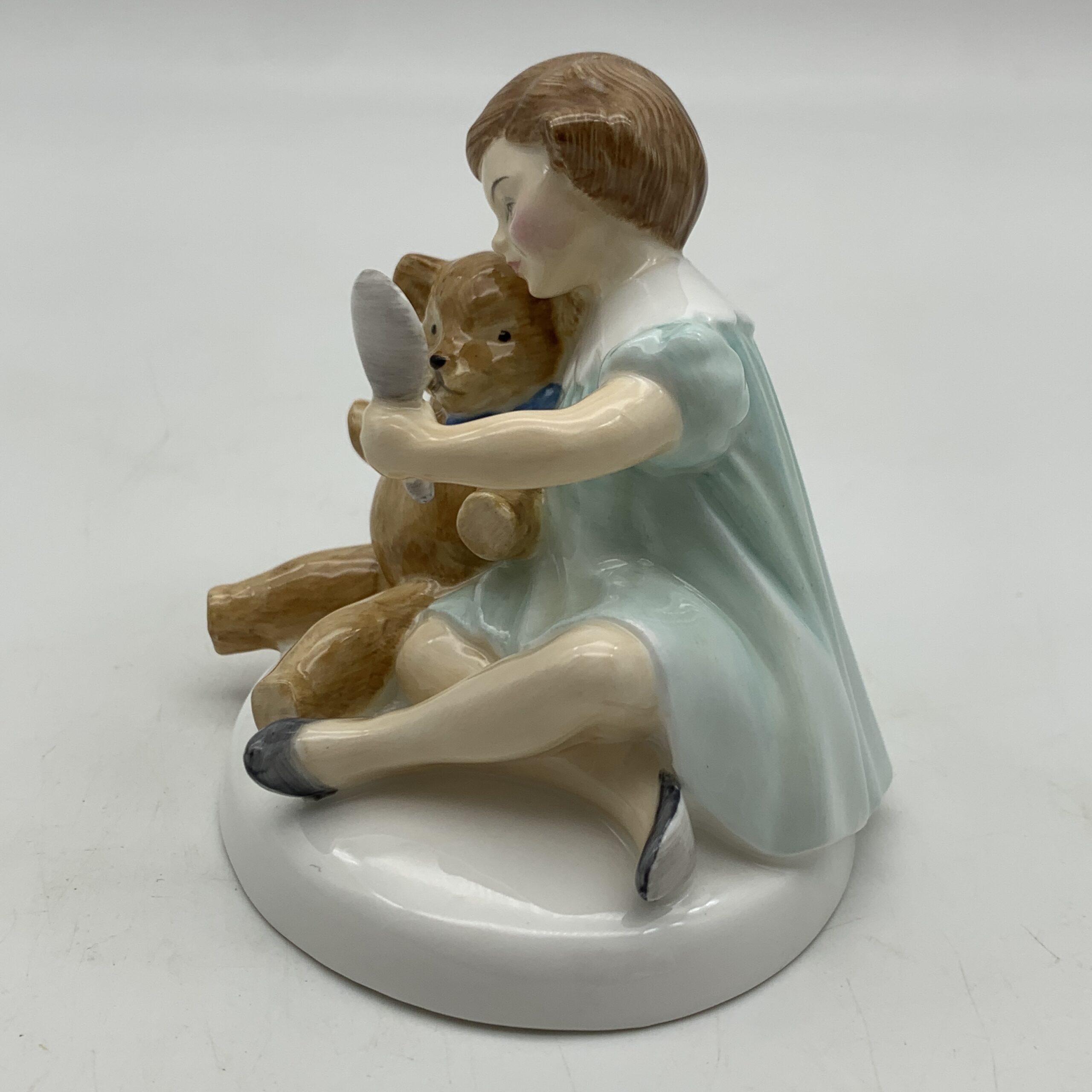 This scarce, adorable, hand painted Royal Doulton porcelain figurine, titled ‘My Teddy’ (HN2177) features a young girl, seated with her one arm around a large teddy bear, and holding a hand mirror with the other. She was designed by ‘Peggy Davies’ and produced for a short period, between 1962 and 1967. This lovely figurine is in excellent condition and carries the ‘Royal Doulton’ backstamp on the base. She stands 8,5cm high and measures 9cm at her widest.