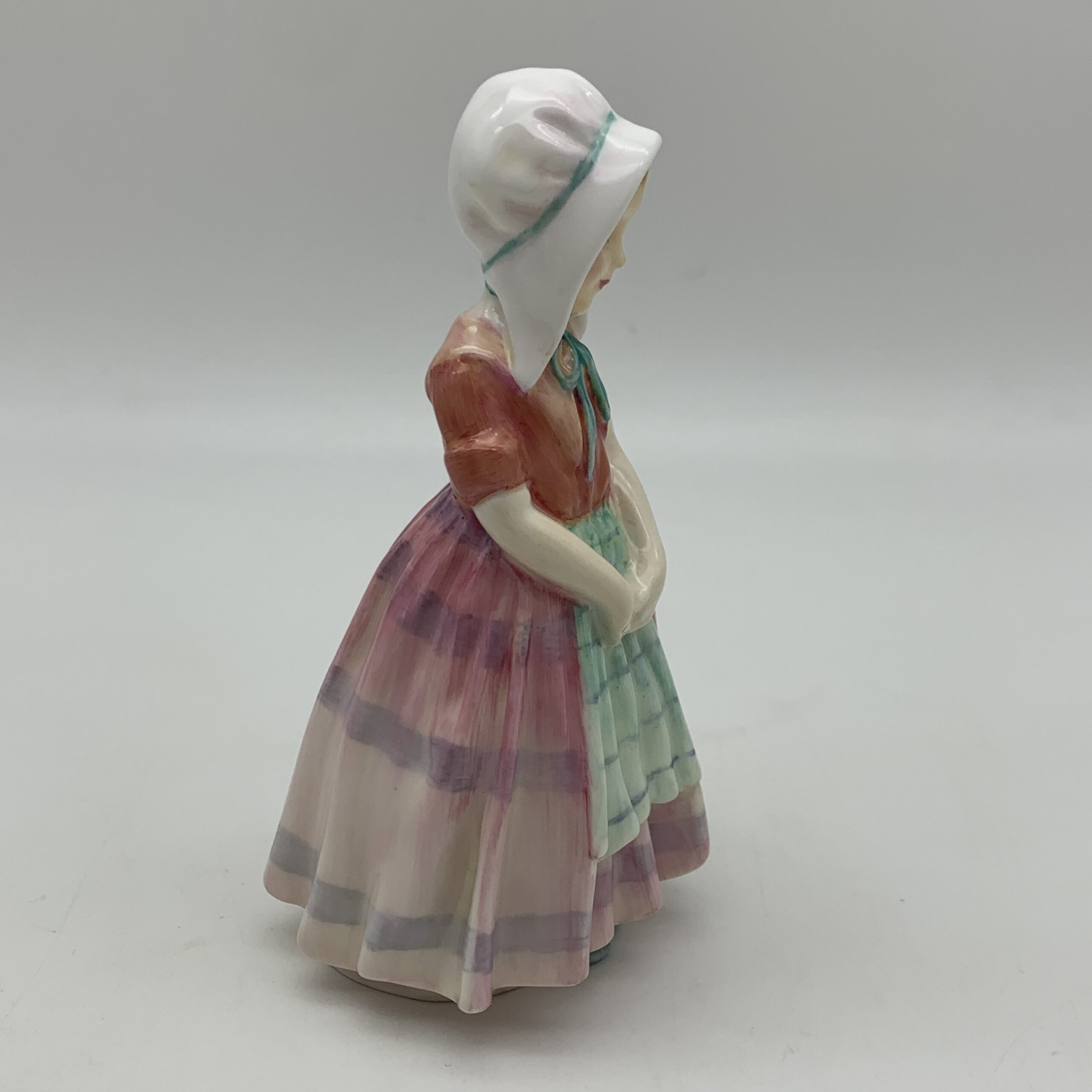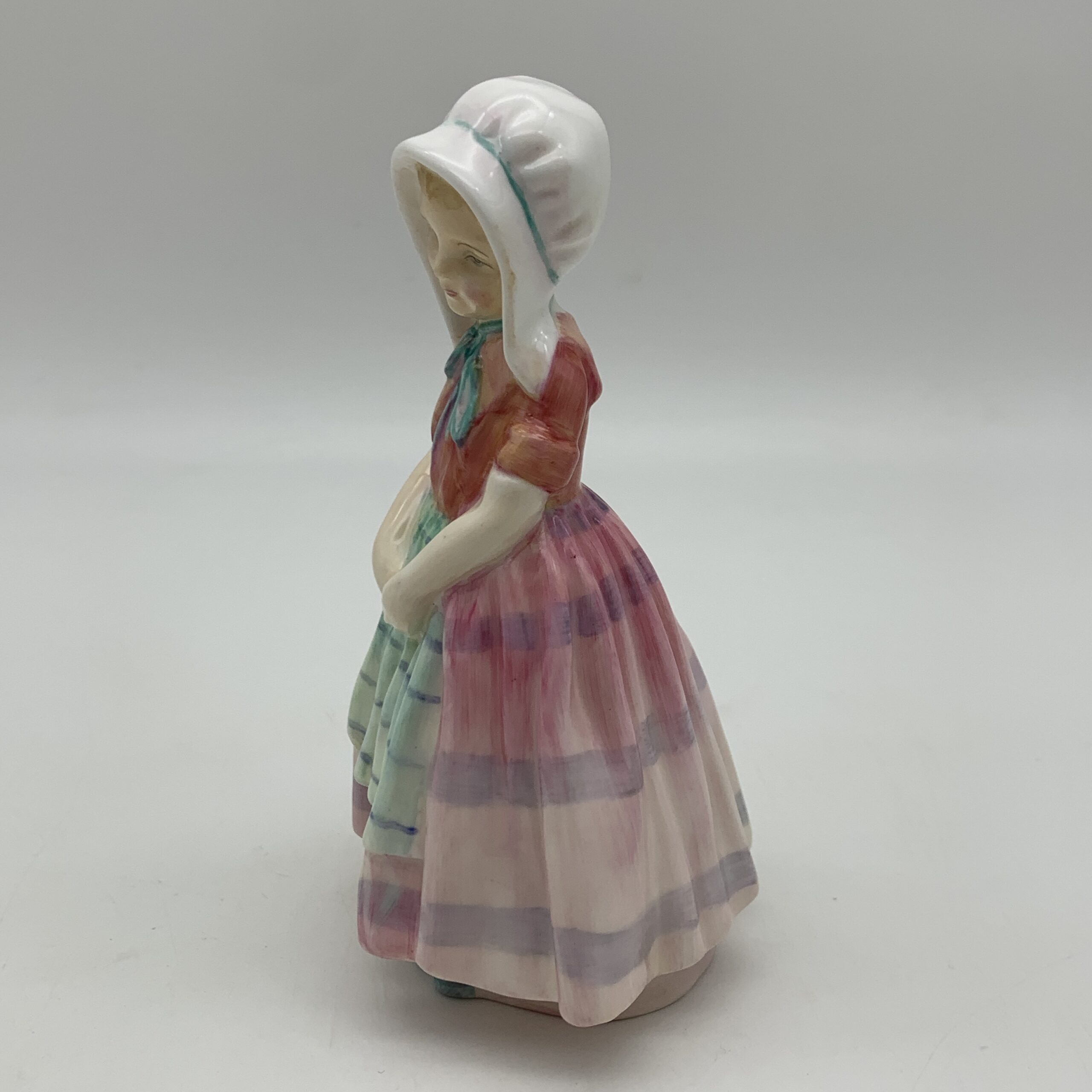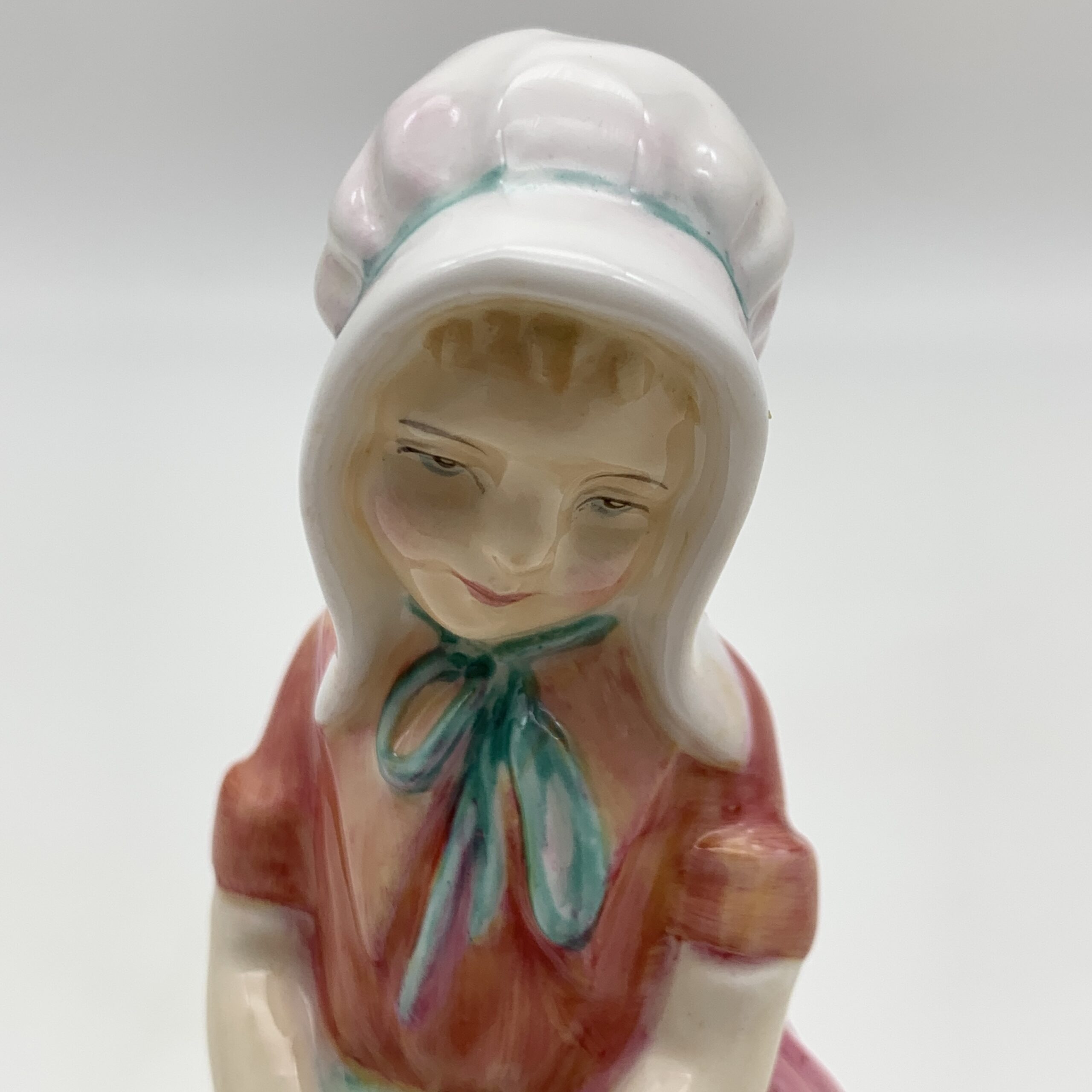 This charming, hand painted, Royal Doulton porcelain figurine of a young girl in a pink dress, wearing a white bonnet and a pale blue apron, is titled ‘Tootles’ (HN1680). She was designed by ‘Leslie Harradine’ and due to its popularity, was produced for forty years, between 1935 and 1975. This lovely figurine is in excellent condition and carries the ‘Royal Doulton’ backstamp on the base. She stands 11,5cm high and measures 6,5cm at her widest.