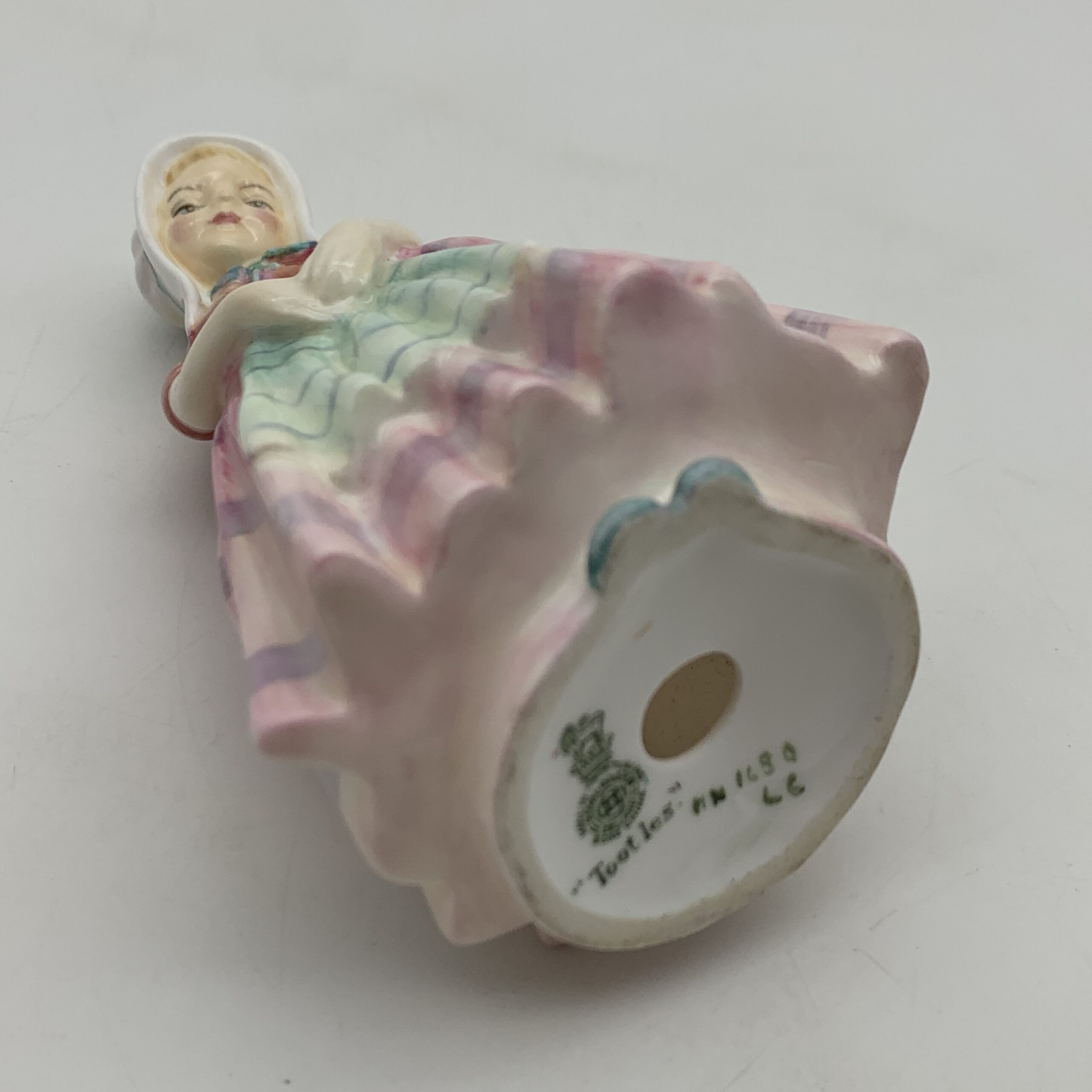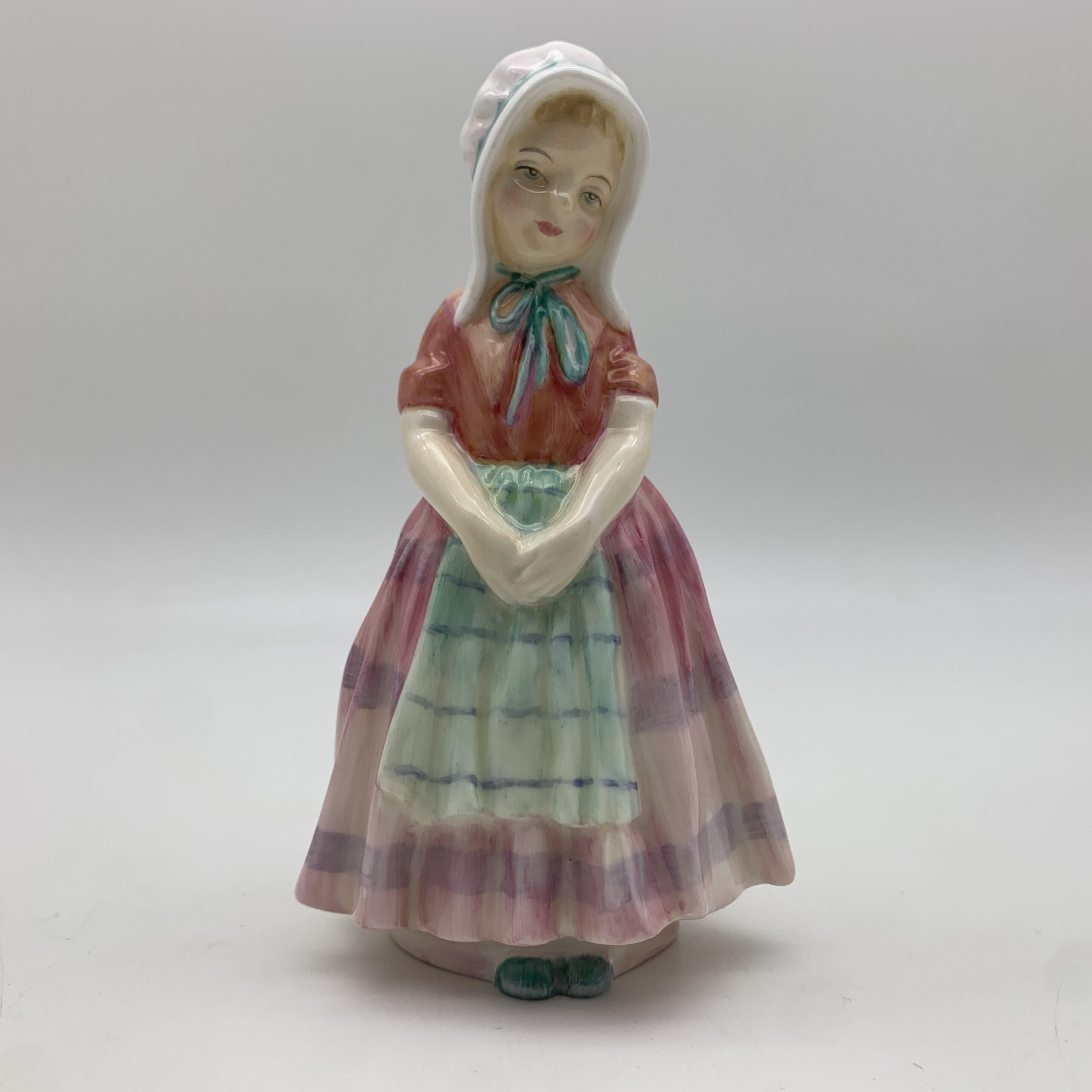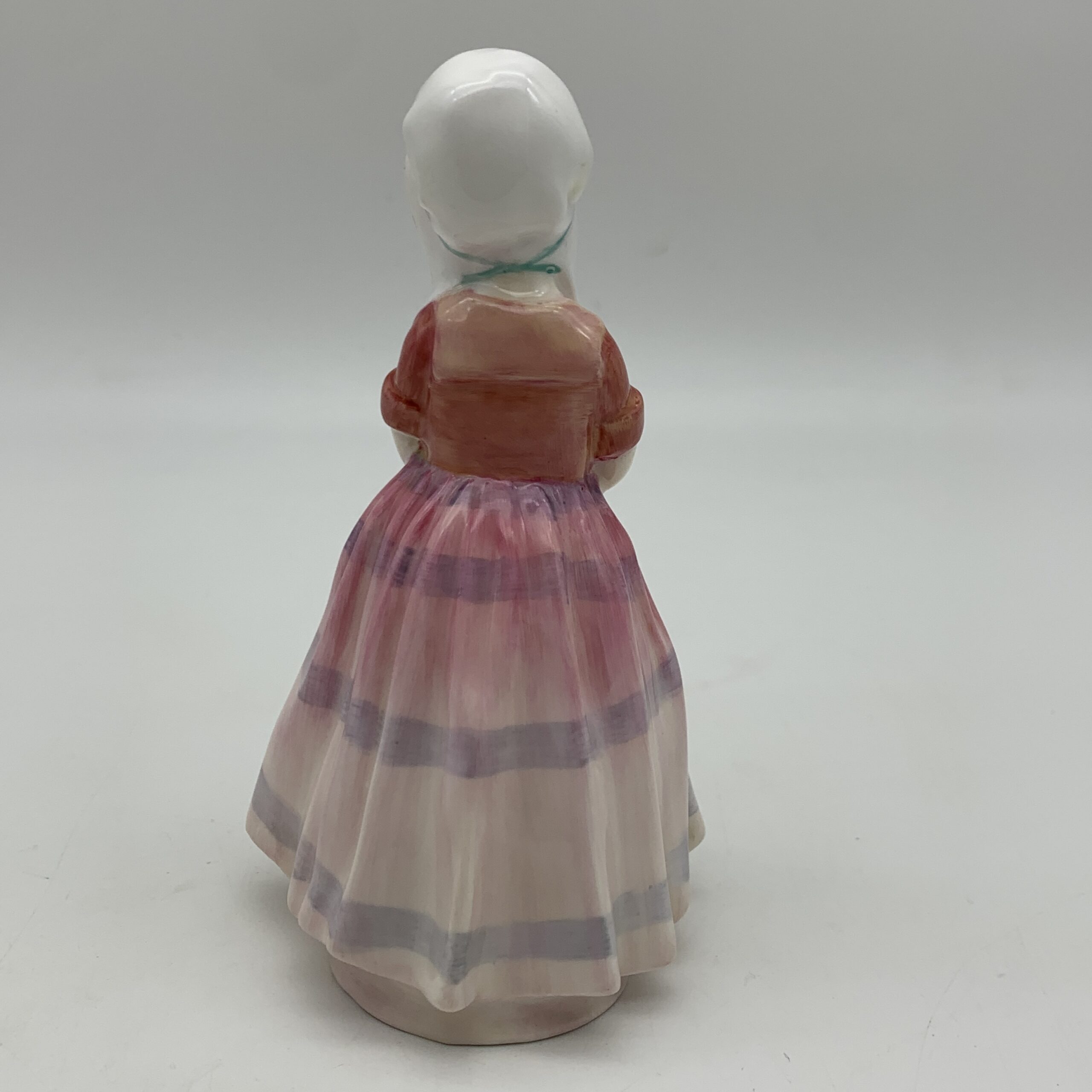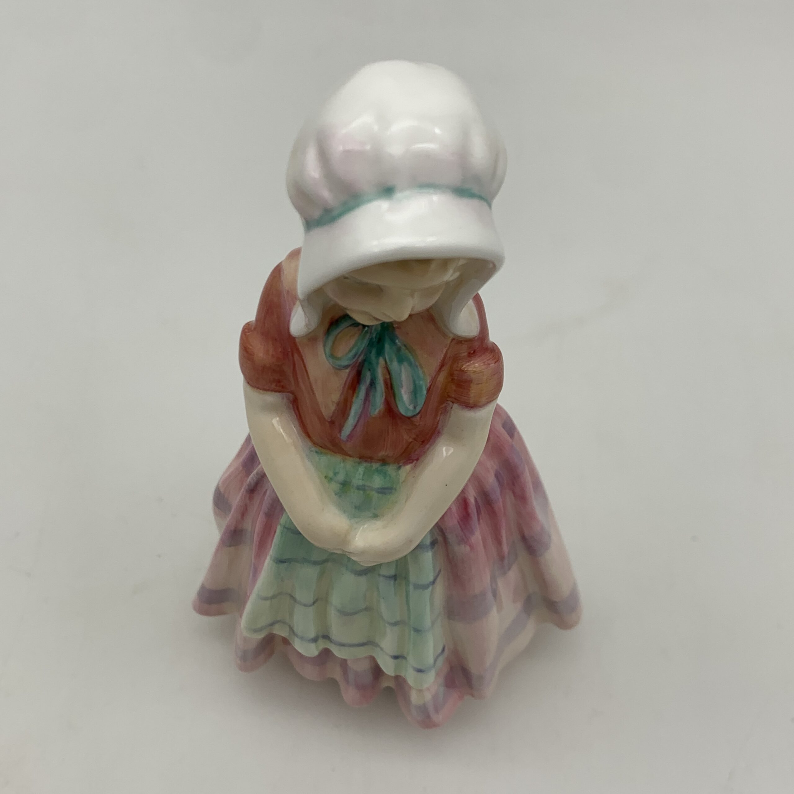 This charming, hand painted, Royal Doulton porcelain figurine of a young girl in a pink dress, wearing a white bonnet and a pale blue apron, is titled ‘Tootles’ (HN1680). She was designed by ‘Leslie Harradine’ and due to its popularity, was produced for forty years, between 1935 and 1975. This lovely figurine is in excellent condition and carries the ‘Royal Doulton’ backstamp on the base. She stands 11,5cm high and measures 6,5cm at her widest.