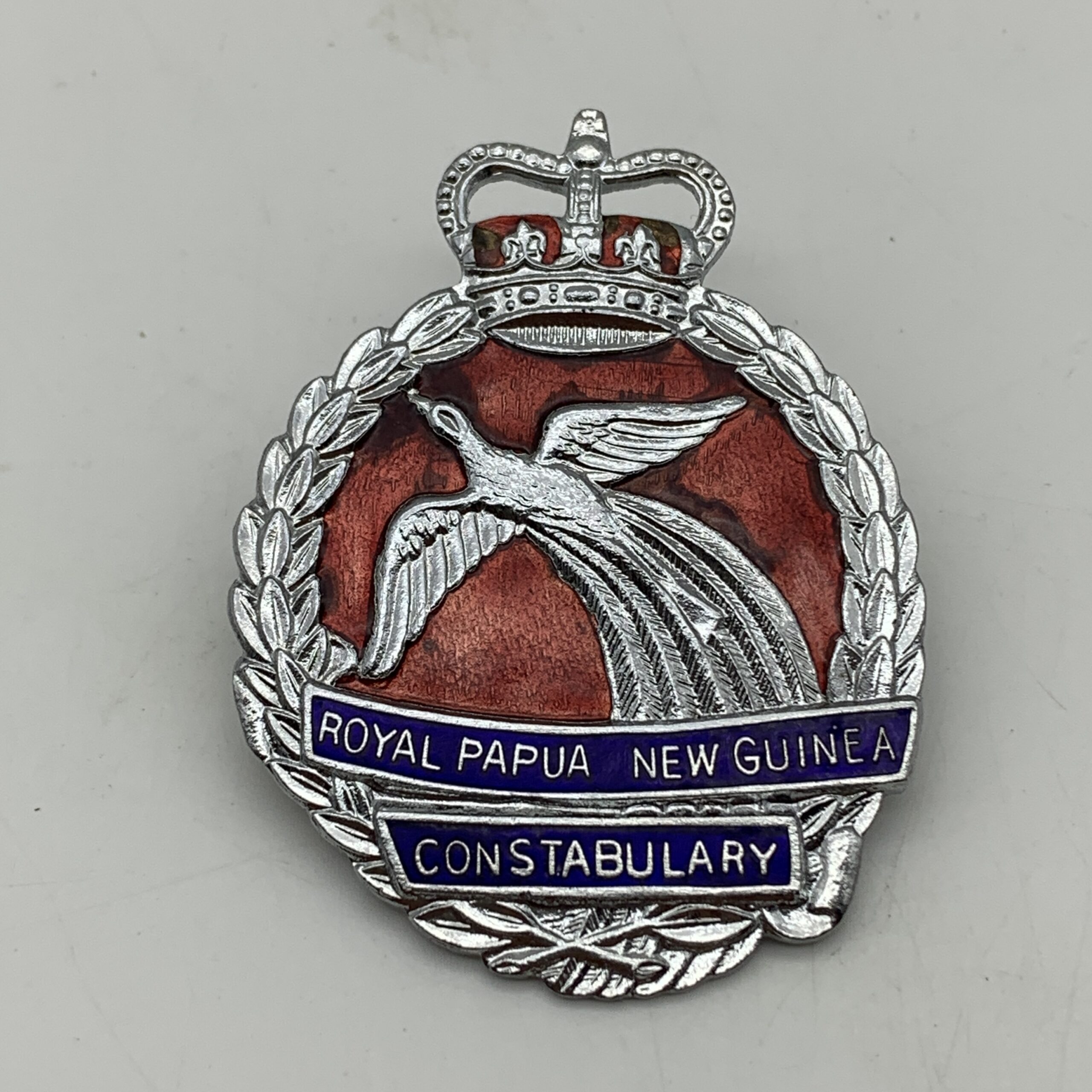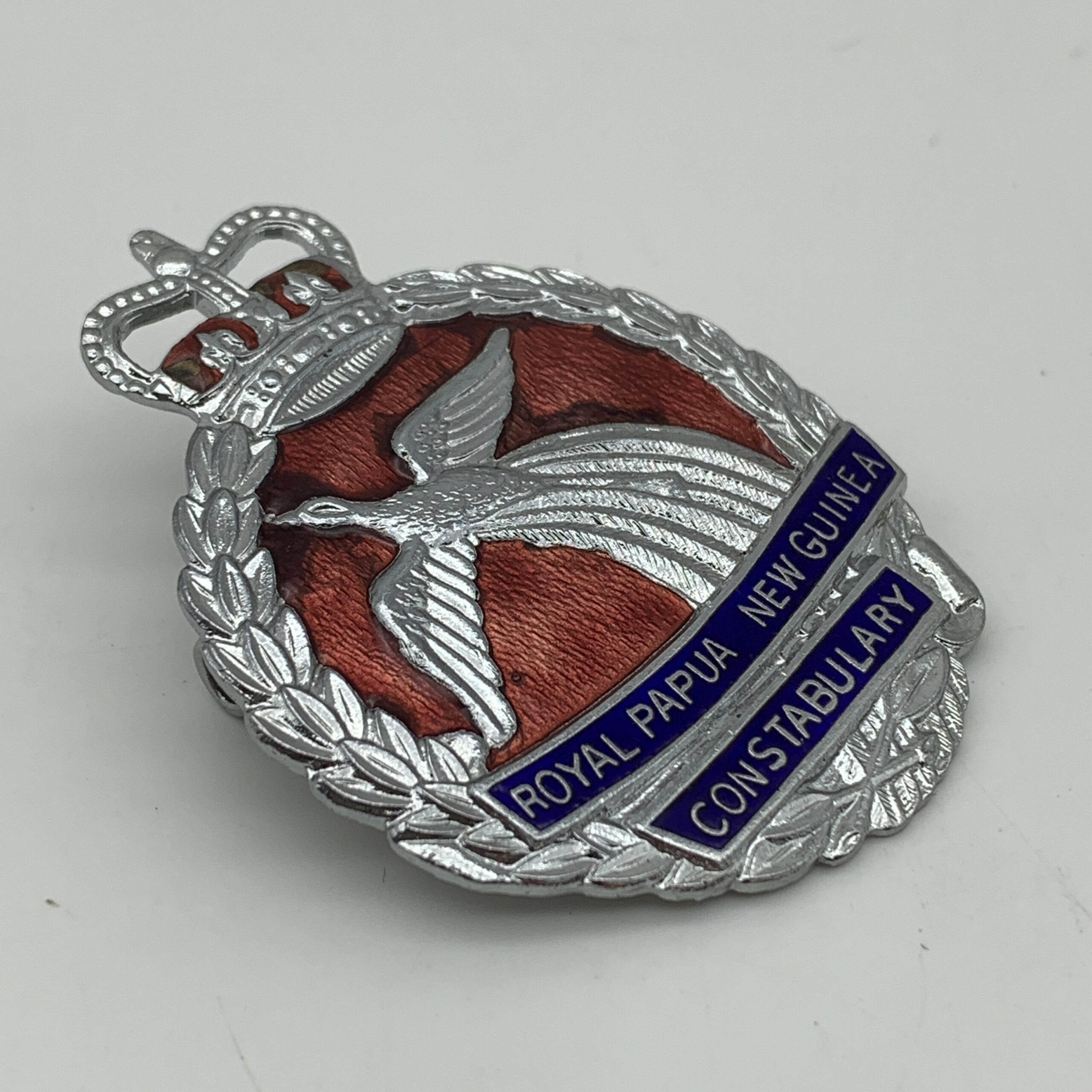 This good quality, original white metal and enamel cap badge of the ‘Royal Papua New Guinea Constabulary’ is in excellent condition with both lugs intact and measures 52mm x 40mm.