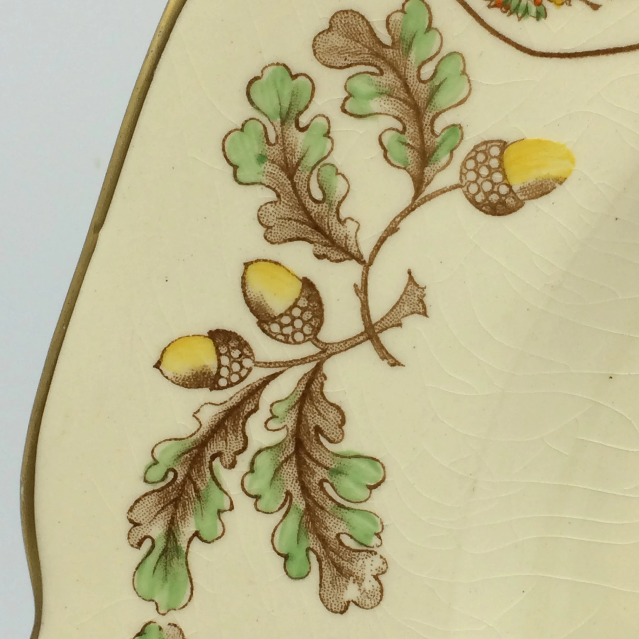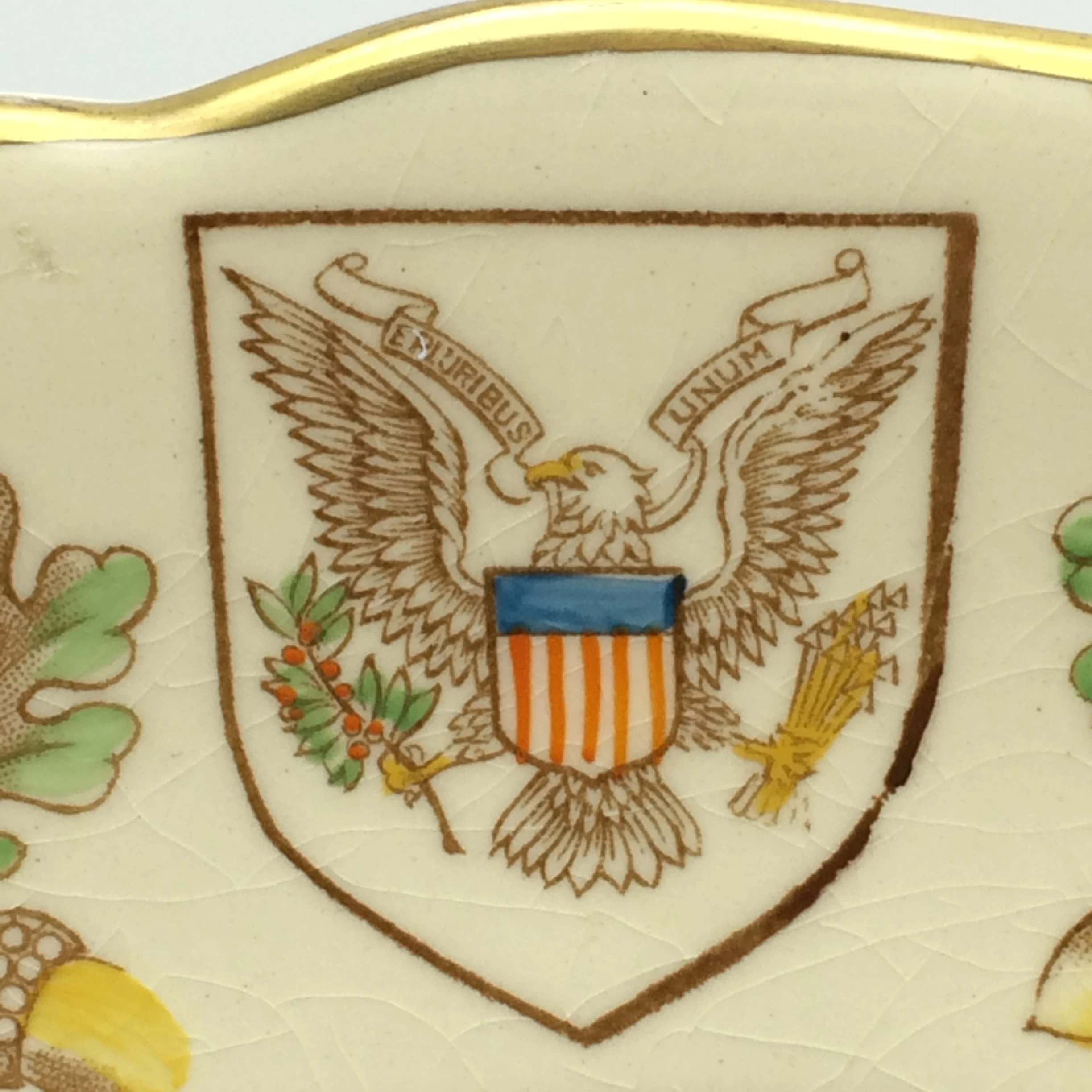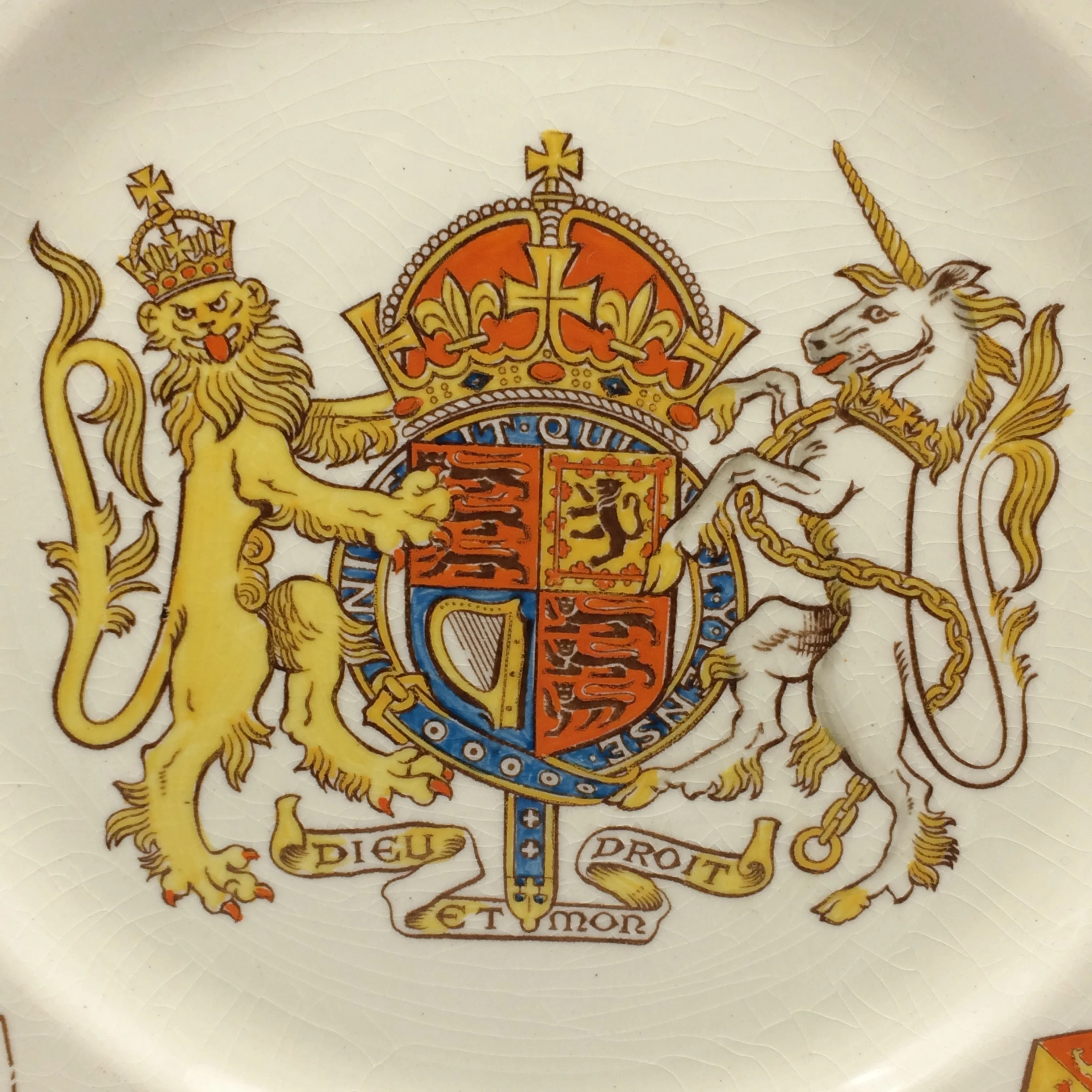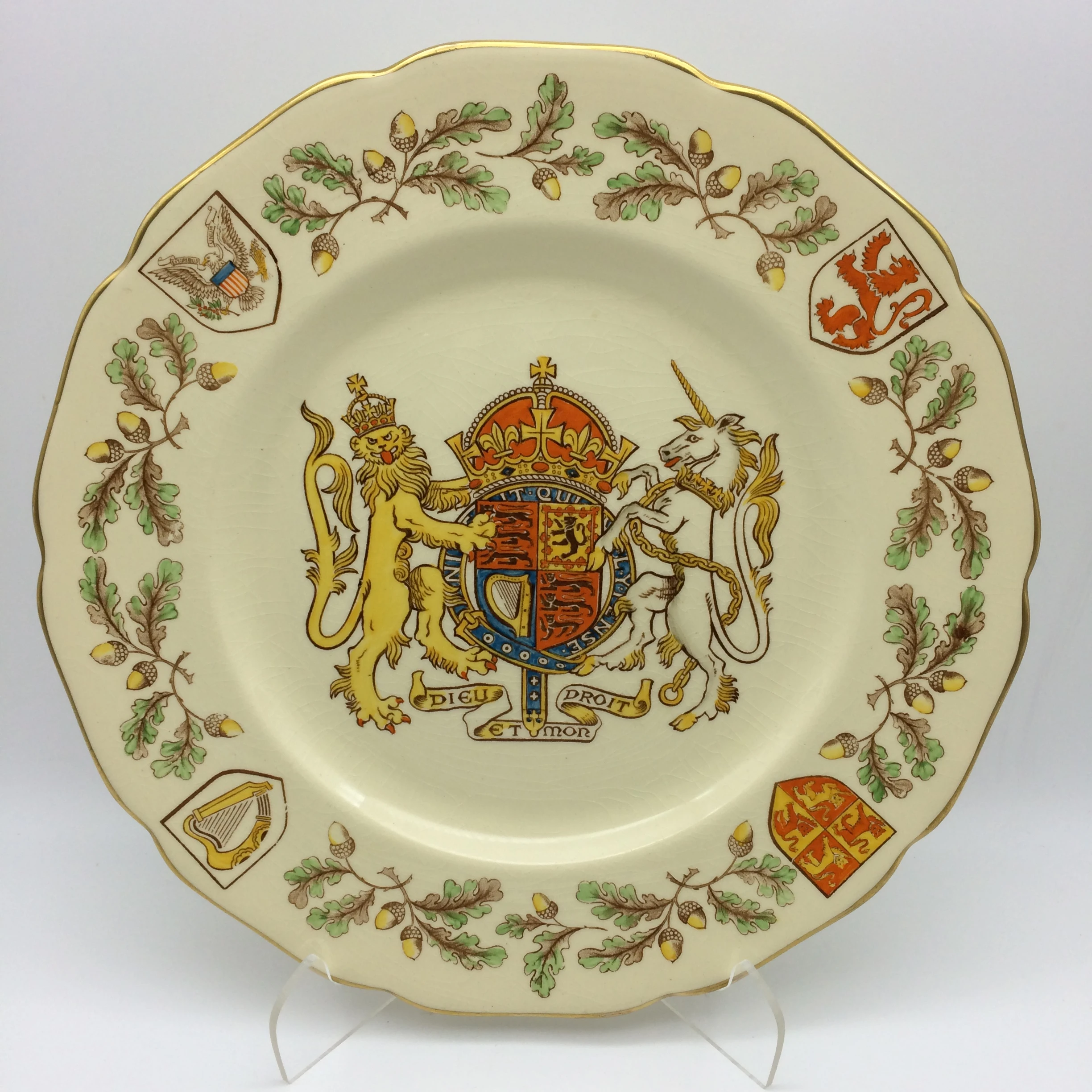 This fairly large china plate was produced to celebrate the royal visit to the United States of America in 1939, by their ‘Majesties King George VI & Queen Elizabeth’. This is the first time in thirty years of trading that I’ve come across a royal plate celebrating a USA visit. Made in ‘Stoke-on–Trent, England by ‘Grays Pottery’, it has a colourful royal coat of arms in the centre with a lovely acorn and leaves border with a gilt edge. The plate is in good condition and has a diameter of 27,3cm.