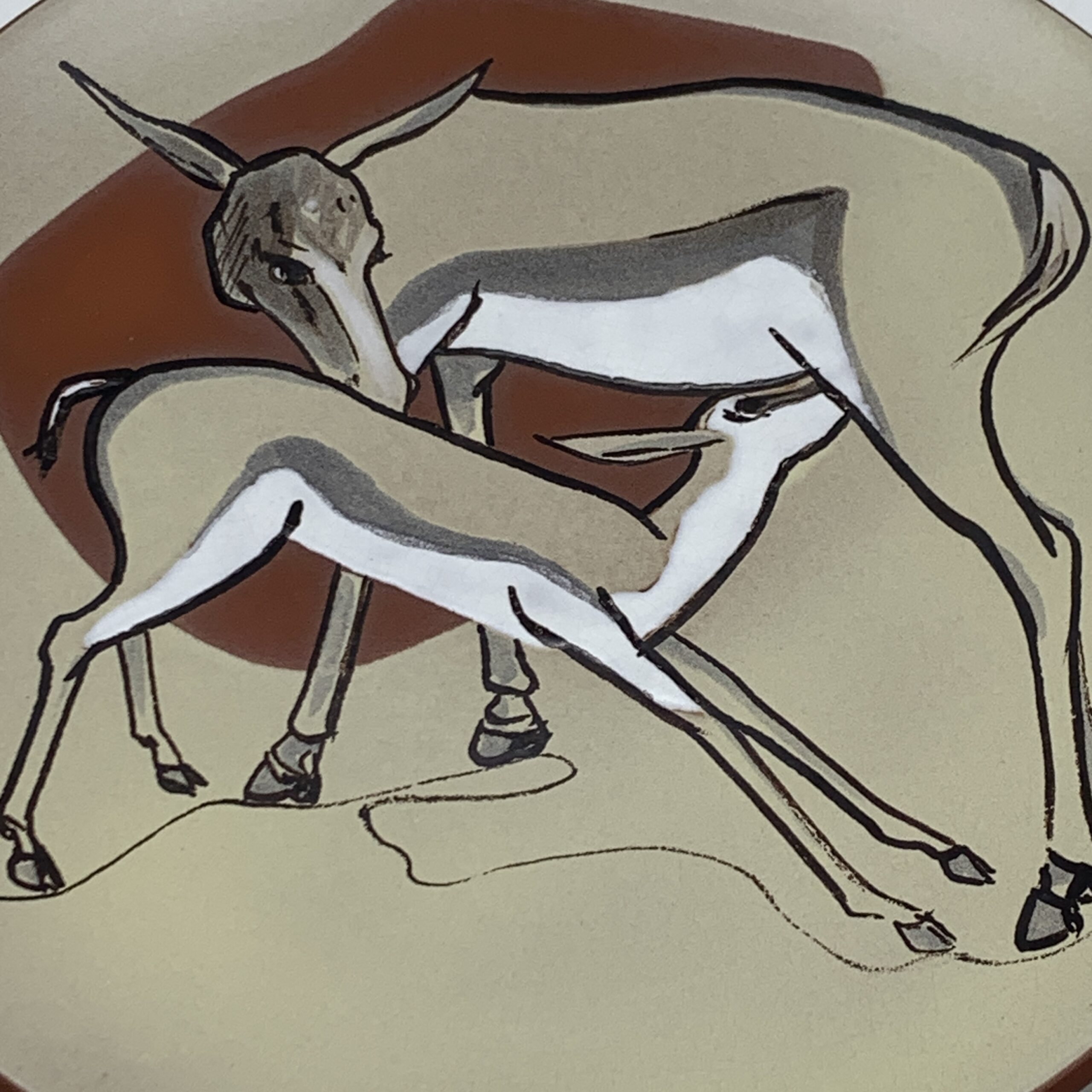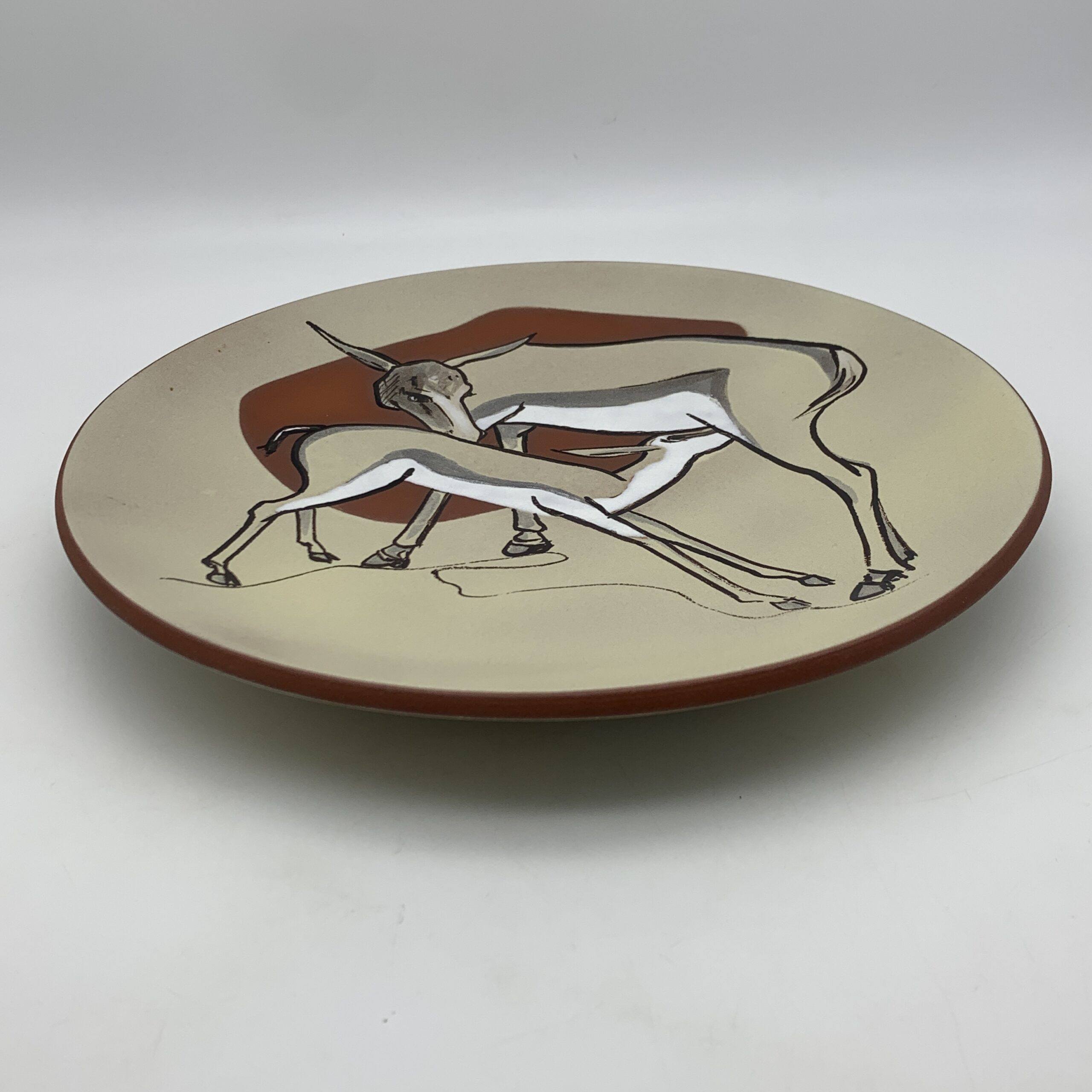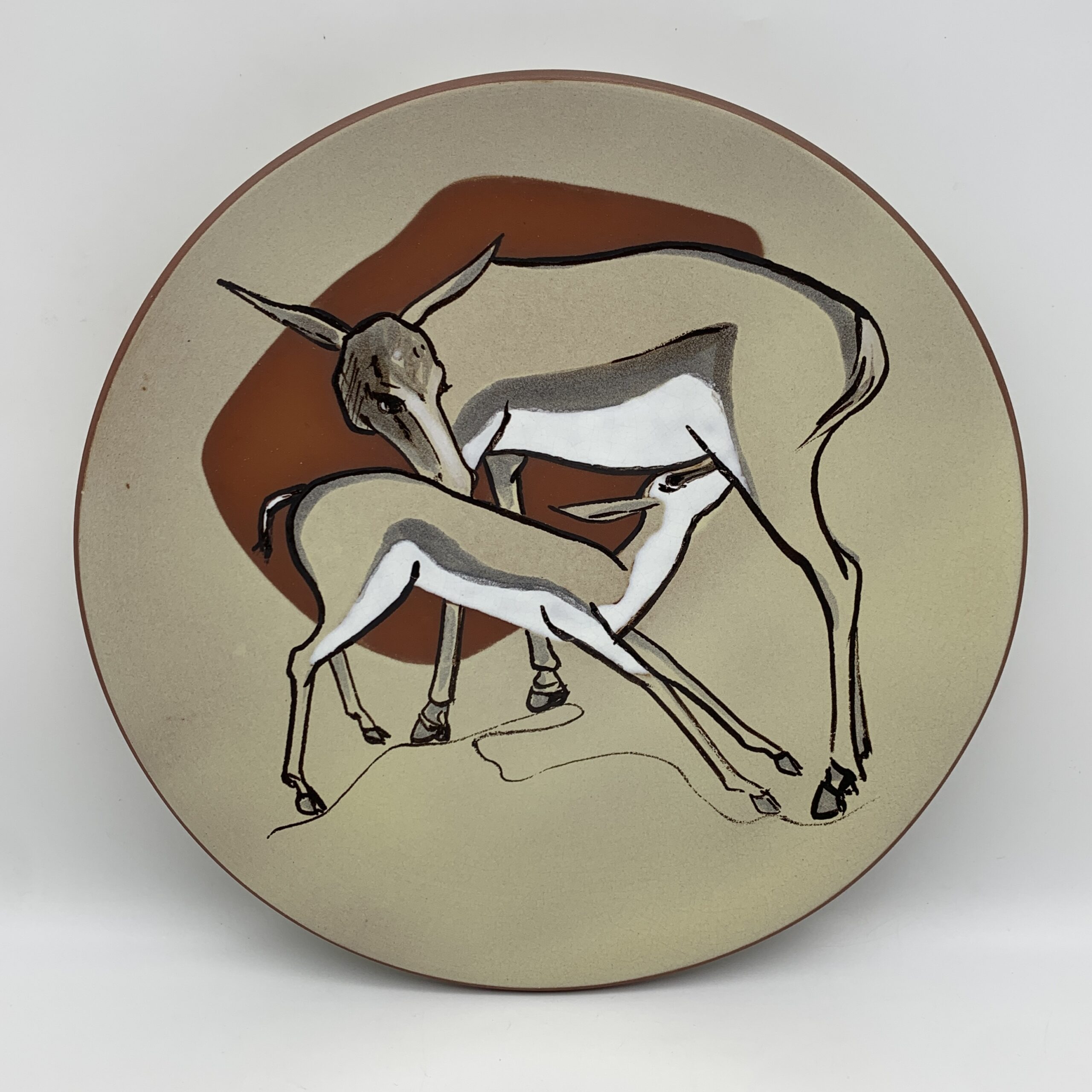 This scarce, South African pottery, round wall plate was made by the very sort after ‘Kalahari’ Studio potteries in Cape Town around the 1950’s and depicts a lovely, hand painted scene of a springbok with her suckling calf. The plate is decorated in matt brown and grey colours against a kaki background with white enamel highlights and is signed ‘KALAHARI’ on the back. This wonderful plate is in excellent condition and measures 26cm in diameter.