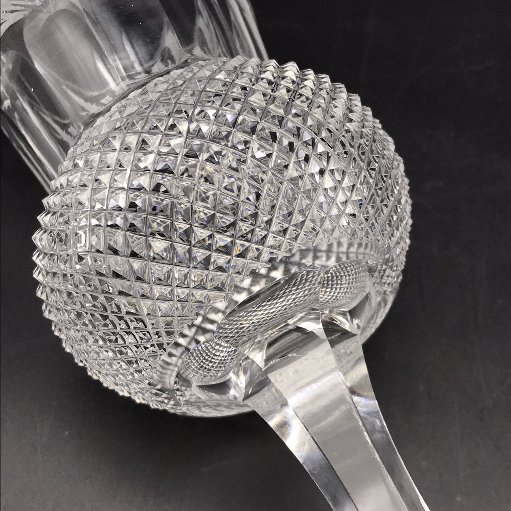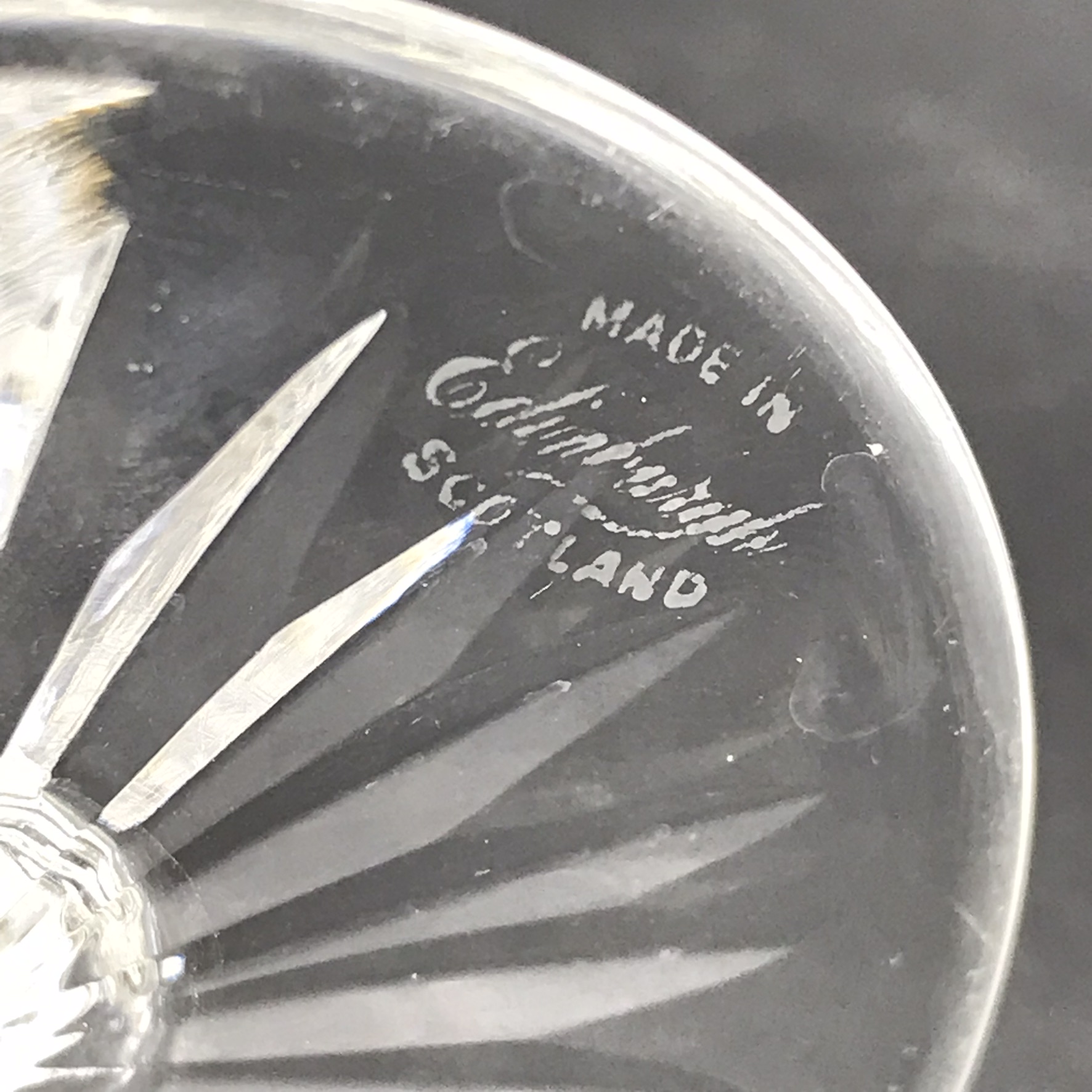 This amazing, early pair of large, Scottish cut-crystal wine glasses have a wonderful thistle shape and are beautifully hand-cut and etched. The thistle shaped bowls are decorated with a row of finely detailed, hand engraved and etched thistles along the top, with a band of cut panels below, then a multi diamond-cut pattern below that. The bowl sits on a six-sided stem which stands on a round star-cut base, with an acid etched stamp underneath ‘MADE IN SCOTLAND’ and signed ‘Edinburgh’. These glasses are now seldom seen and fetch very high prices when they come on the market. They’re in excellent condition and stand 16cm high, have a top diameter of 7,3cm and together weigh 587g.