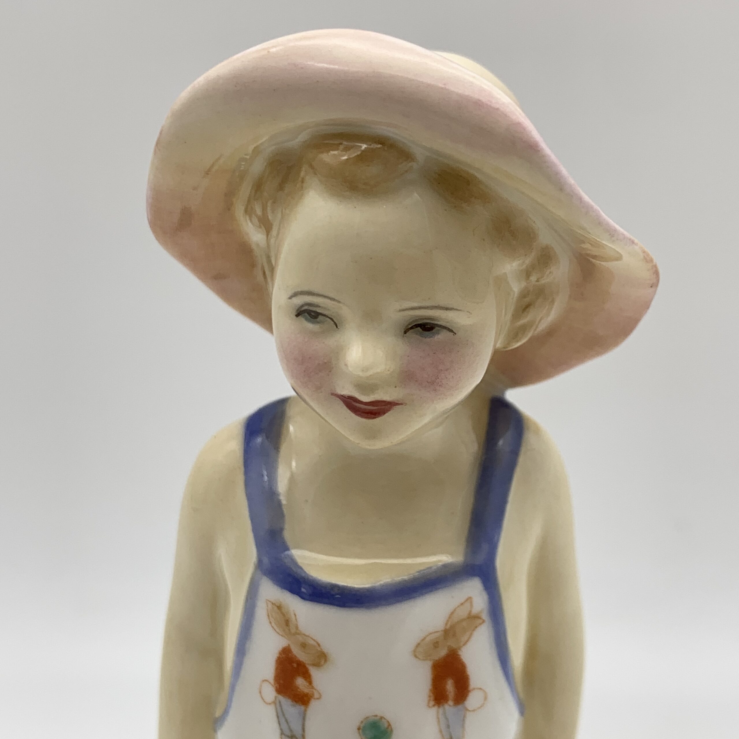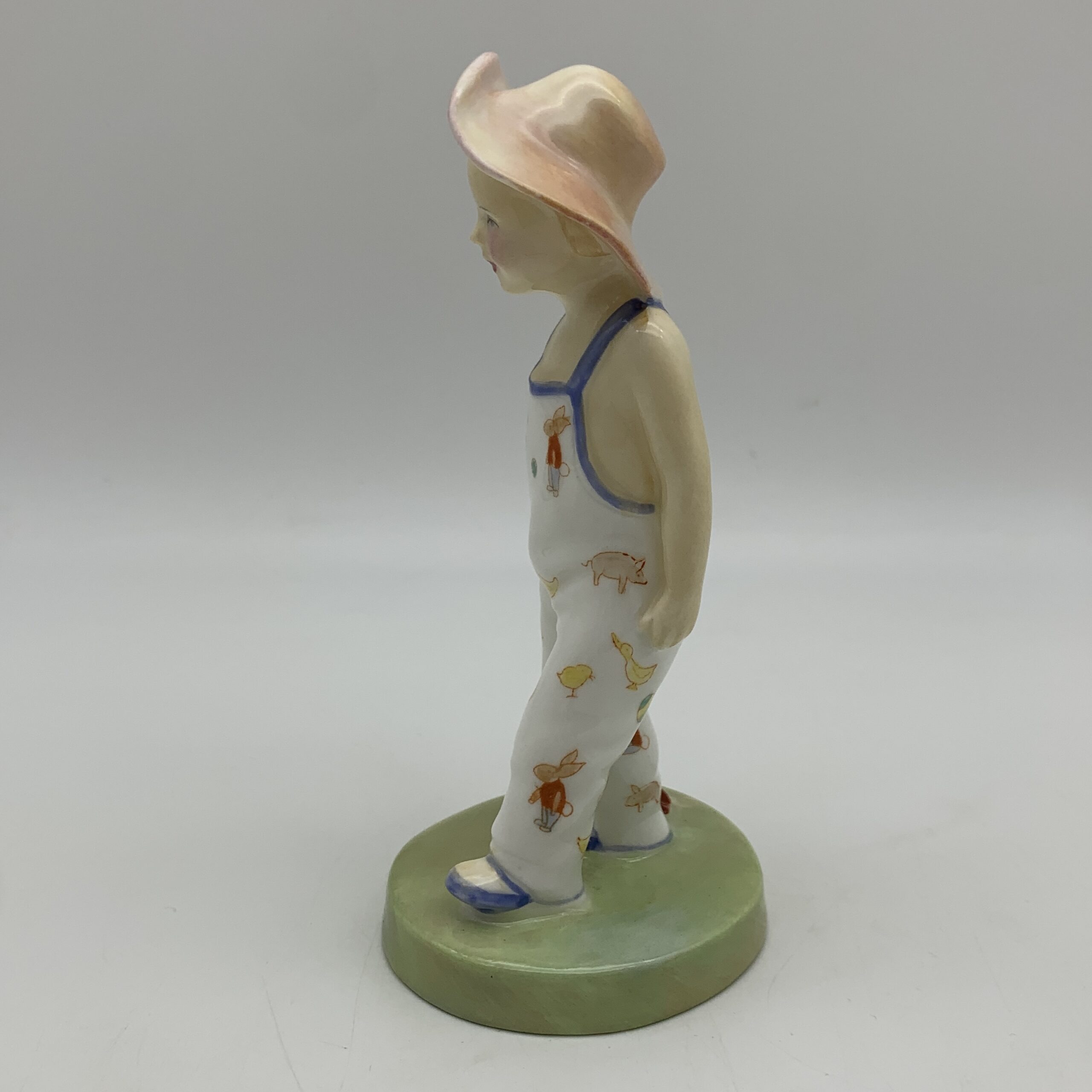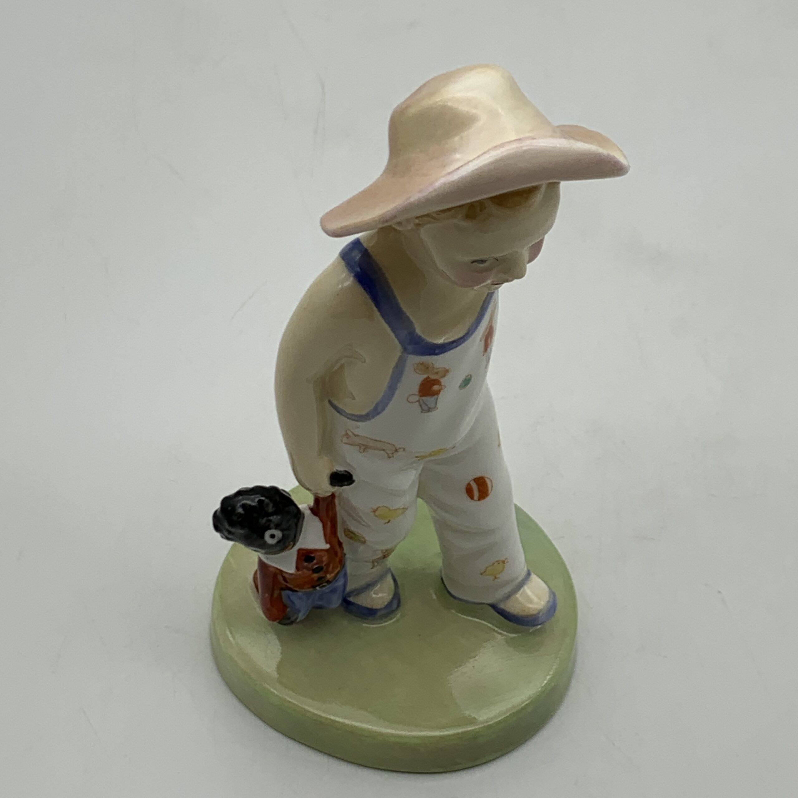 This scarce, very early, hand painted Royal Doulton porcelain figurine from the ‘Child Classics’ series, is of a young boy wearing patterned white dungarees, a pink hat and walking with his doll in hand. There were two colourways in this scarce figure, both were designed by ‘Leslie Harradine’. This one titled ‘Golliwog’ (HN1979) was produced from 1945 to 1959, and the other colourway (blue dungarees with green hat) was produced between 1949 to 1955. This lovely figurine is in excellent condition and carries the ‘Royal Doulton’ backstamp on the base. It stands 13,5cm high and measures 7cm at its widest.