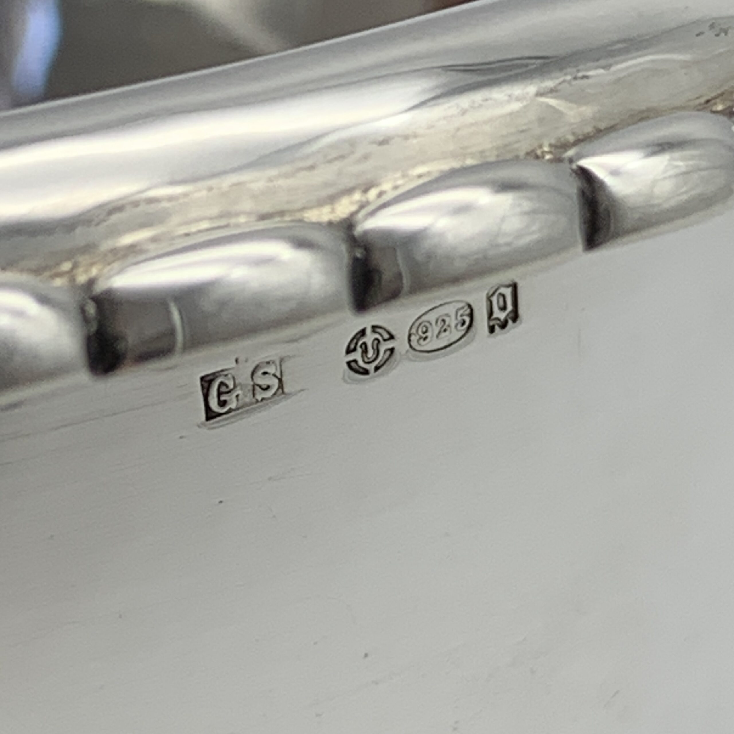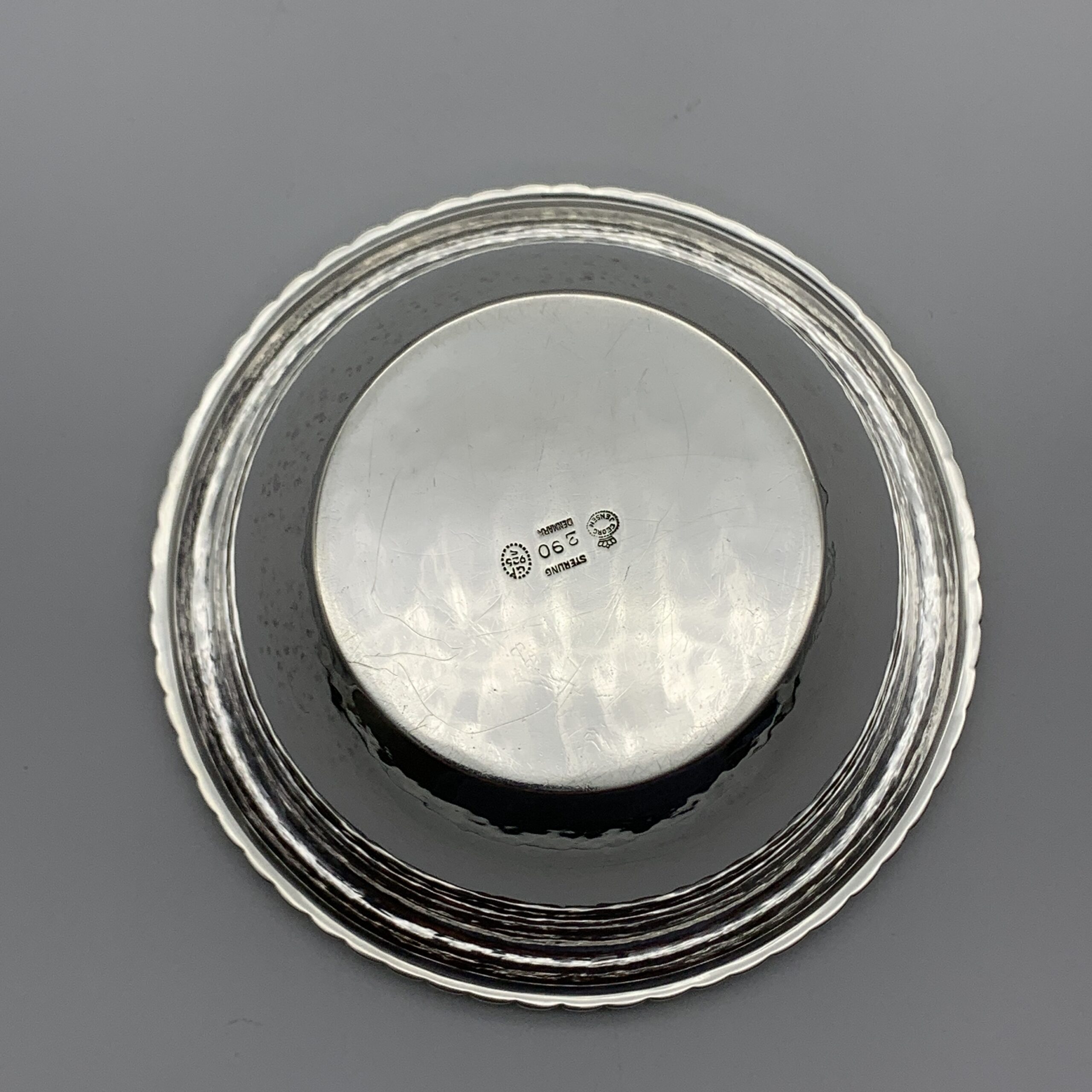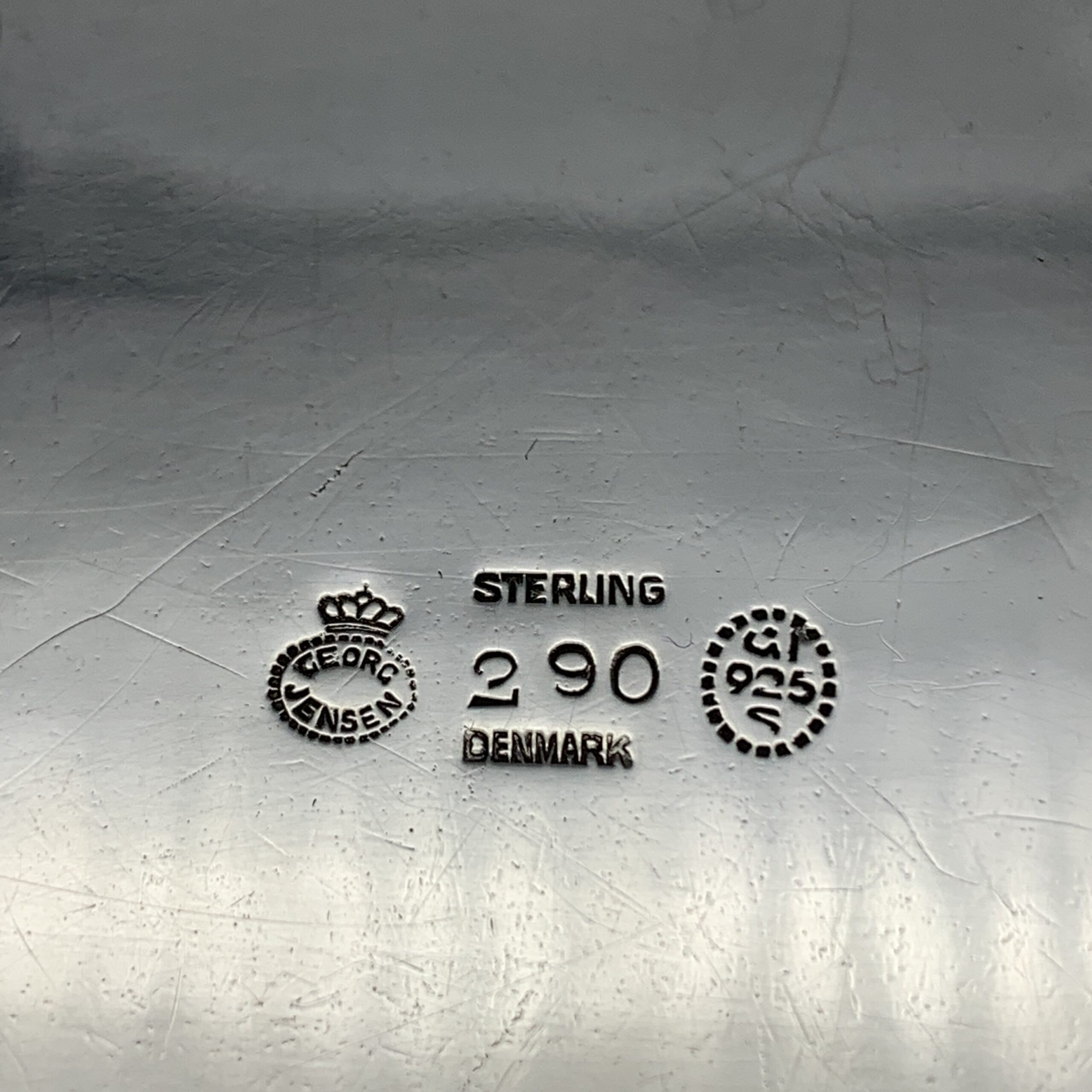 This scarce, fabulous, solid silver bowl or dish from the 1920’s, decorated in the popular ‘Rope/Perle’ pattern, was made and designed by the well-known and sought after Danish silversmith ‘Georg Jensen’, in Copenhagen. It has a good weight and an attractive shape with a soft hand-hammered finish and a turned rounded rim with the ‘rope’ pattern trim. This fine quality piece is in superb condition and is clearly hallmarked on the base with the early crowned ‘Georg Jensen’ stamp (used between 1925 and 1932) along with ‘STERLING DENMARK’, the design number ‘290’ and a circled ‘GI 925 S’ stamp. There are also small English import marks on the side for London 1929, along with a ‘GS’ stamp for the importers ‘George Stockwell & Co’. The bowl stands 5cm high with a top diameter of 12cm and weighs 144,3g.