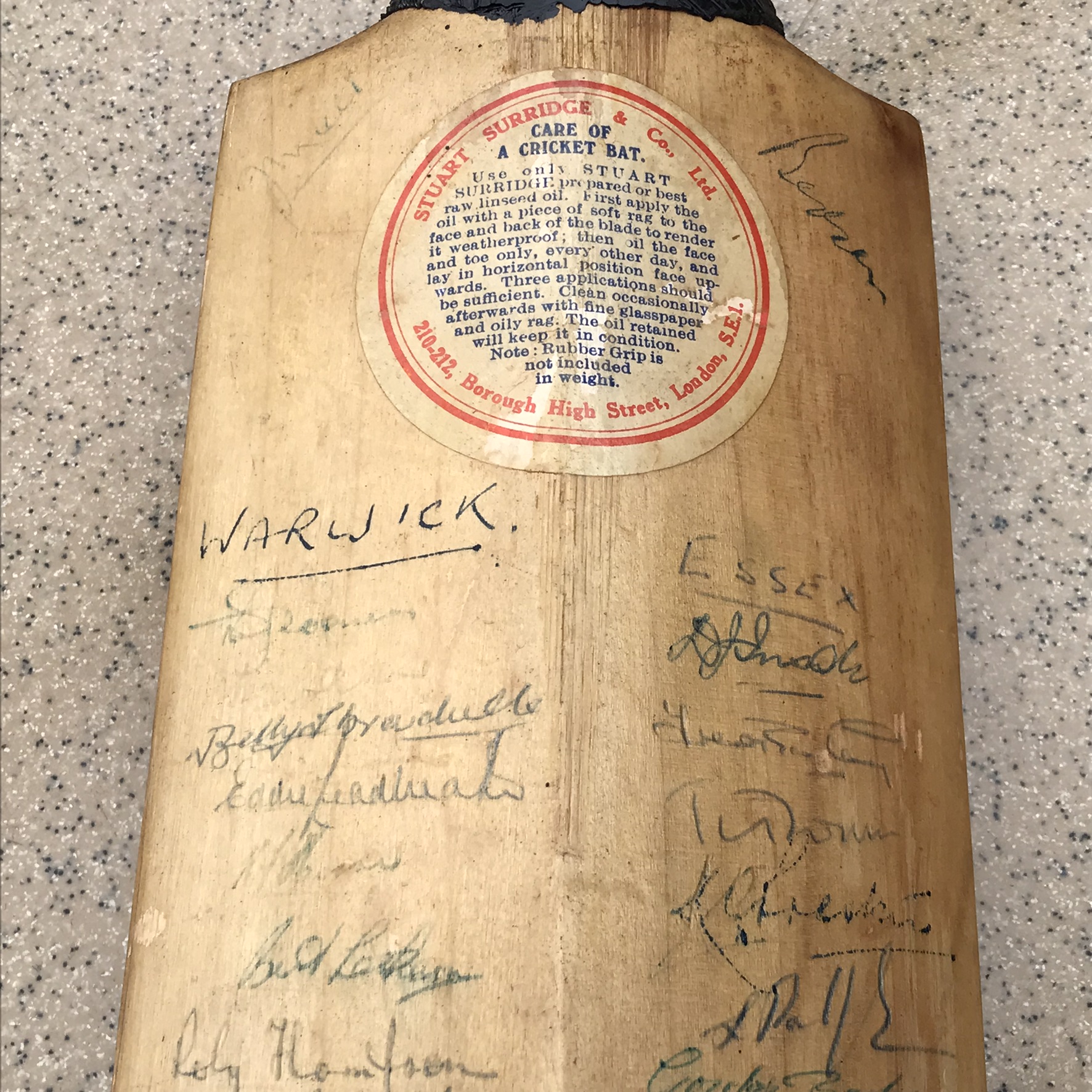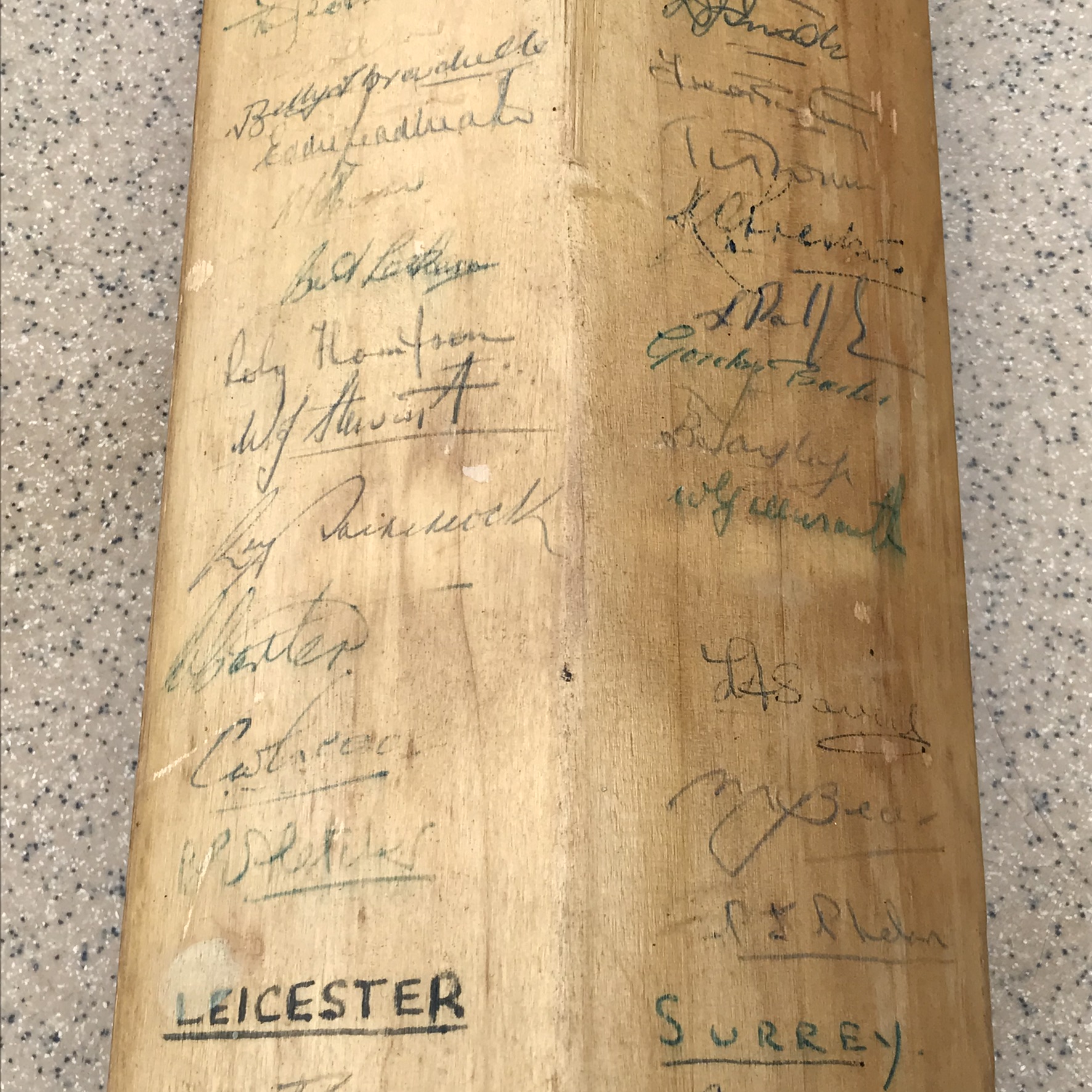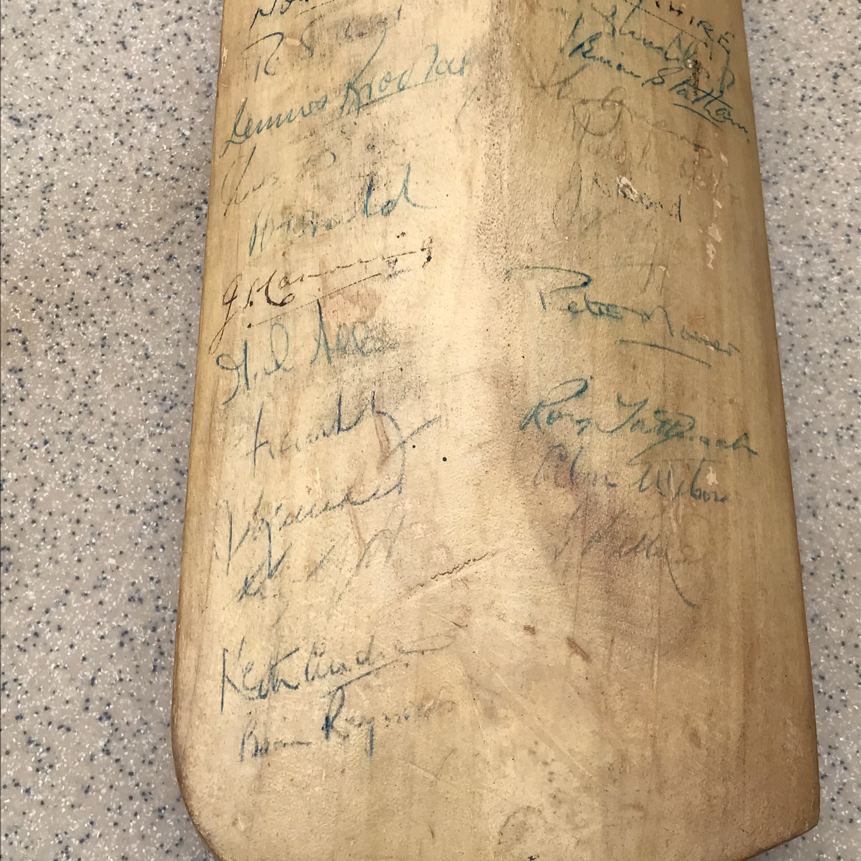 This scarce, fully autographed, circa 1958 ‘Stuart Surridge’ (The Royal County Driver) full sized cricket bat, I believe from looking at the names, is from the ‘1958 New Zealand Cricket tour to England’. It has been personally signed by all the players, on the front by both the New Zealand and England teams and on the back by several English County sides, Warwickshire, Essex, Leicestershire, Surrey, Northamptonshire, and Lancashire. Most of the signatures are still very clear and readable, but the bat grip appears to have hardened overtime and is covered with clear plastic, otherwise it’s in great condition. The bat measures 87,5cm x 10,5cm and weighs 1050g.