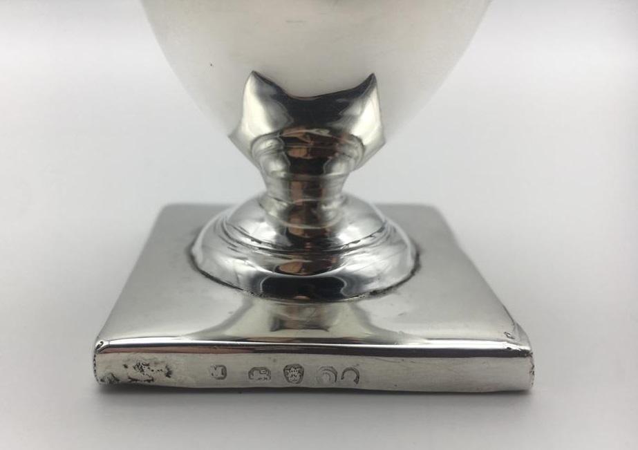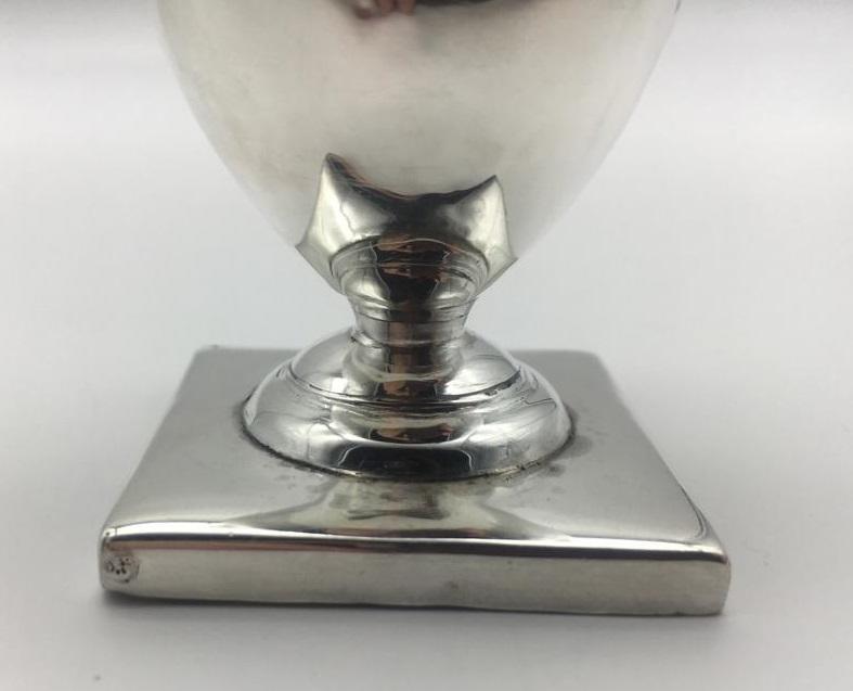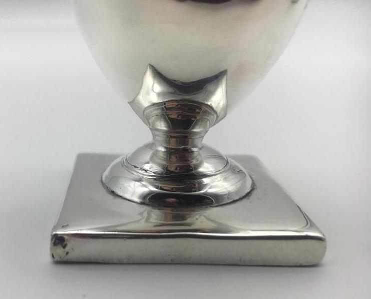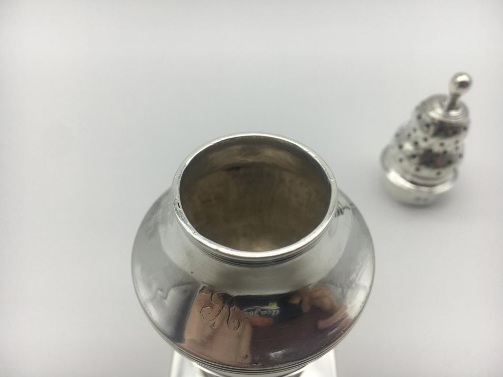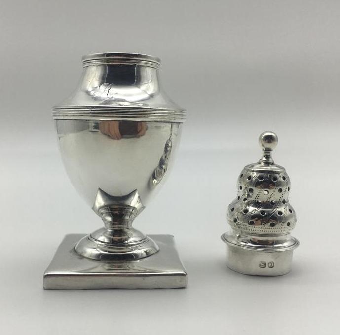 The decoratively pierced and chased pattern pull off top is partially hallmarked. The castor sits on a weighted square base where there is a full set of hallmarks. The hallmarks are slightly worn but readable. It is dated for London 1789. One letter of a makers mark is visible (‘M’).