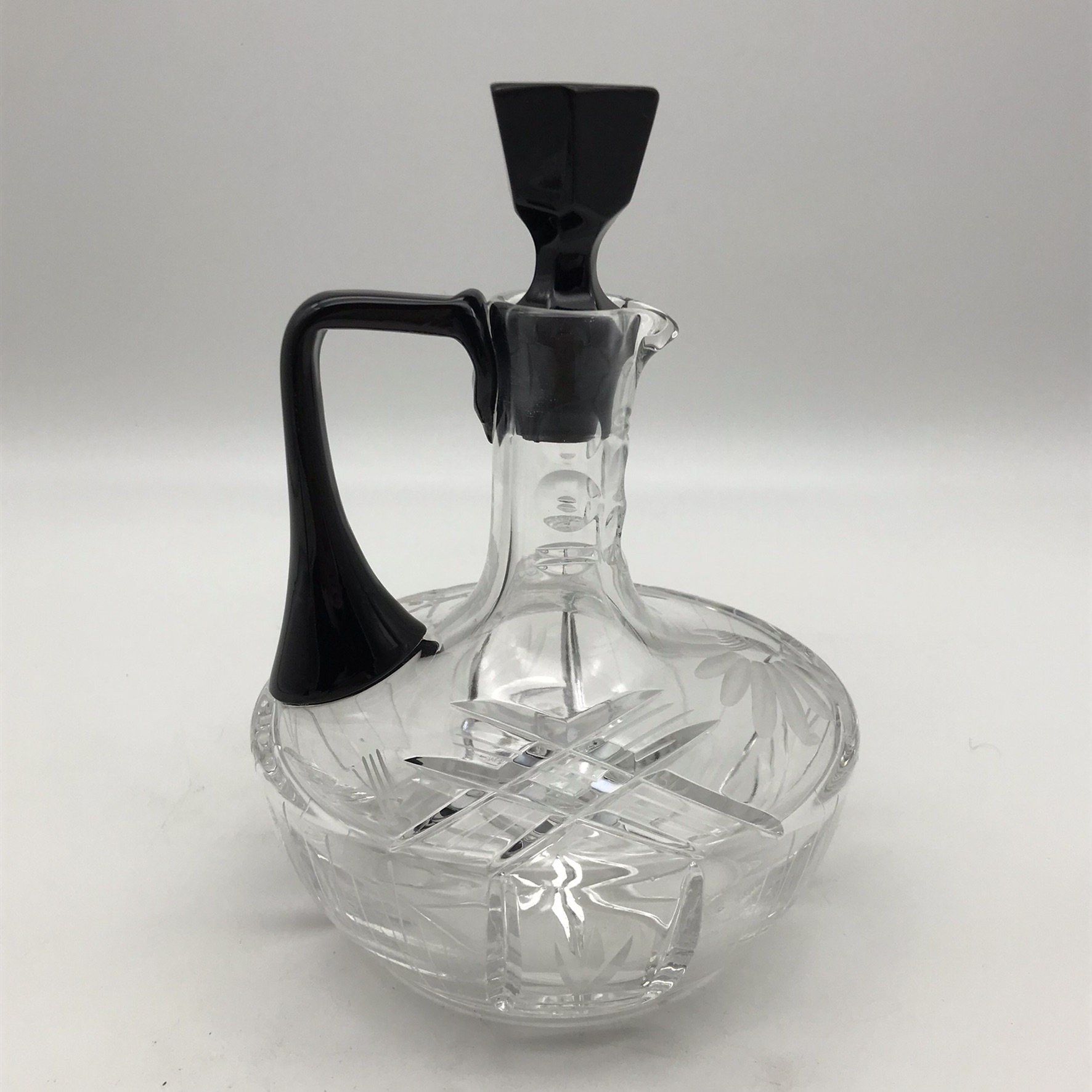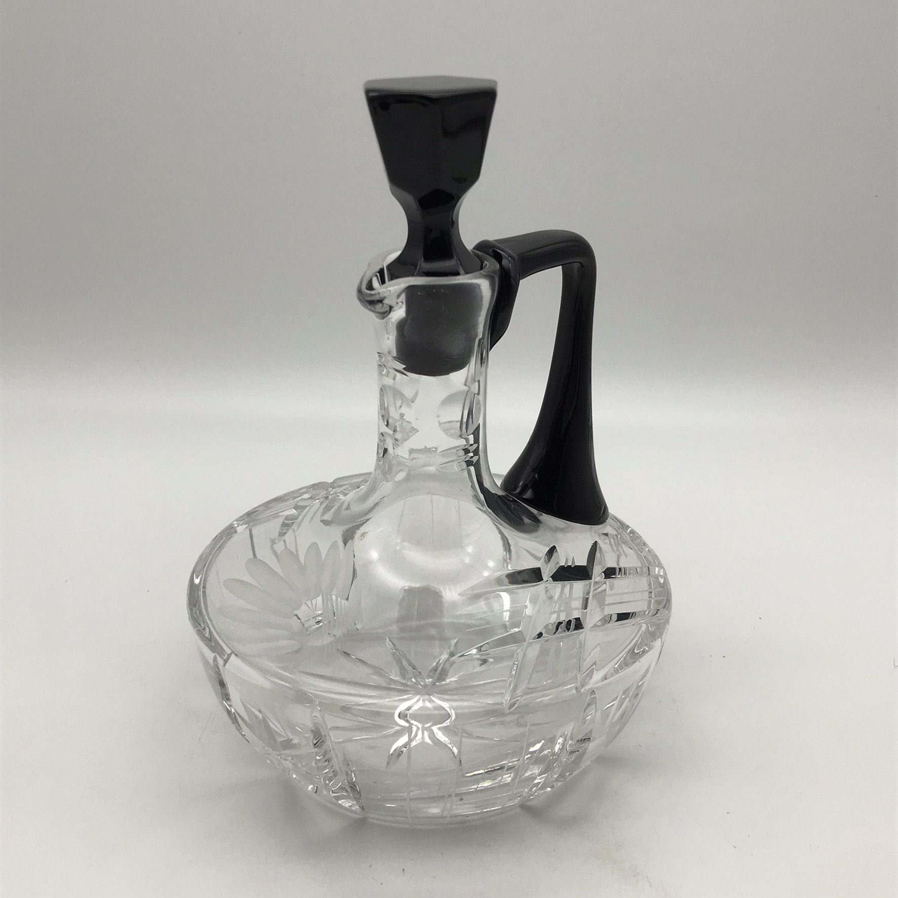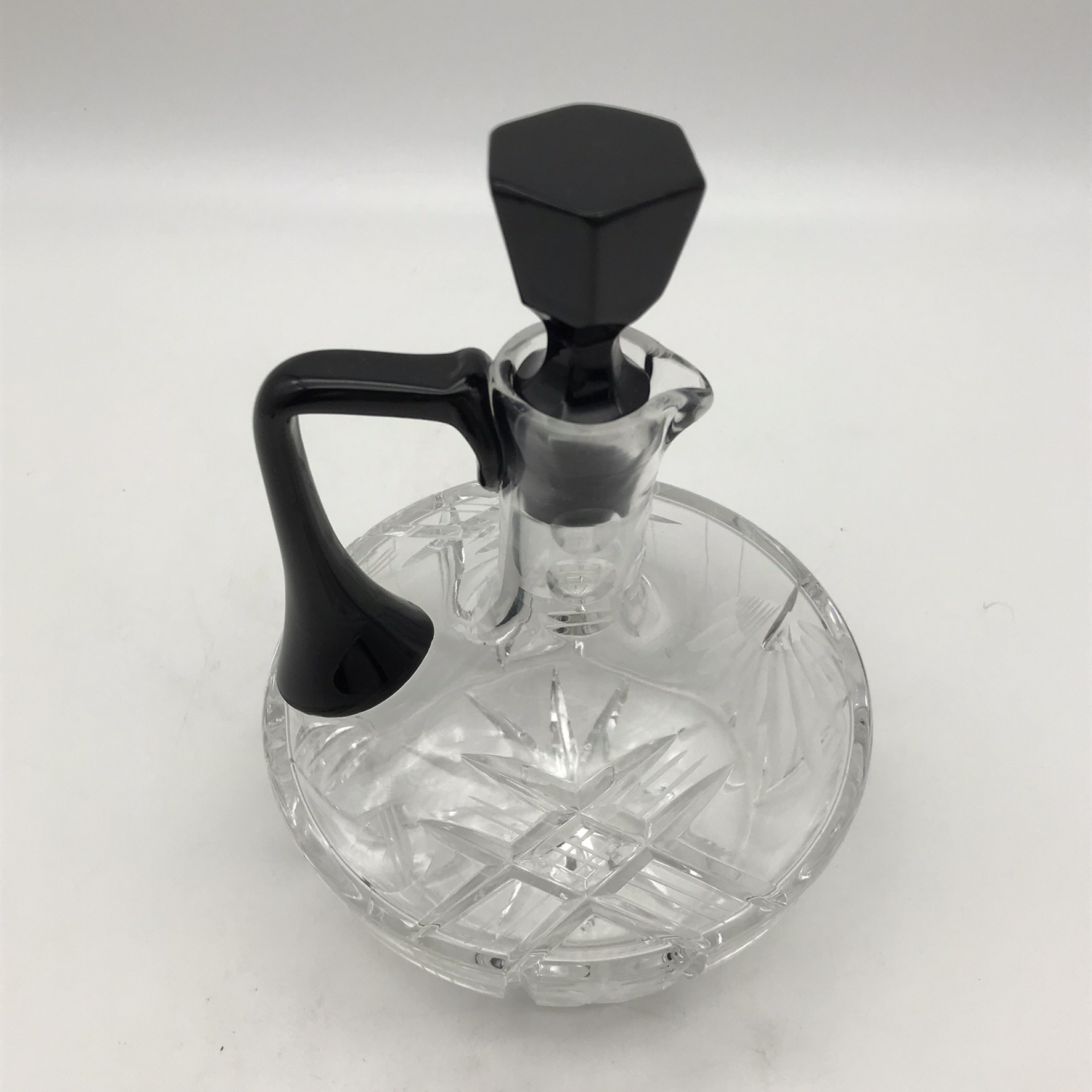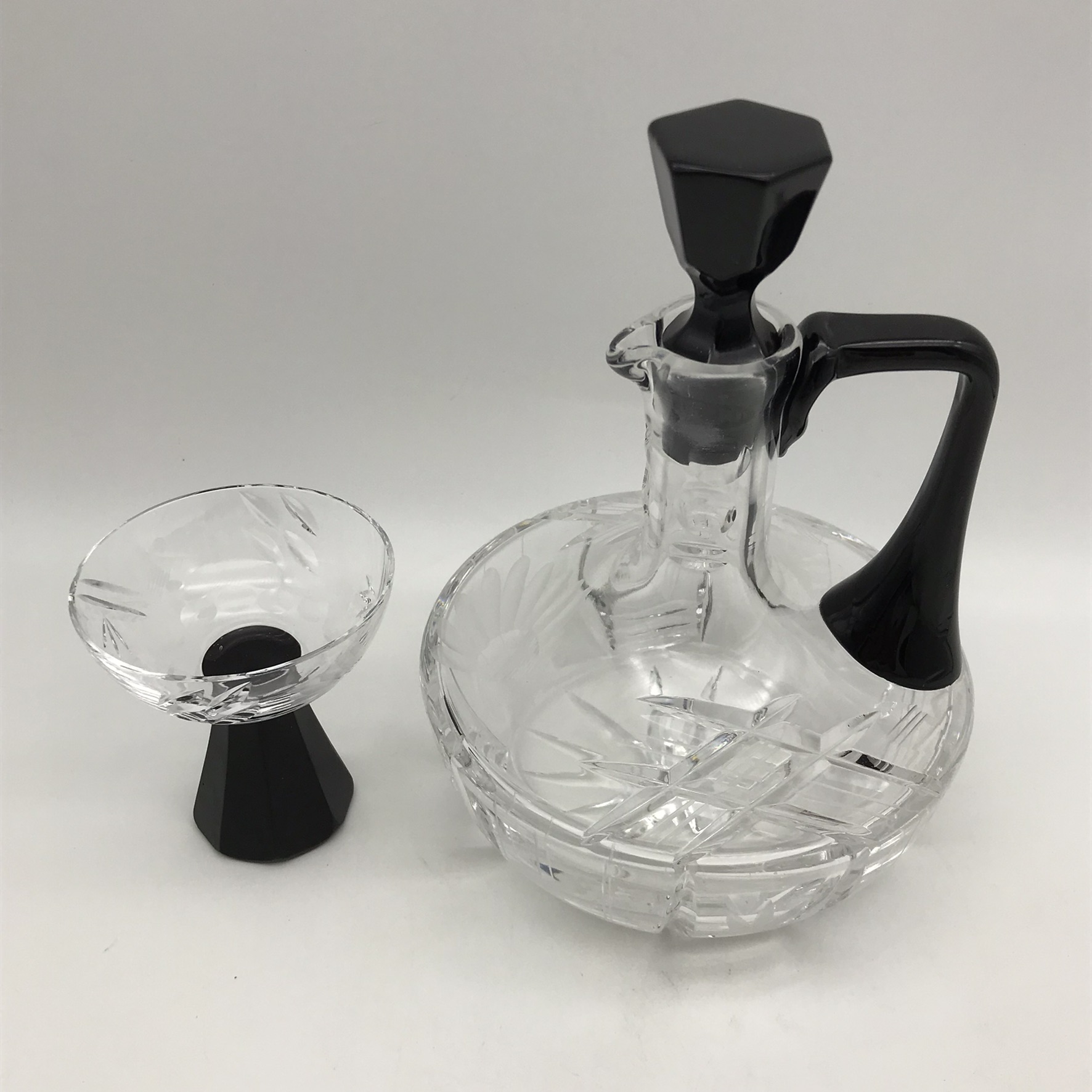 This lovely, small, cut-crystal, art deco claret jug and single glass, features a black glass handle, black hexagonal stopper, with an octagonal black base to the crystal glass. The jug has a beautifully cut, deco pattern with a ‘thumbprint-cut’ neck and a star-cut round base. Both the jug and glass are in great condition and would be ideal for a liqueur or sherry. The jug stands 17,5cm high (13,5cm without stopper), has a diameter of 13,5cm at its widest and the glass stands 7,5cm high, with a top diameter of 7cm and together they weigh 895g.