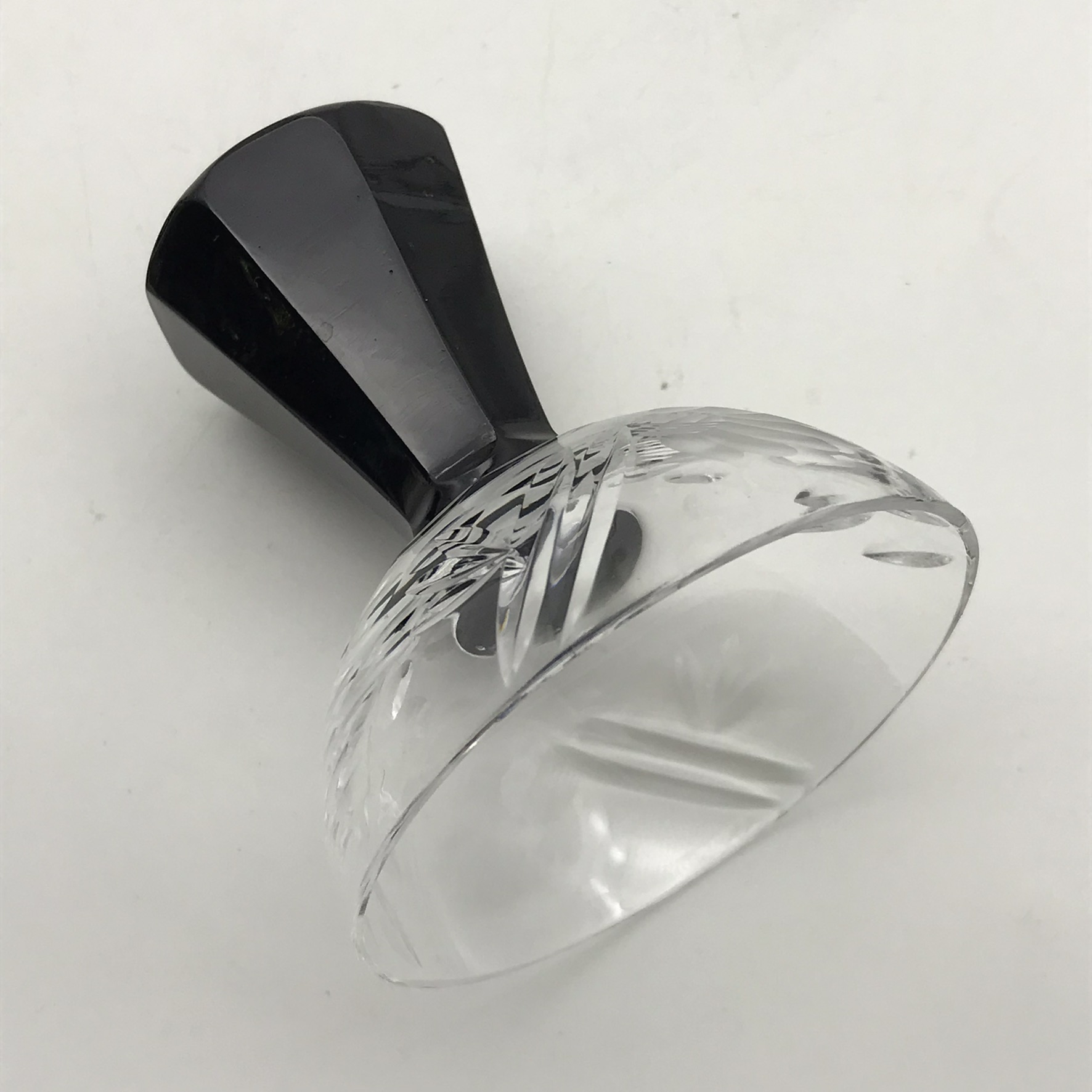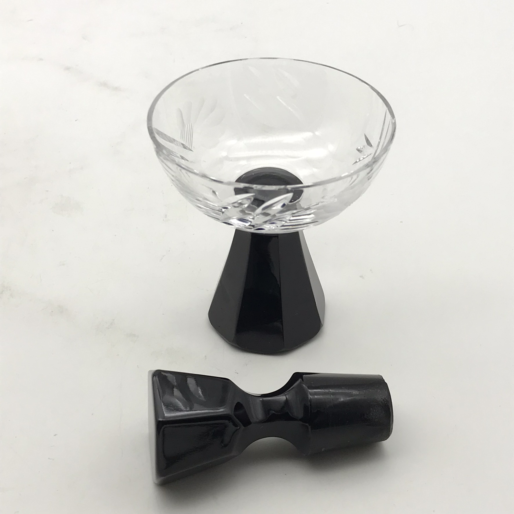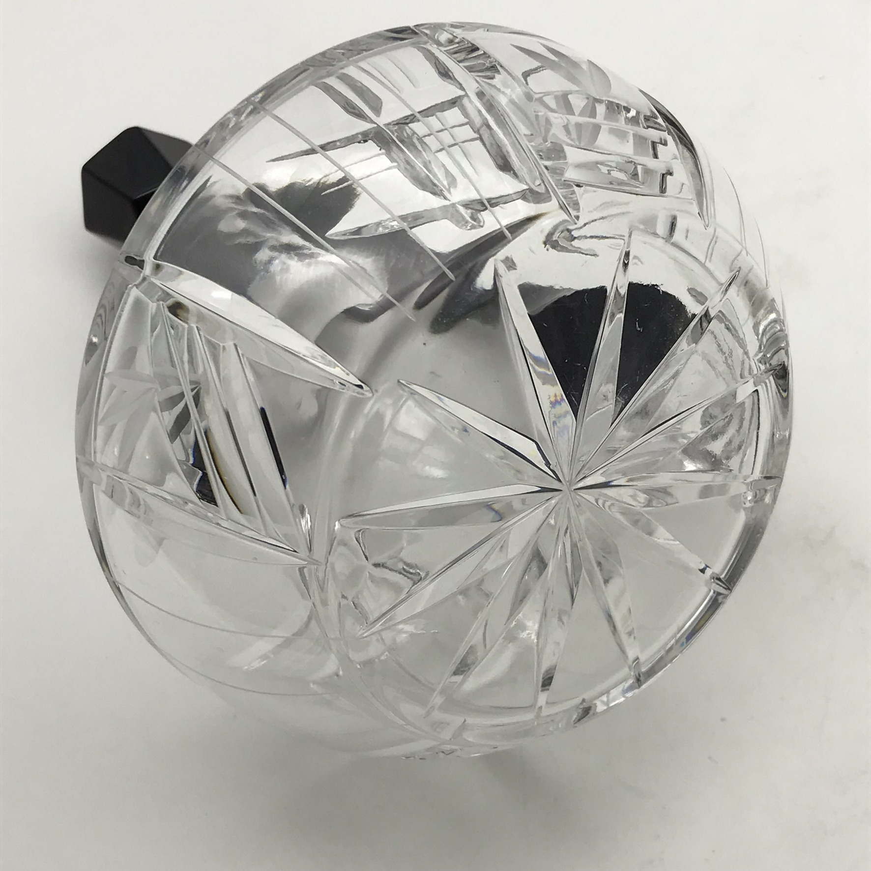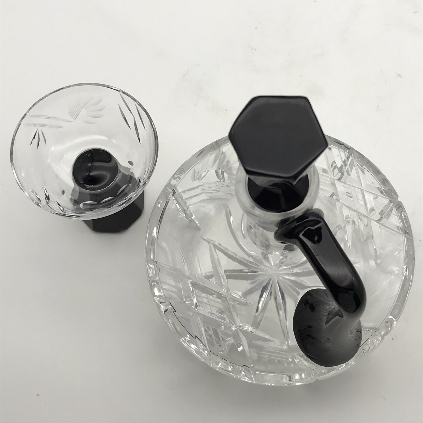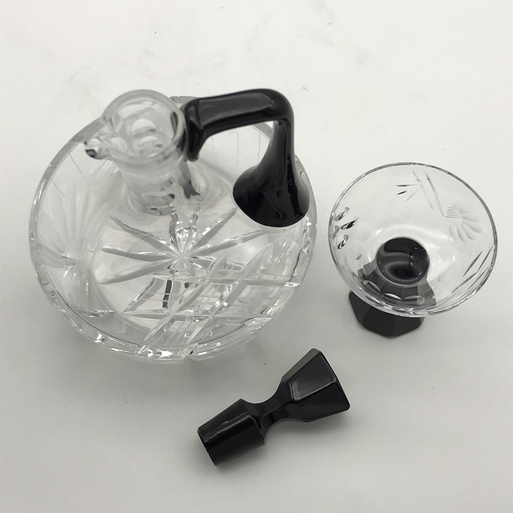 This lovely, small, cut-crystal, art deco claret jug and single glass, features a black glass handle, black hexagonal stopper, with an octagonal black base to the crystal glass. The jug has a beautifully cut, deco pattern with a ‘thumbprint-cut’ neck and a star-cut round base. Both the jug and glass are in great condition and would be ideal for a liqueur or sherry. The jug stands 17,5cm high (13,5cm without stopper), has a diameter of 13,5cm at its widest and the glass stands 7,5cm high, with a top diameter of 7cm and together they weigh 895g.