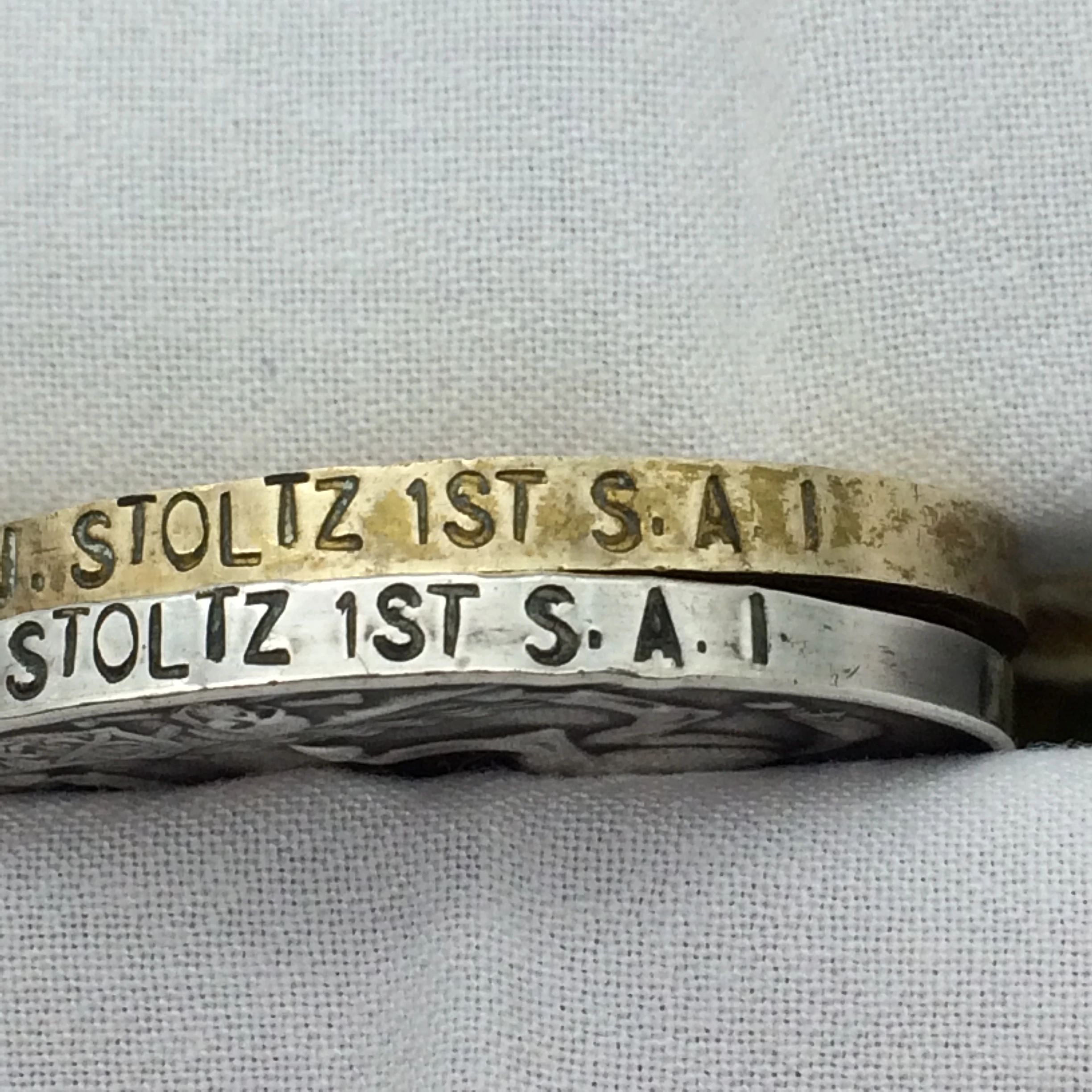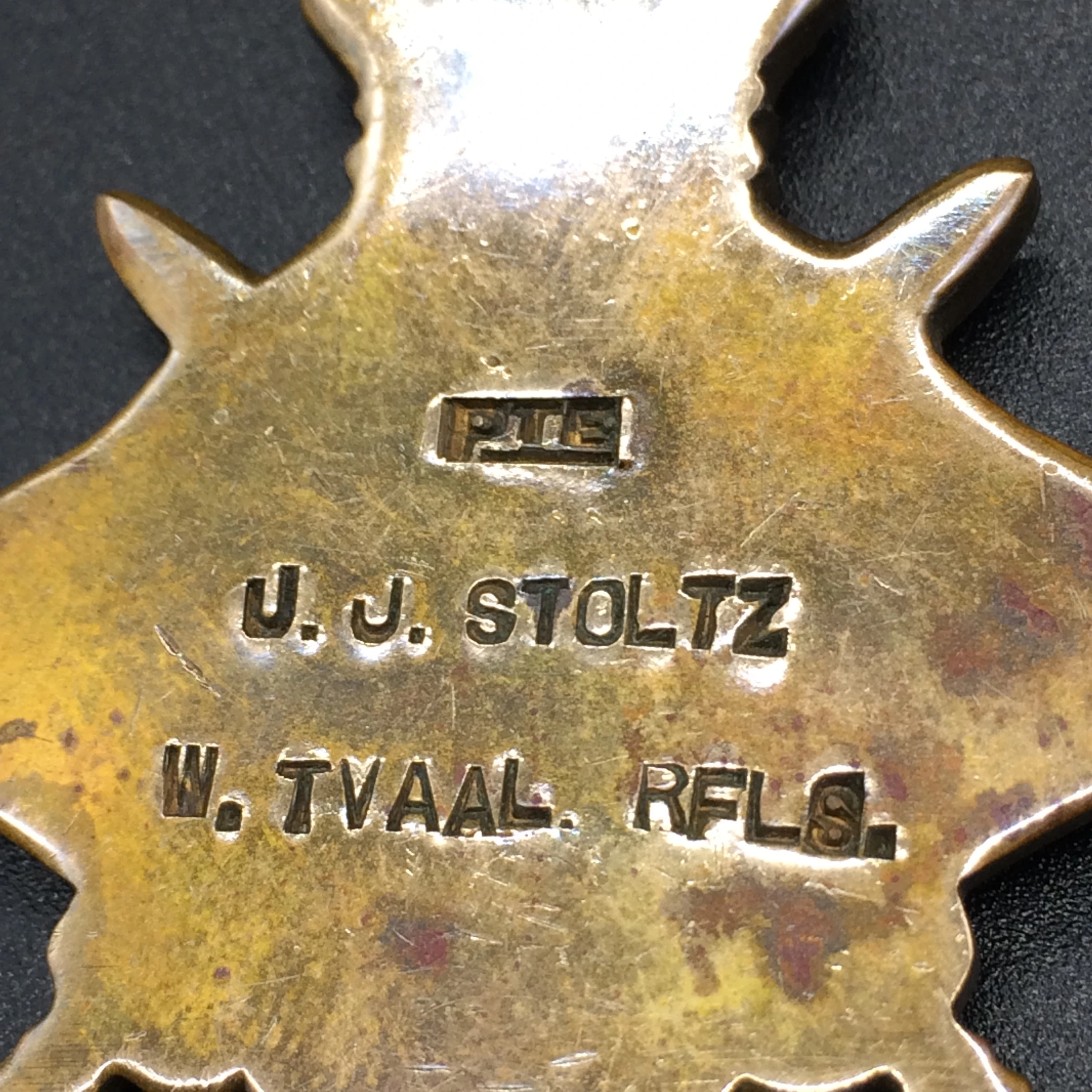 This South African group of three full size medals were awarded to ‘PTE. J.J. STOLTZ.’ The units on the medals are 1) ‘W. TVAAL. RFLS’ and 2) ‘1st S.A.I.’ The medals are in good condition, with ribbons and have been un-researched.