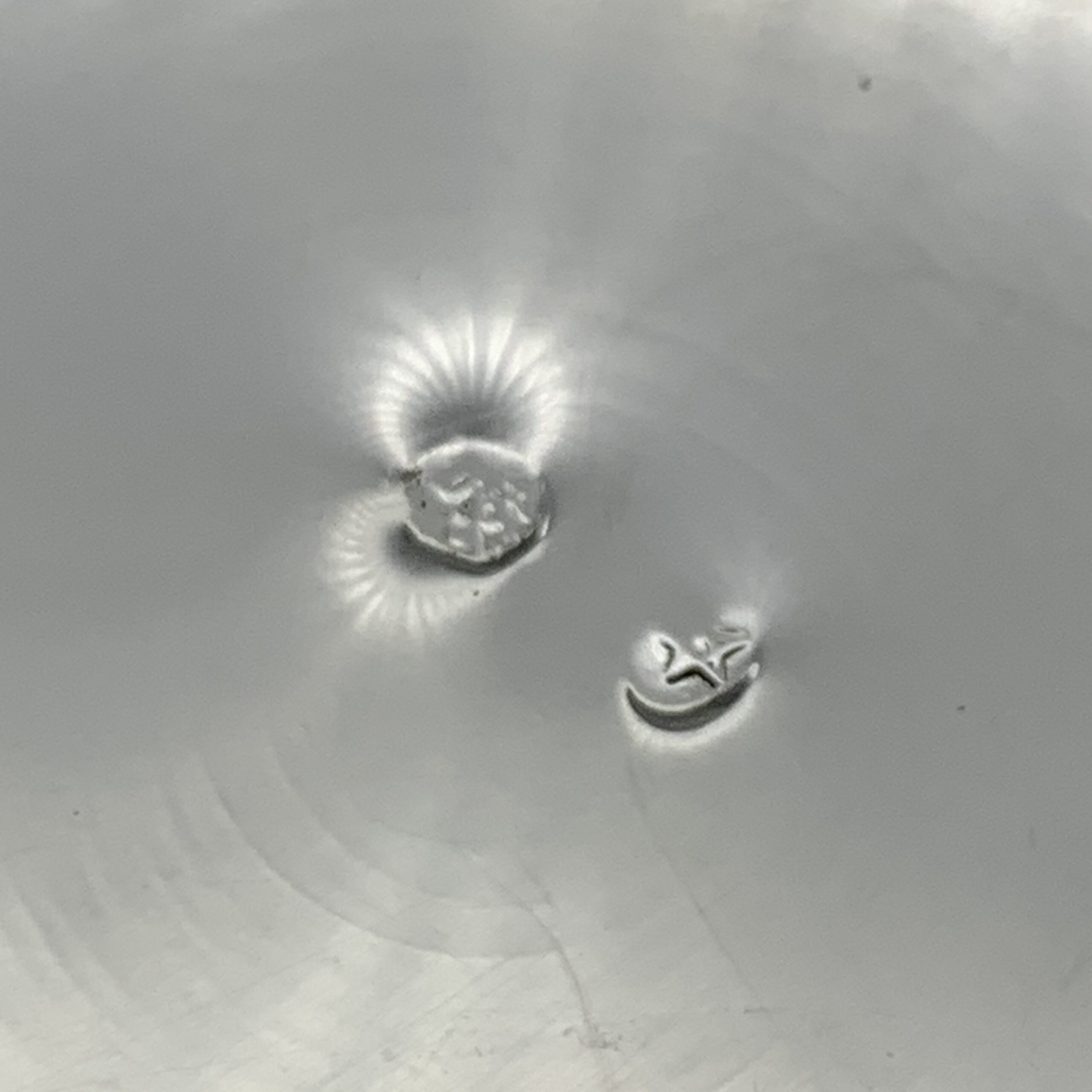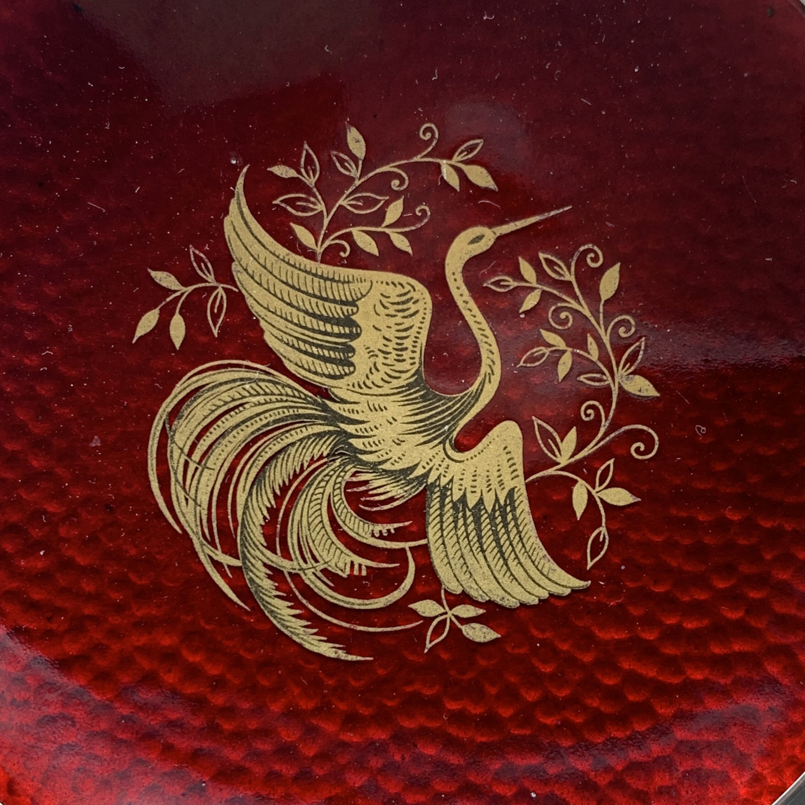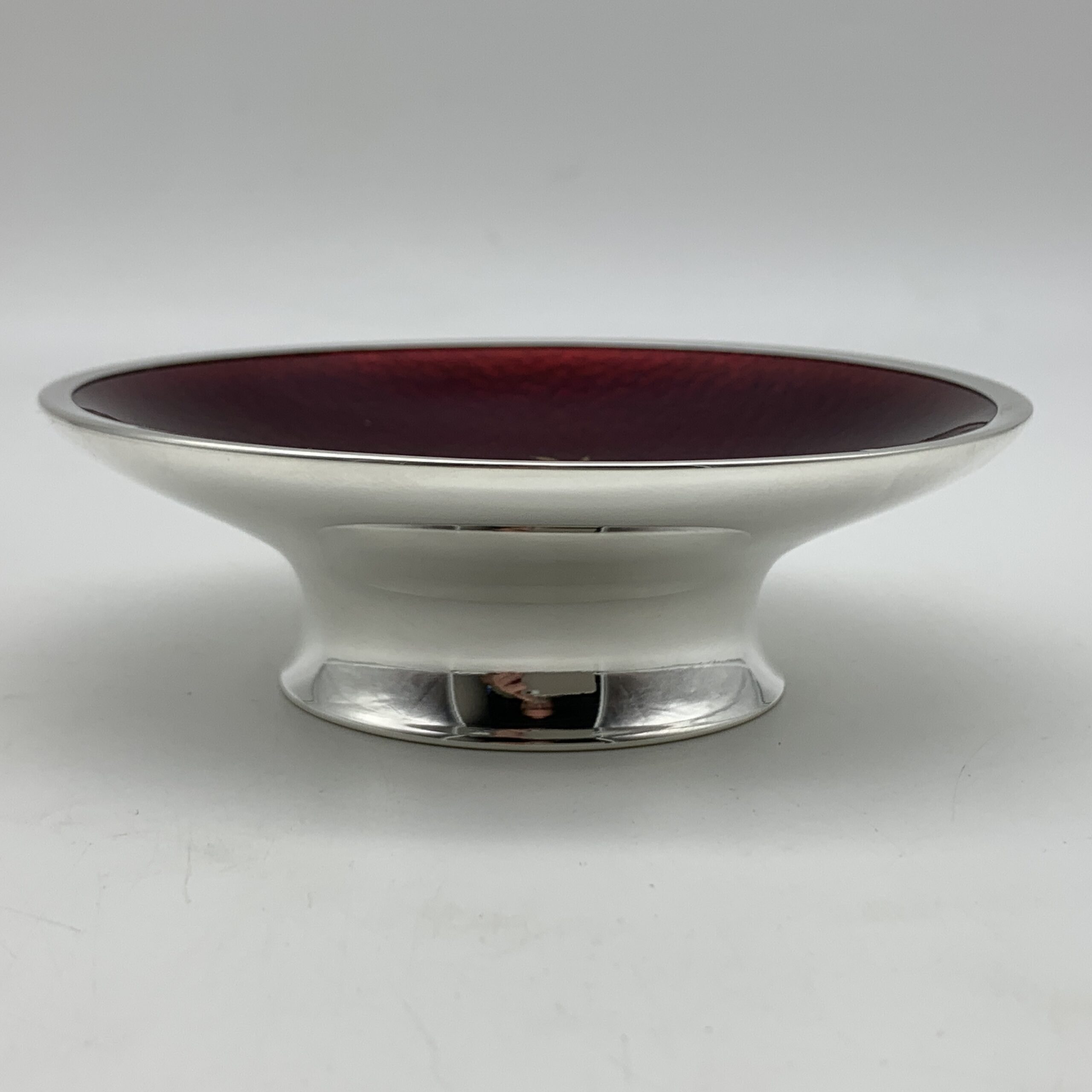 This lovely, fine quality, Spanish, solid silver pedestal dish is beautifully decorated in red guilloche enamel with a finely detailed gilt bird, possibly a stork. It was made in Spain, probably around the 1940/50’s and is stamped on the base with a small ‘Pentagram’ quality mark (indicating a minimum of .915 purity silver) and with a small makers mark below it. The lovely piece is in excellent condition, with a top diameter of 11cm, a base diameter of 6cm, stands 3,5cm high and weighs 161g.
