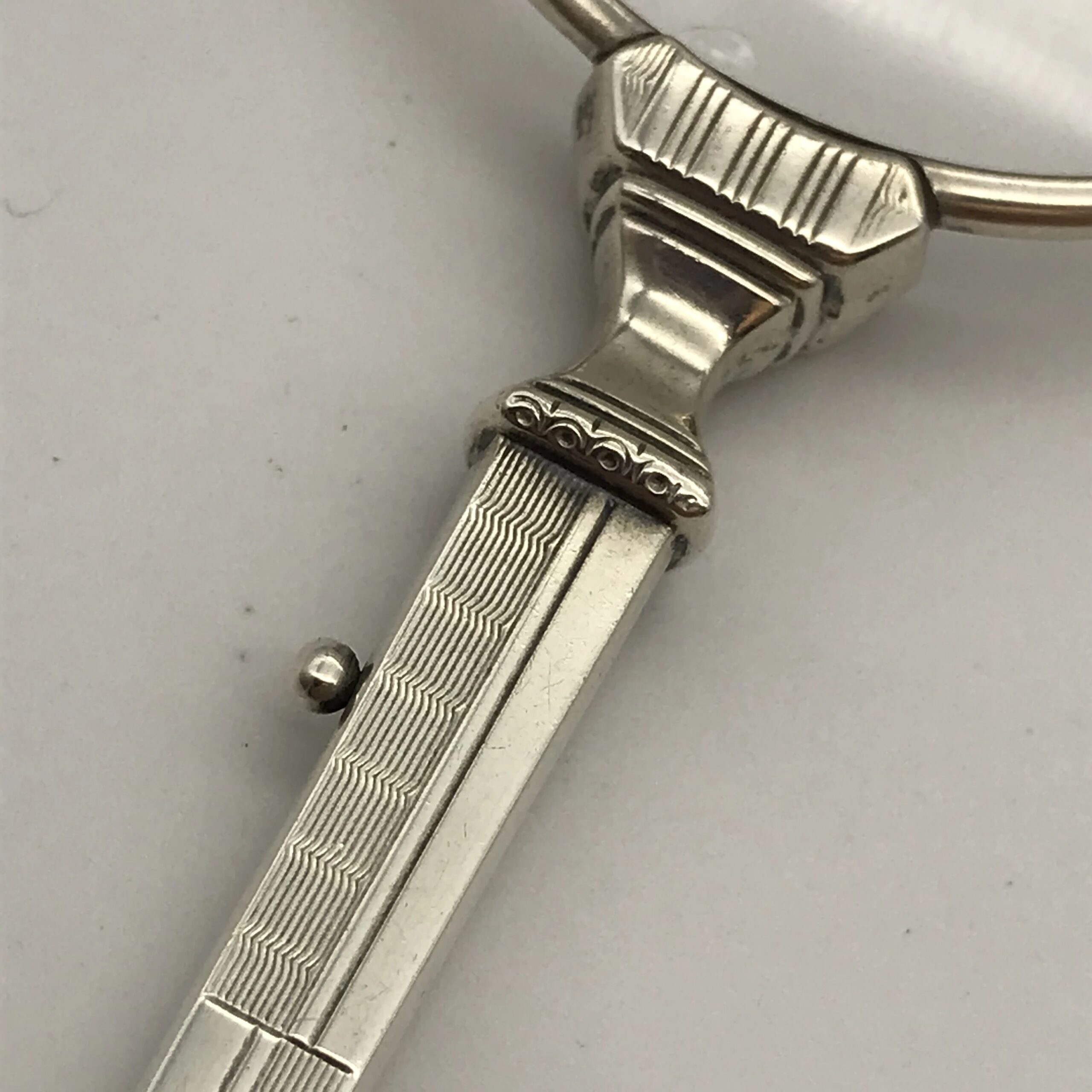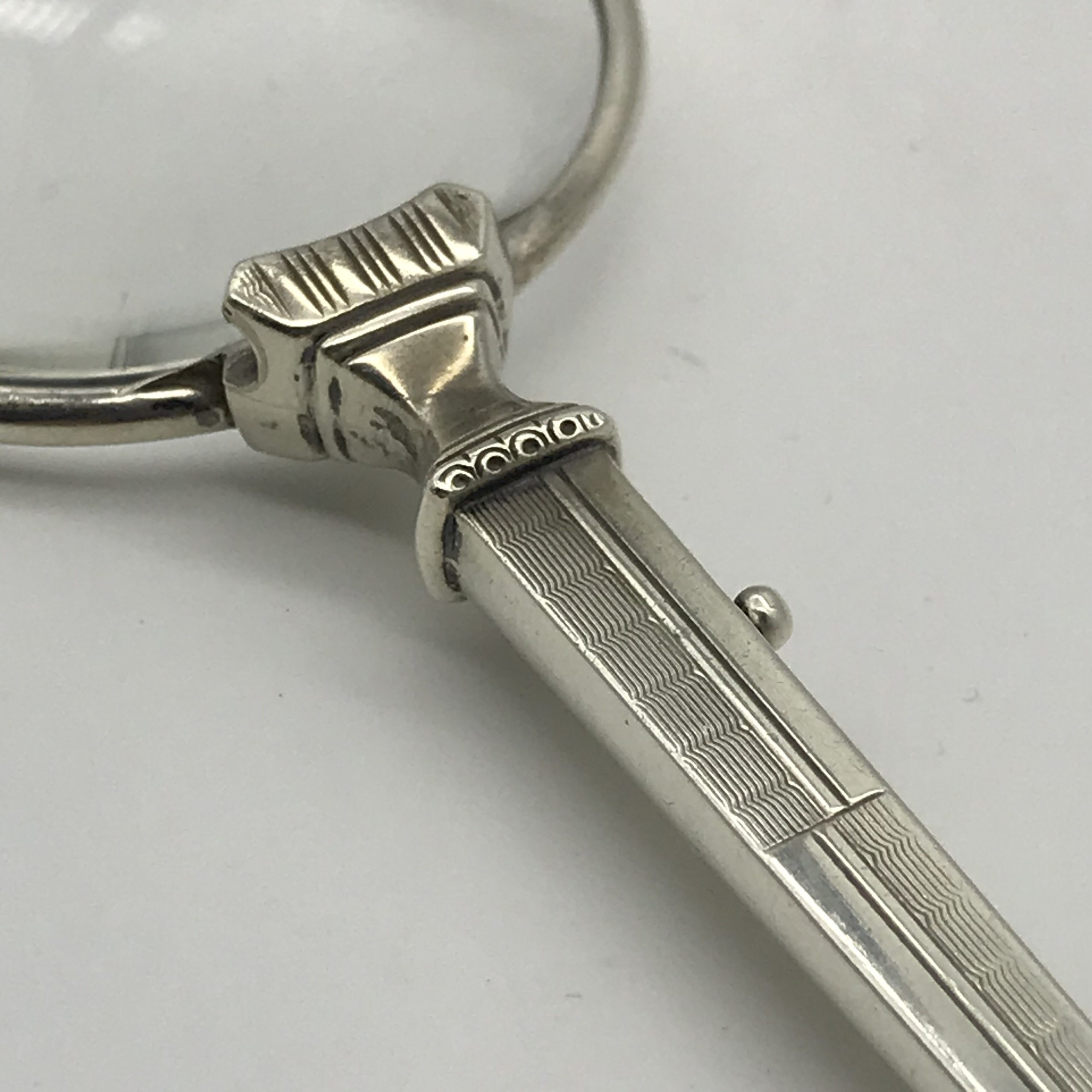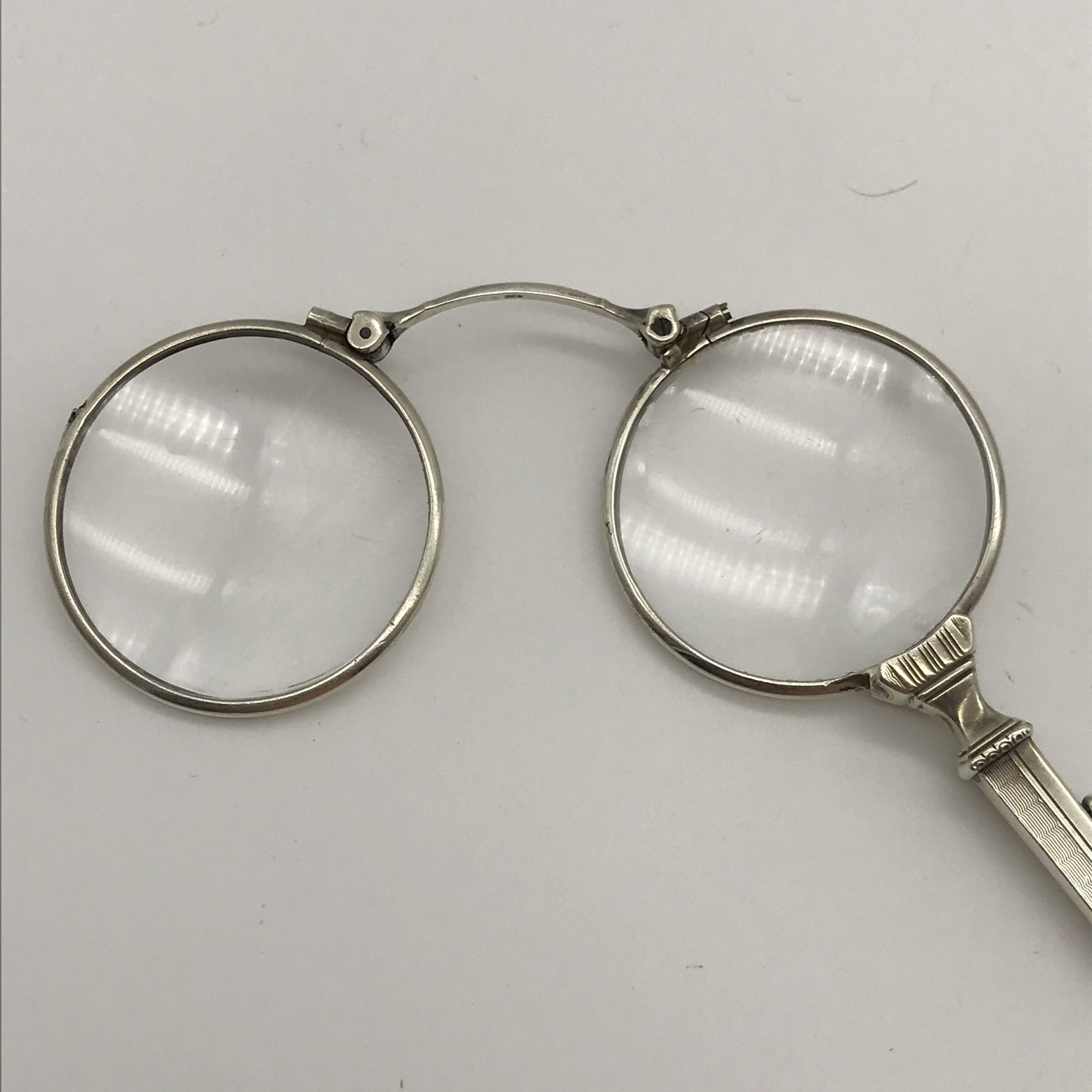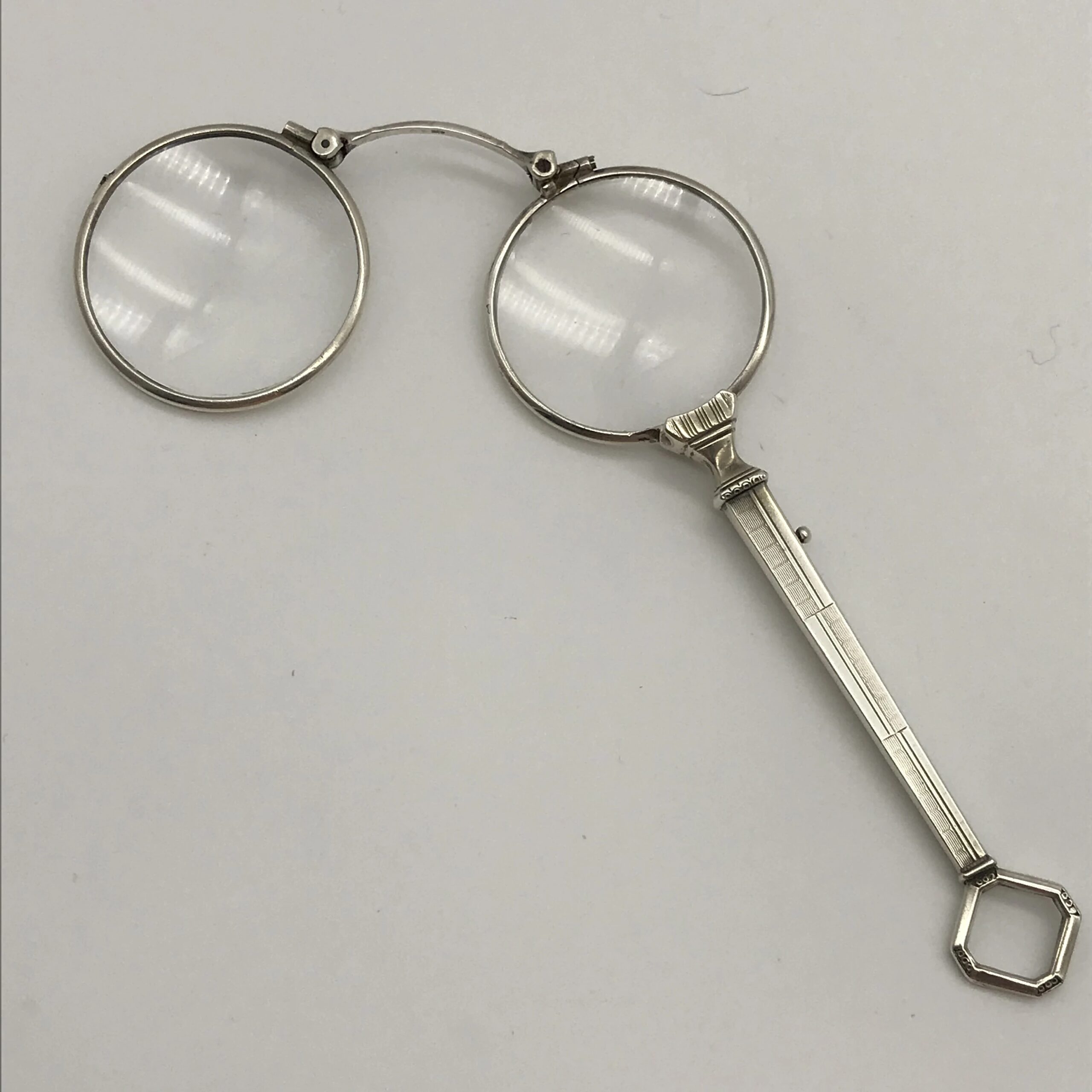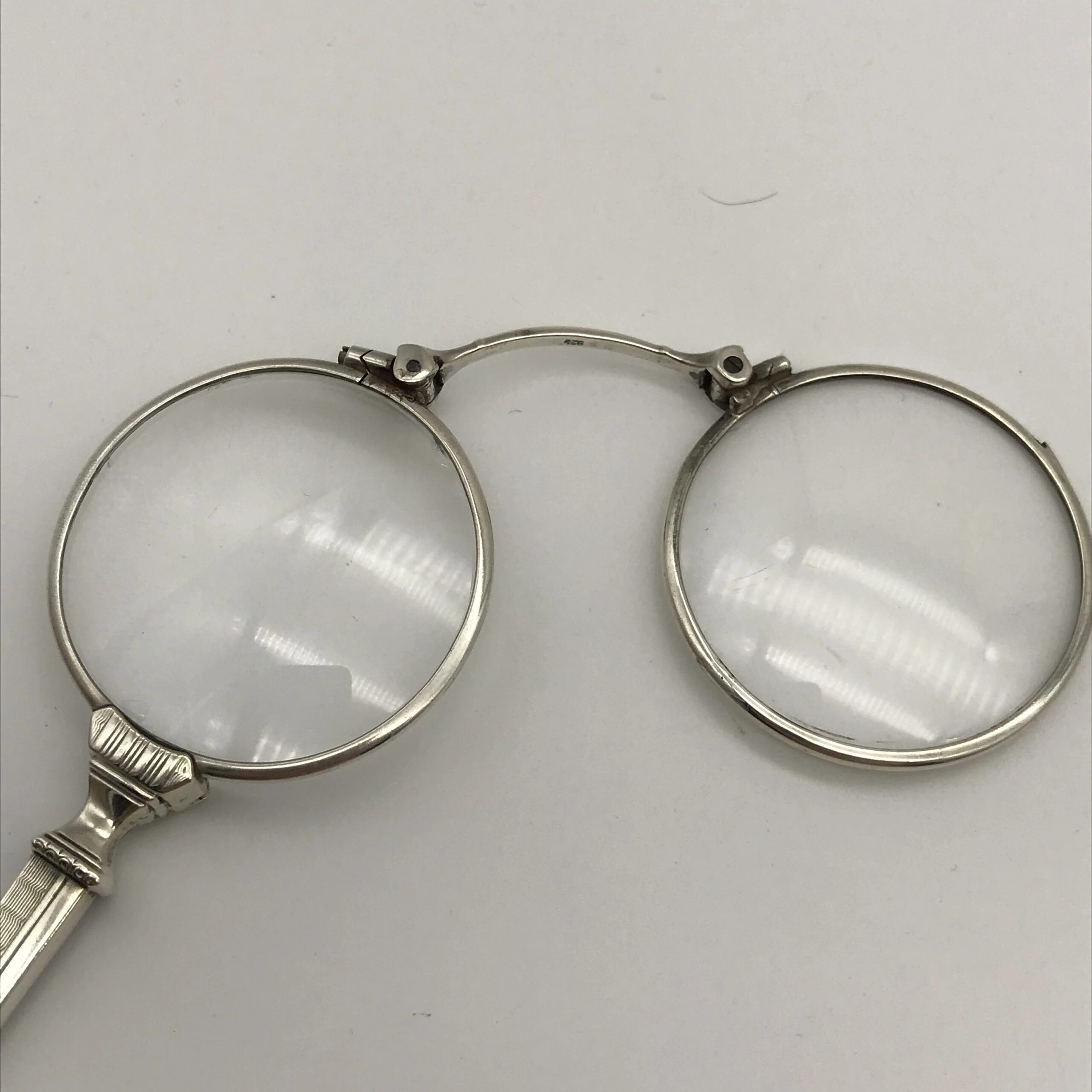 This beautiful pair of 1930’s silver lorgnettes are in excellent condition. The handle has been etched with a typical Art Deco pattern and the lenses mechanically unfold via a small lever on the side of the handle. The bridge between the lenses is stamped ‘925’. They measure 13.5cm when closed and 10cm lens to lens when open.