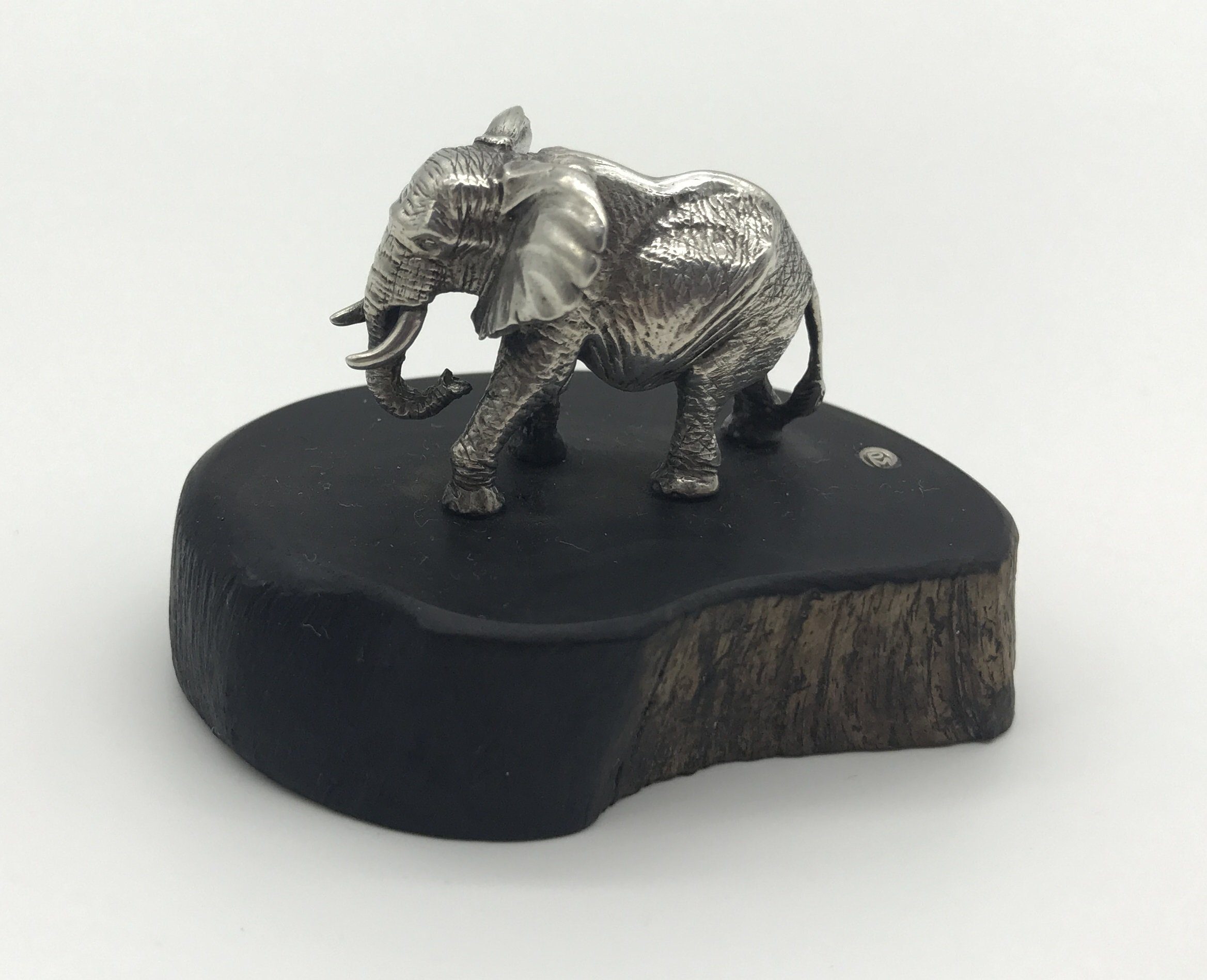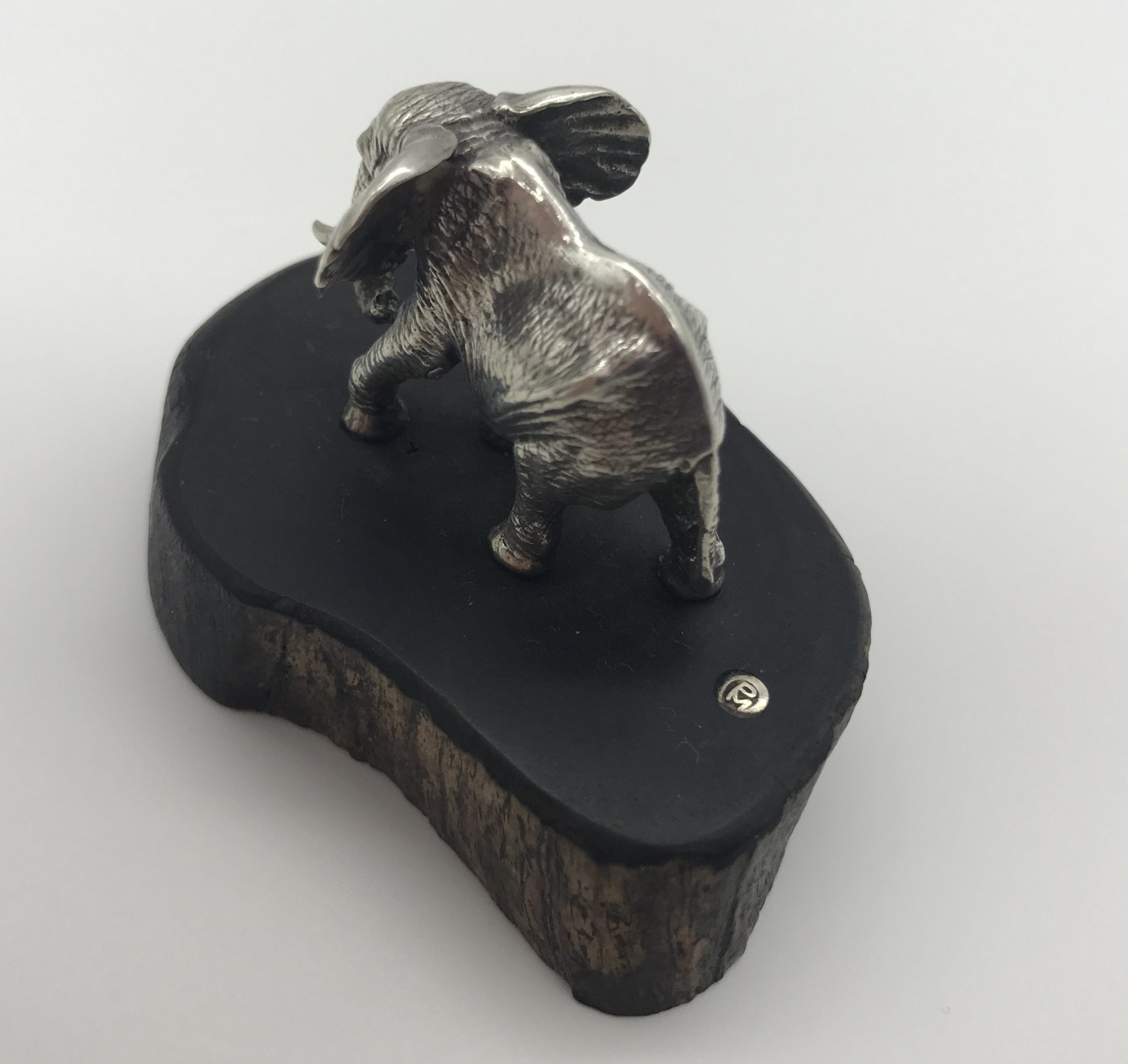 Sterling silver miniature by Patrick Mavros on a Blackwood base in good condition with exceptional detail. It measures 4cm in height and 5.5cm in length.