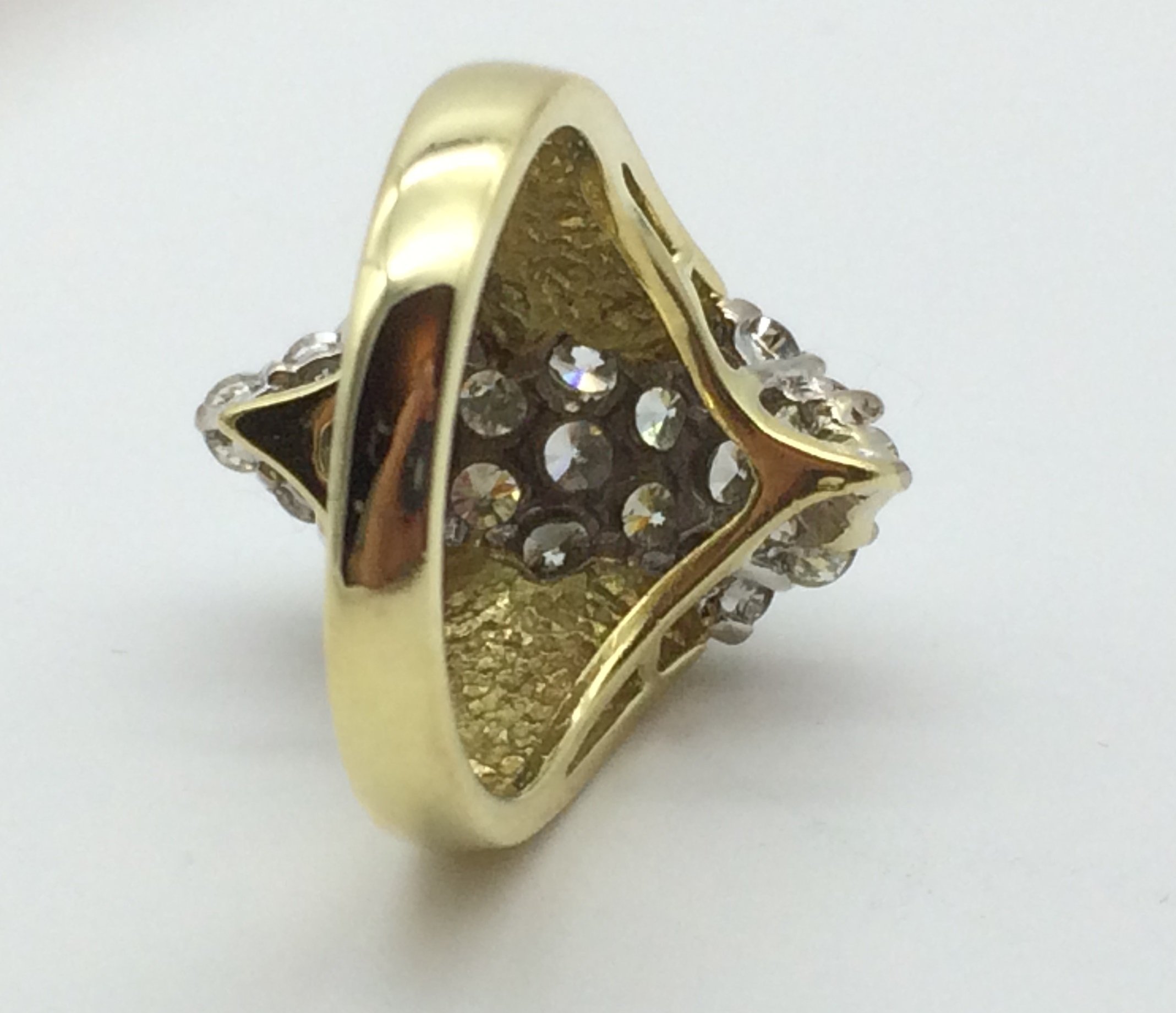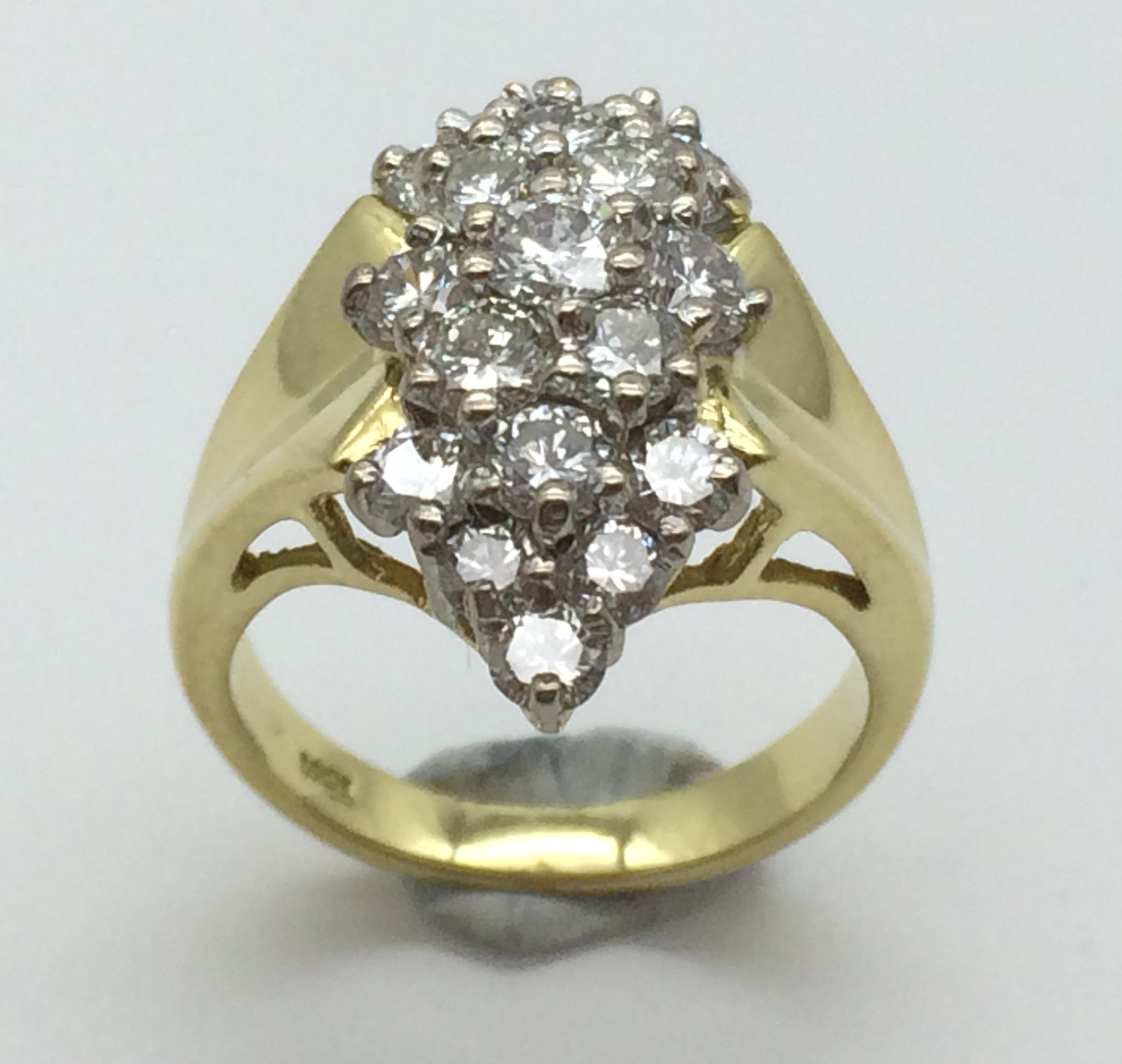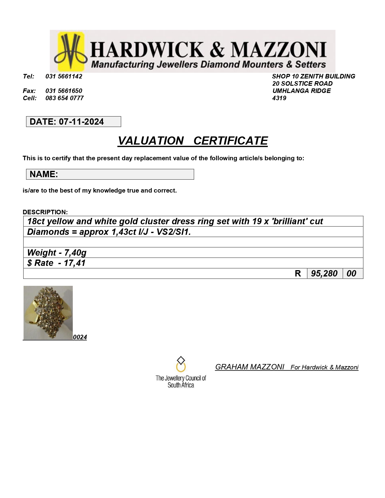 This elegant, 18ct yellow & white gold cluster ring is set with 19 x brilliant cut diamonds = approx. 1.43ct. Colour – I/J. Clarity – VS2/SI1. It is in excellent condition and weighs 7.40g.