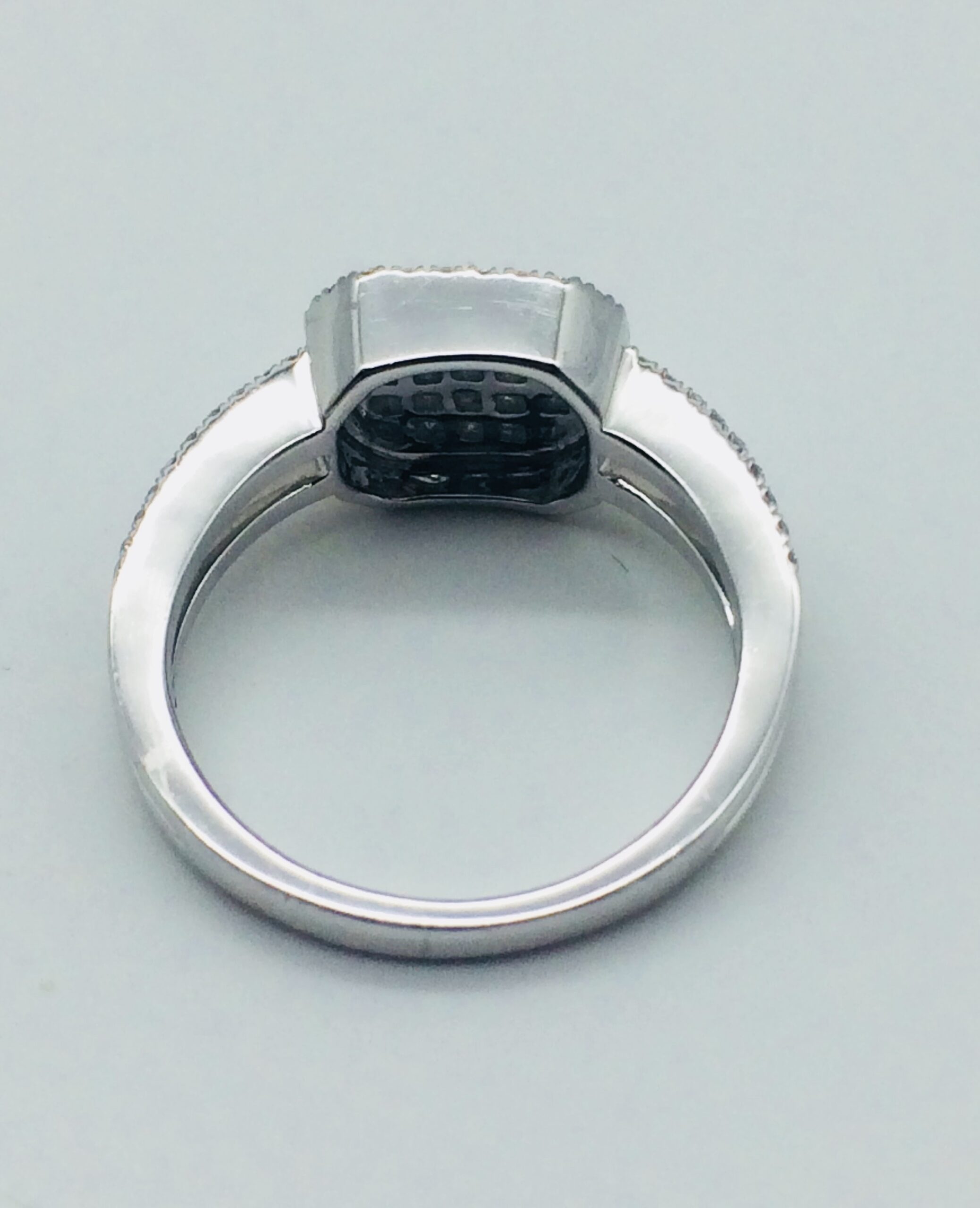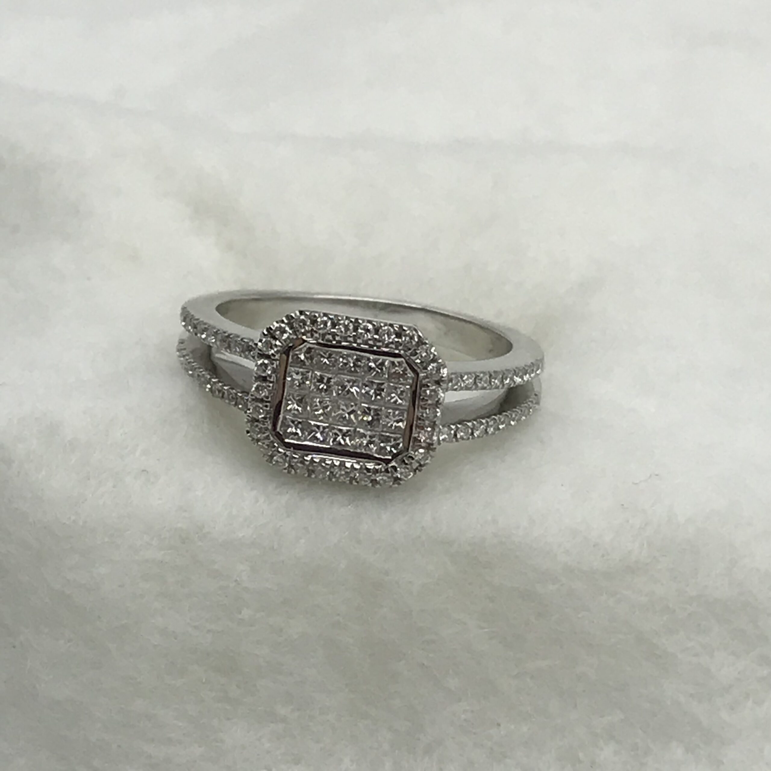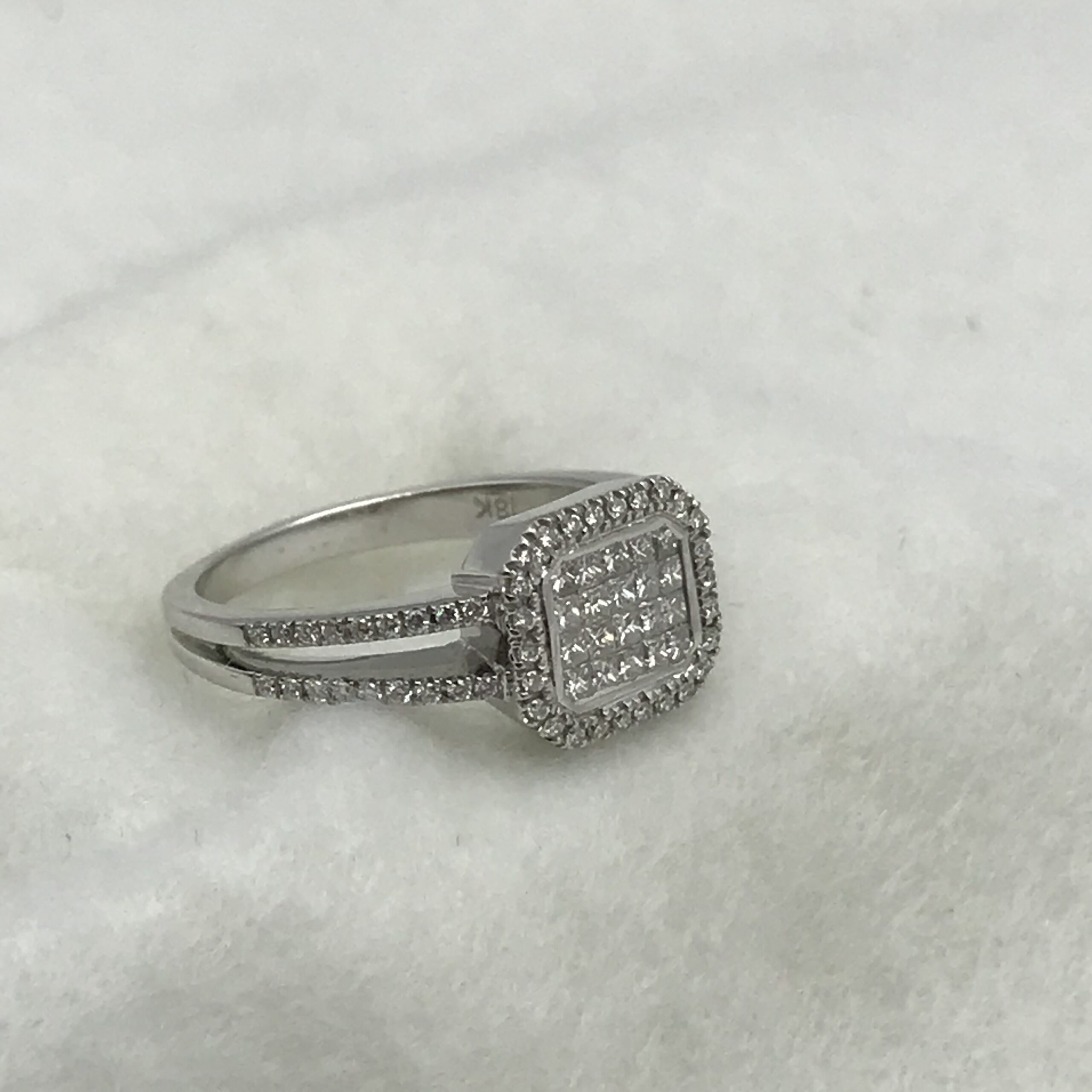 This lovely, elegant 18ct white gold vintage dress ring is set with 20 x ‘princess cut’ diamonds = 0.20ct (H/I- VS1/VS2), 26 x ‘brilliant cut’ diamonds = 0.13ct (H/I – VS2/SI1) and 36 x ‘brilliant cut’ diamonds = 0.36ct (H/I – VS2/SI1).