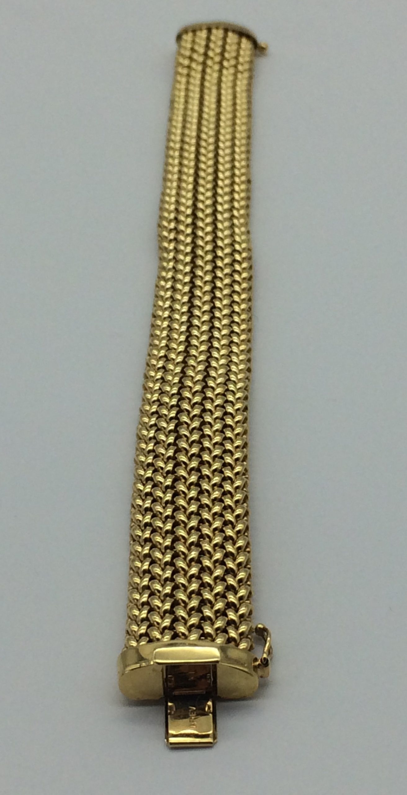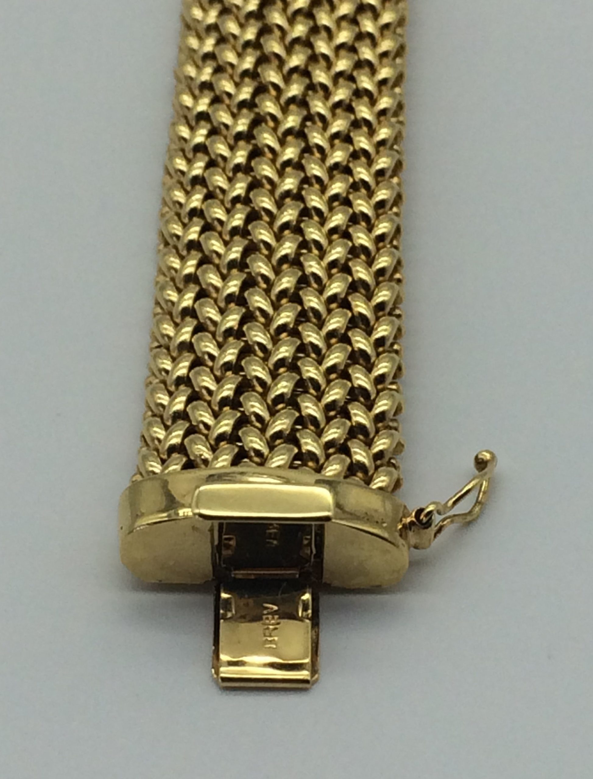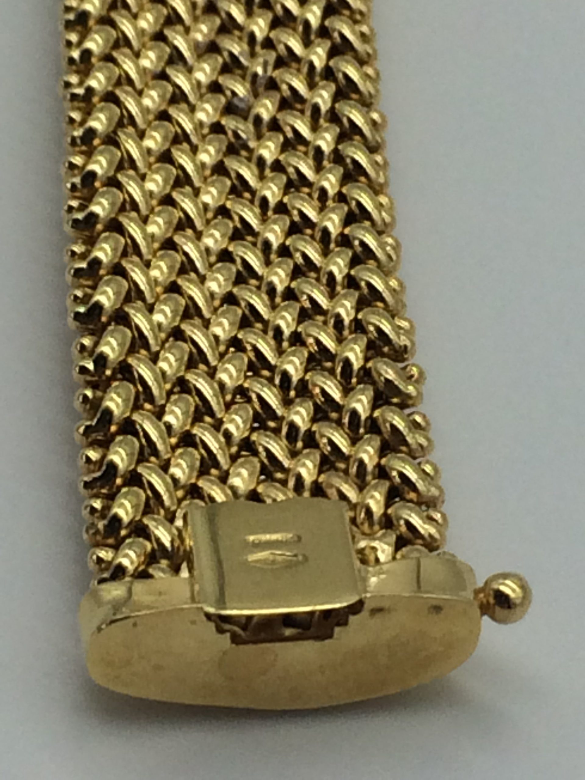 This very impressive mesh link bracelet is stamped ‘Browns’ and ‘375’ for 9ct gold. The clasp is very secure and has an added safety catch. It really is a stunning good quality piece. It measures 20cm in length, 1.7cm in width and weighs 26.1g.