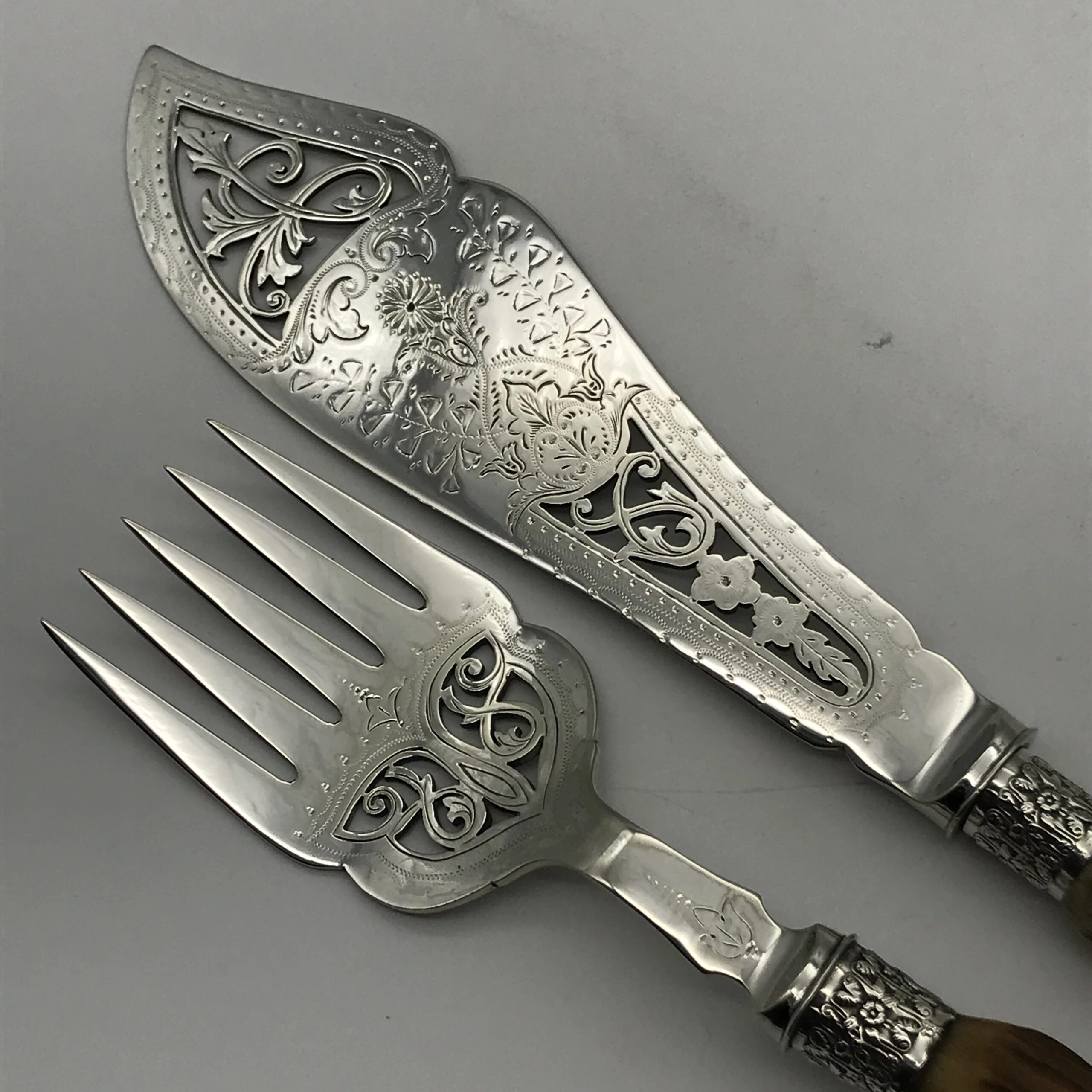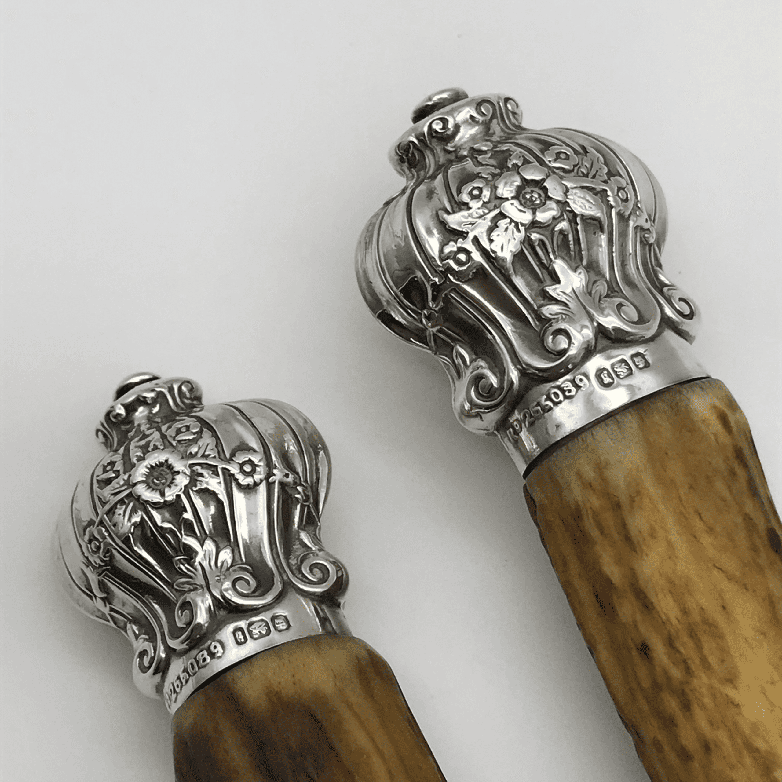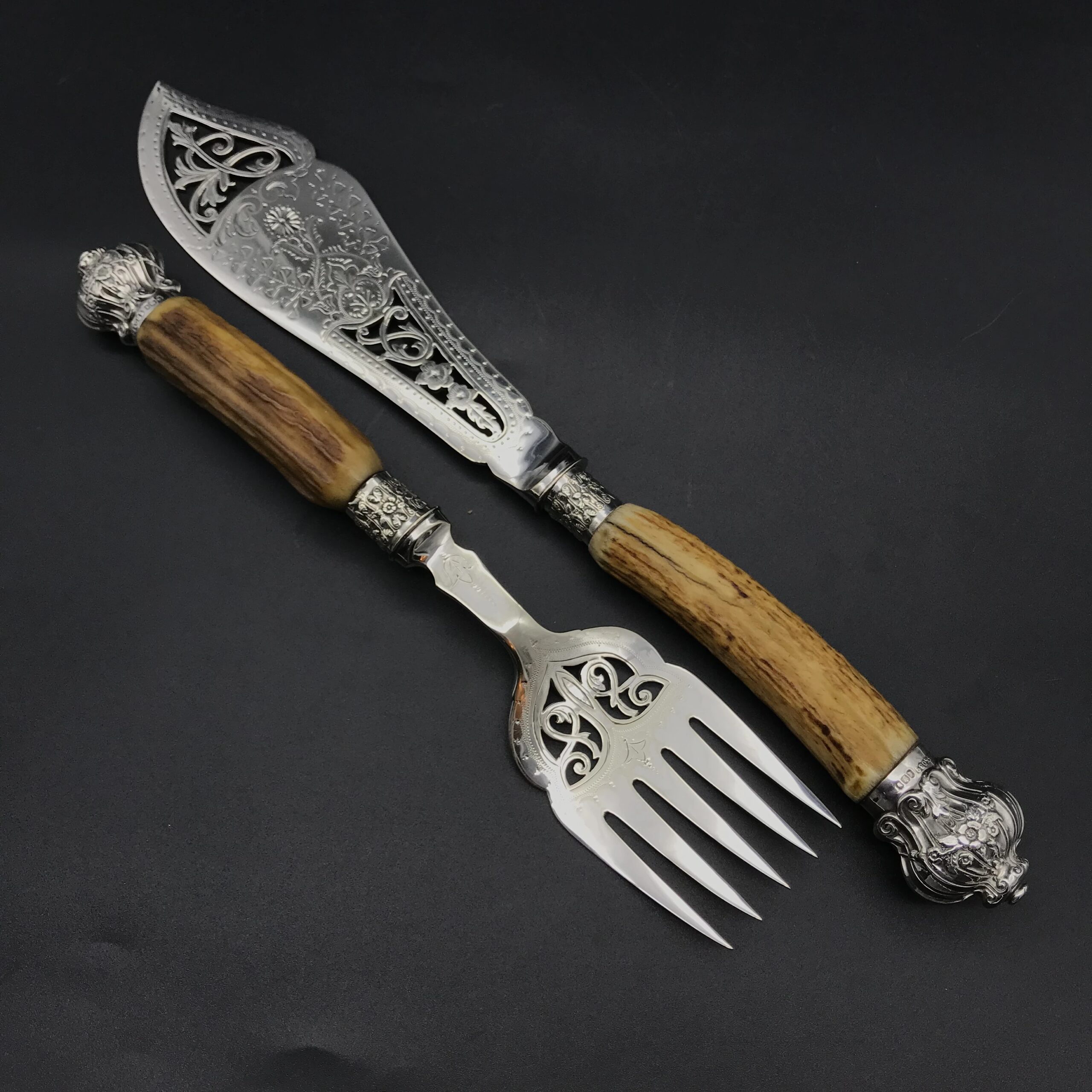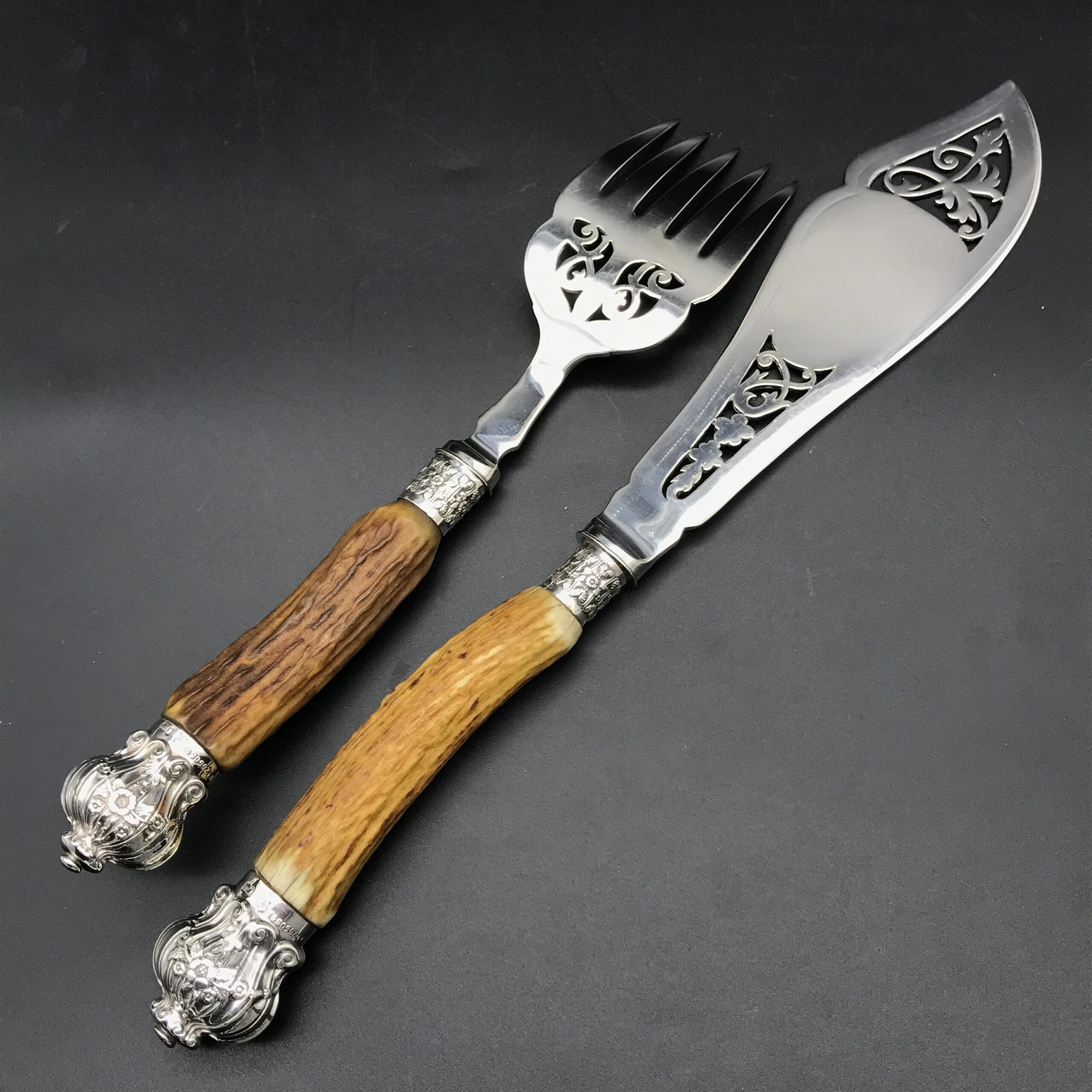 This awesome pair of antique silver and silver plate fish servers are in excellent condition. The blade and fork are silver plated and have been beautifully pierced and engraved with a floral and vine pattern. These are attached to English antler handles with sterling silver mounts and large crown shaped ends. The mounts and crown ends are English hallmarked for Sheffield 1901, with a manufacturers mark ‘SBHB’ for silversmiths ‘Samuel Biggin & Son.’ The knife measures 34.5cm in length, with a width of 5.2cm and the fork measures 26cm in length, with a width of 5.3cm. They have a combined weight of 370g.
