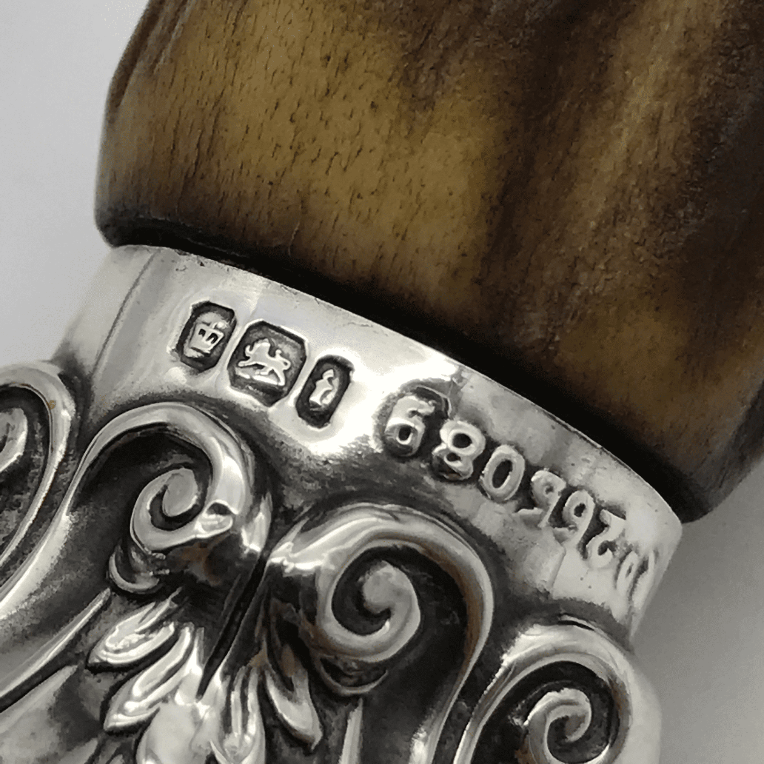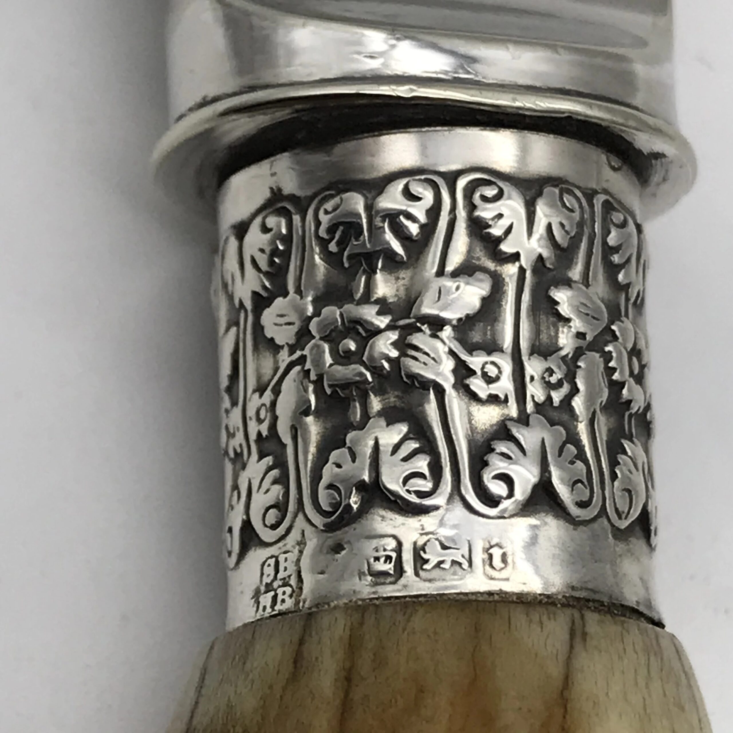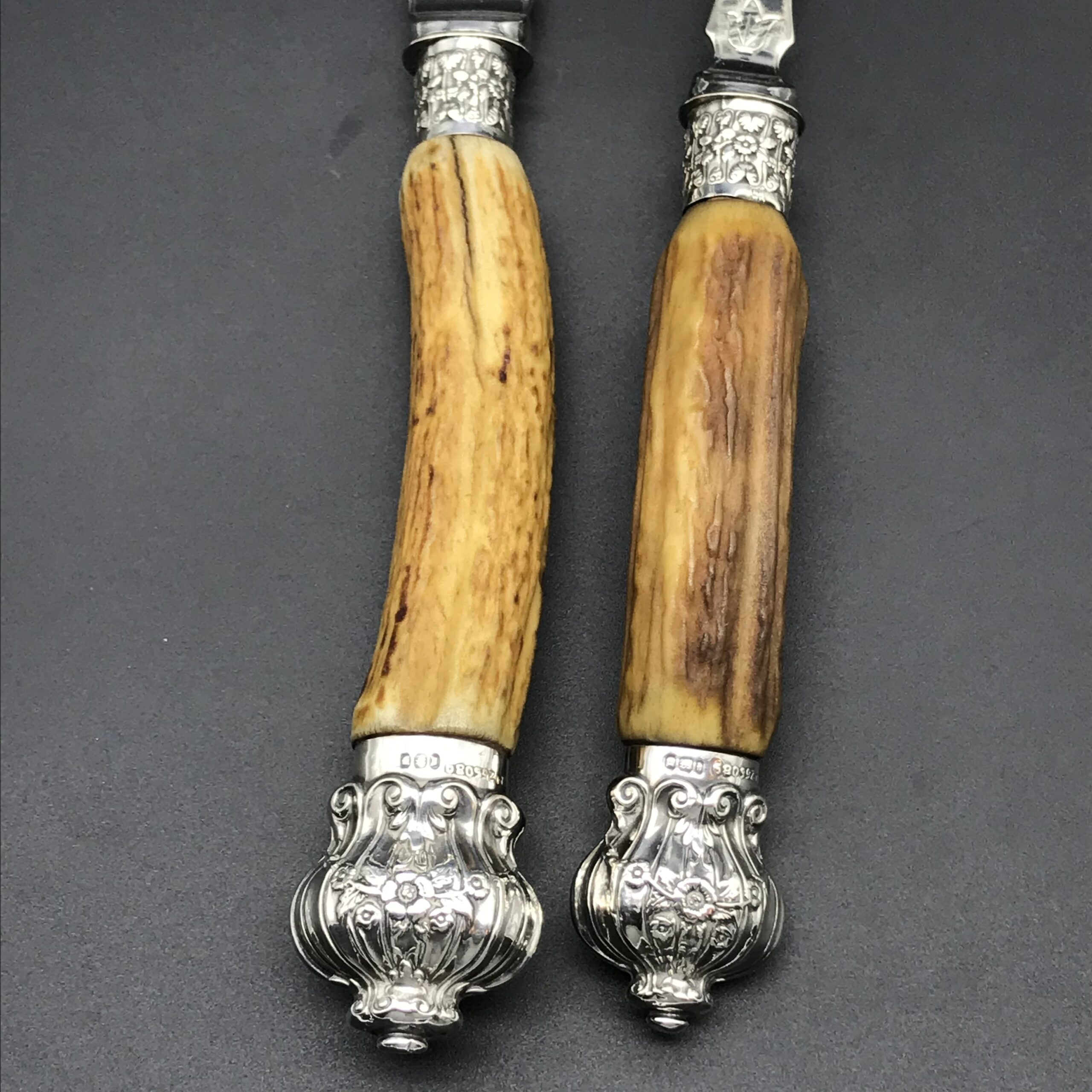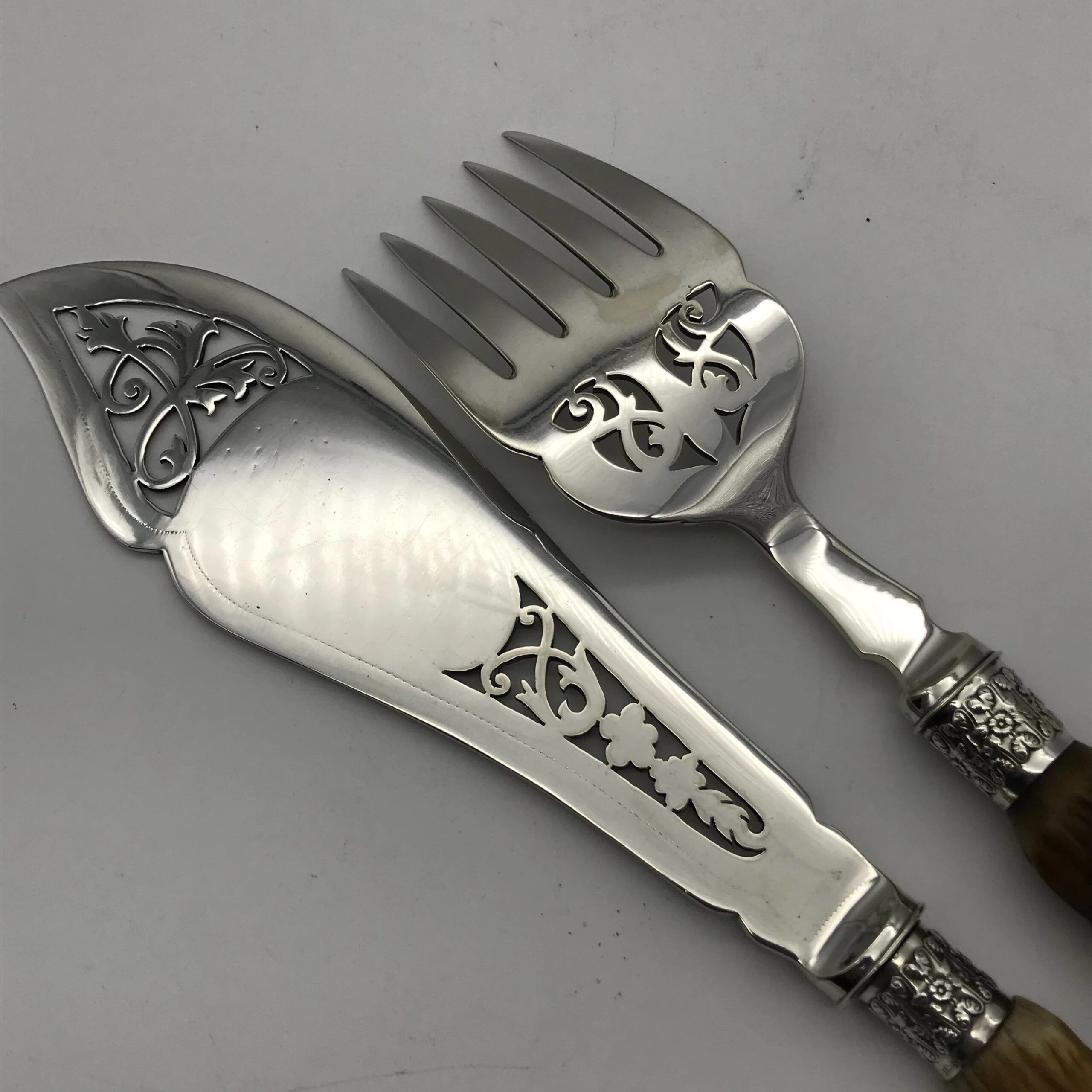 This awesome pair of antique silver and silver plate fish servers are in excellent condition. The blade and fork are silver plated and have been beautifully pierced and engraved with a floral and vine pattern. These are attached to English antler handles with sterling silver mounts and large crown shaped ends. The mounts and crown ends are English hallmarked for Sheffield 1901, with a manufacturers mark ‘SBHB’ for silversmiths ‘Samuel Biggin & Son.’ The knife measures 34.5cm in length, with a width of 5.2cm and the fork measures 26cm in length, with a width of 5.3cm. They have a combined weight of 370g.