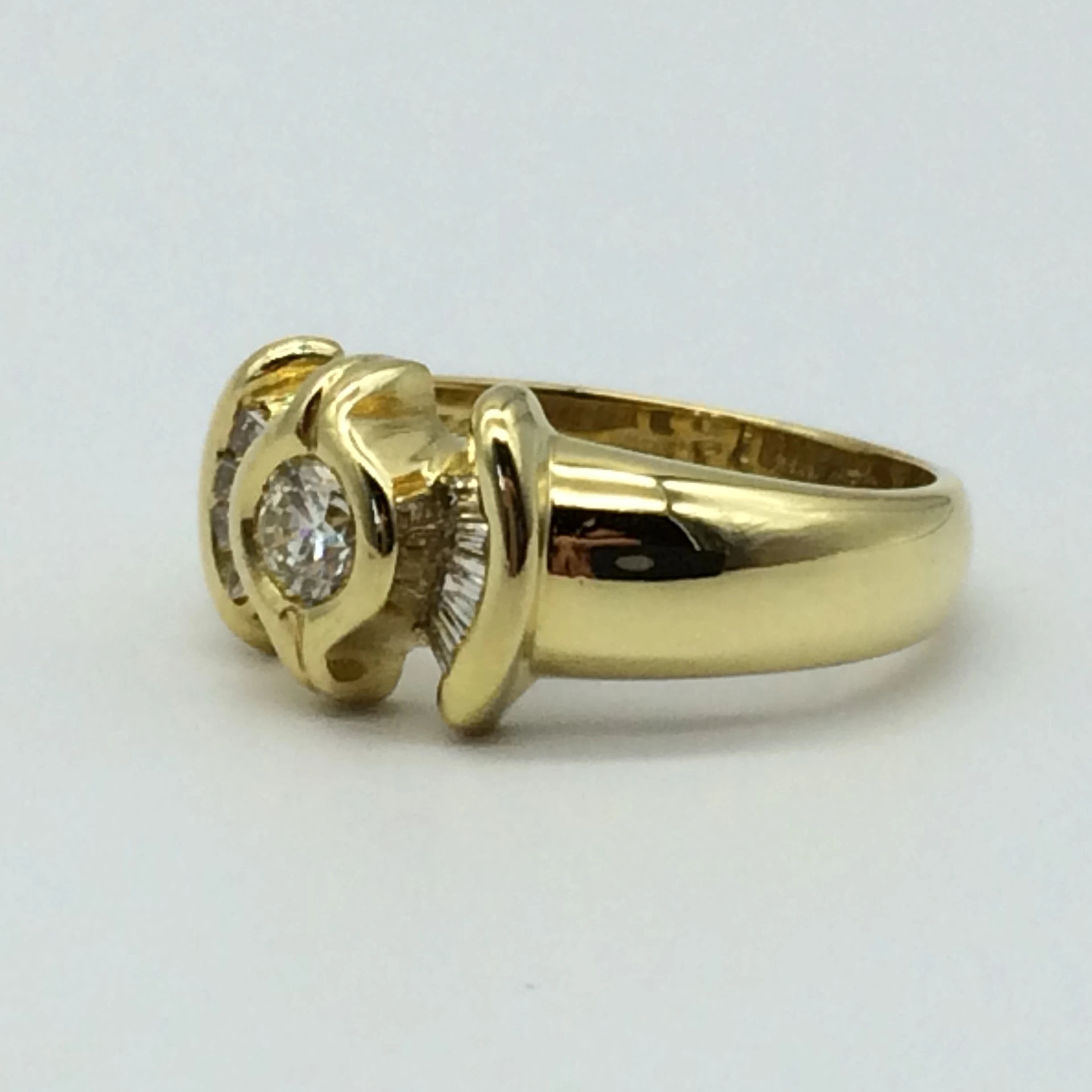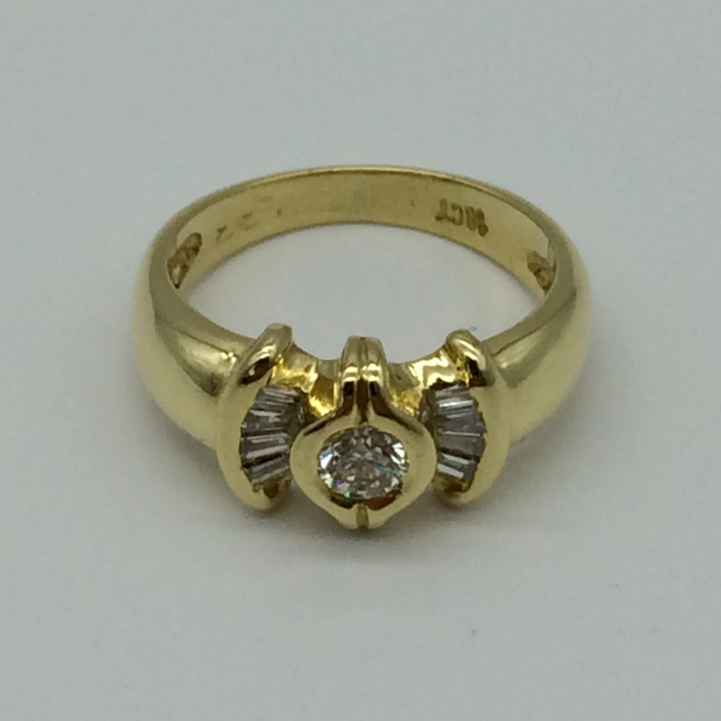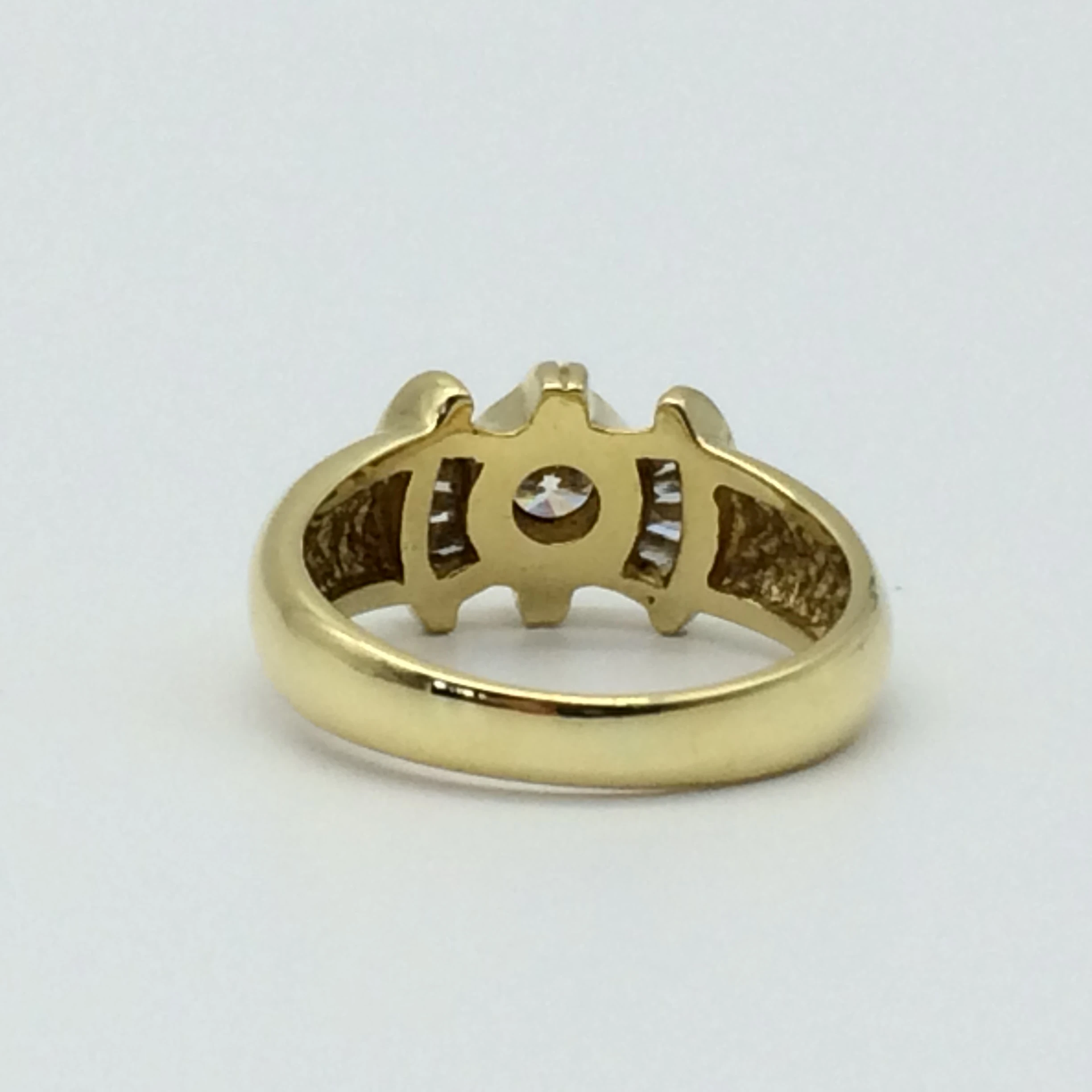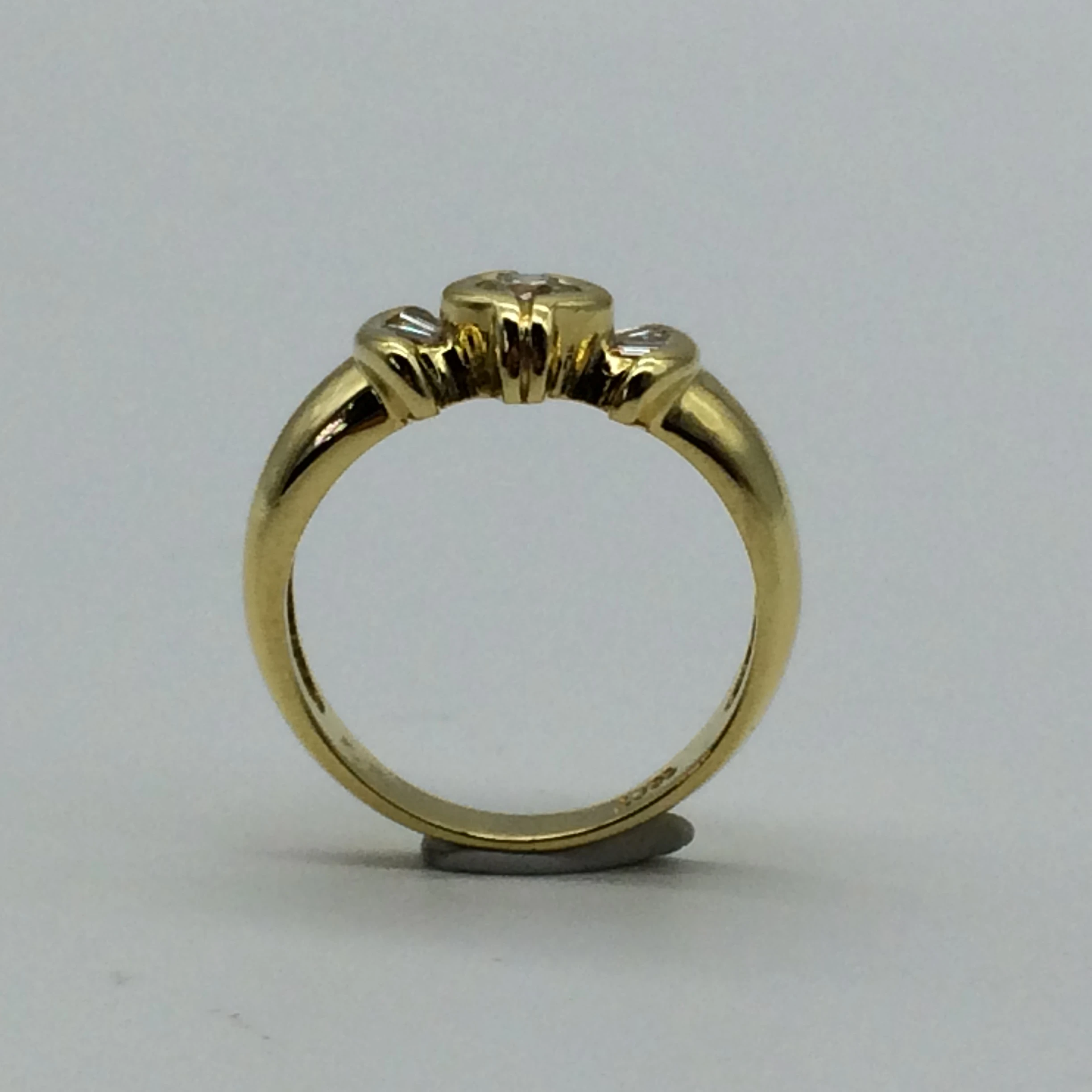 This stylish 18ct yellow gold ring is set with 1 x ‘brilliant cut’ diamond = 0.25ct (J/K – VS2/SI1) and 8 x tapered ‘baguette’ shaped diamonds = 0.25ct (H/I – VVS1/VVS2).