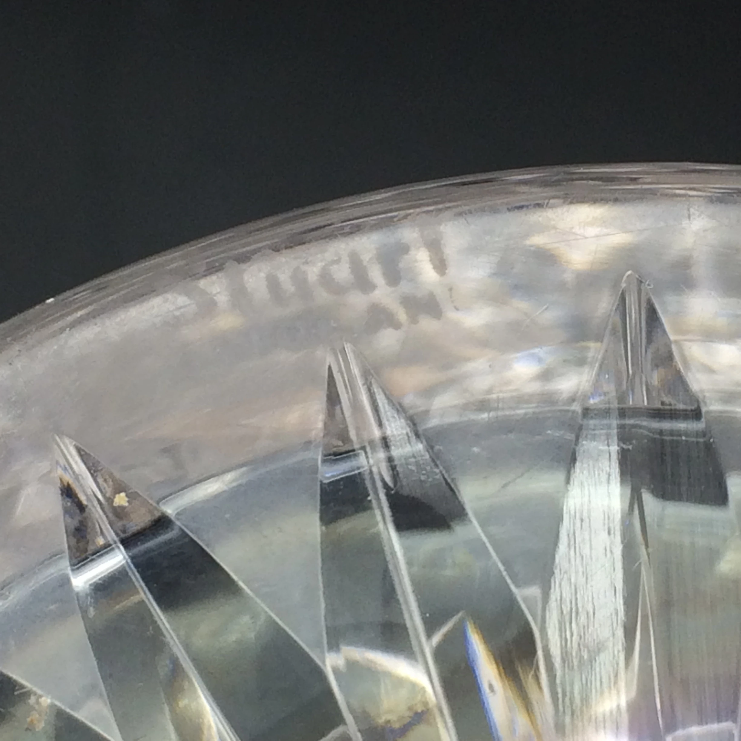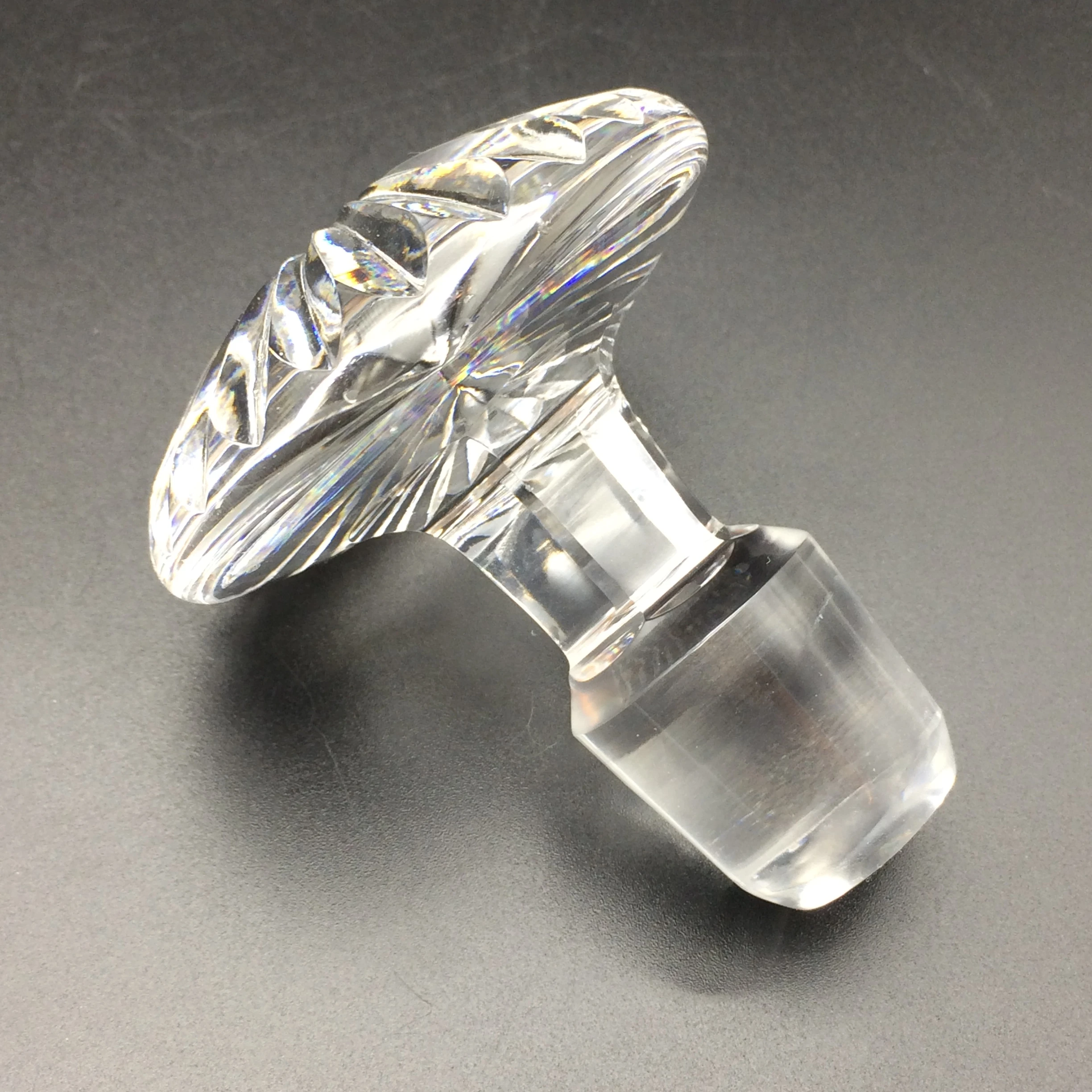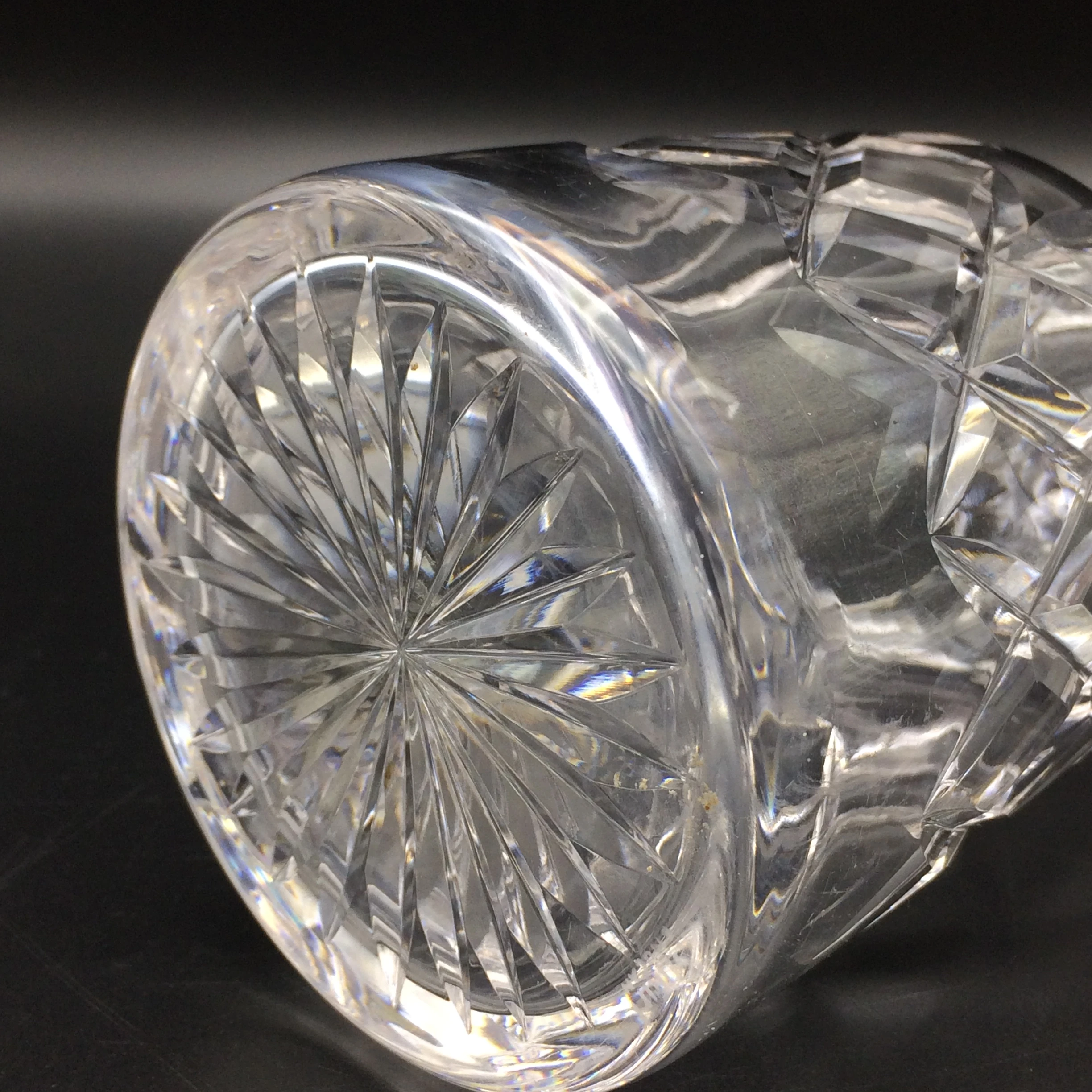 This early, heavy, good quality, cut crystal ‘Stuart’ decanter, from the 1950/60’s, is in excellent condition. It is bell shaped, with a star cut base, diamond cut body and a mushroom shaped stopper. The ‘Stuart’ mark has been acid etched on the edge of the base. Stuart crystal was first manufactured in the late 1880’s in England and was discontinued in 2001. They were well known for their exceptional quality. The decanter measures 24cm in height (20,2cm without the stopper), has a base diameter of 10.5cm and weighs 1255g.