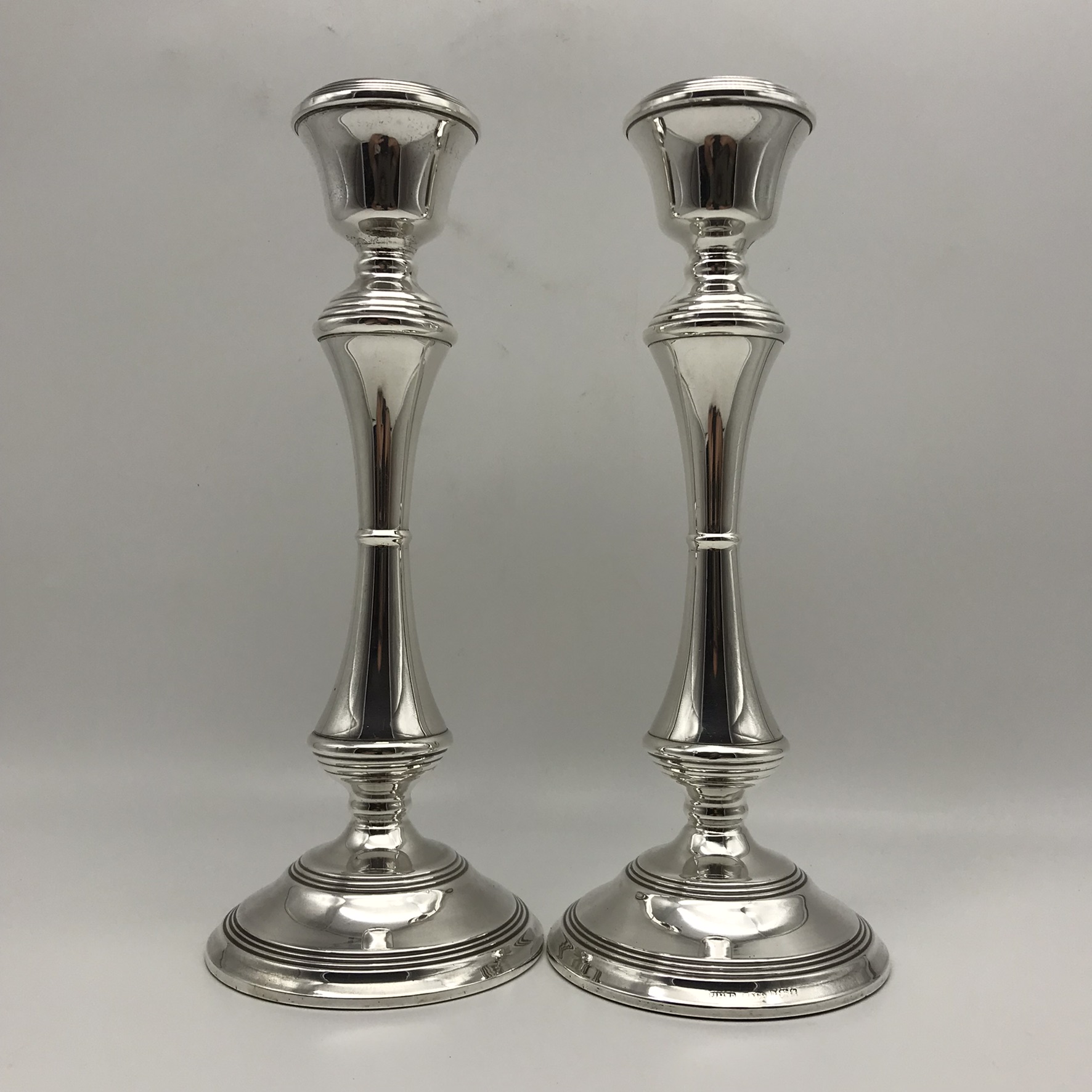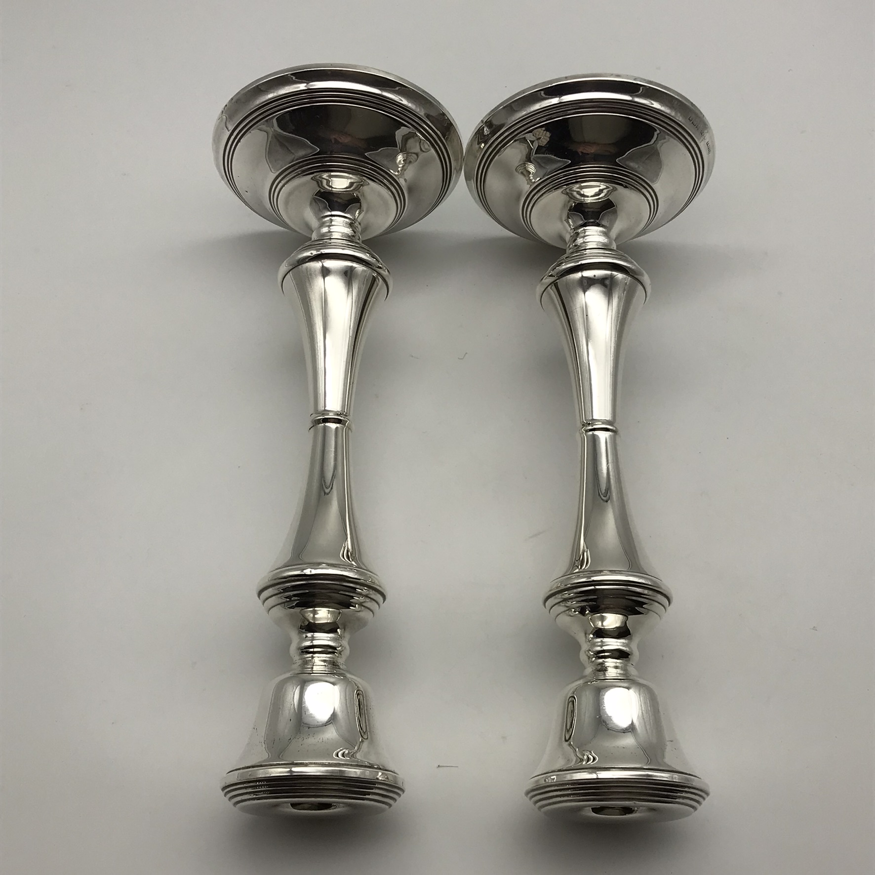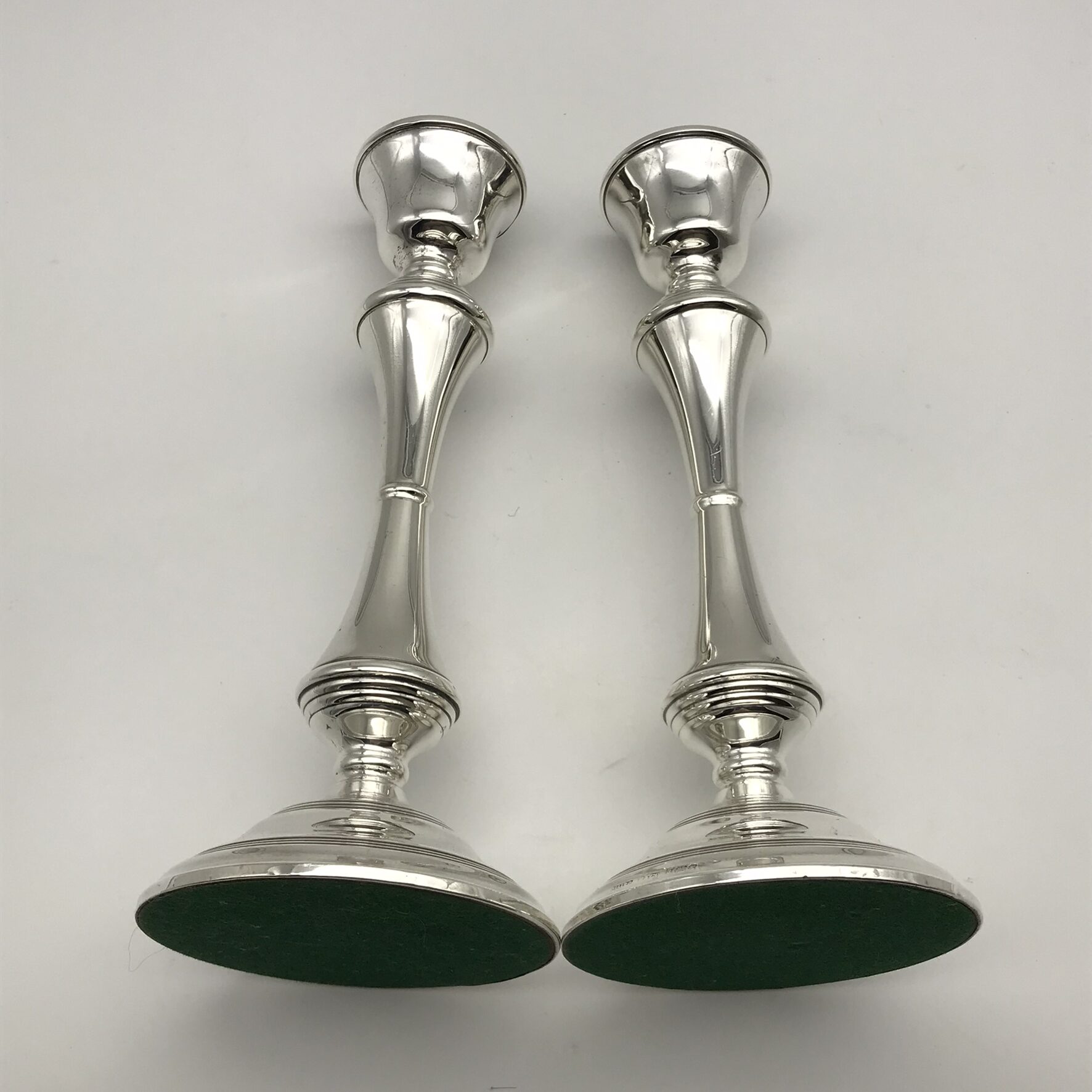 This good quality, elegant pair of tall, English hallmarked sterling silver candlesticks from the 1970’s, stand on round weighted bases, leading to a knopped column with reeded borders. They were made in 1975 in Birmingham, England by silversmiths ‘Broadway & Co.’ (B&Co), and other than a couple of very minor dents on the base and top rim, they’re in great condition. The candlesticks stand 25,5cm high, with a base diameter of 10cm and together they weigh 1060g.