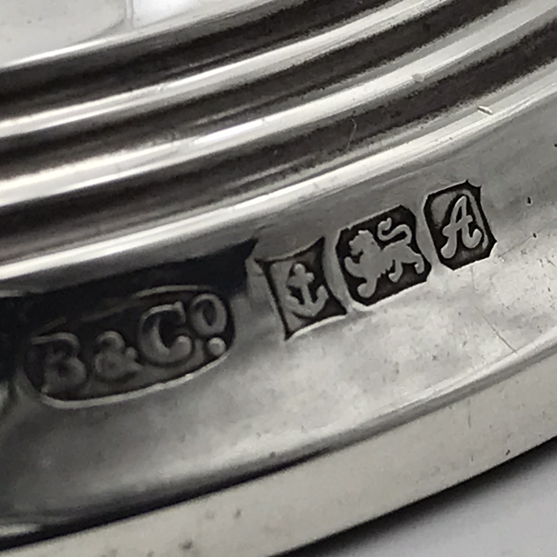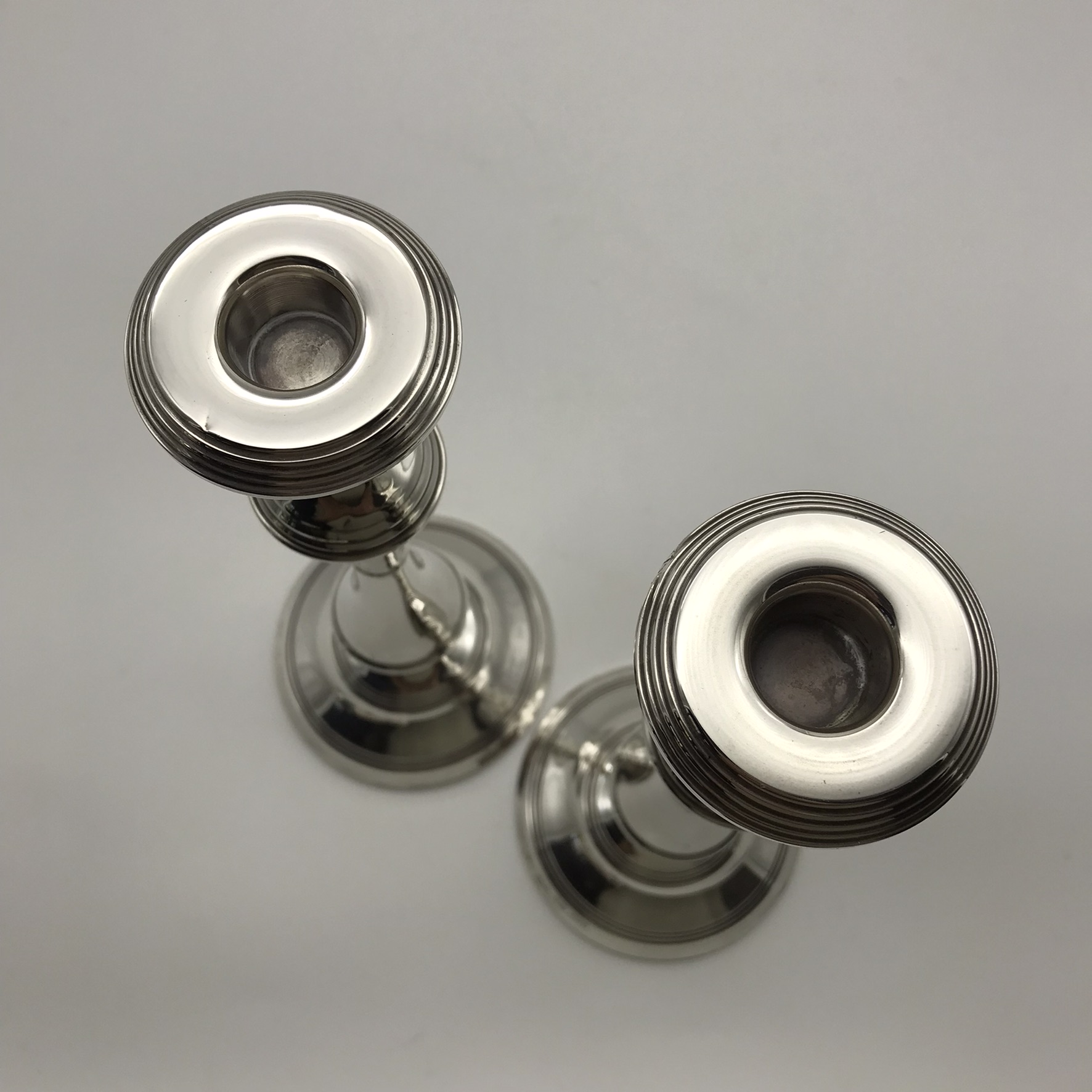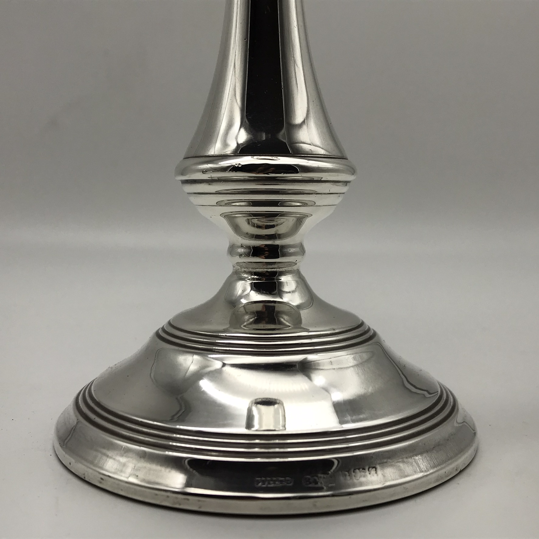 This good quality, elegant pair of tall, English hallmarked sterling silver candlesticks from the 1970’s, stand on round weighted bases, leading to a knopped column with reeded borders. They were made in 1975 in Birmingham, England by silversmiths ‘Broadway & Co.’ (B&Co), and other than a couple of very minor dents on the base and top rim, they’re in great condition. The candlesticks stand 25,5cm high, with a base diameter of 10cm and together they weigh 1060g.