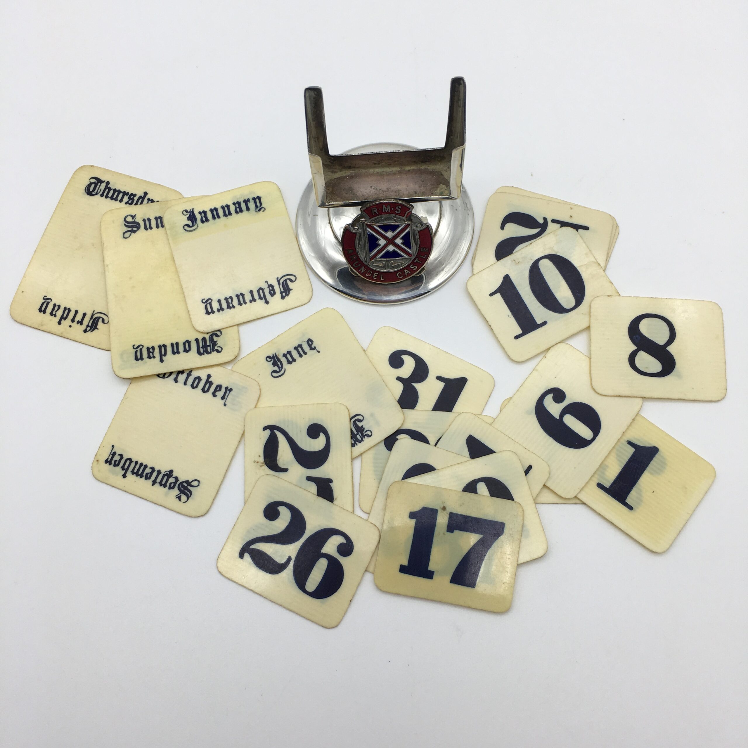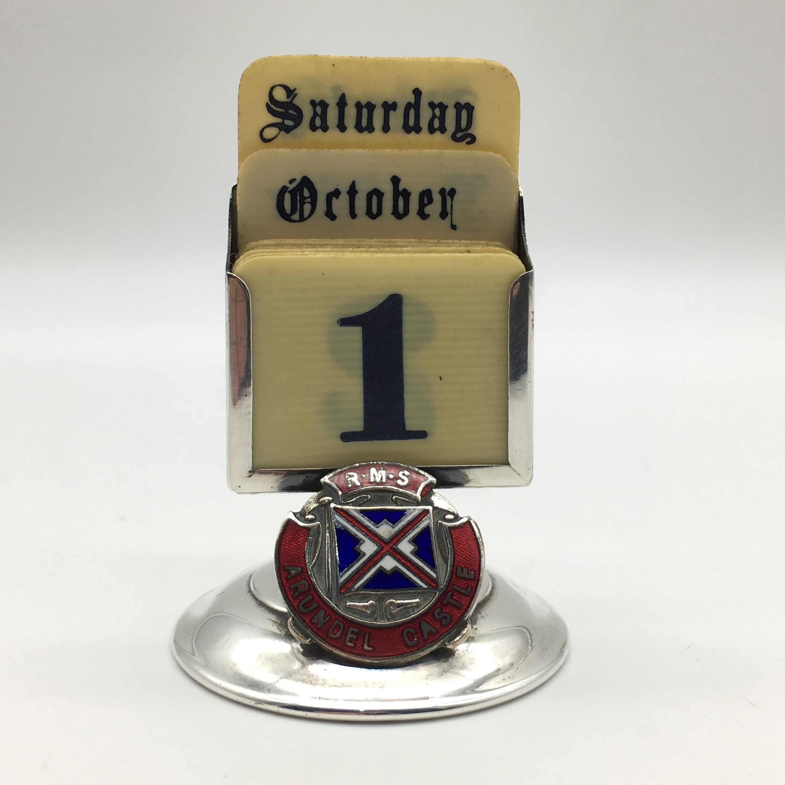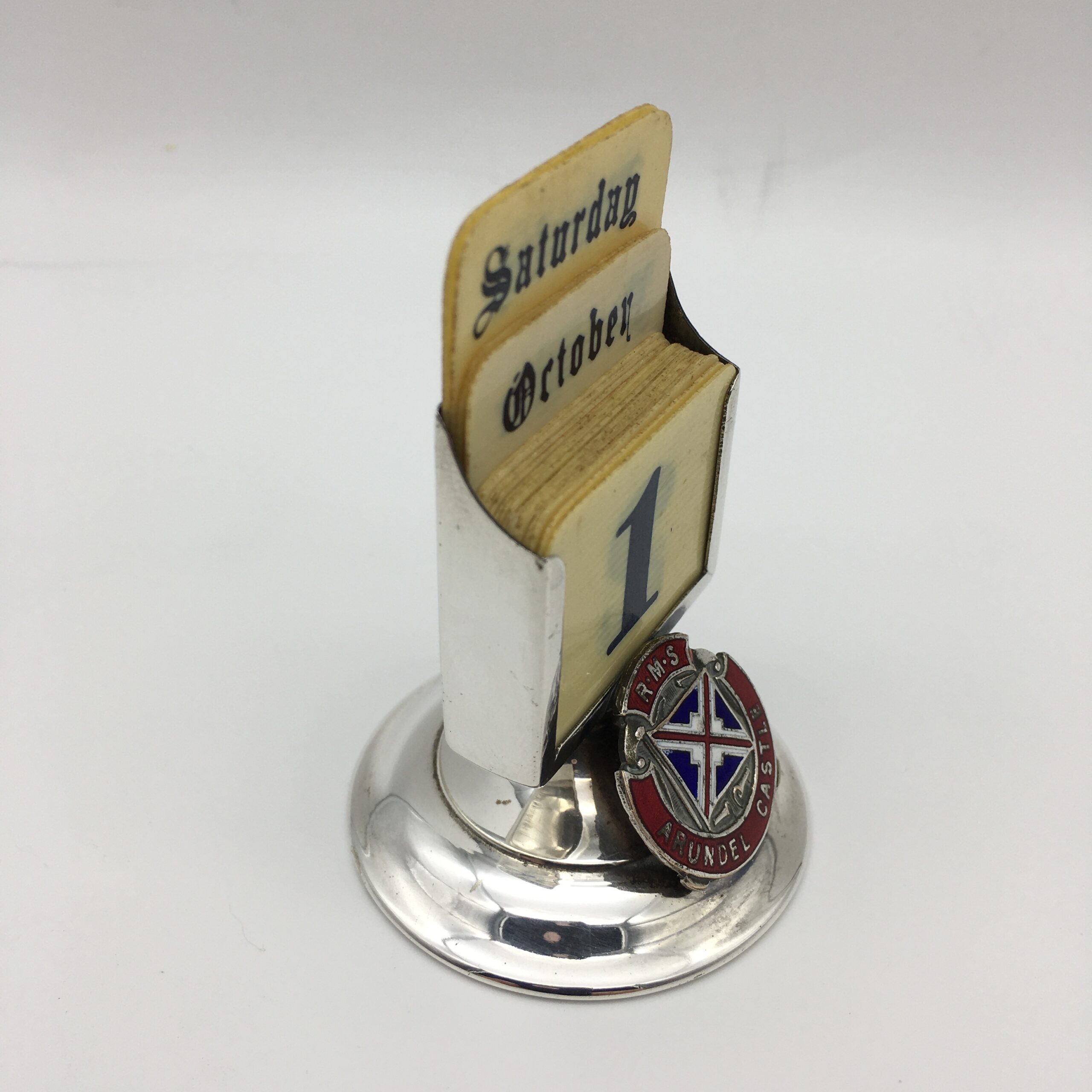 This scarce, early, silver-plated, souvenir perpetual desk top calendar features the enamel emblem of the ‘R.M.S. ARUNDEL CASTLE’ and comes with a complete set of faux ivory day, date, and month cards. This ship was launched in 1919 and operated between Southampton and Cape Town from 1921 to 1958. During World War 2, she served as a troopship for the Admiralty. The calendar is stamped on the back ‘EPNS & JF’ and is in excellent condition. It stands 7cm high, with a base diameter of 4,7cm.