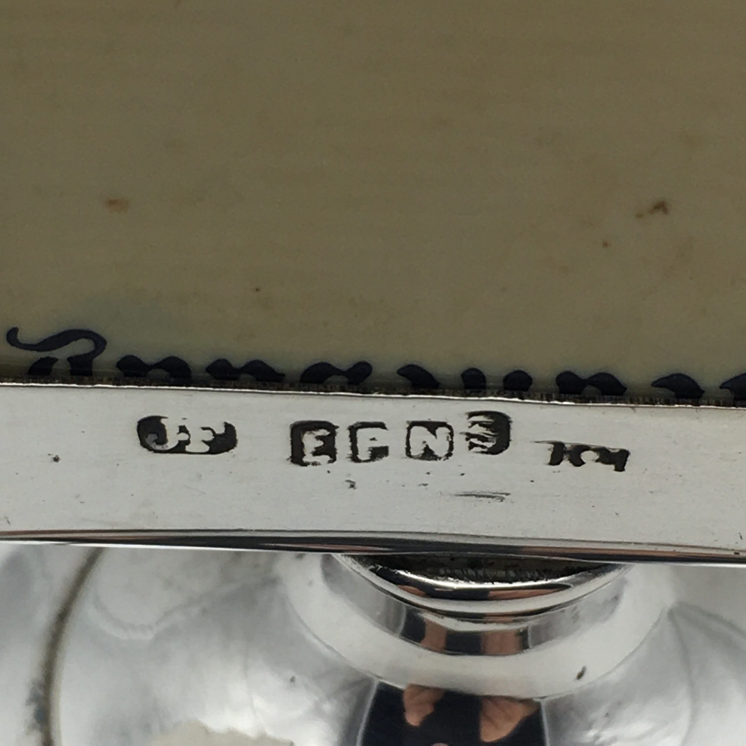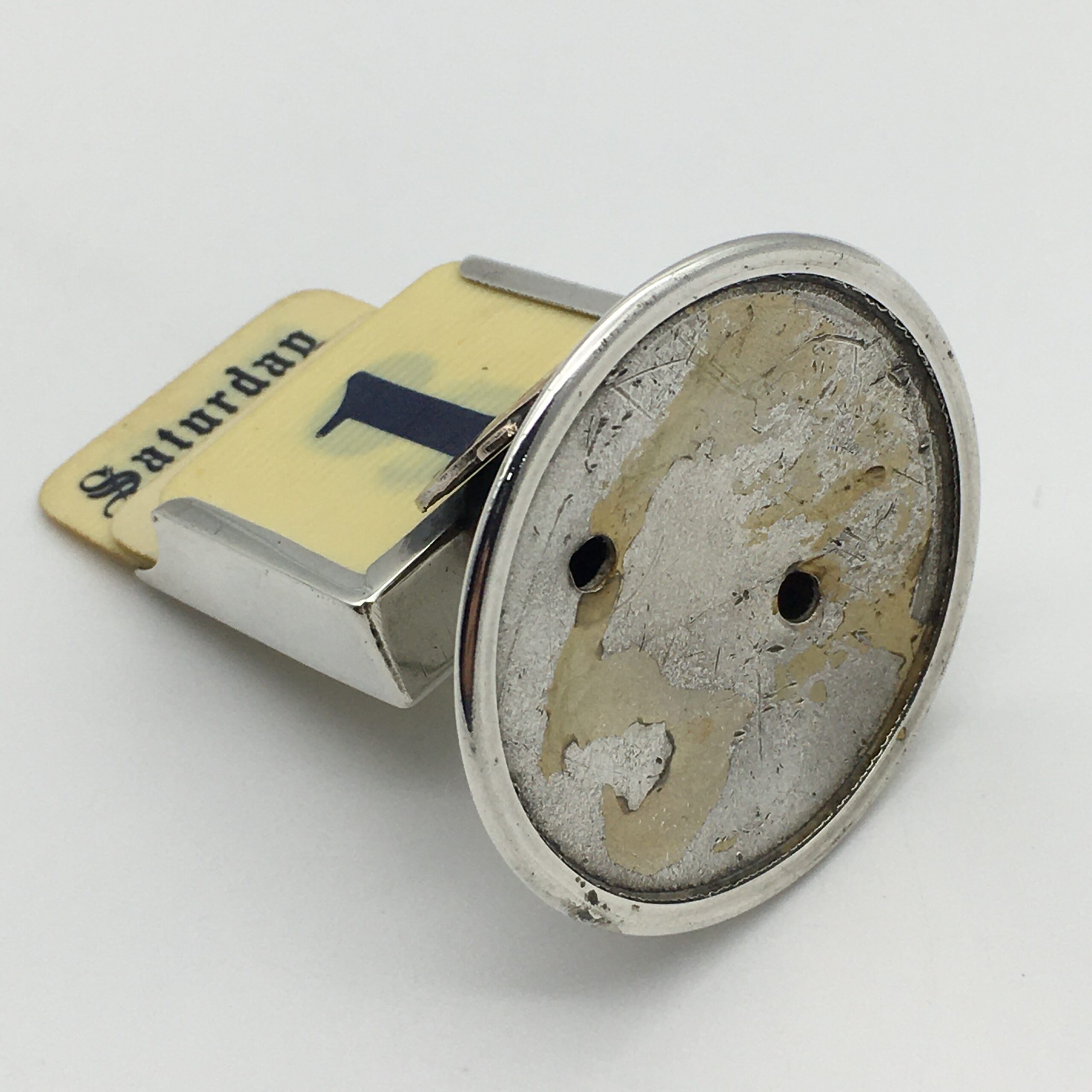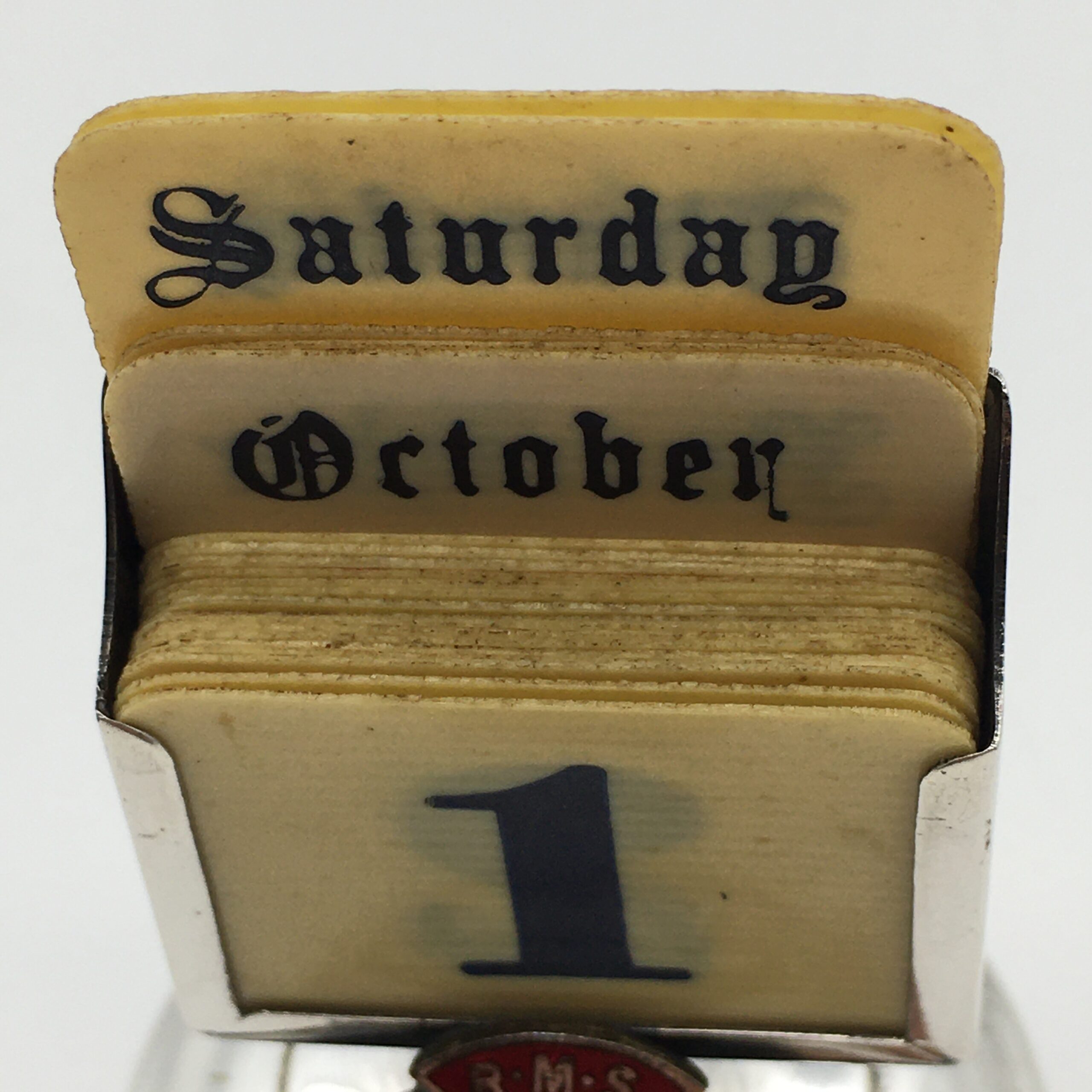 This scarce, early, silver-plated, souvenir perpetual desk top calendar features the enamel emblem of the ‘R.M.S. ARUNDEL CASTLE’ and comes with a complete set of faux ivory day, date, and month cards. This ship was launched in 1919 and operated between Southampton and Cape Town from 1921 to 1958. During World War 2, she served as a troopship for the Admiralty. The calendar is stamped on the back ‘EPNS & JF’ and is in excellent condition. It stands 7cm high, with a base diameter of 4,7cm.