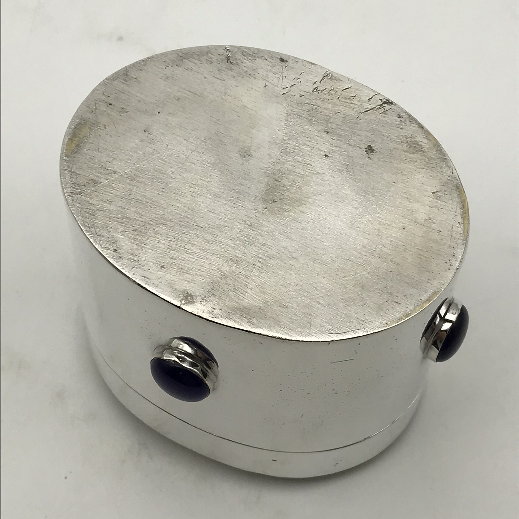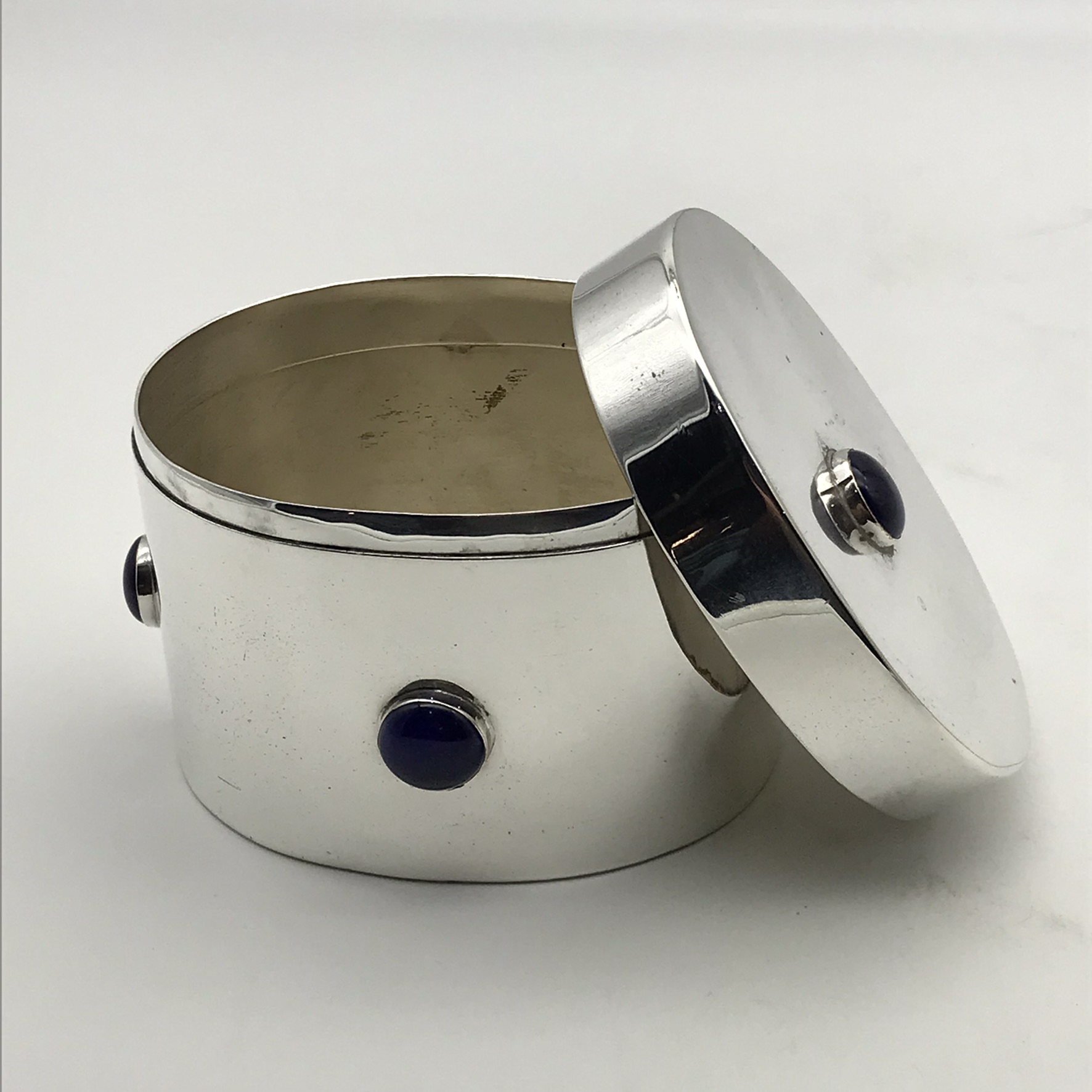 This lovely, unusual, fine quality silver-plated ‘Arts & Crafts’ tea caddy from the early 1900’s has an oval form, and is decorated with four dark blue, round cabochon-cut, semi-precious (possibly Lapis Lazuli) stones, around the sides with one on the lid. The tea caddy appears to be plated on brass giving it a good weight and other than very minor wear to the base, due to age, it’s in great condition with an airtight lid. It stands 8,8cm high, measures 12,5cm x 10cm and weighs 342g.