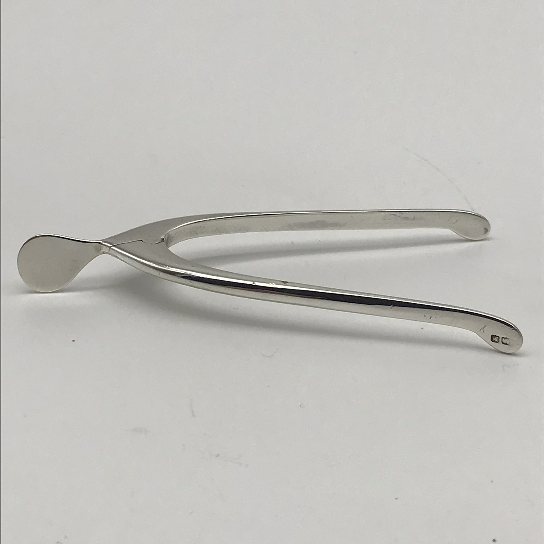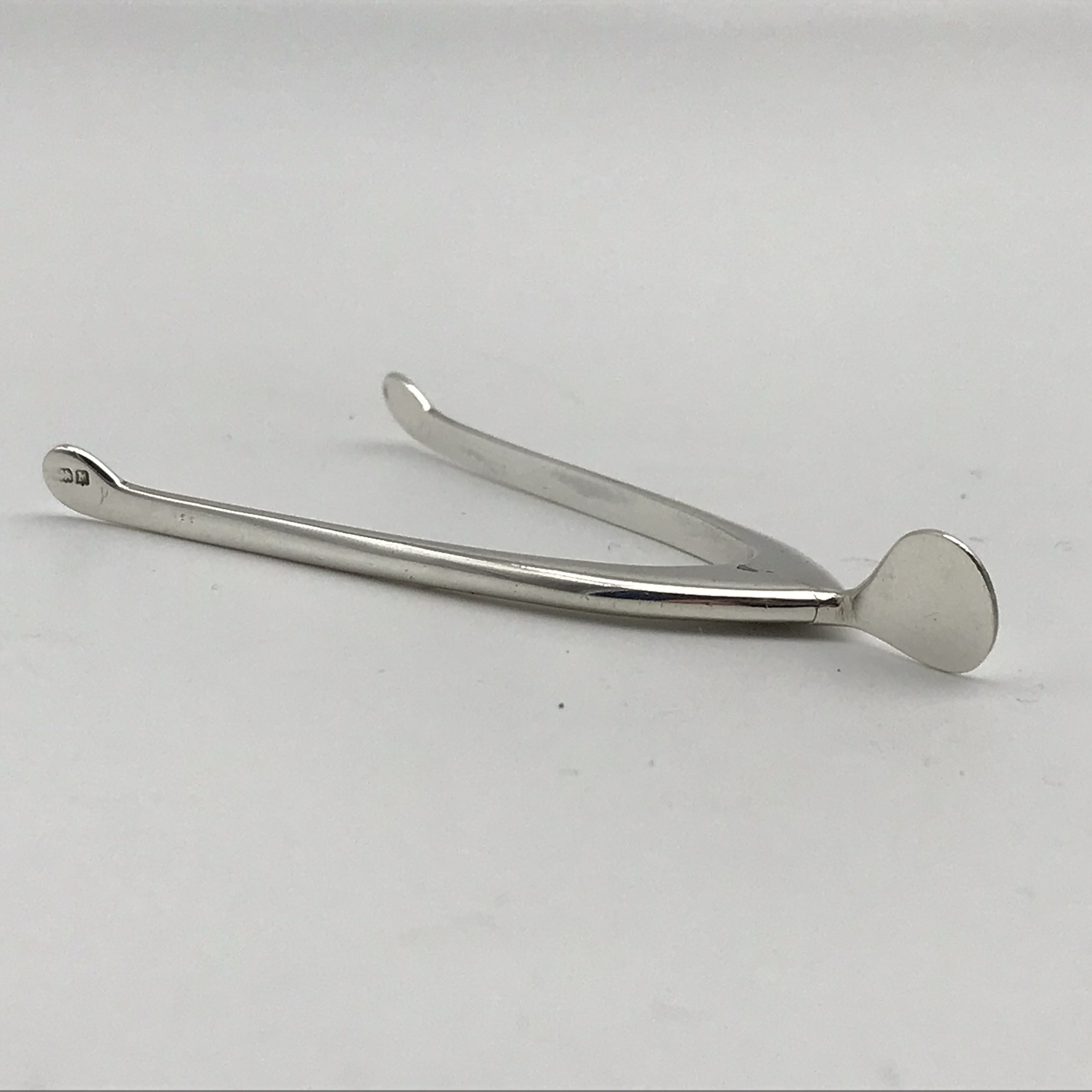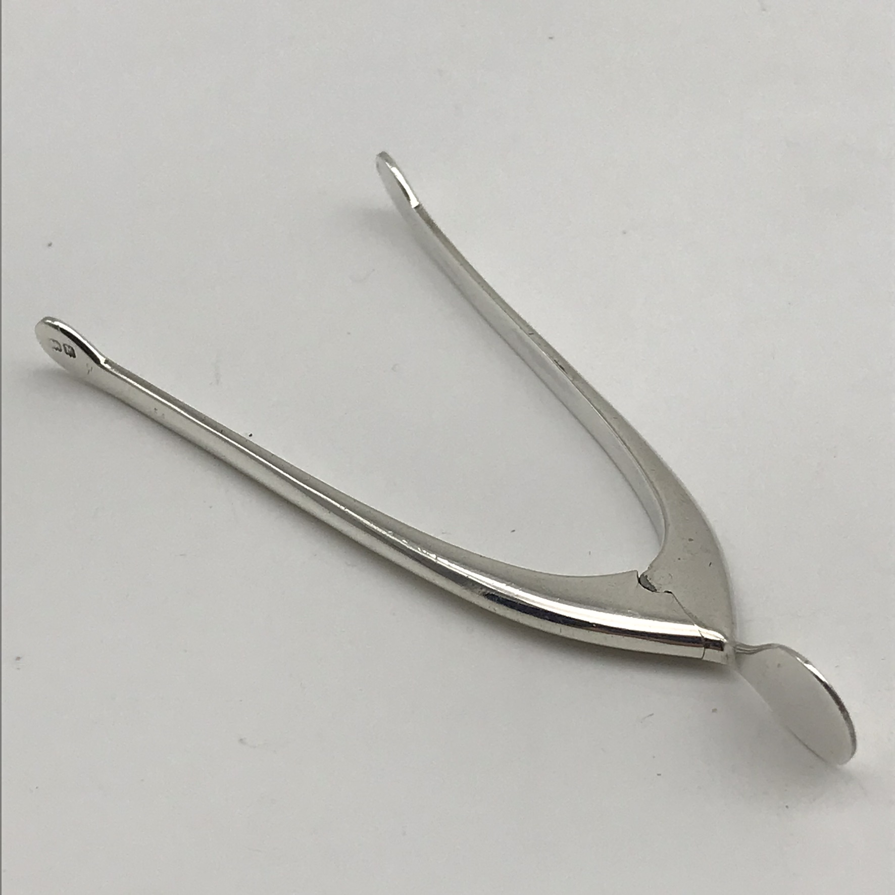 This wonderful pair of early, unusual, sterling silver novelty sugar tongs with a sprung hinge are in the form of a lucky wishbone. They were made in 1936 in Birmingham, England by silversmiths ‘James Swan & Son’ (J.S&S). These lovely tongs are in excellent condition and function well. They measure 7,8cm in length and weigh 8,5g.