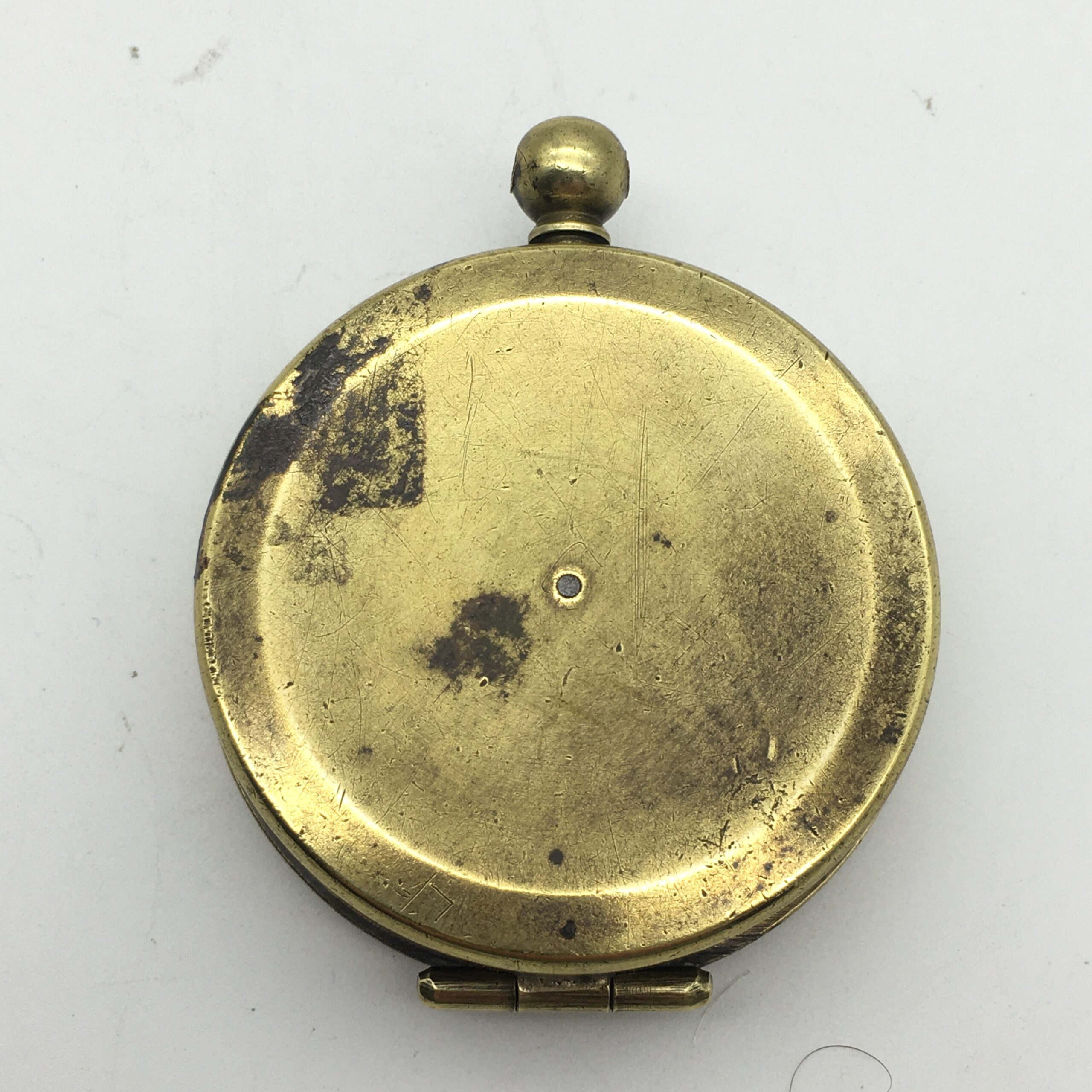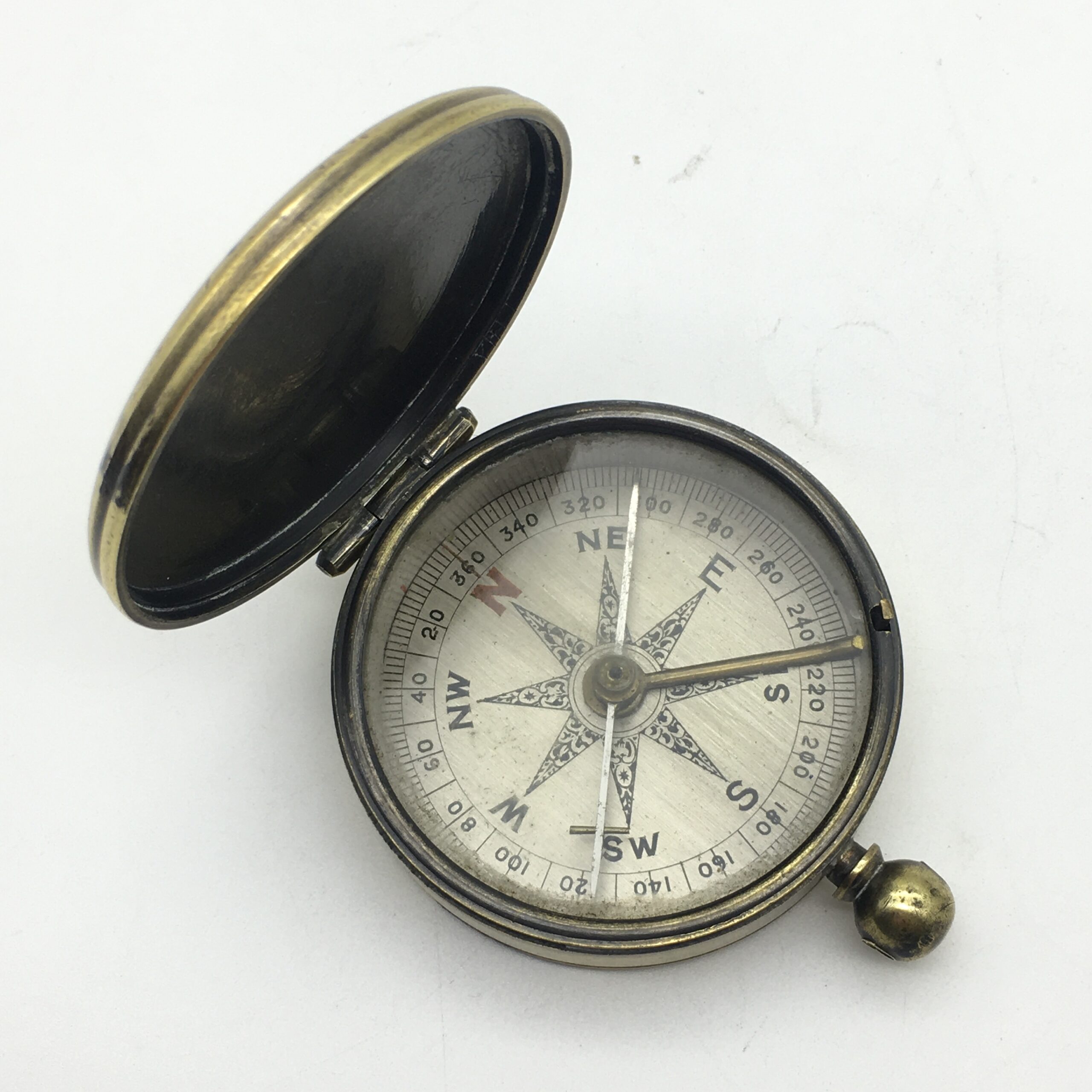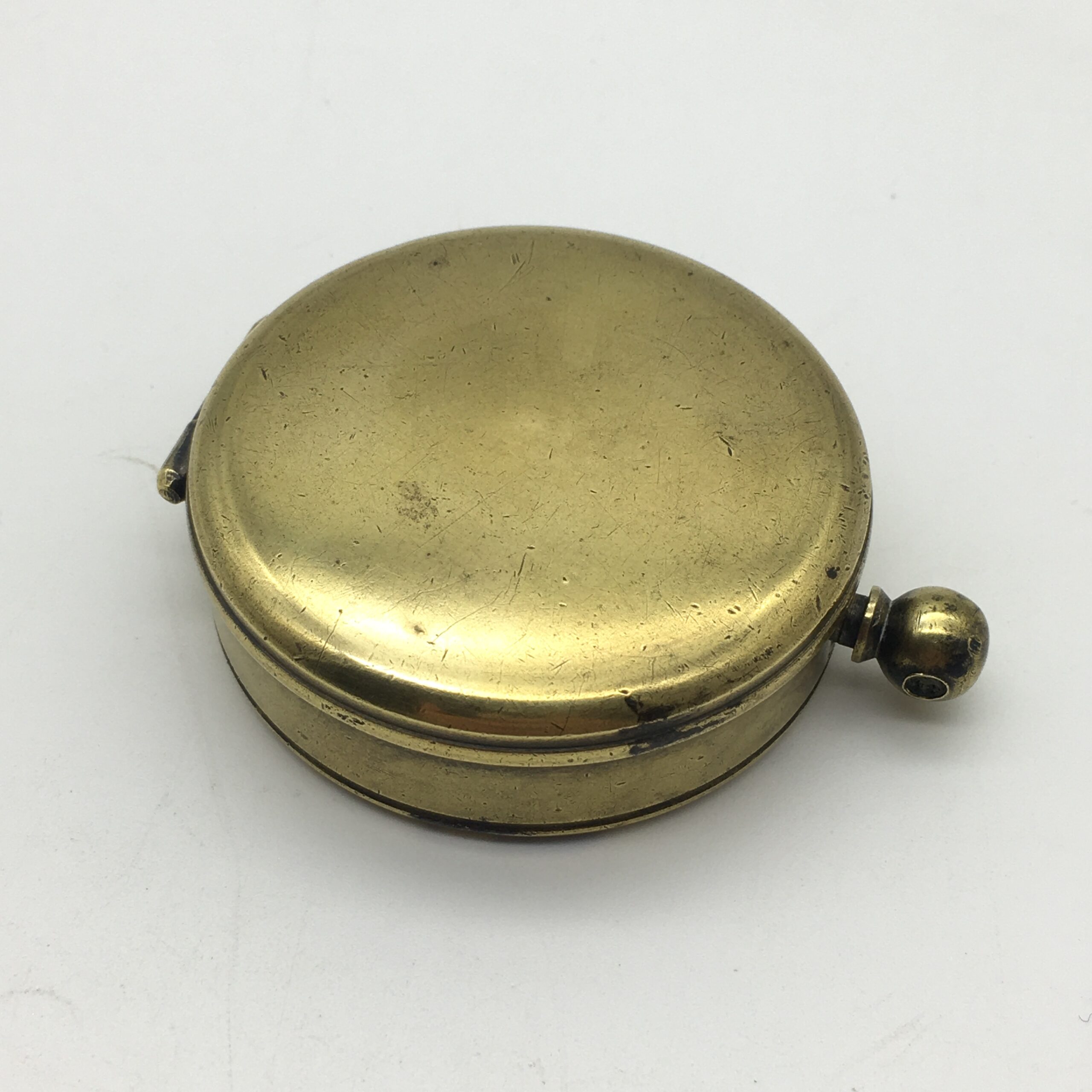 This attractive, Victorian, brass cased compass, with hinged lid from the late 1800’s, has a lid activated transit lock on the side. It has a white metal dial with black numbers and letters, and a red ‘N’ and other than the large brass top ring missing, it’s in good condition, with a nice patina to the brass. The glass is clear and undamaged, and the lid clicks shut. It has a diameter of 5,2cm, a width of 1,7cm and weighs 104,3g.