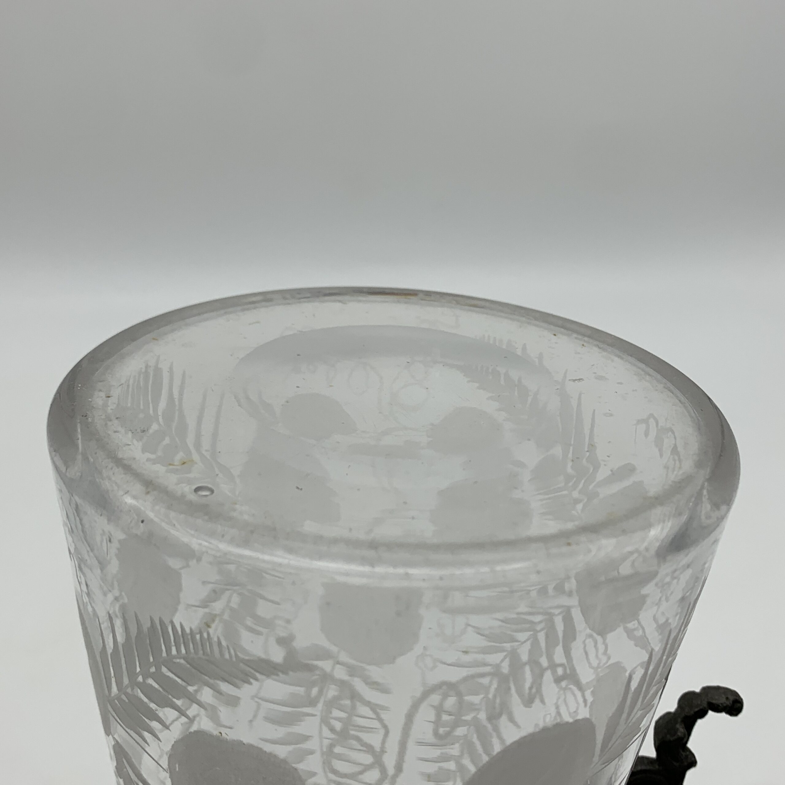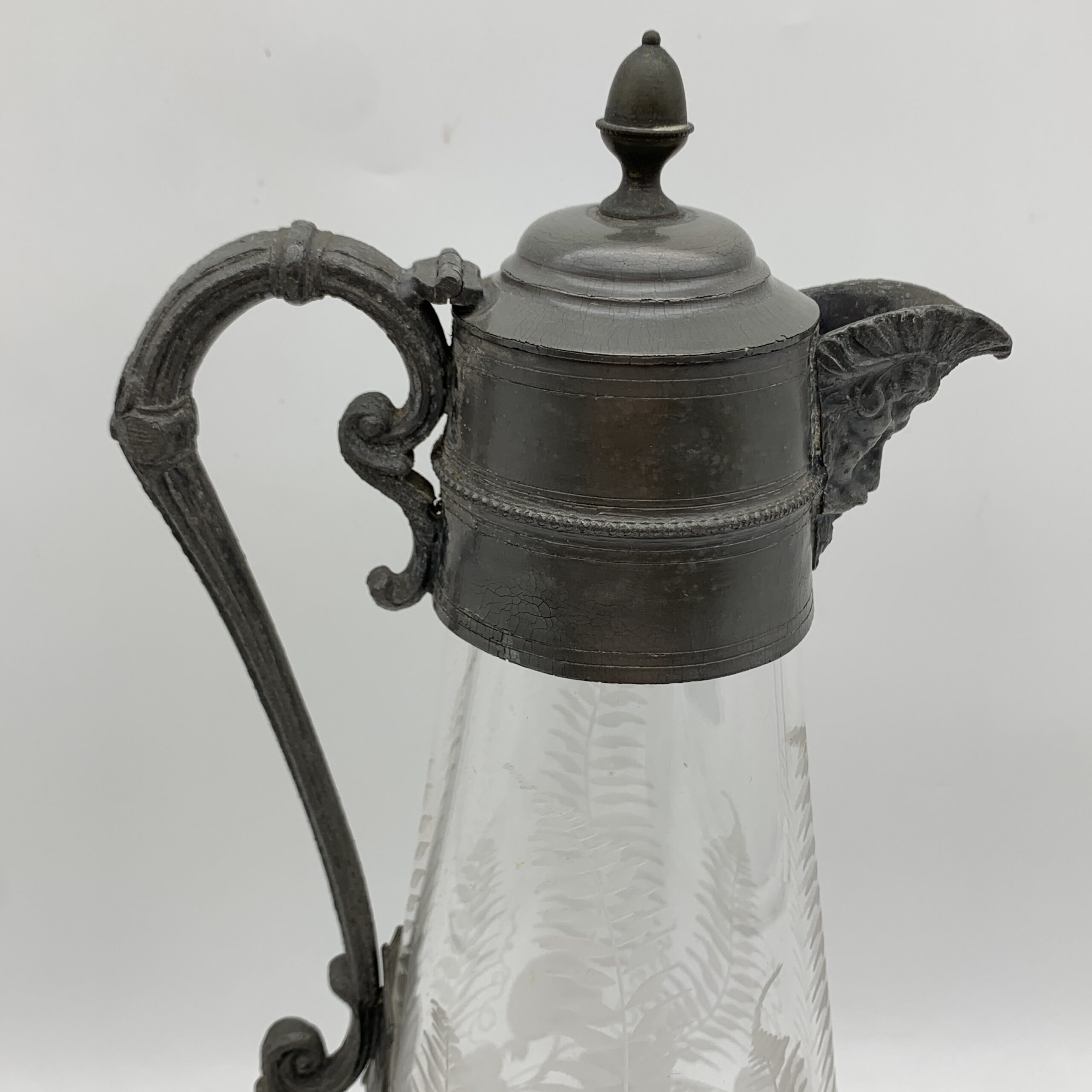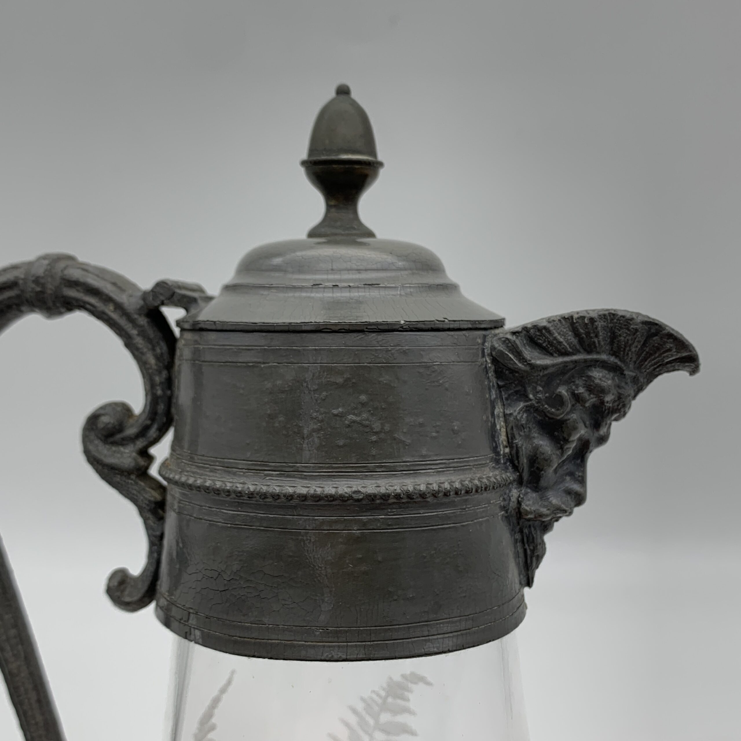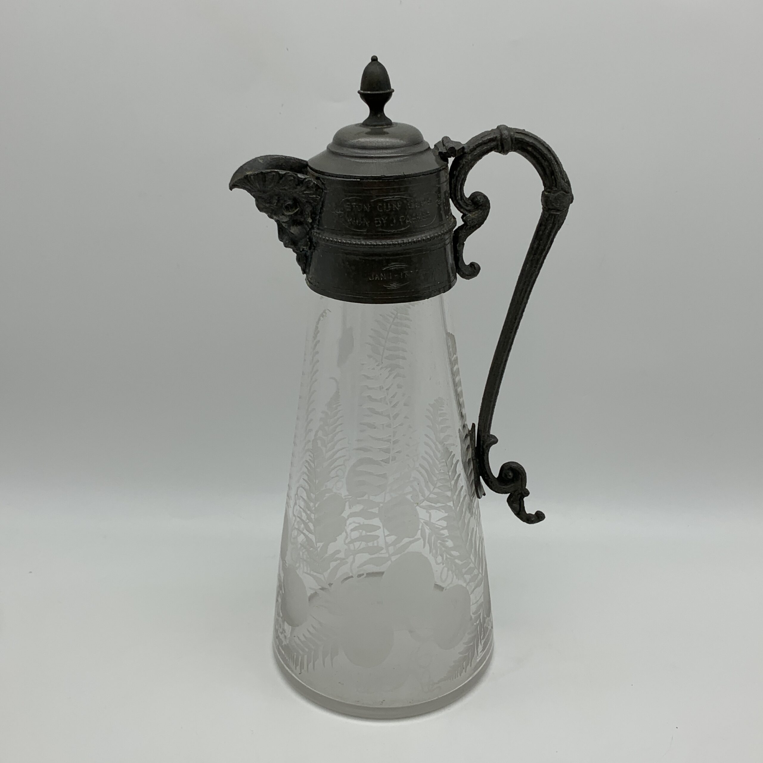 This lovely, antique, cut crystal and ‘Britannia’ metal claret jug has a beautiful cut glass tapering body decorated with hand cut and etched long ferns and lily pad leaves. The metal mount has a cast spout featuring the face of ‘Bacchus’ (Greek God of wine), a domed hinged lid with an ‘acorn’ finial, and it appears the jug was awarded as a prize in 1877, as it’s engraved on the side ‘ETON GUN CLUB’, ‘WON BY J. PARKER’ ‘JAN 1-1877’. The claret jug stands 28cm high with a base diameter of 11cm and weighs 950g. Other than a fair amount of aging to the metal collar, it’s in great condition with an early polished pontil mark on the base.