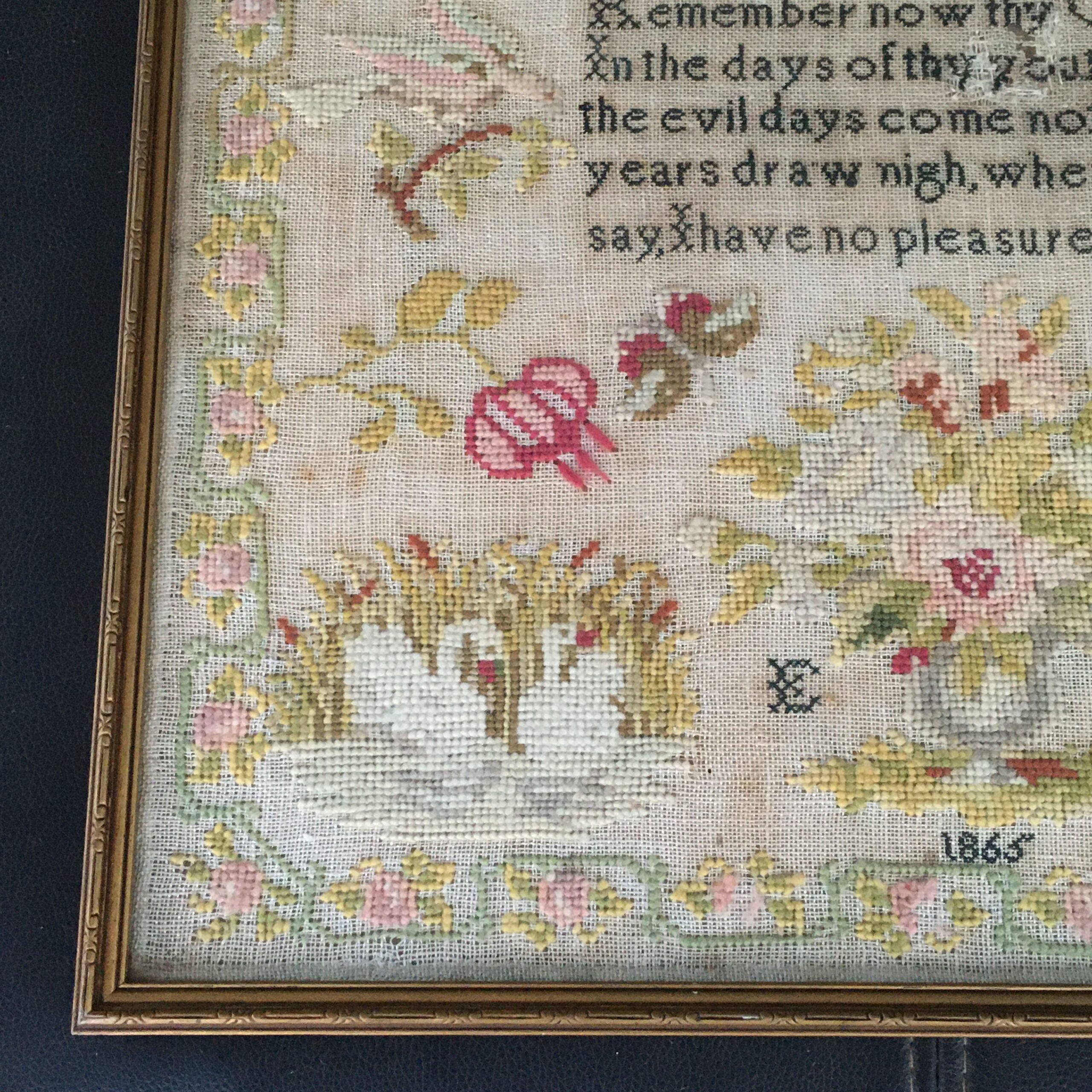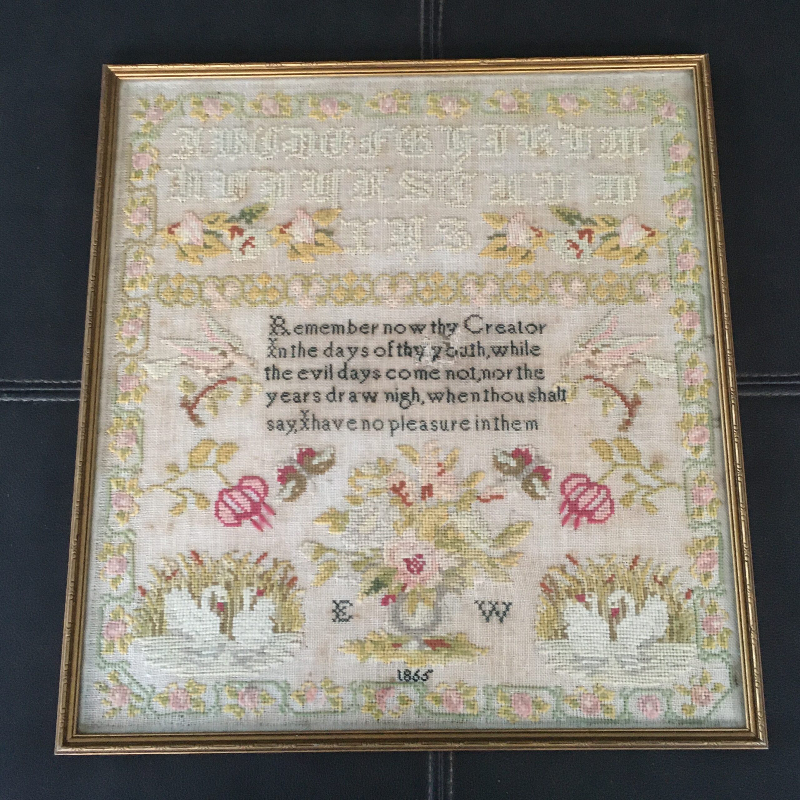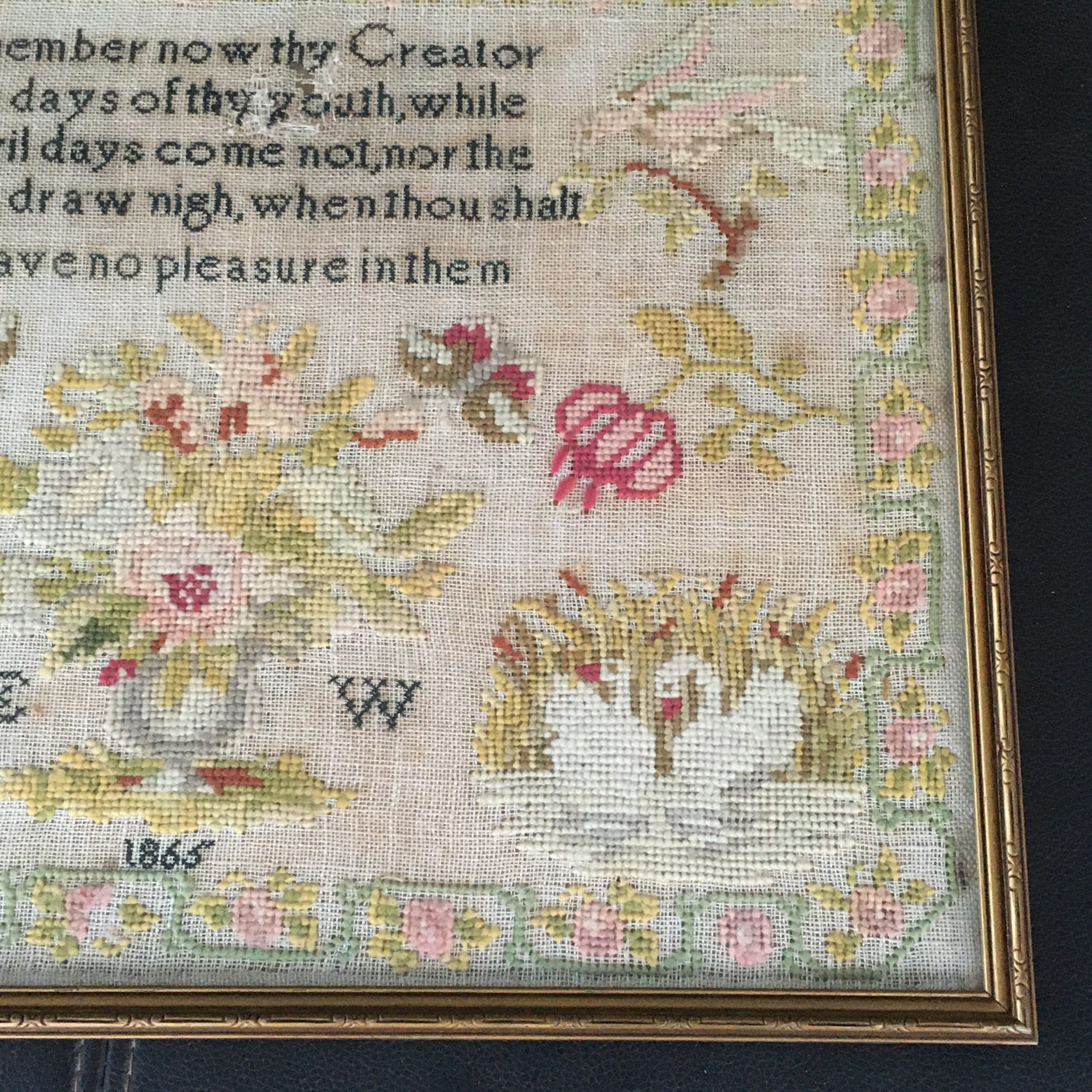This very early, large, framed needlework sampler is signed and dated. It features, in various colours (reds, yellows, greens, pinks etc.), the alphabet along the top, a flowerpot with flowers in the middle towards the bottom, the initials ‘E W’ on either side with the date ‘1865’ underneath. There’s a pair of swans on each side of the flowerpot, with two butterflies above it. There’s a saying in the middle with birds on either side, and all are surrounded with a floral and vine border. The saying reads: “Remember now thy Creator In the days of thy youth, while the evil days come not, nor the years draw nigh, when thou shalt say, I have no pleasure in them”. There is some discolouration of the linen and fading of some colours which is to be expected with age, and other than a small hole appearing in the centre of the wording in the middle, the sampler is in good condition. It is framed behind glass in a thin decorative wooden gilt frame, and measures 48,5cm x 44,5cm.