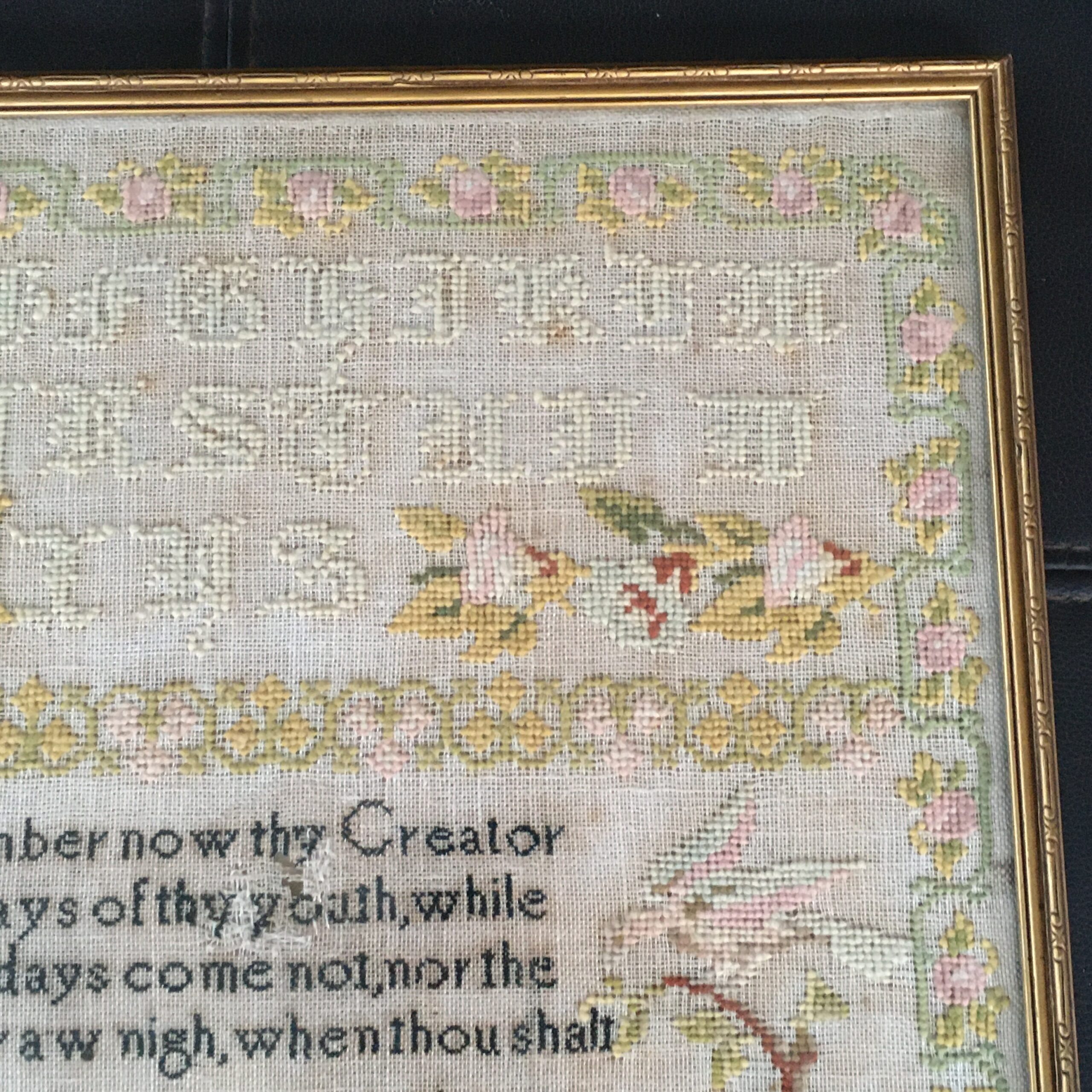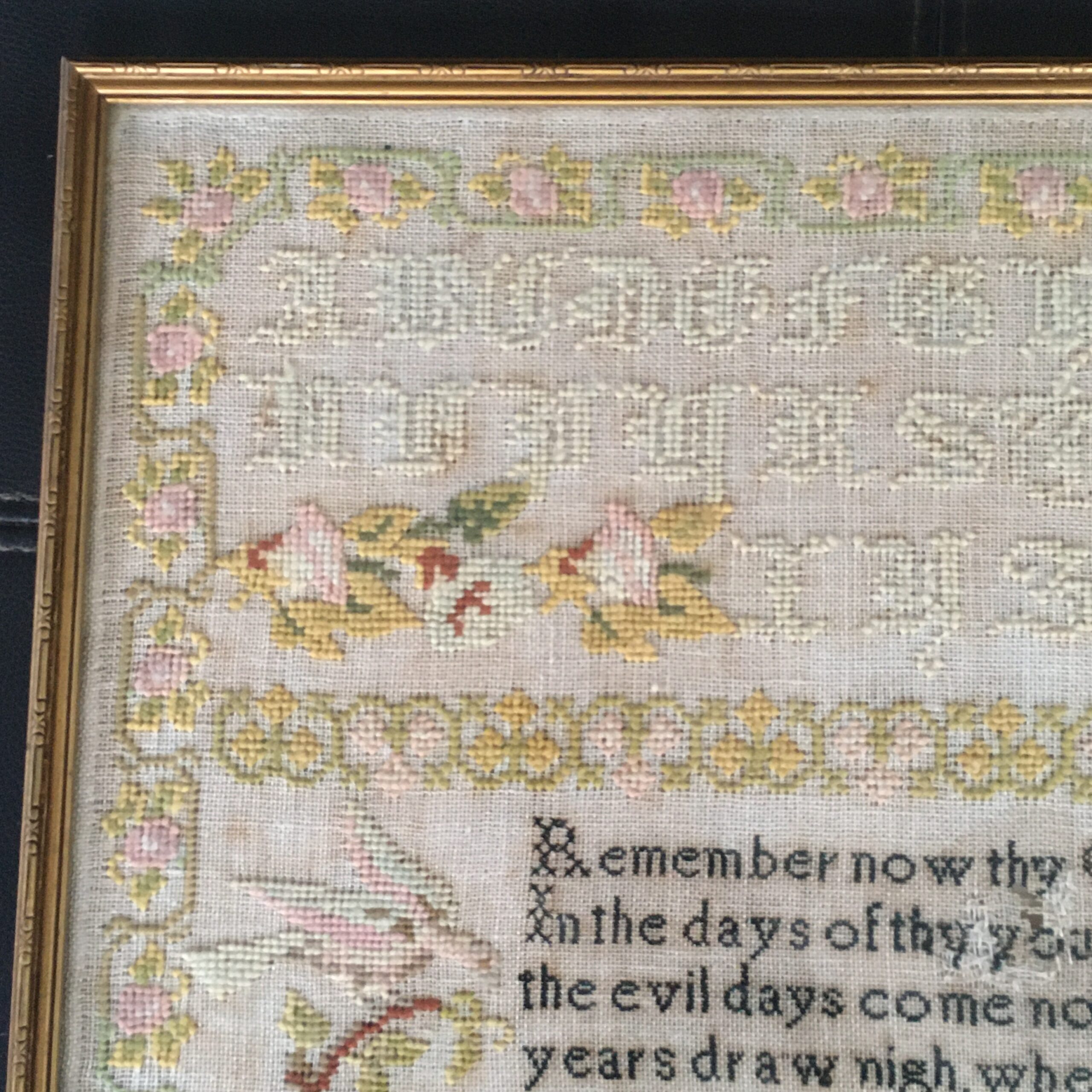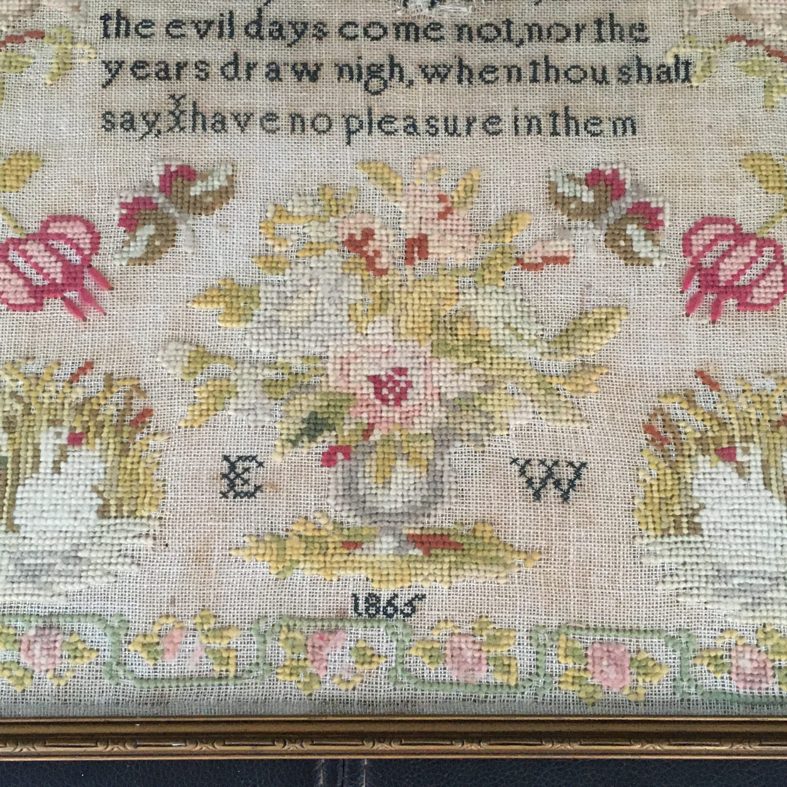 This very early, large, framed needlework sampler is signed and dated. It features, in various colours (reds, yellows, greens, pinks etc.), the alphabet along the top, a flowerpot with flowers in the middle towards the bottom, the initials ‘E W’ on either side with the date ‘1865’ underneath. There’s a pair of swans on each side of the flowerpot, with two butterflies above it. There’s a saying in the middle with birds on either side, and all are surrounded with a floral and vine border. The saying reads: “Remember now thy Creator In the days of thy youth, while the evil days come not, nor the years draw nigh, when thou shalt say, I have no pleasure in them”. There is some discolouration of the linen and fading of some colours which is to be expected with age, and other than a small hole appearing in the centre of the wording in the middle, the sampler is in good condition. It is framed behind glass in a thin decorative wooden gilt frame, and measures 48,5cm x 44,5cm.